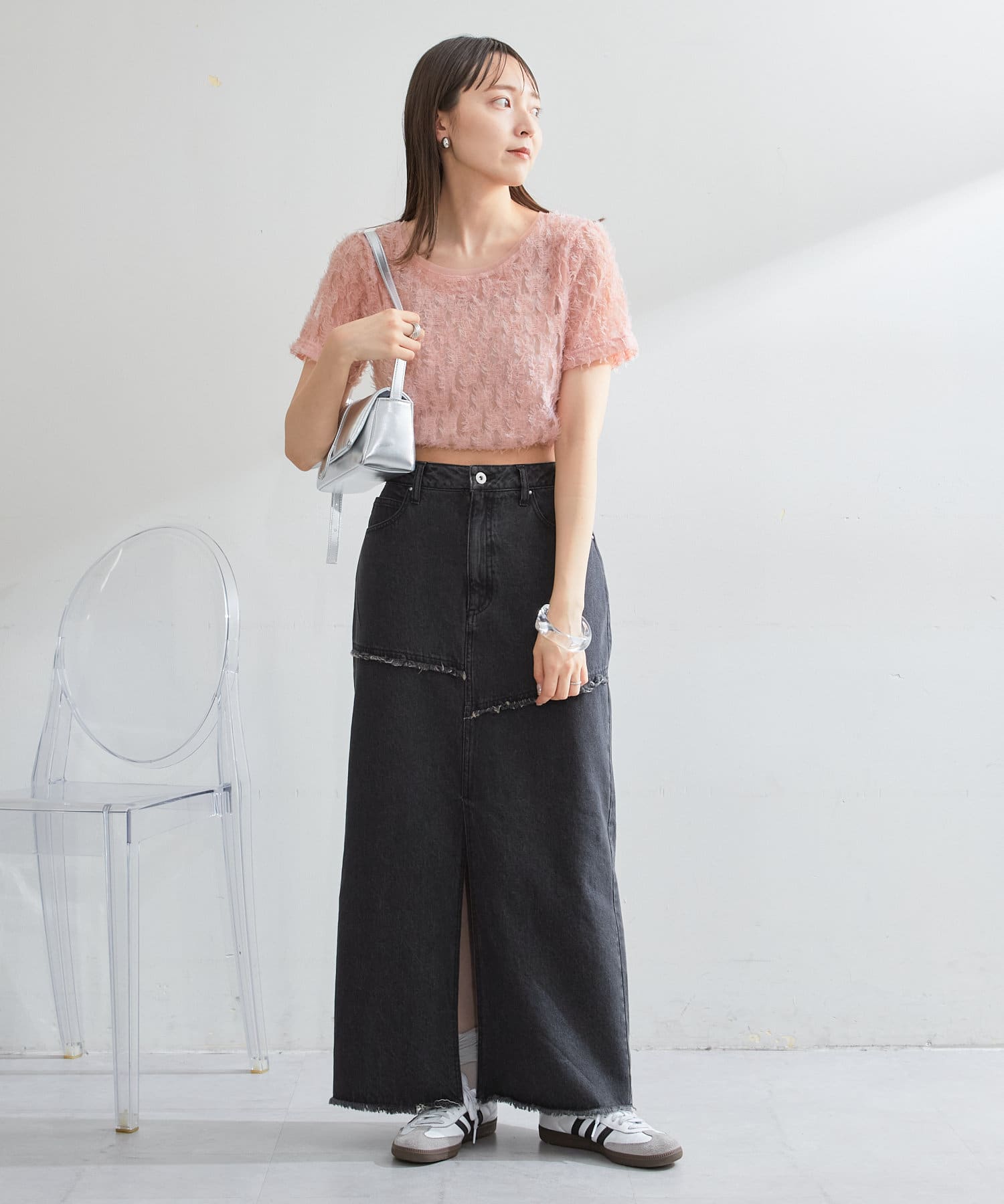 デニムやワイドパンツなどのボトム合わせでカジュアルダウンさせるスタイリングがオススメです。