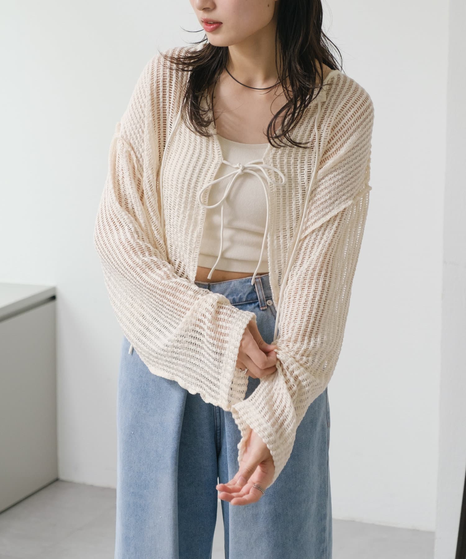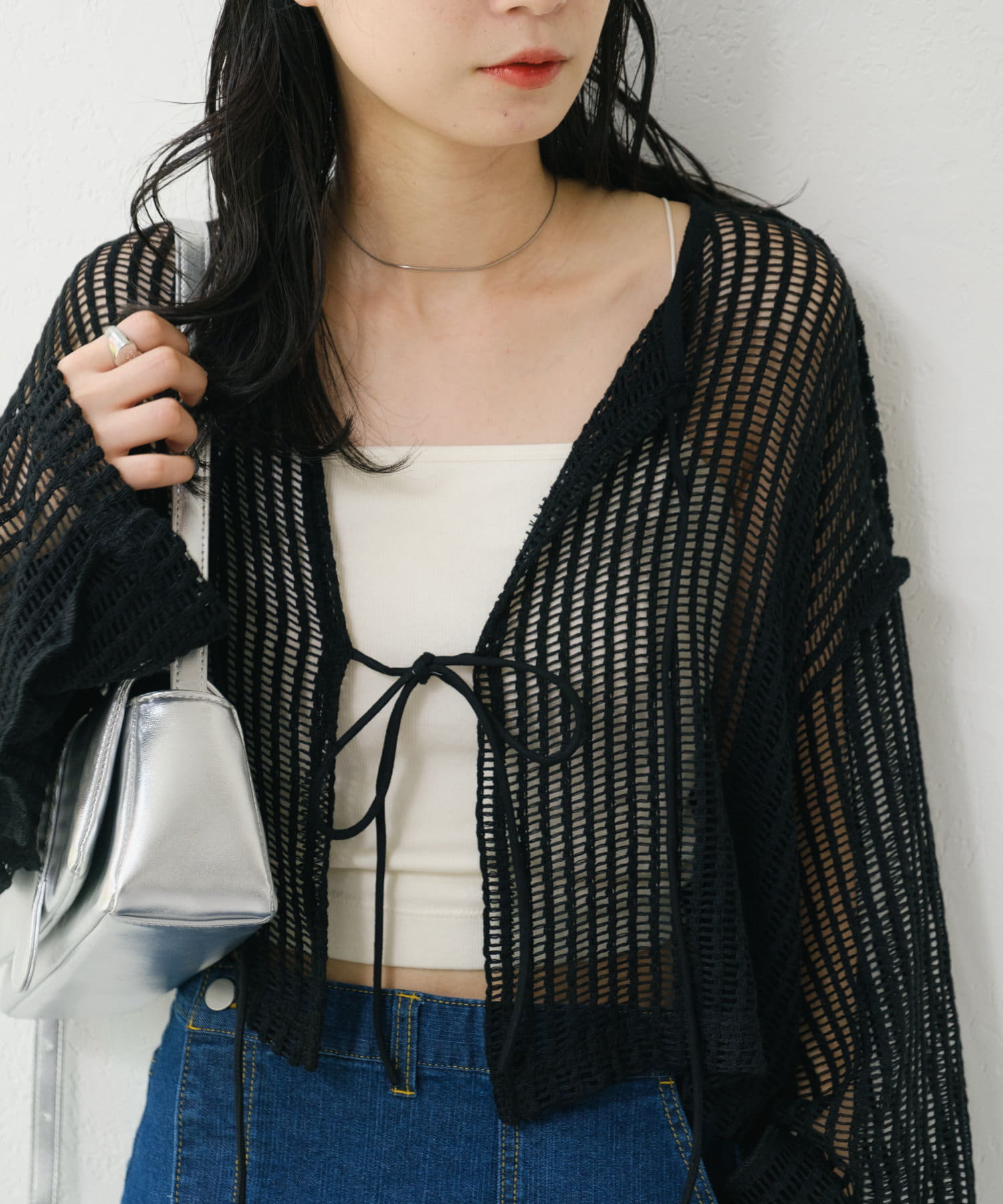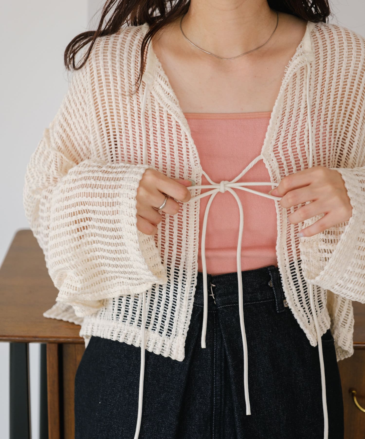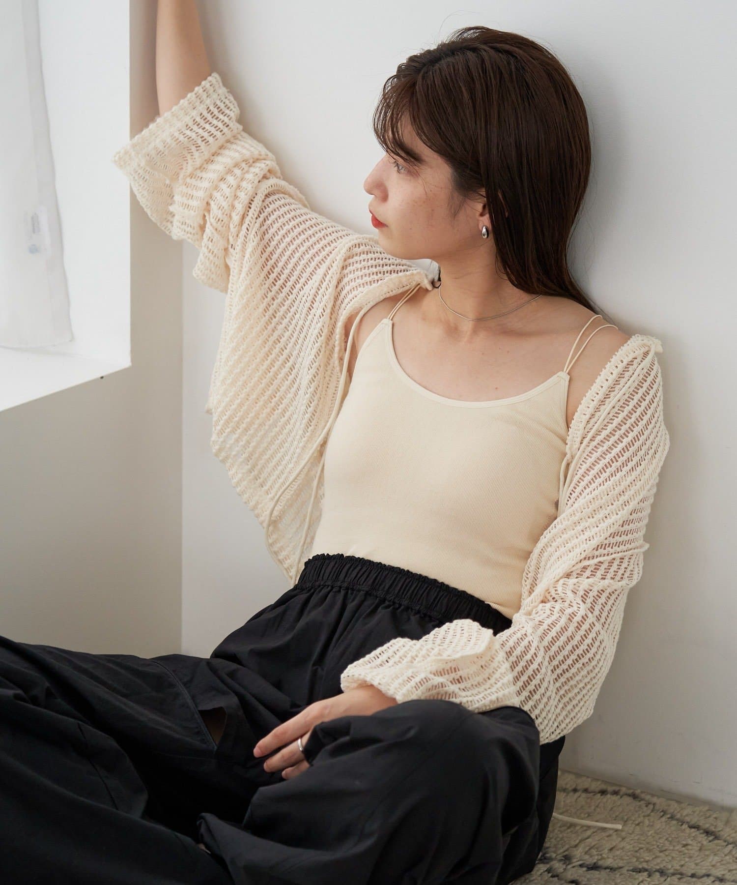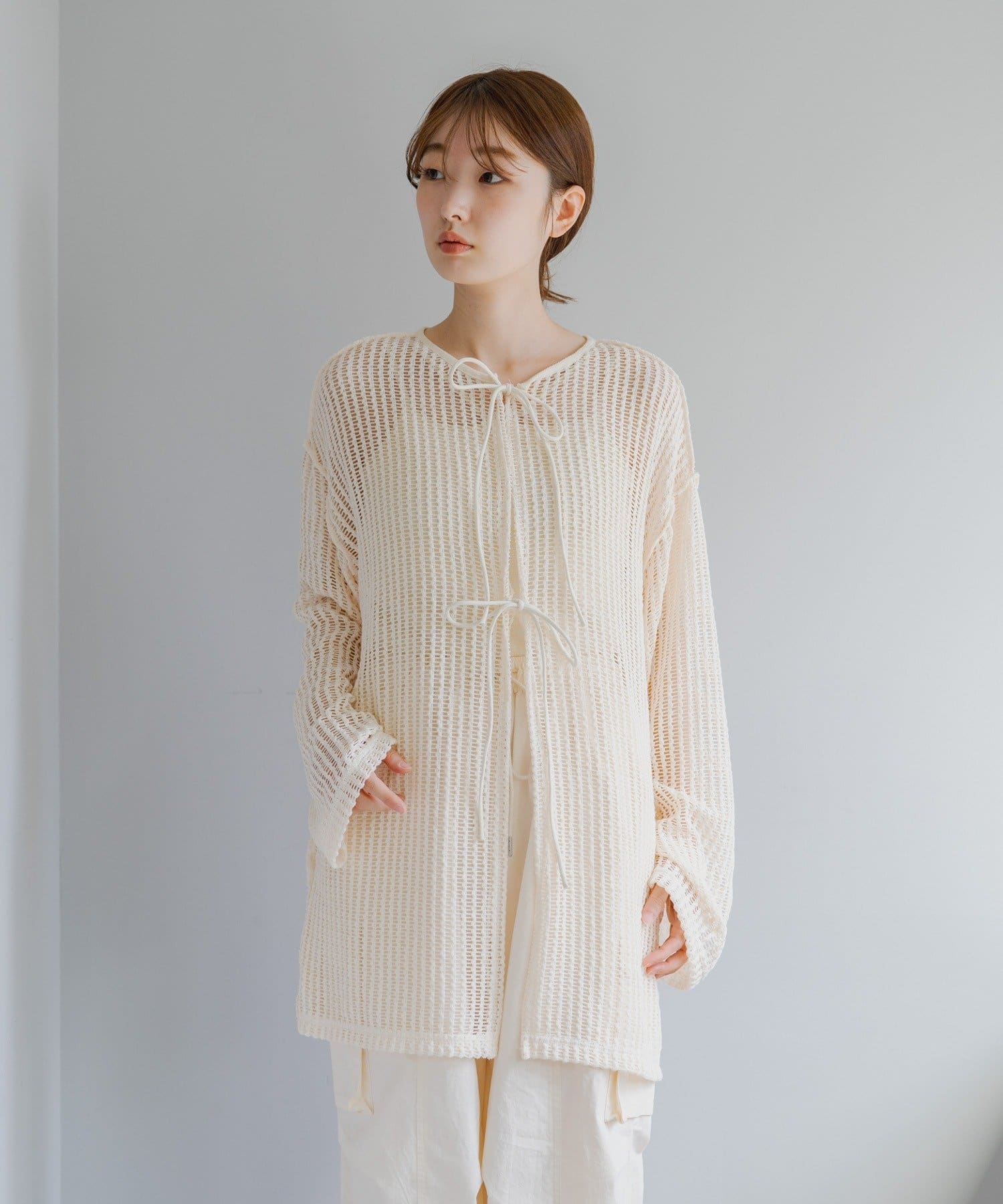 キャミソールやタンクトップと合わせて透け感を楽しんでいただくのがおすすめ。