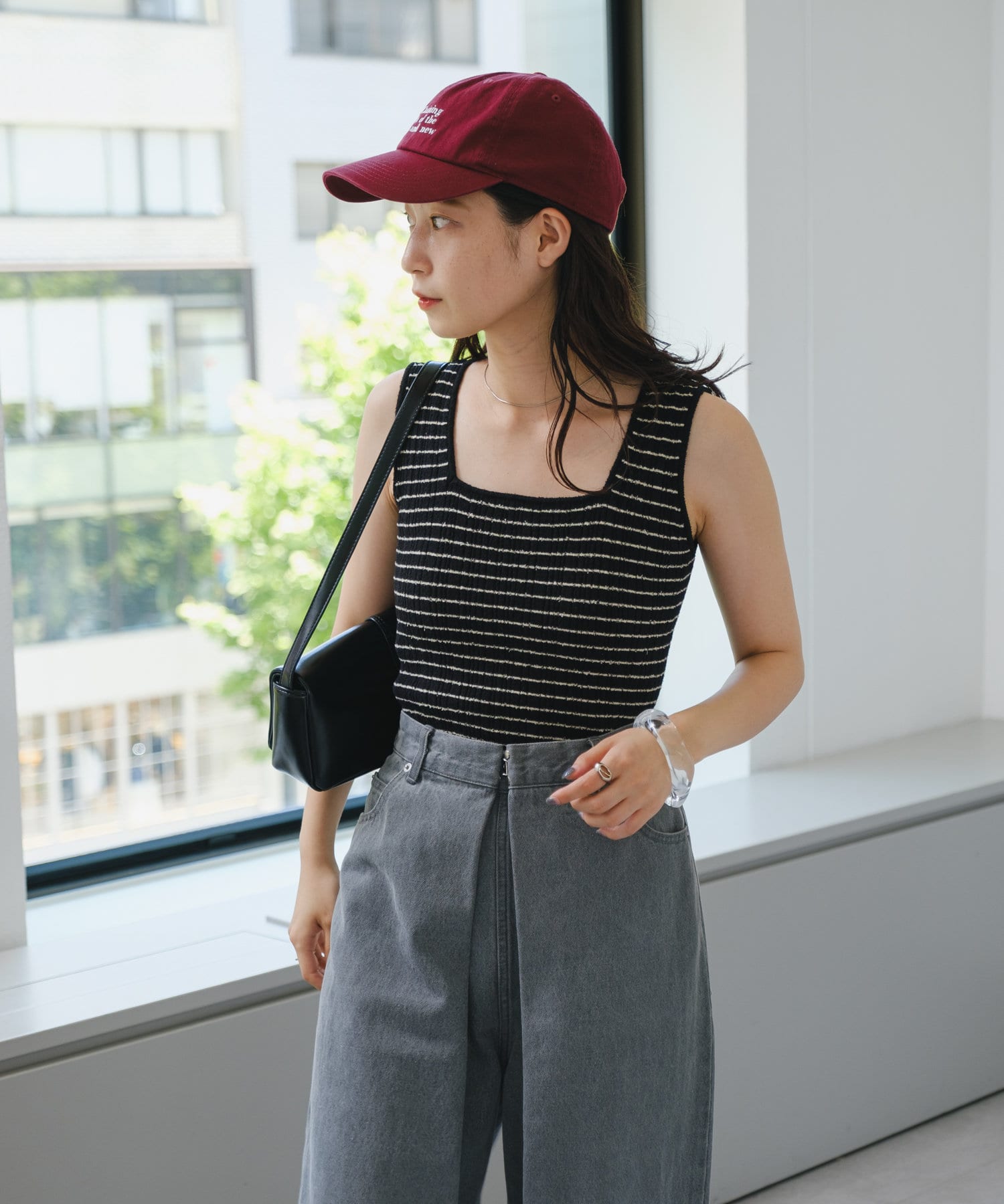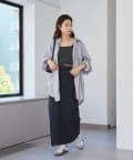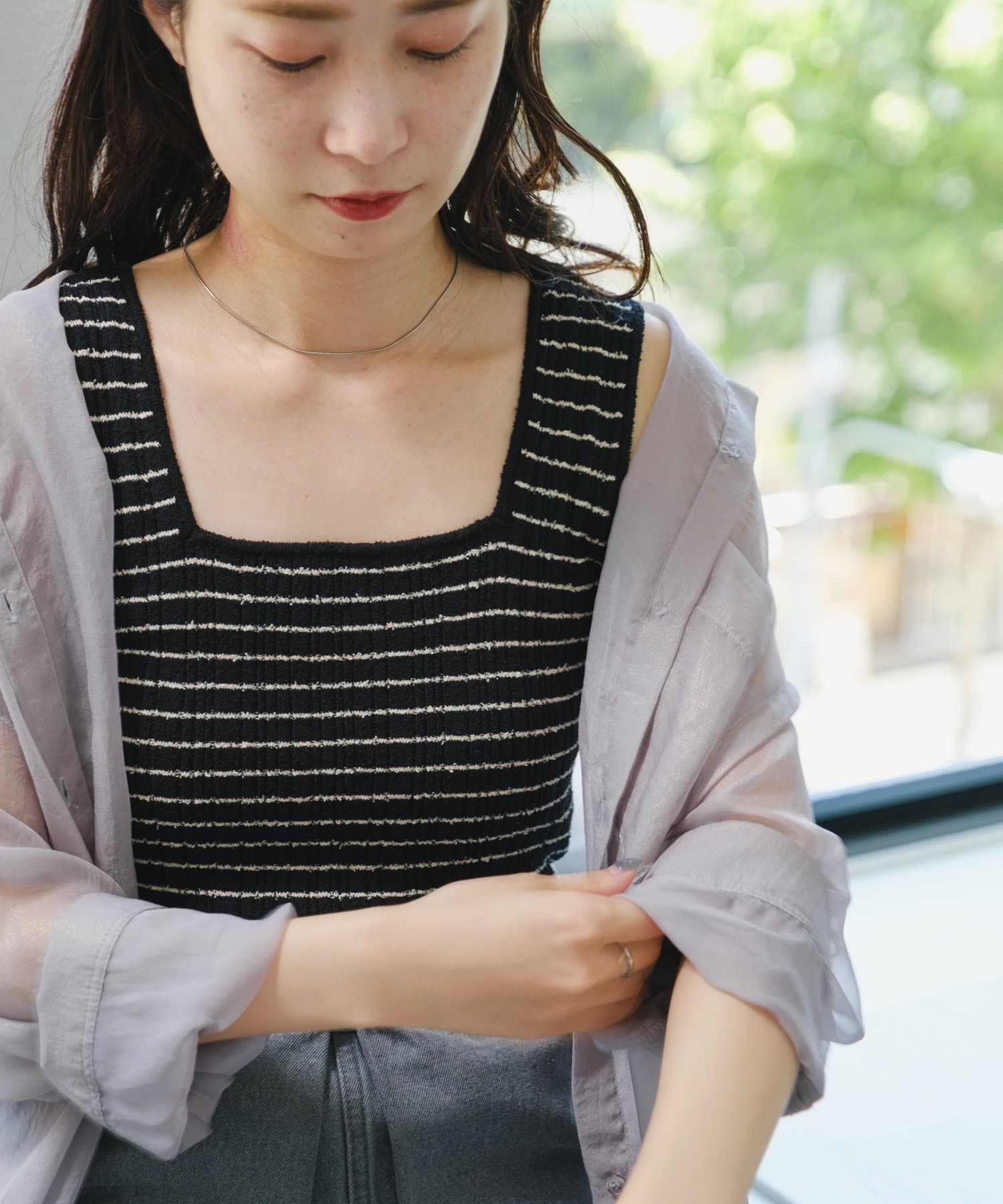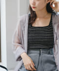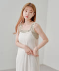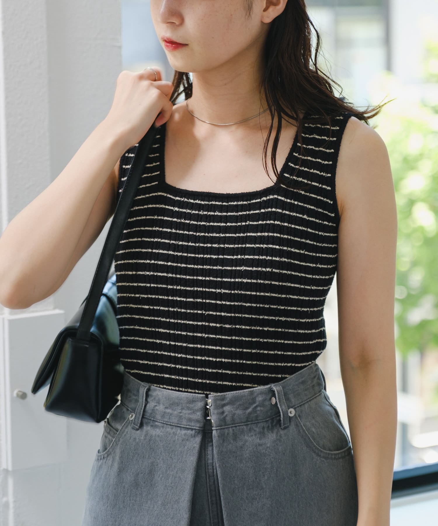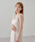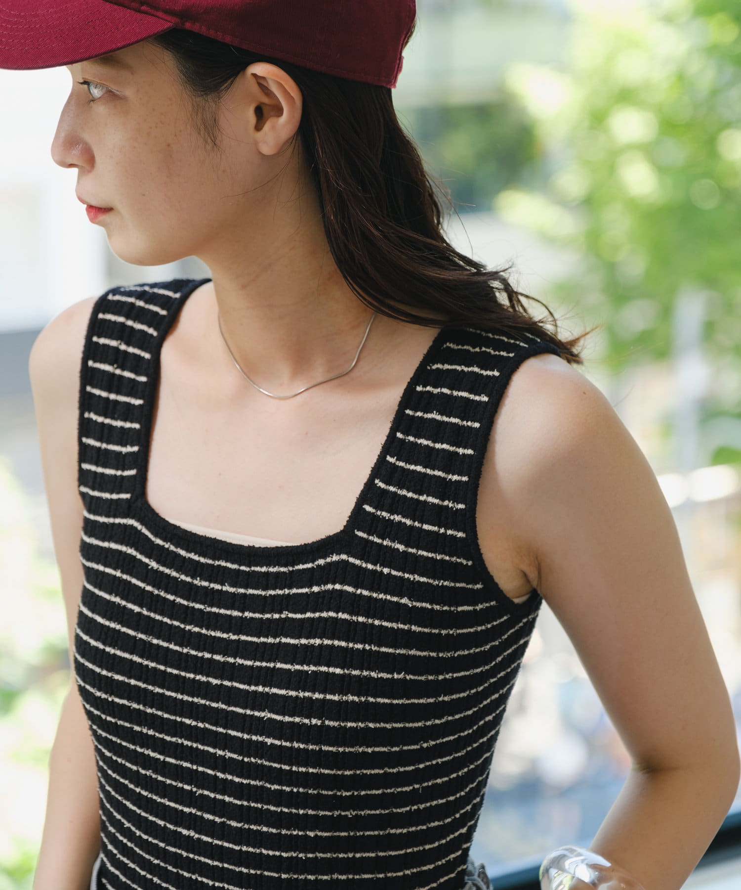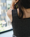 細ボーダーが女性らしさを演出しつつ、太めの肩紐がカジュアルな印象に。