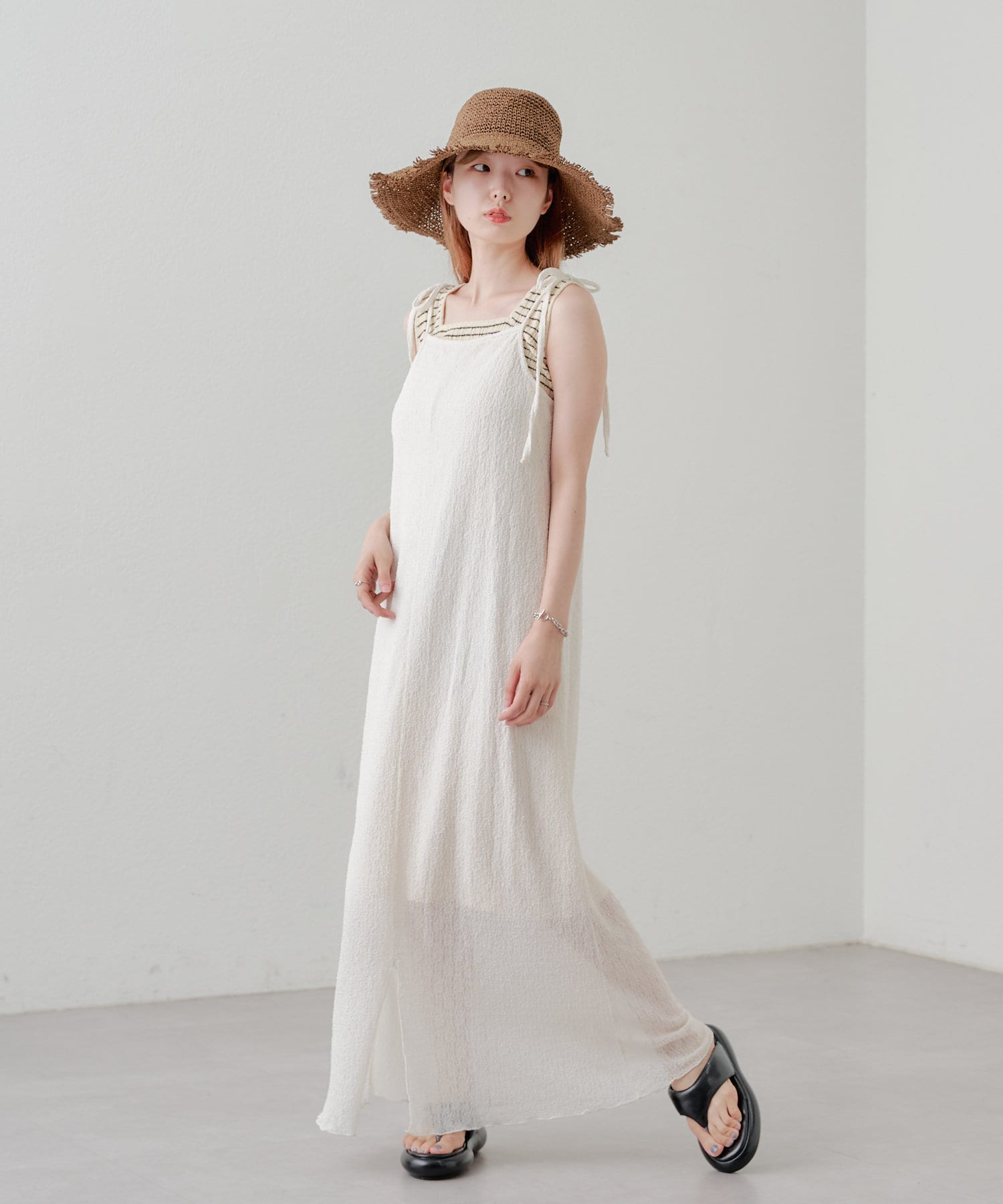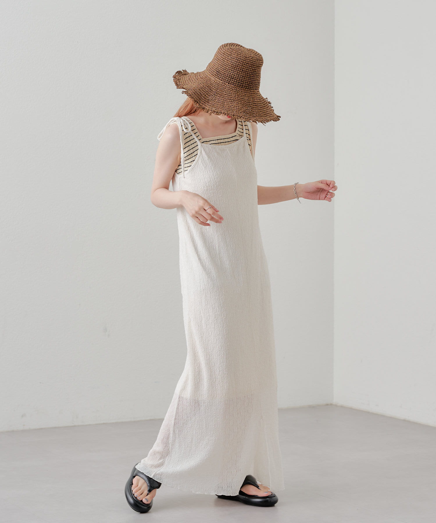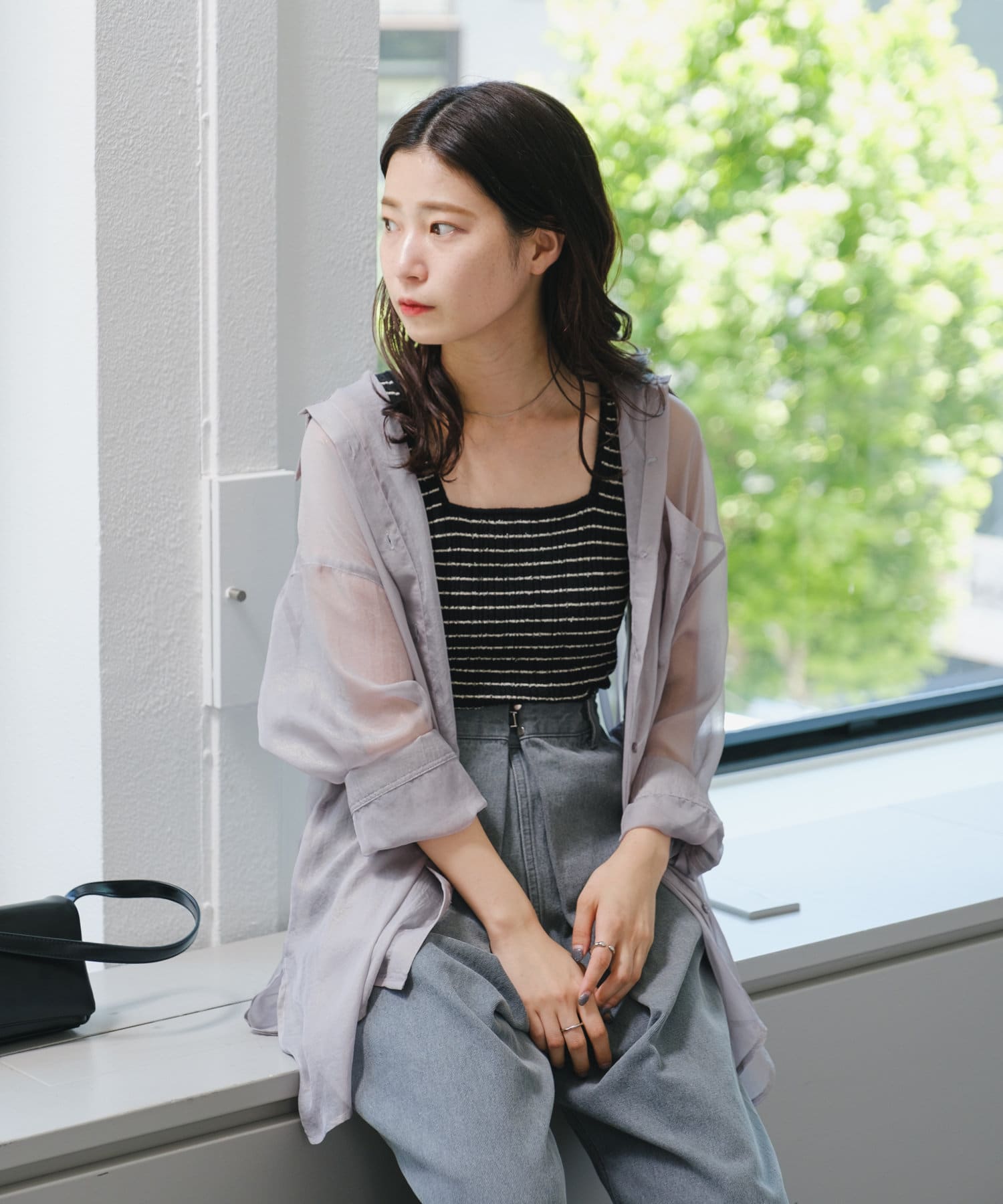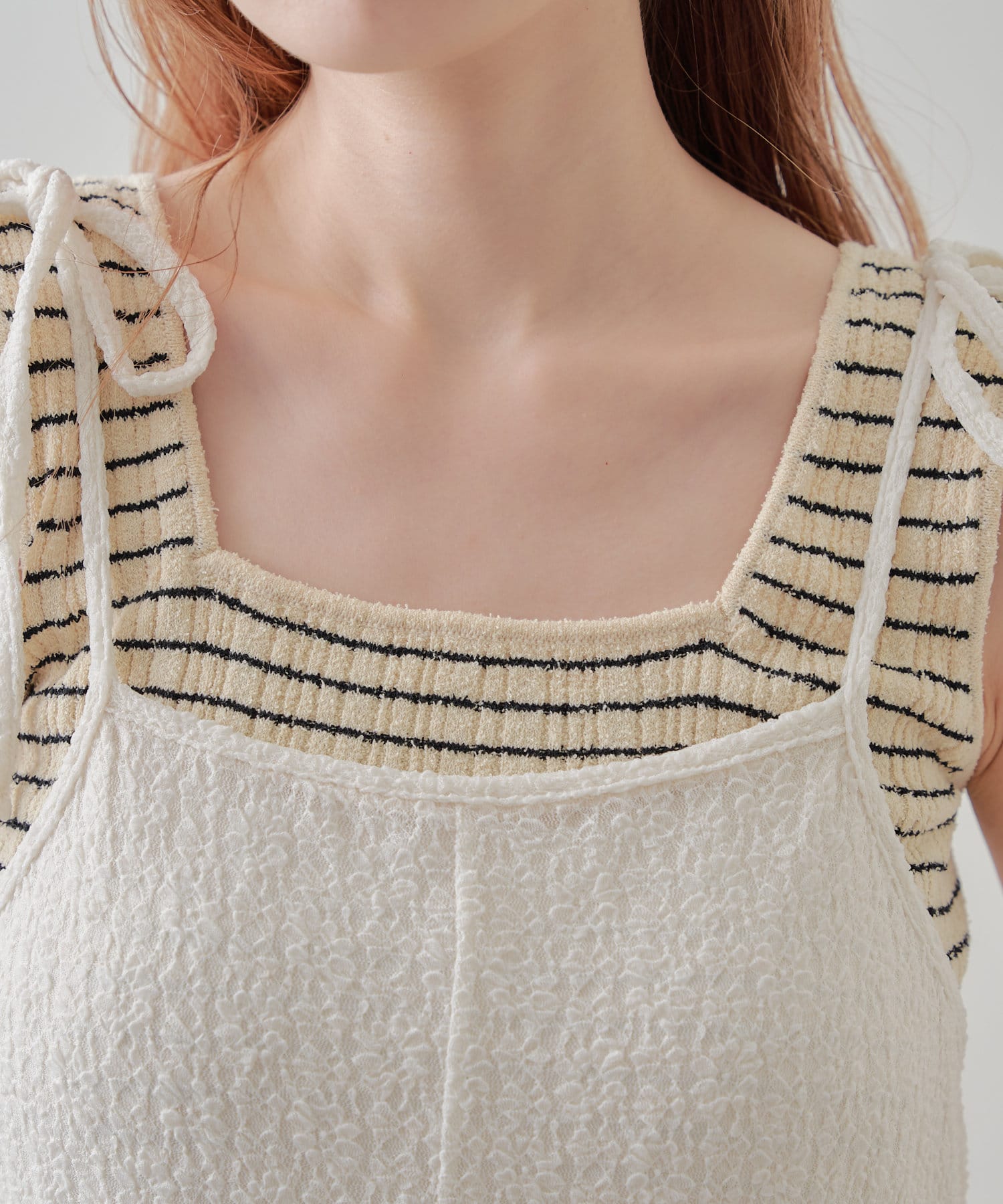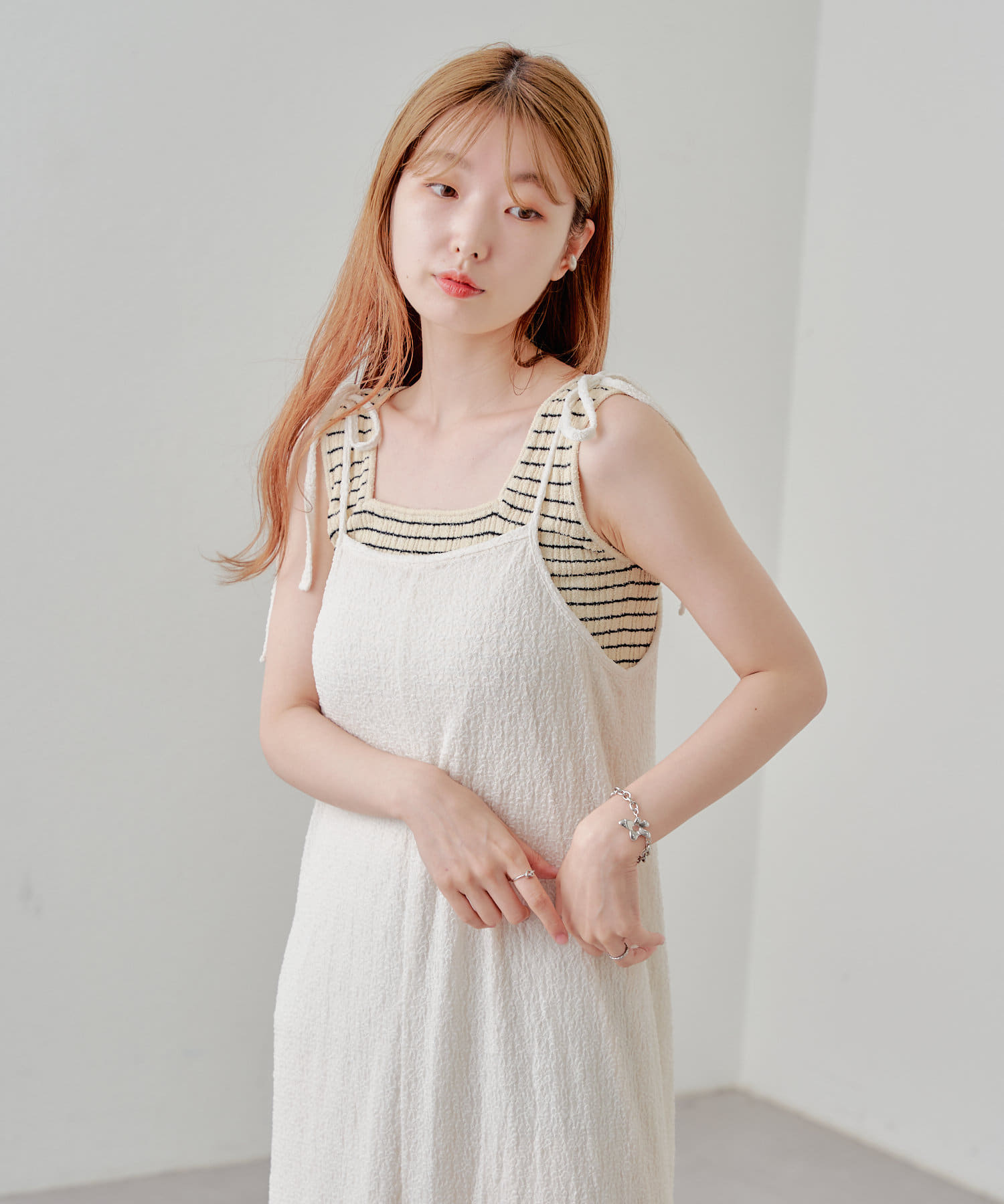 細ボーダーが女性らしさを演出しつつ、太めの肩紐がカジュアルな印象に。