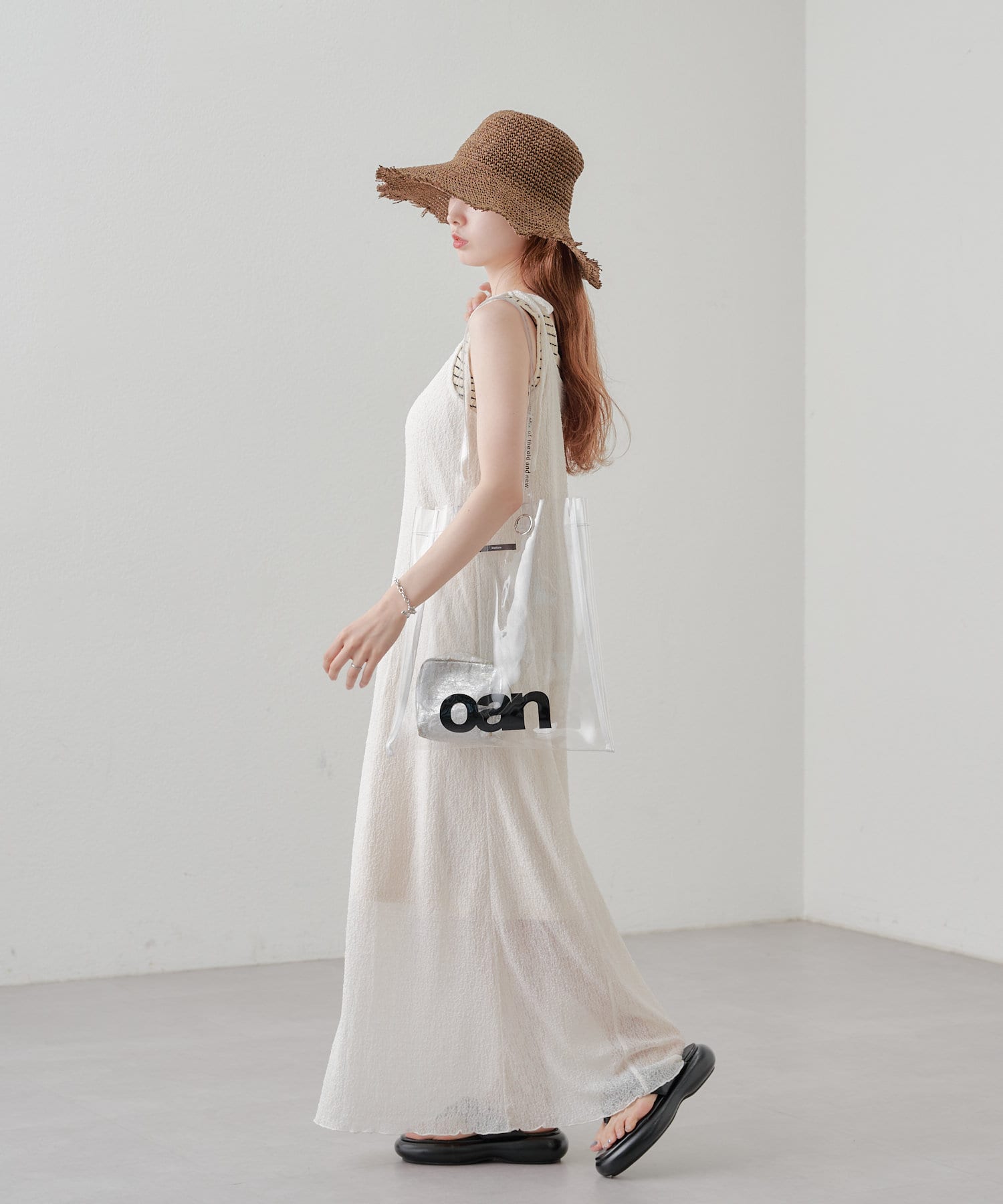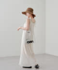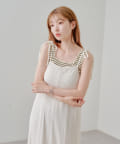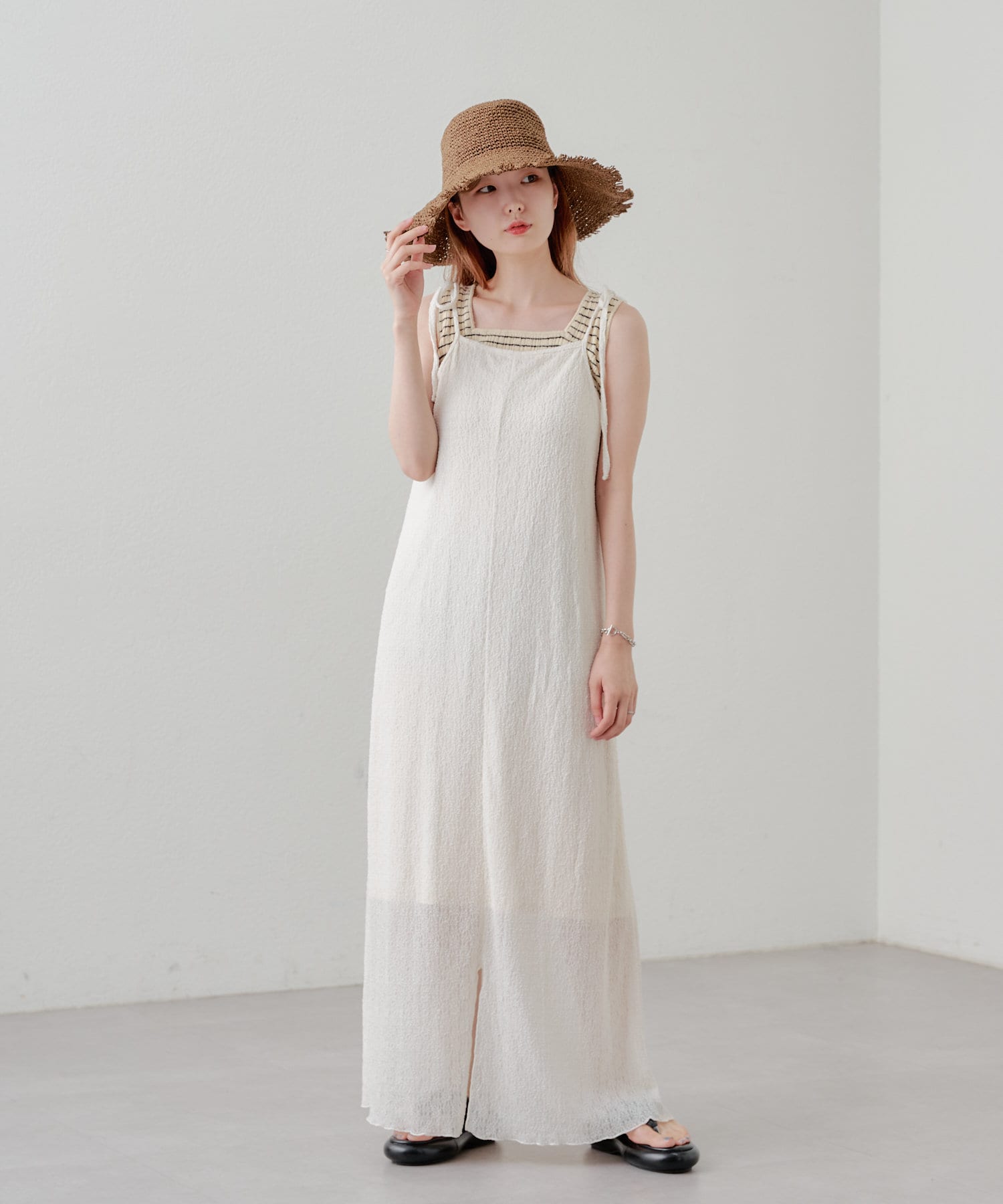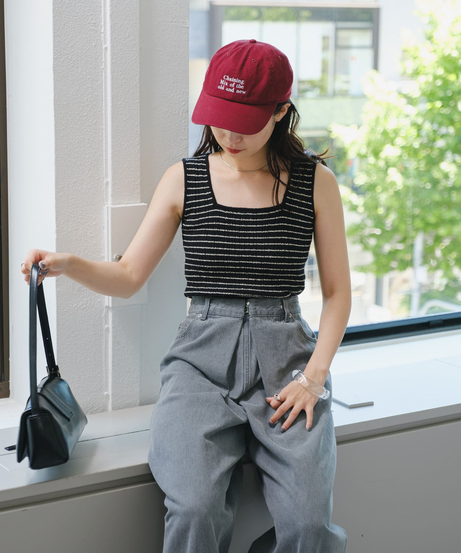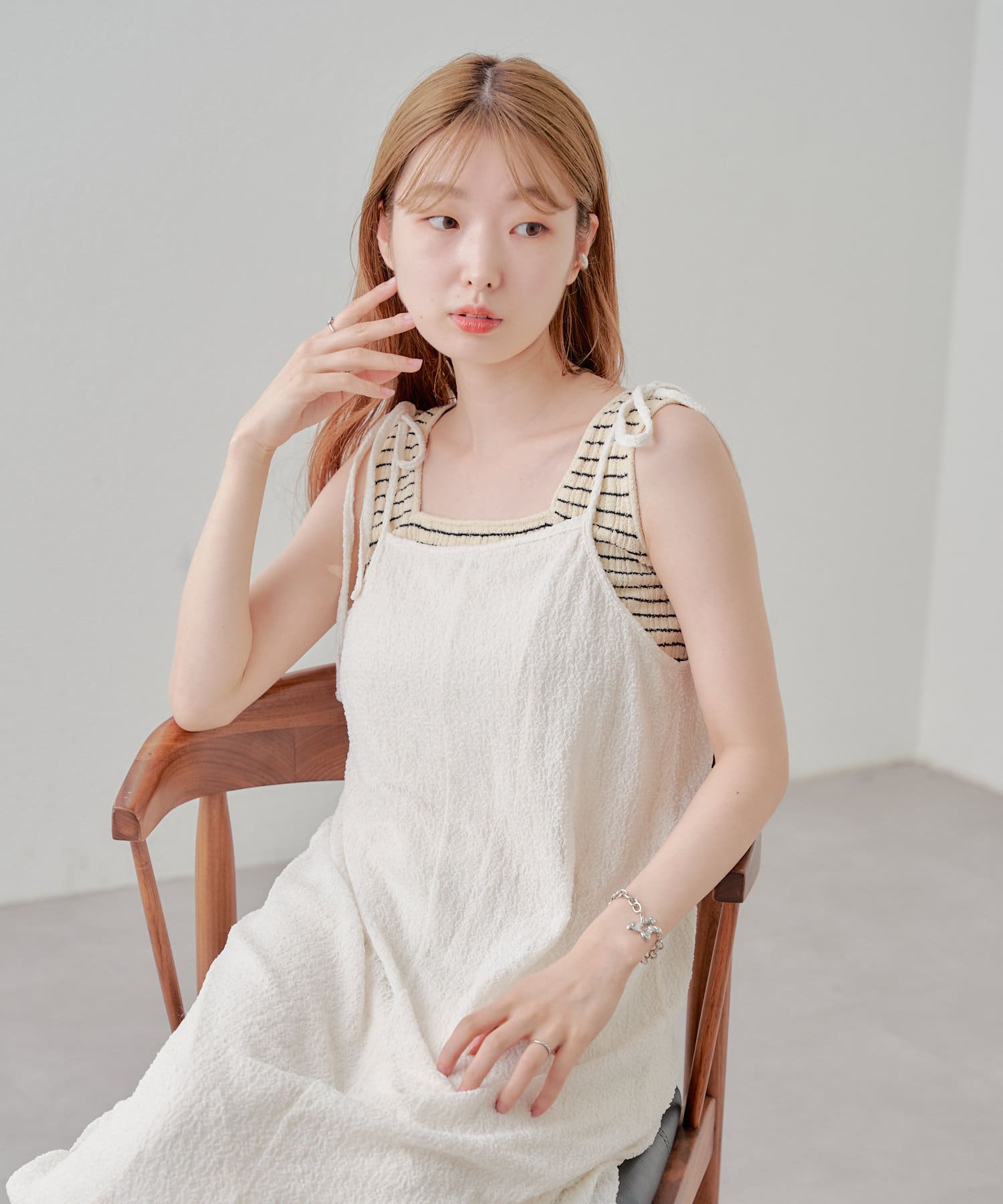 細ボーダーが女性らしさを演出しつつ、太めの肩紐がカジュアルな印象に。