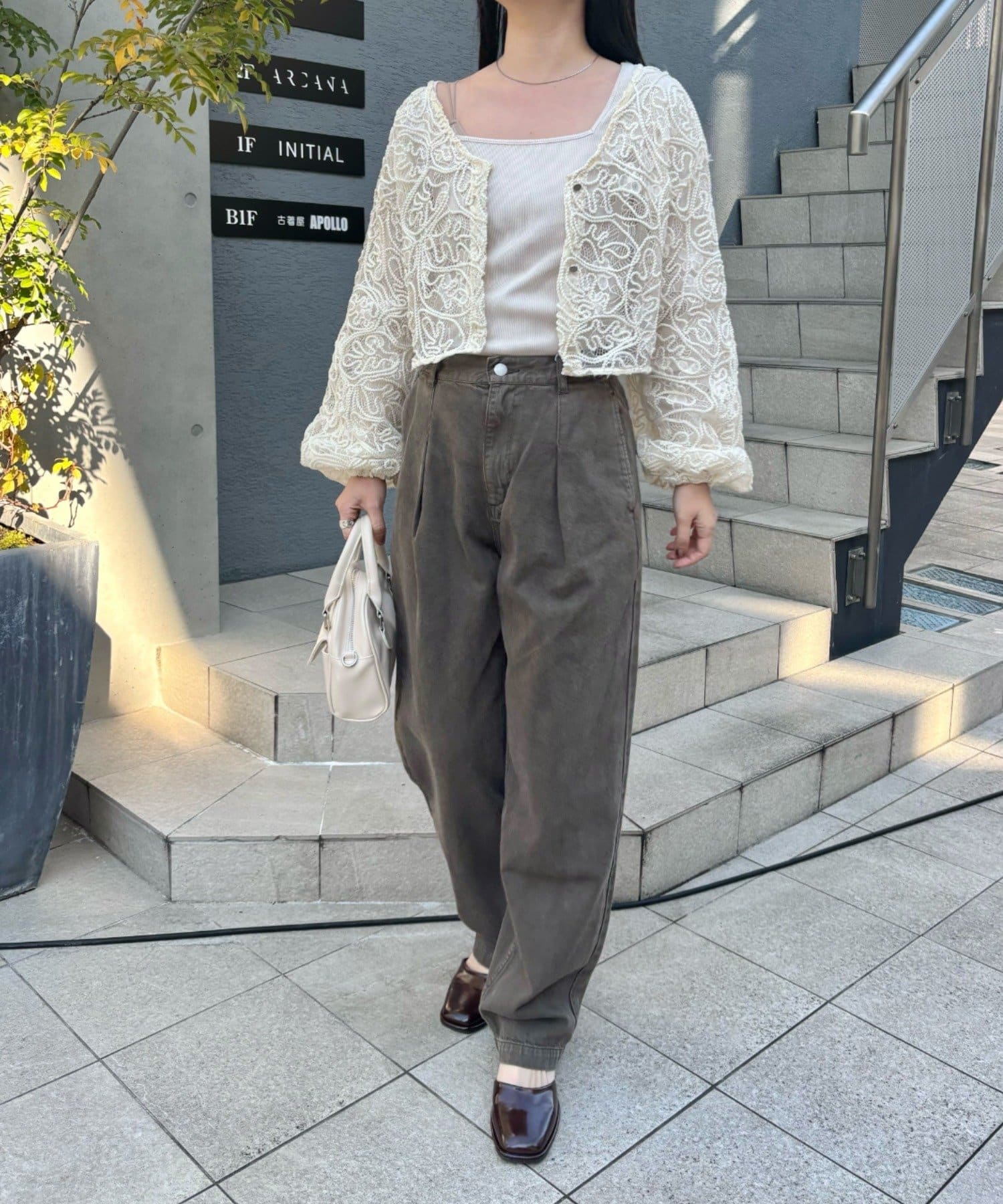 上品な加工感とワンタックのディテールがコーデに綺麗目な要素をプラス。