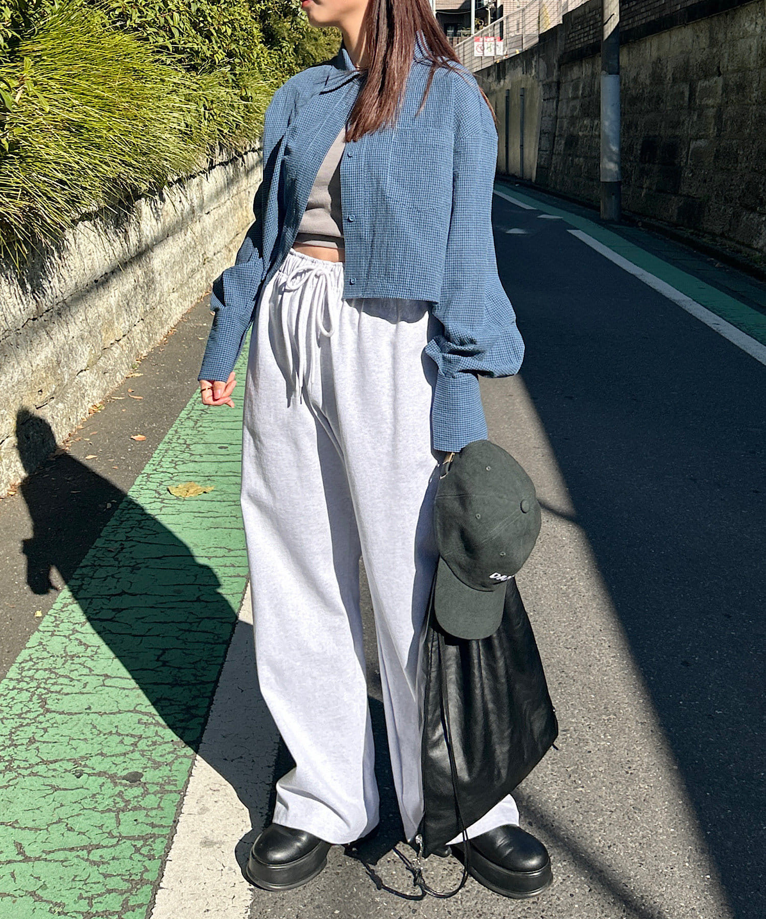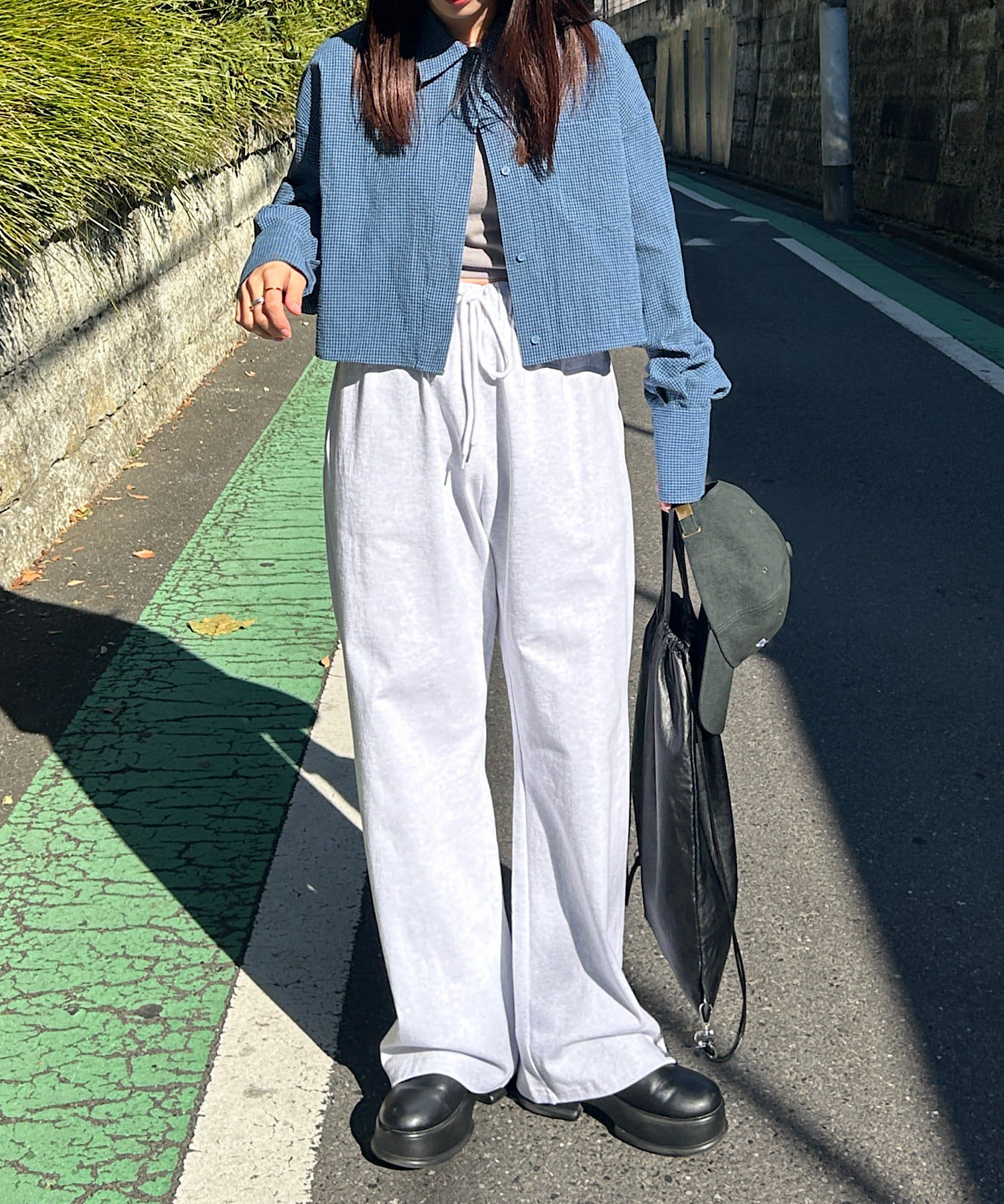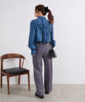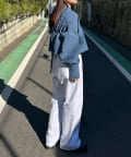 ボタンを開けて羽織れば、ボリュームのあるボトムともバランスよく決まります。