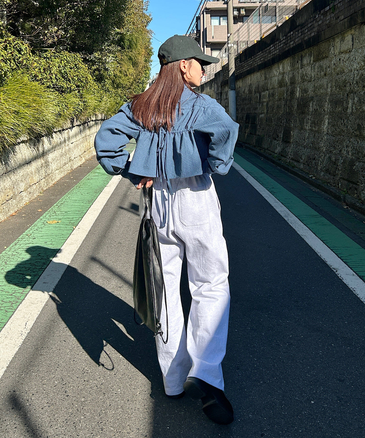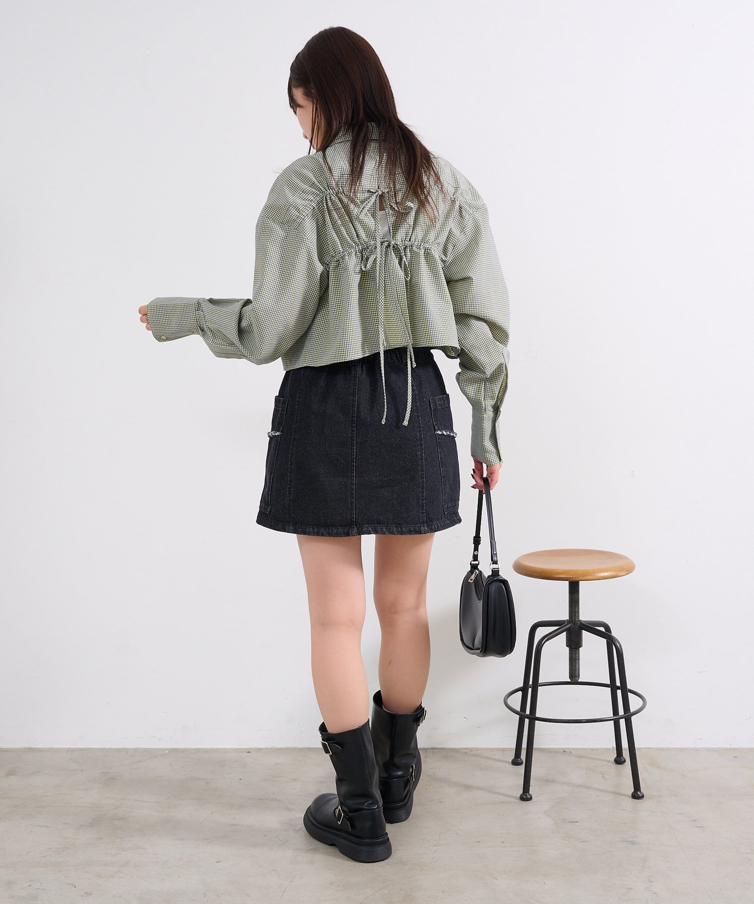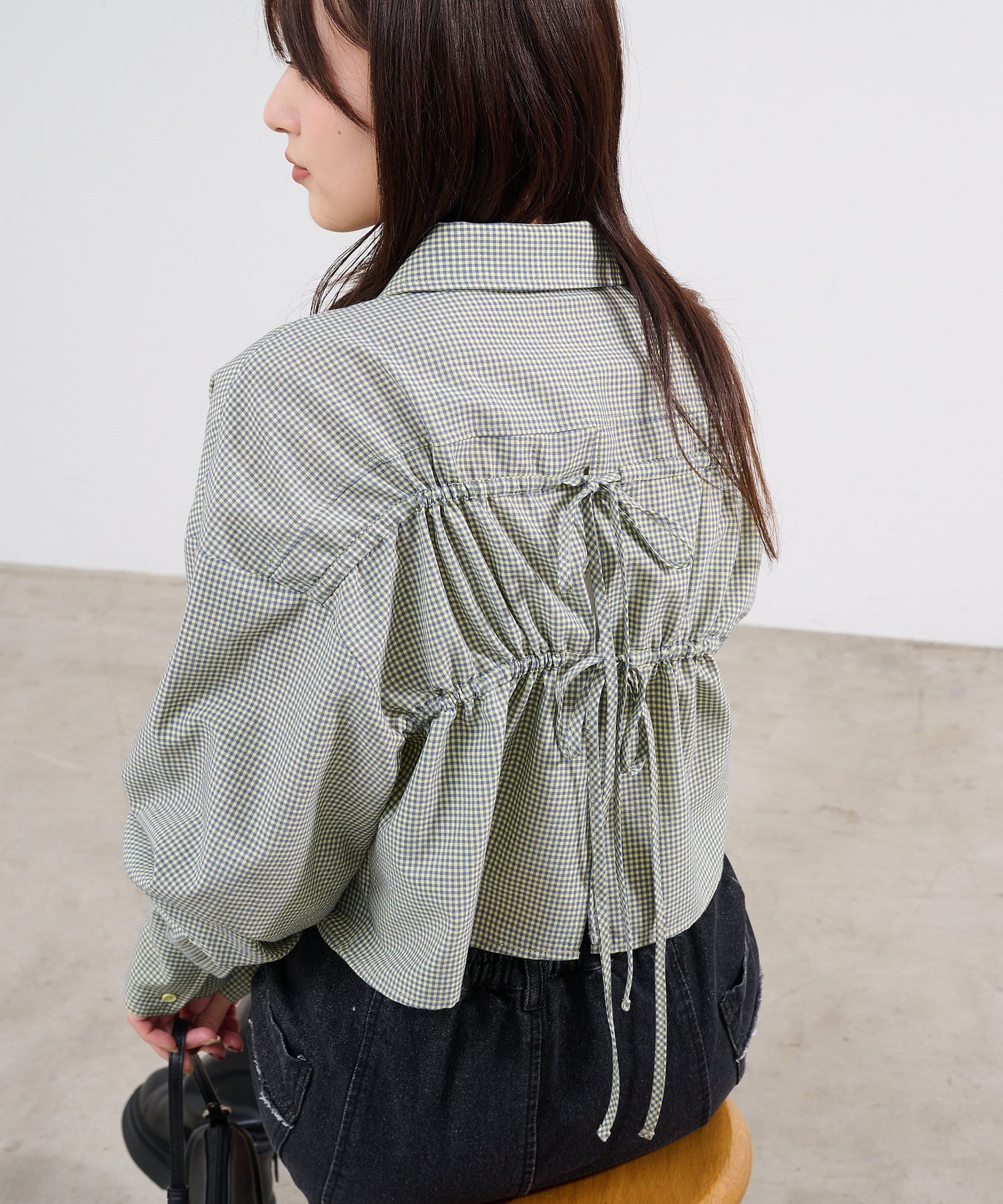 後ろ姿まで抜かりない一癖あるクロップドシャツ。