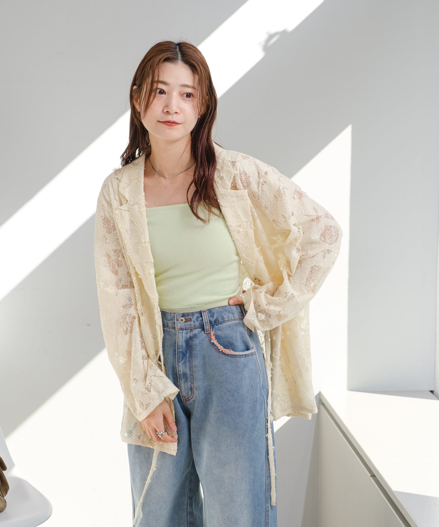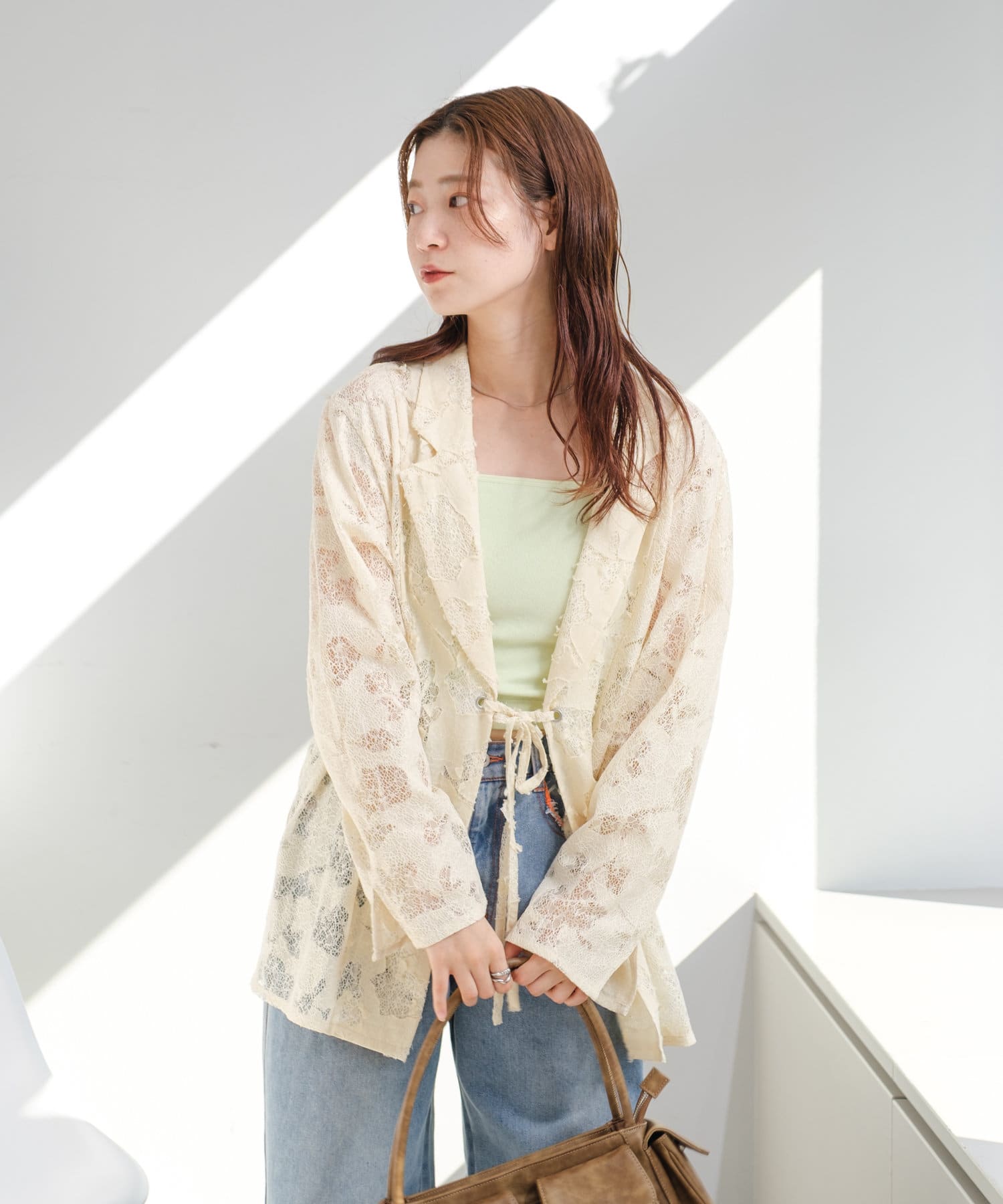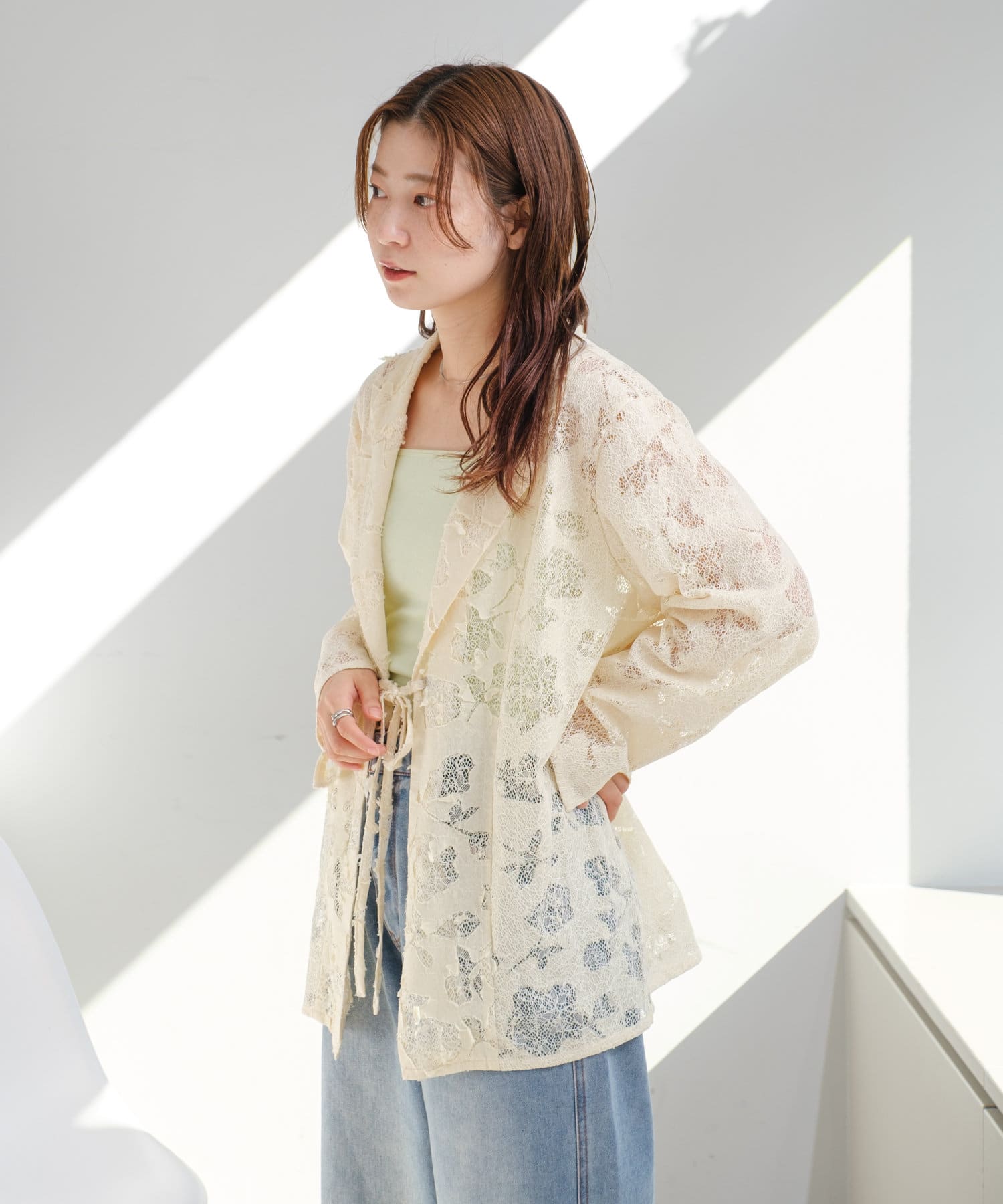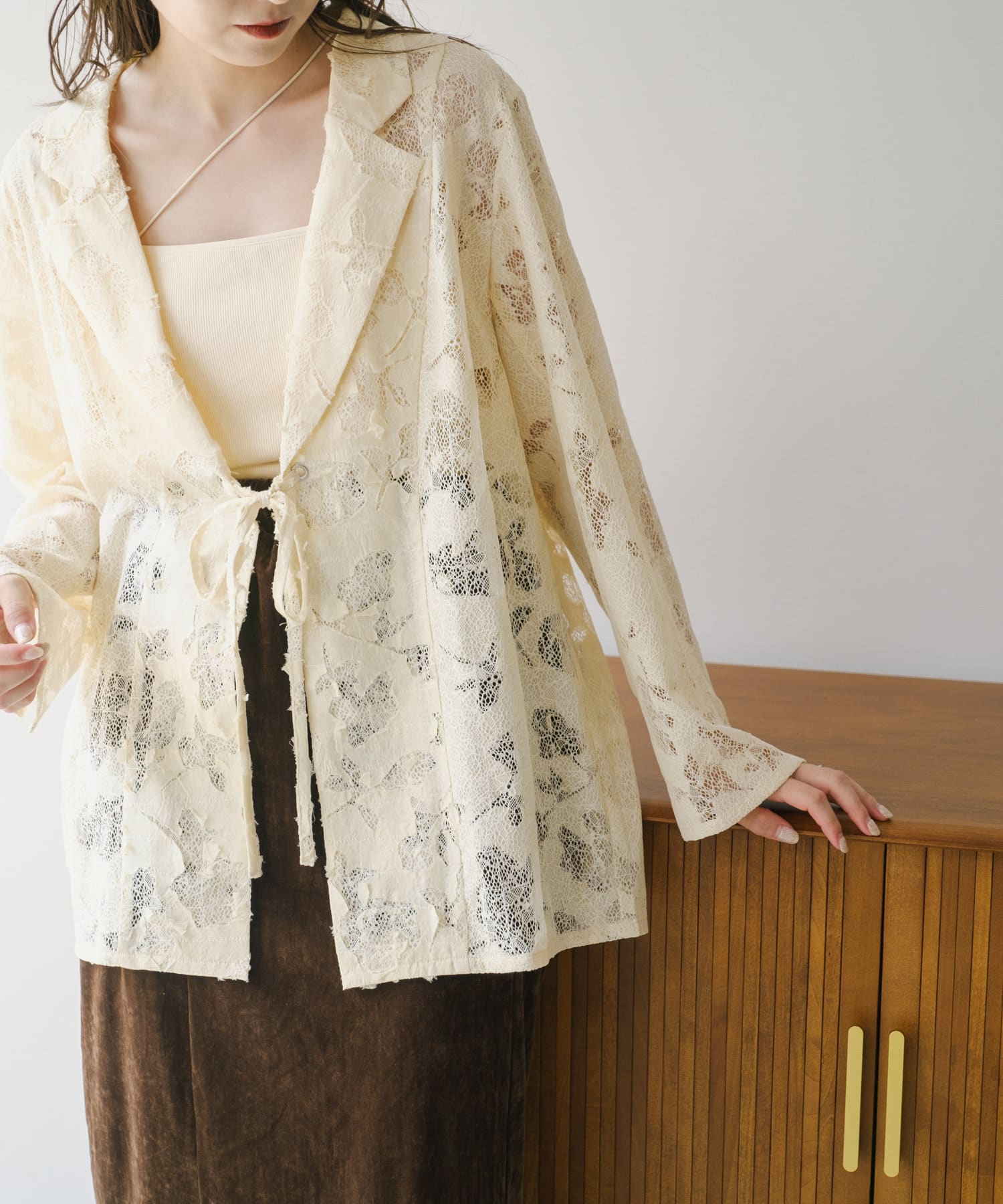 カップ付きインナーの上から羽織るだけで、あか抜けたスタイリングに。