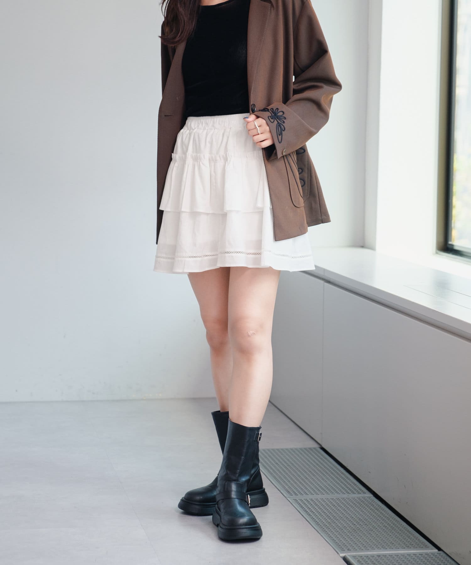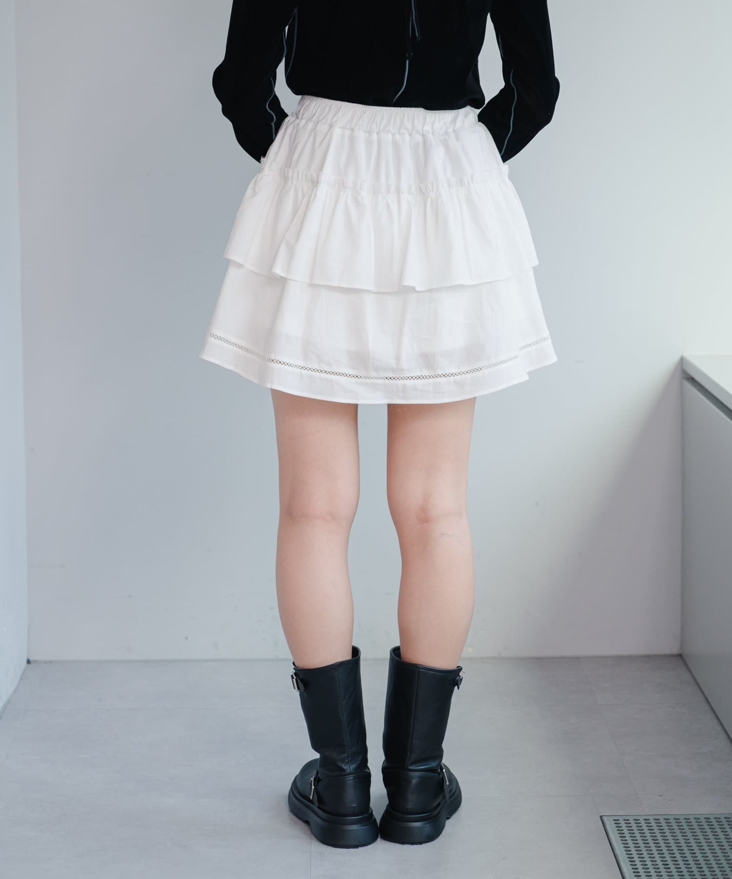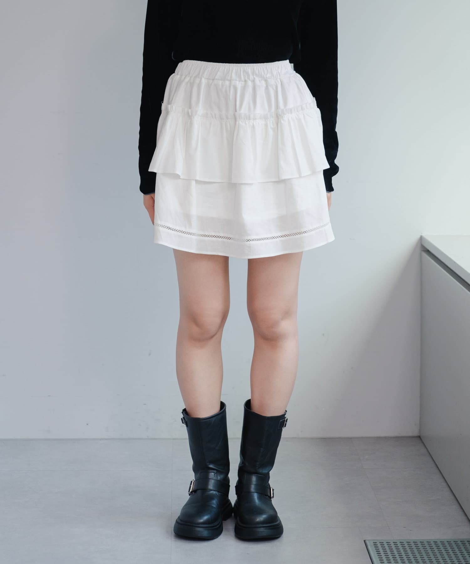 軽やかでフェミニンな印象のフリルティアードミニスカート。