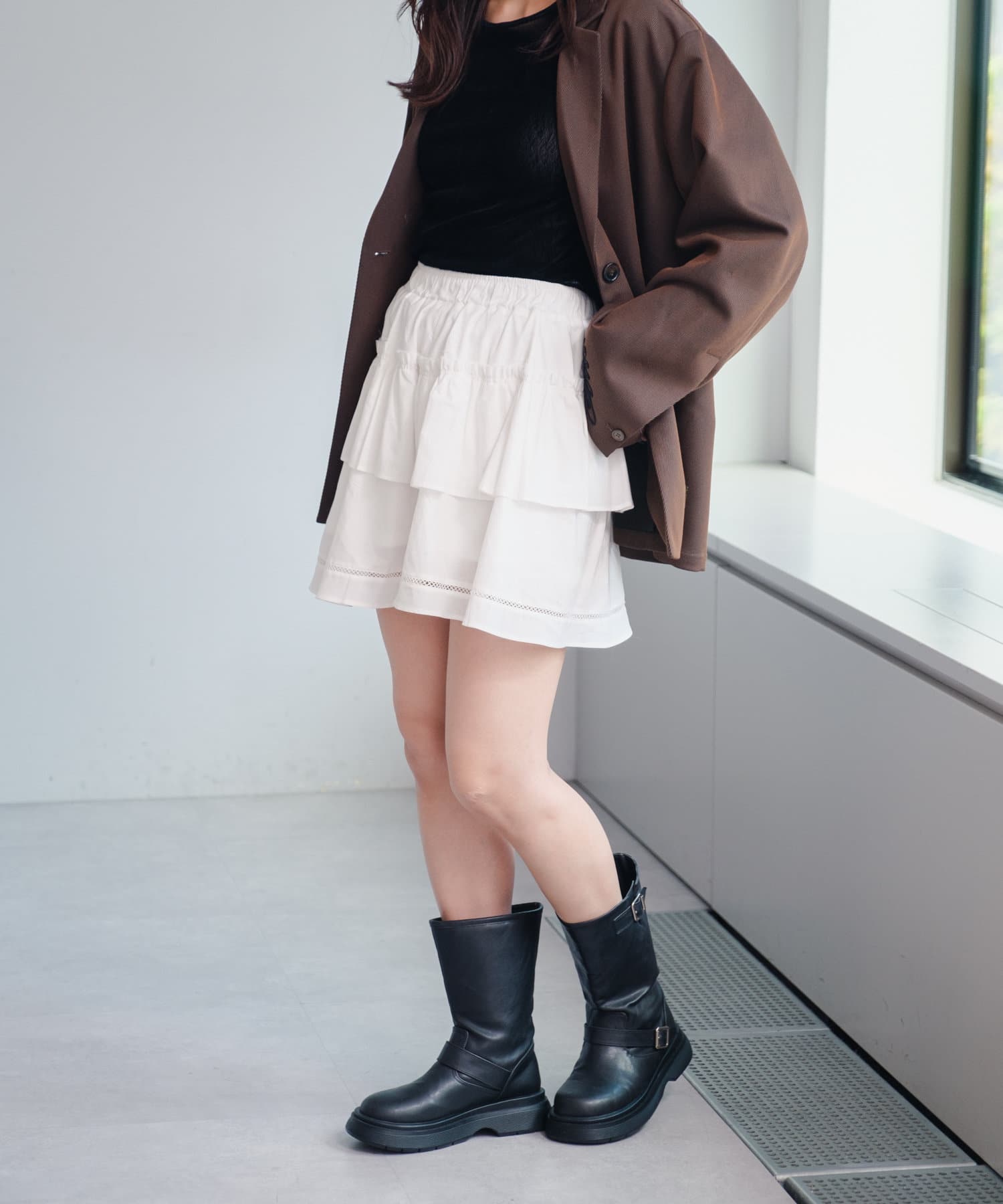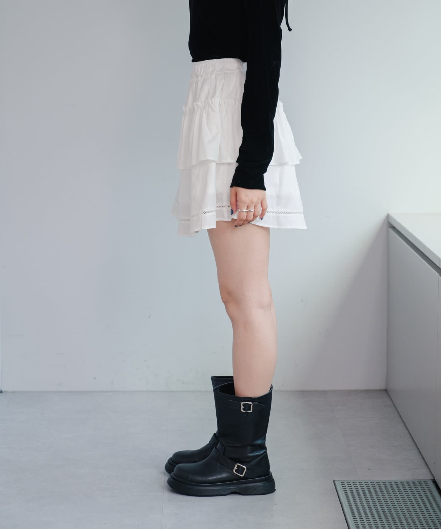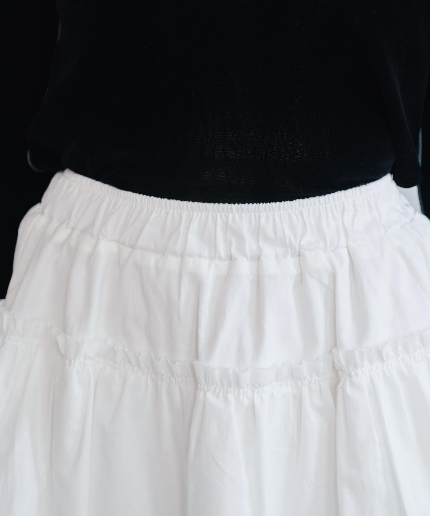 軽やかでフェミニンな印象のフリルティアードミニスカート。
