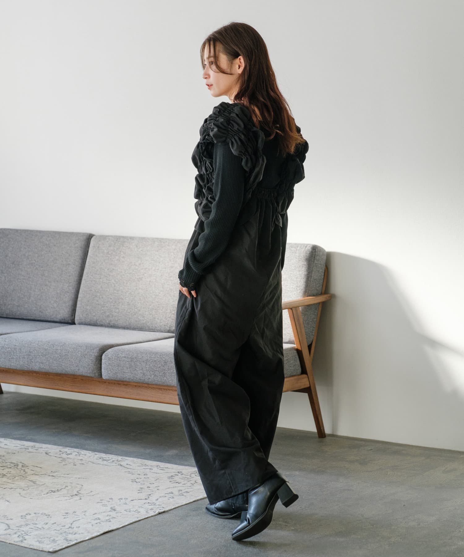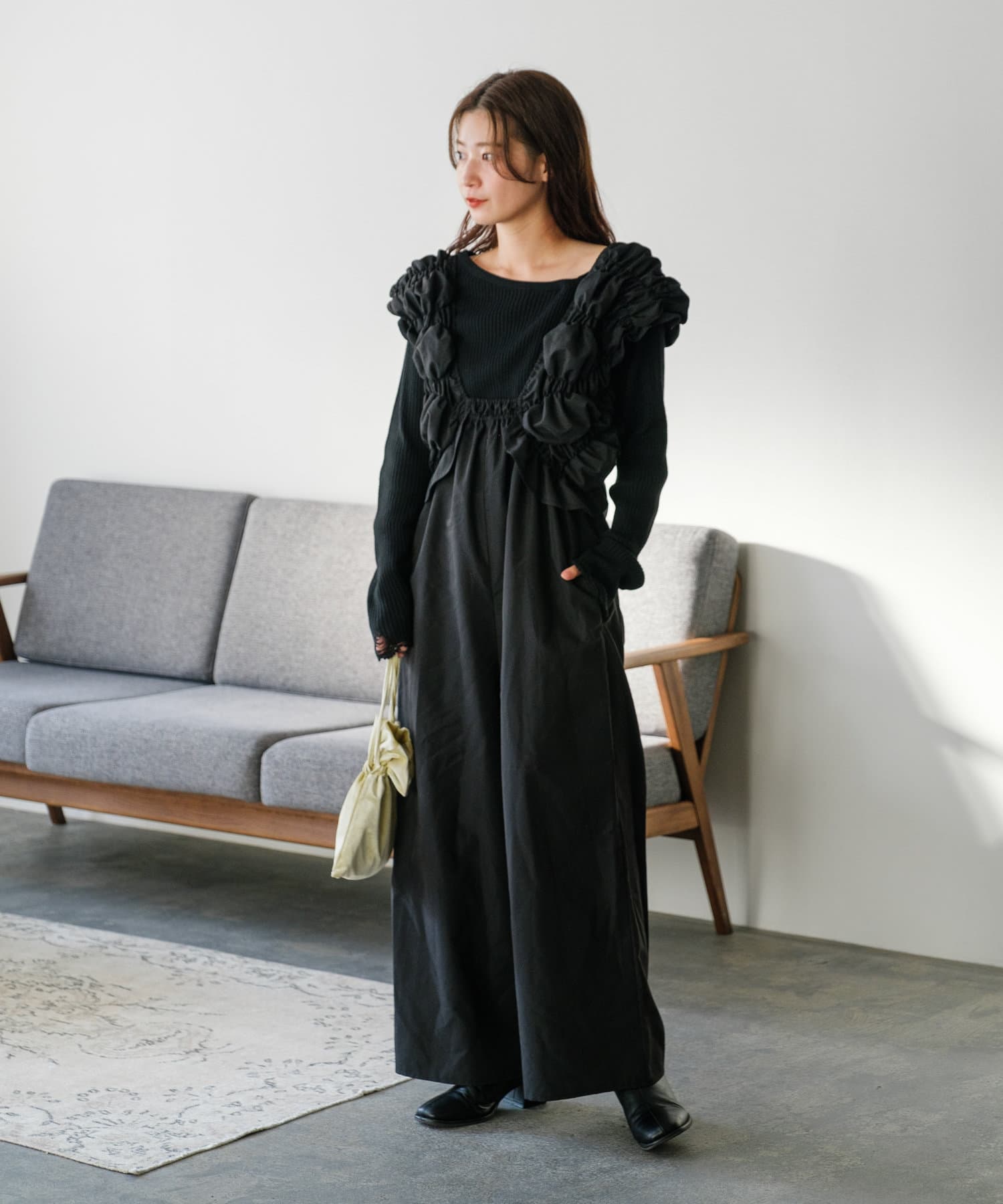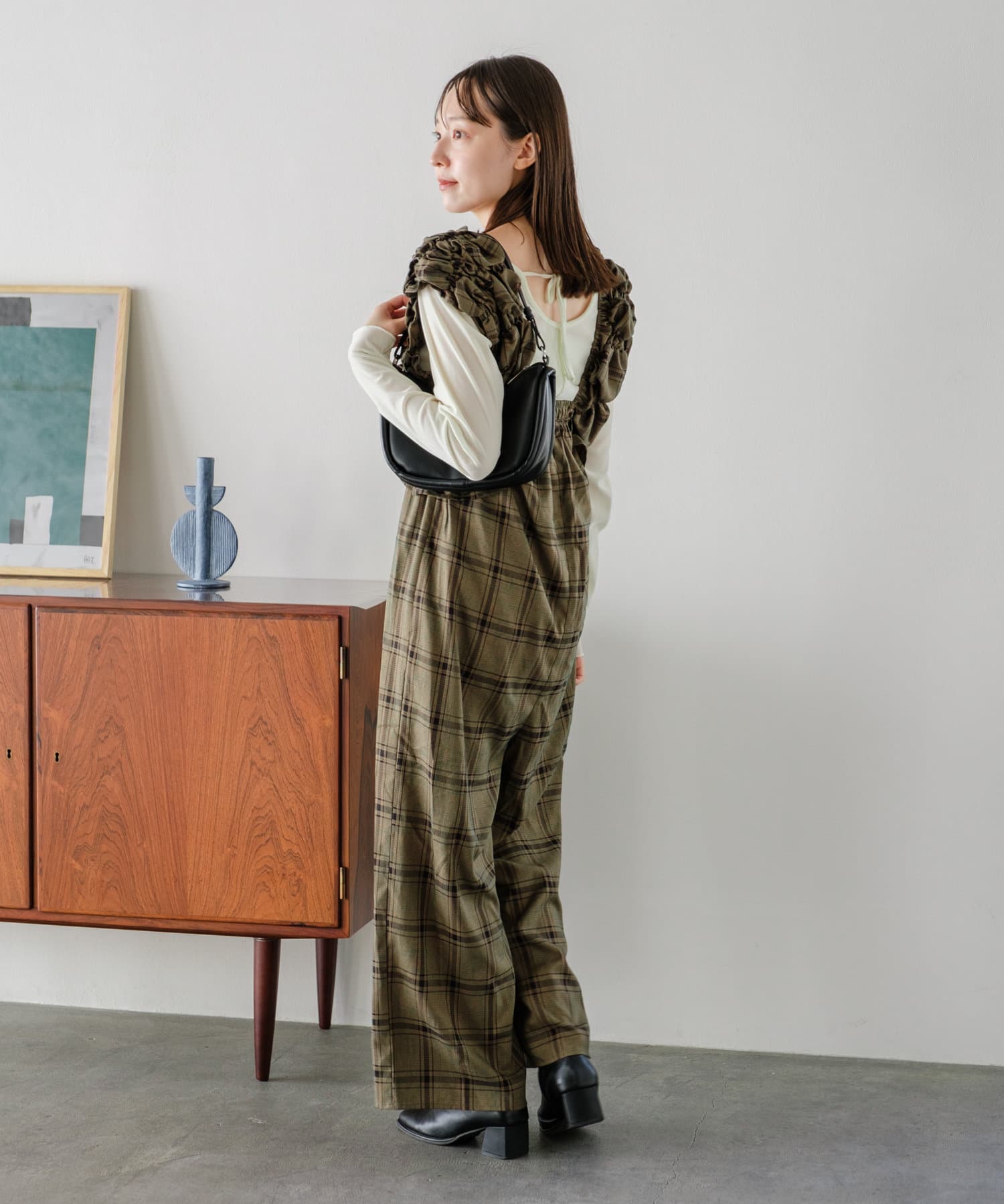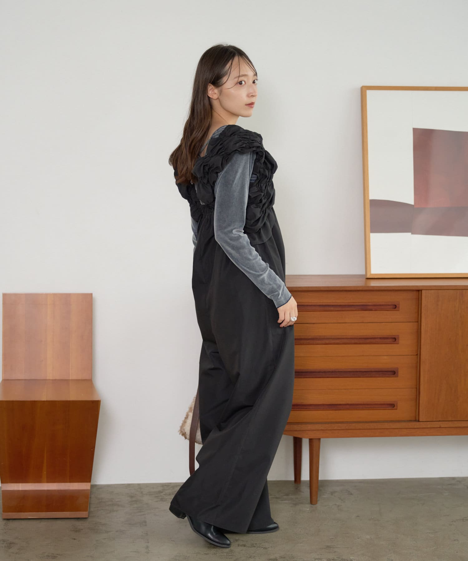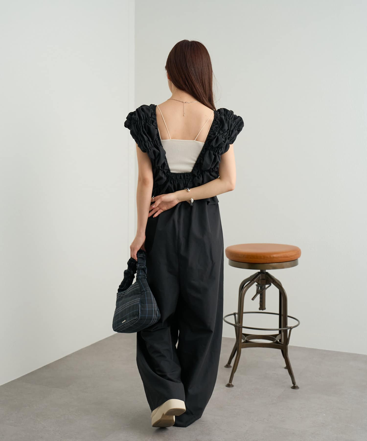 肩のボリューム感が目を惹くシャーリングギャザーサロペ。
