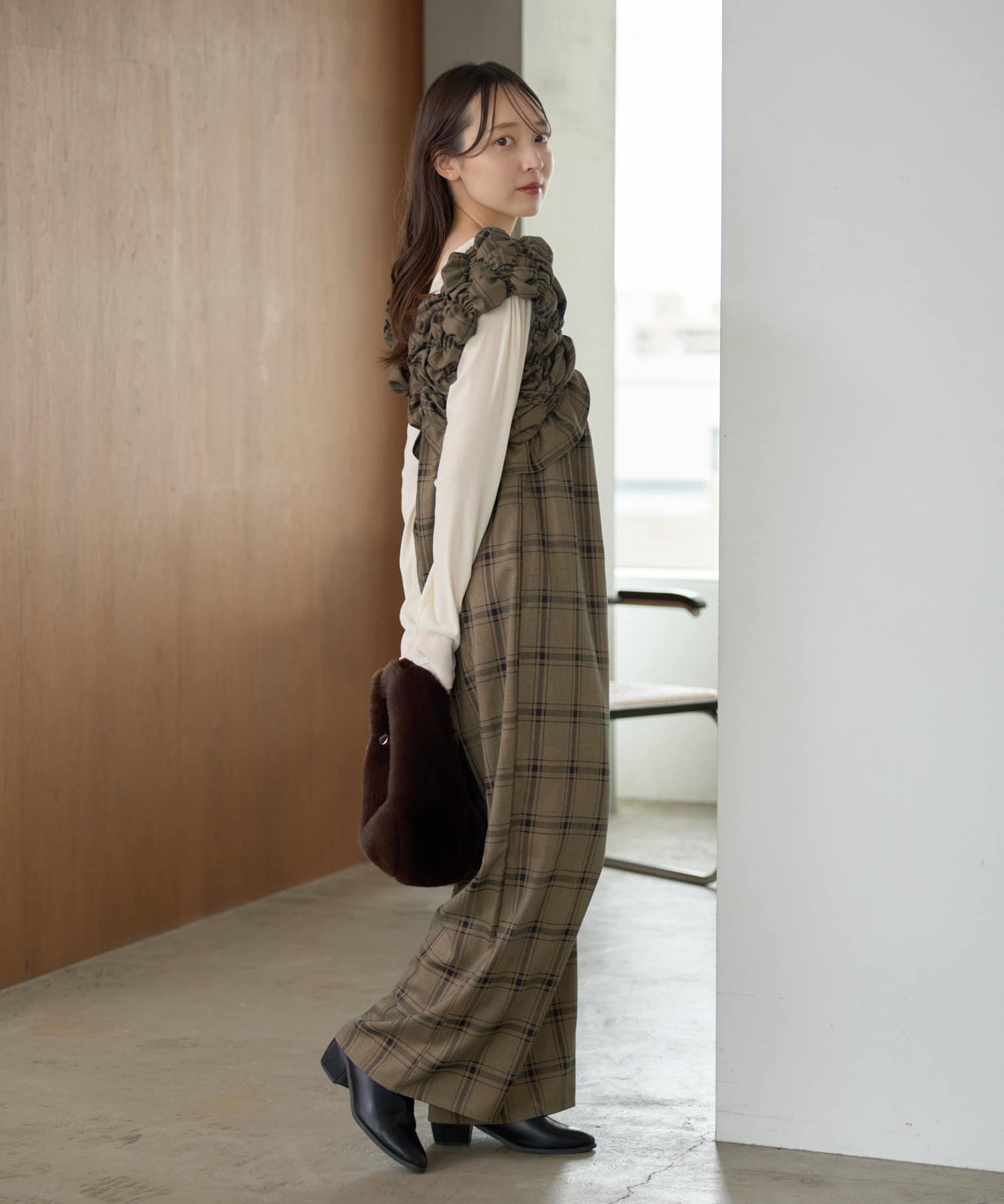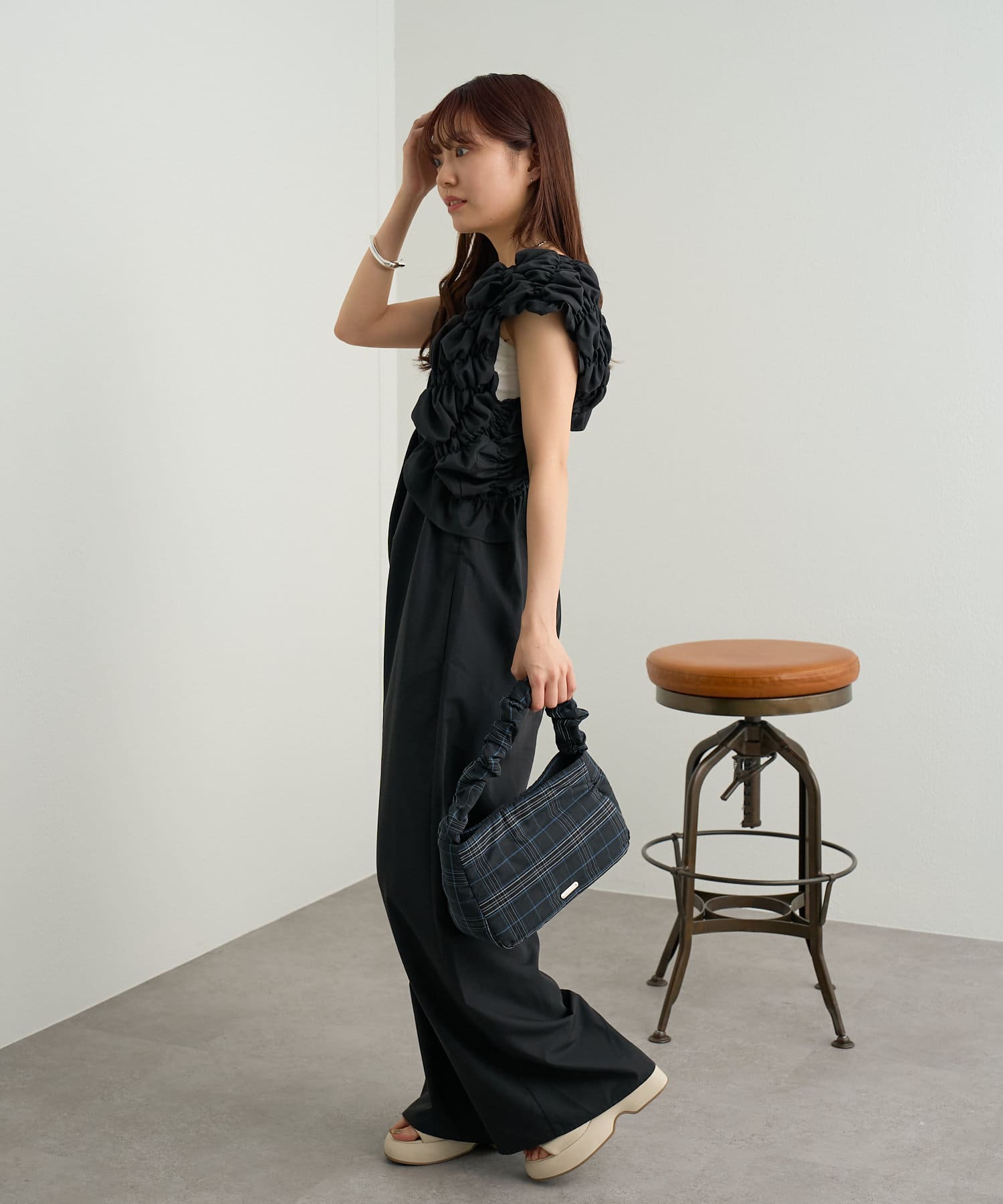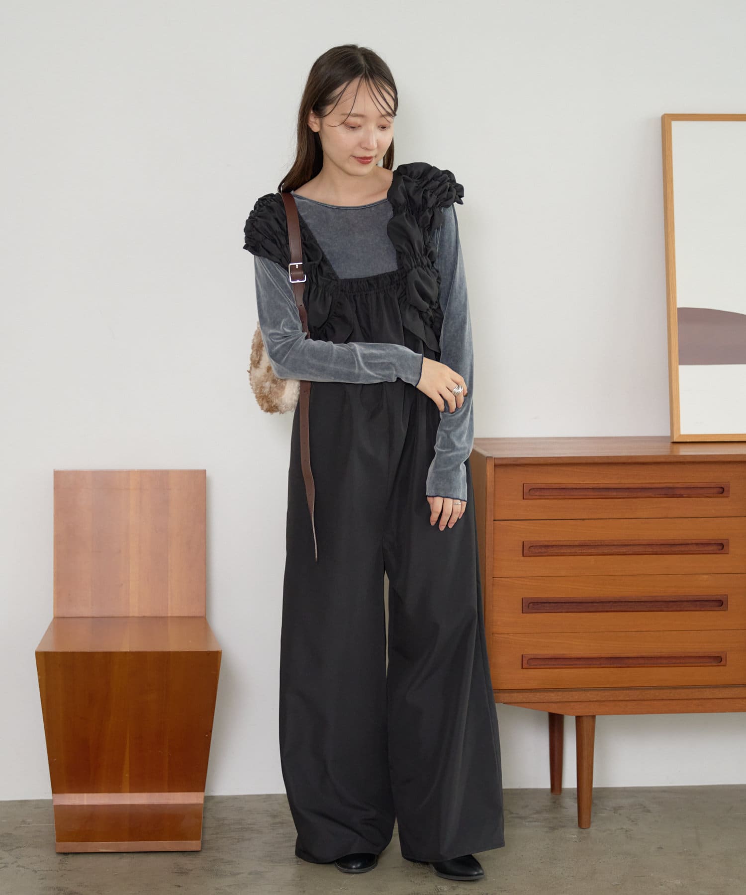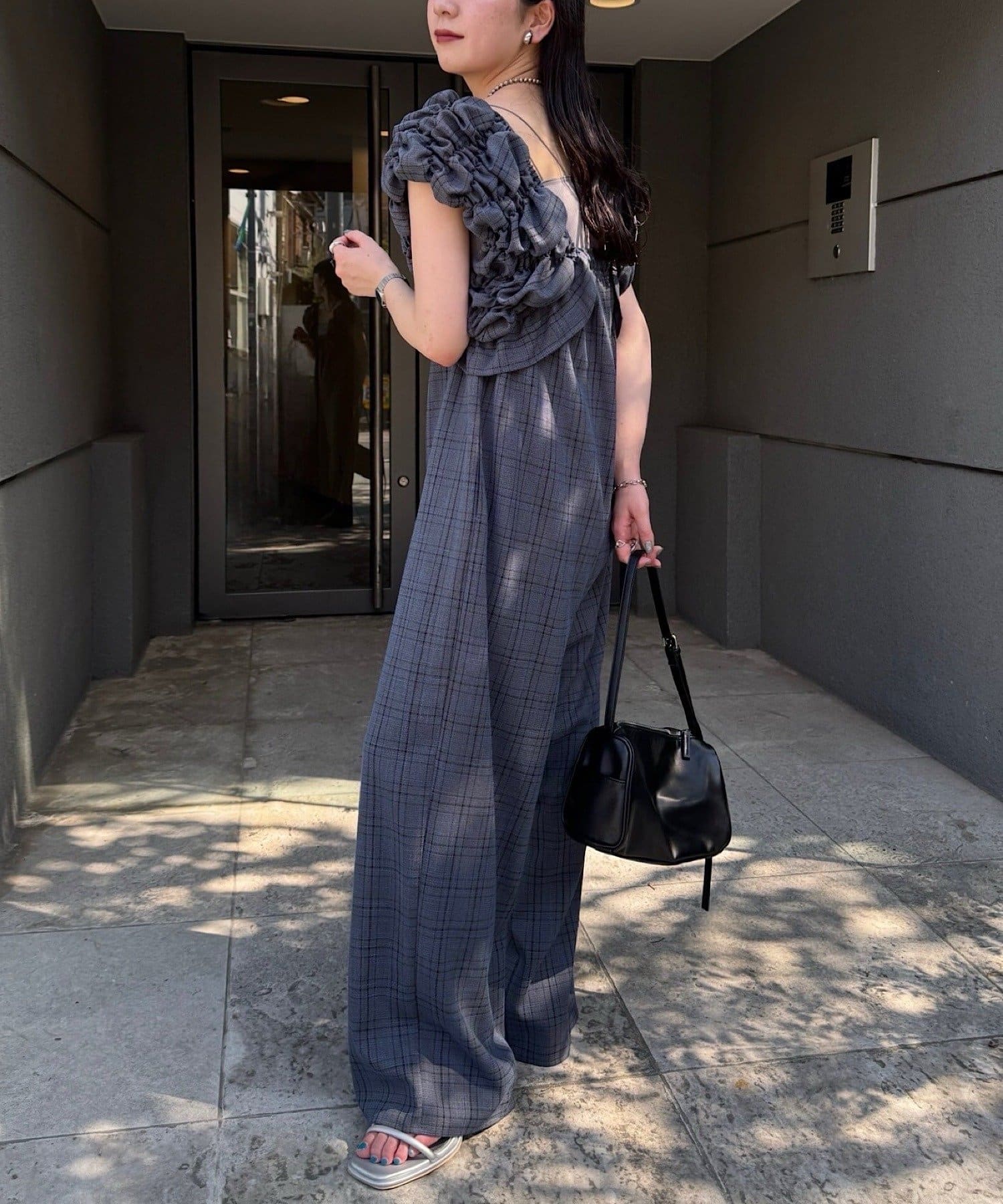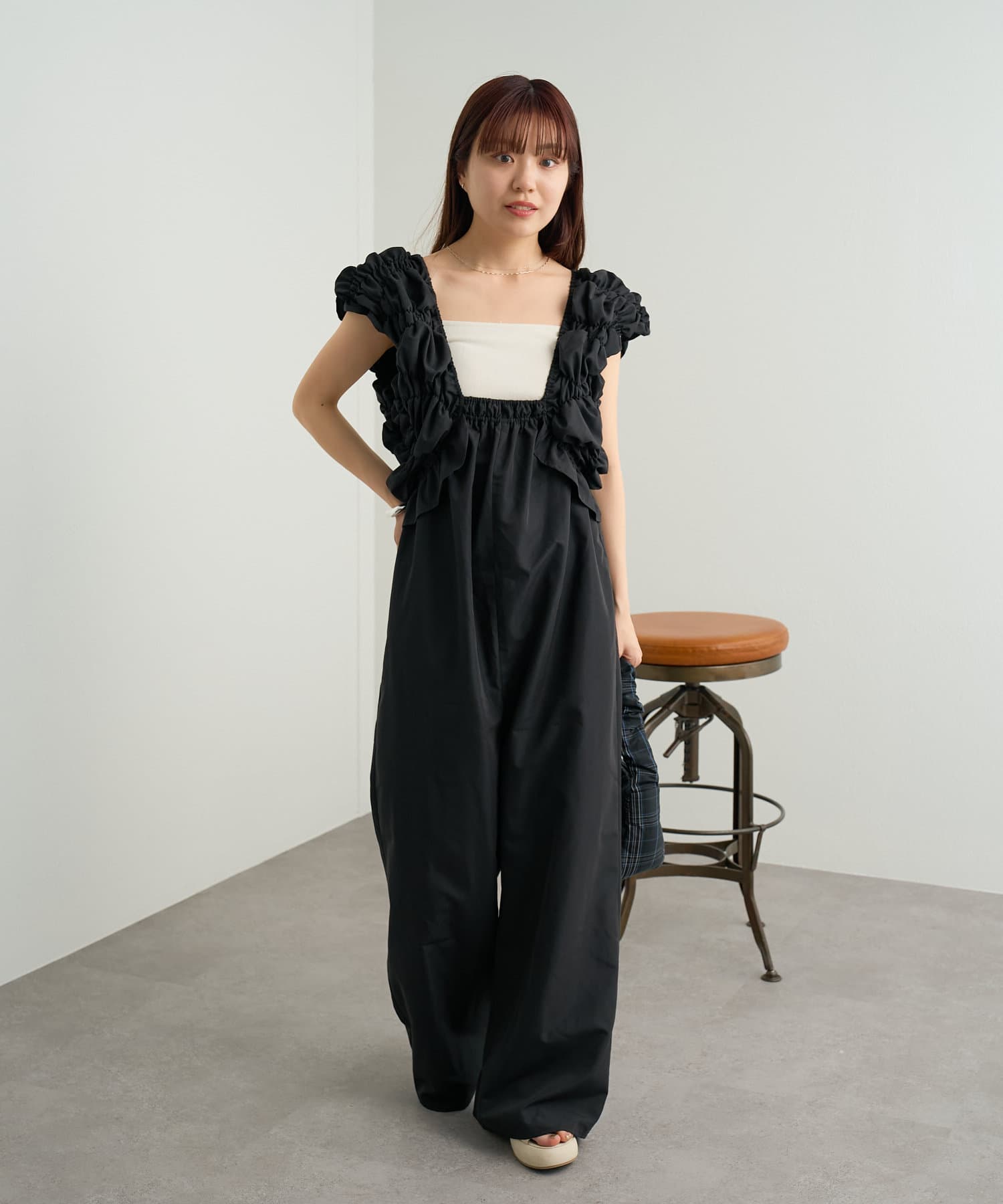 肩のボリューム感が目を惹くシャーリングギャザーサロペ。