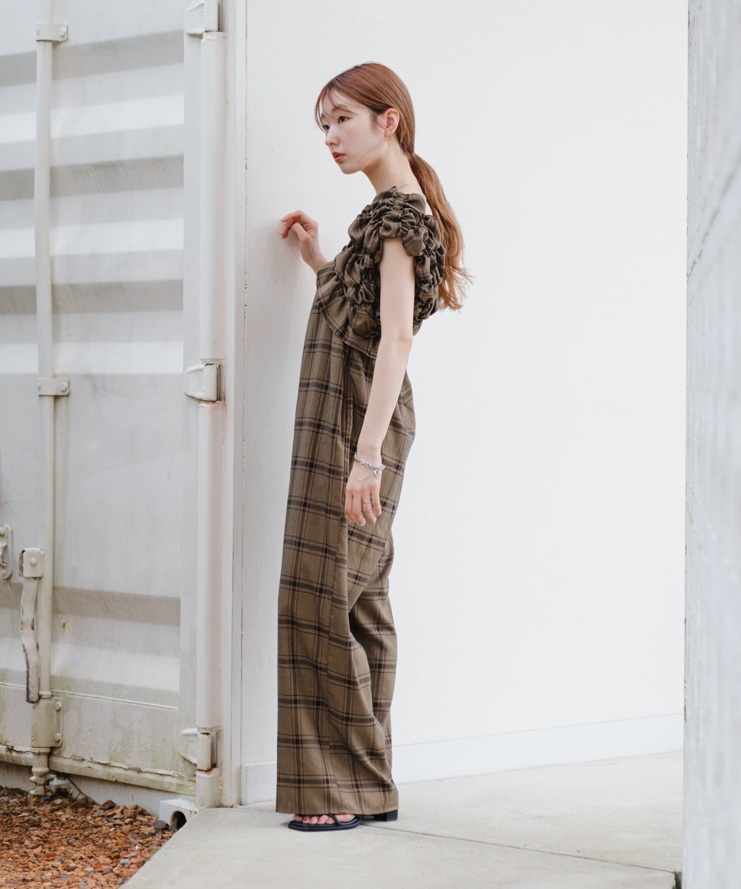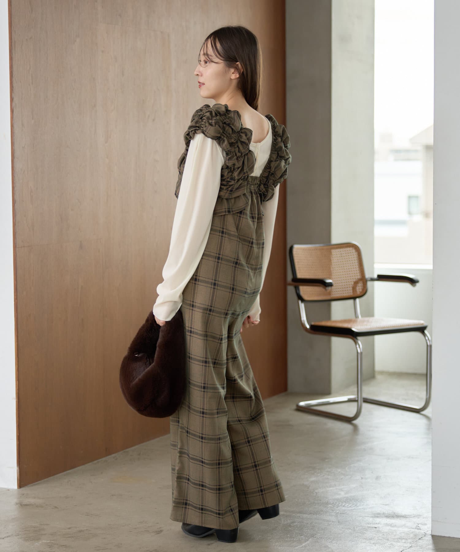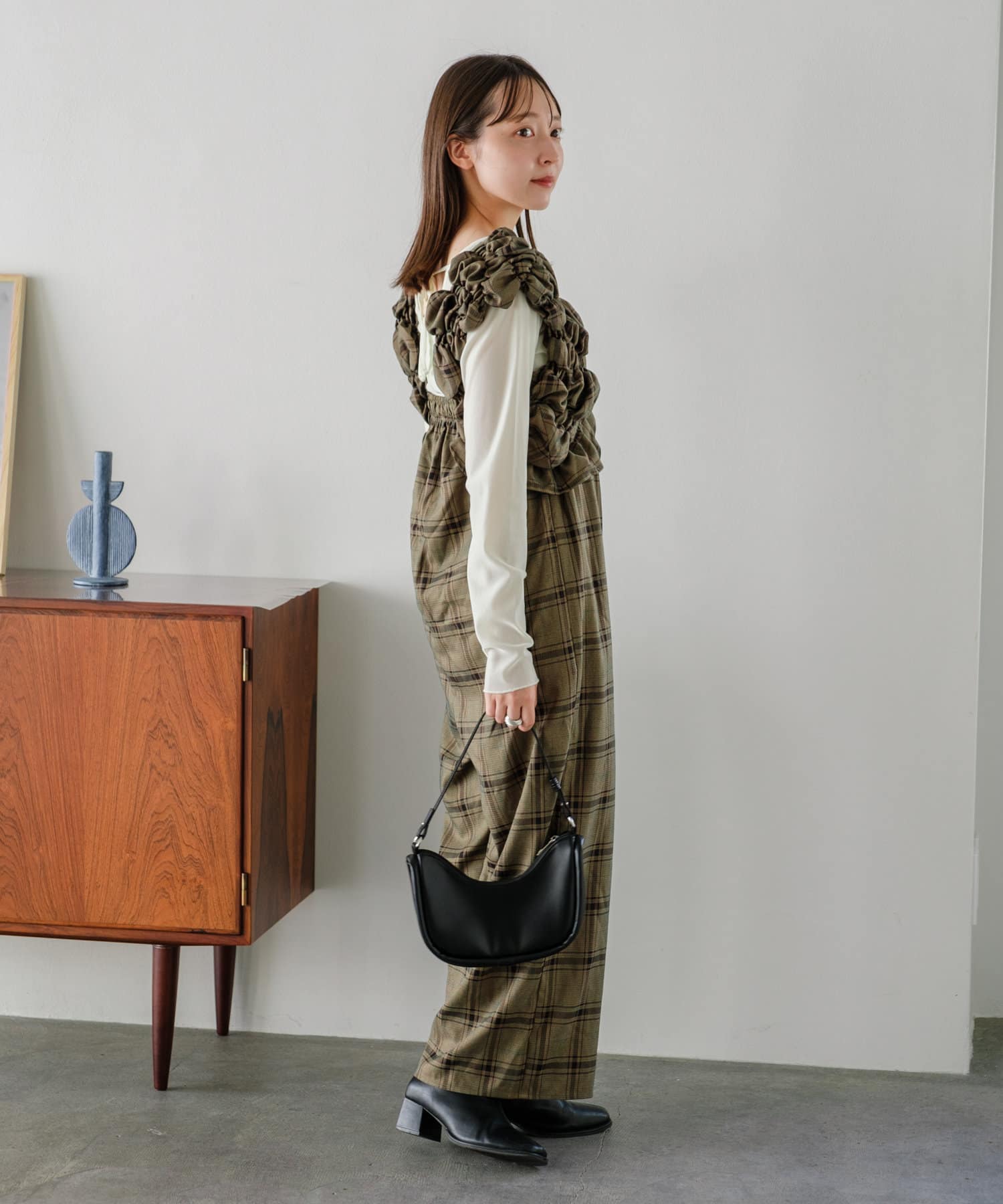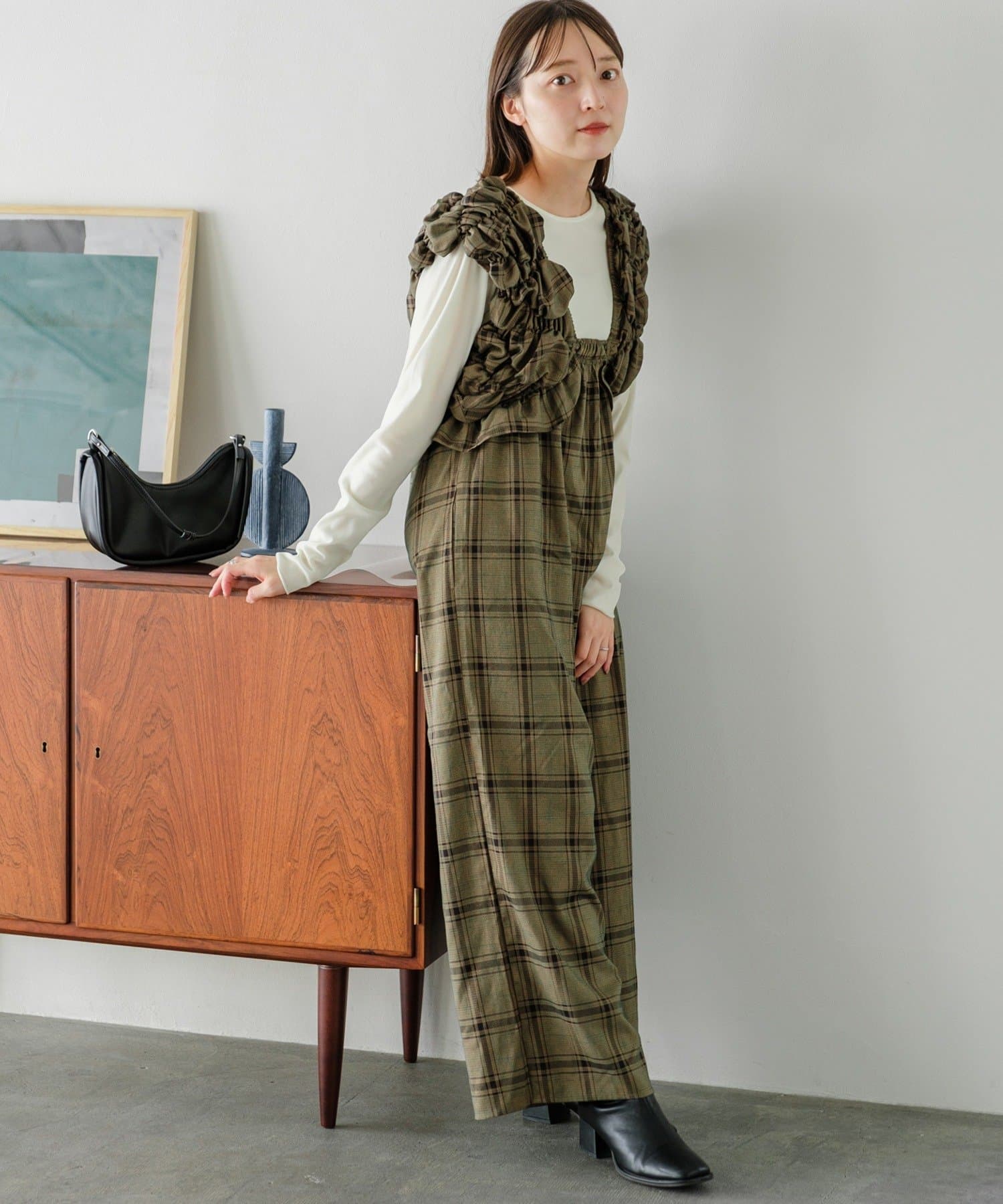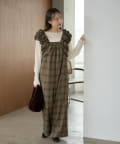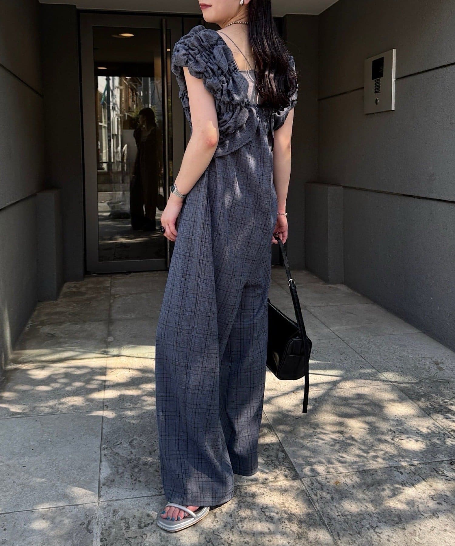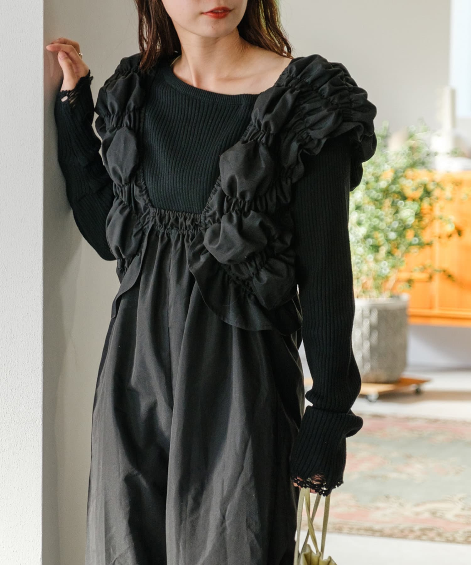 肩のボリューム感が目を惹くシャーリングギャザーサロペ。