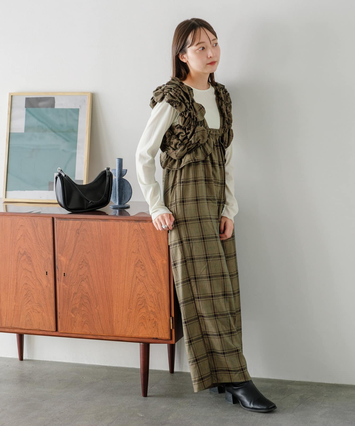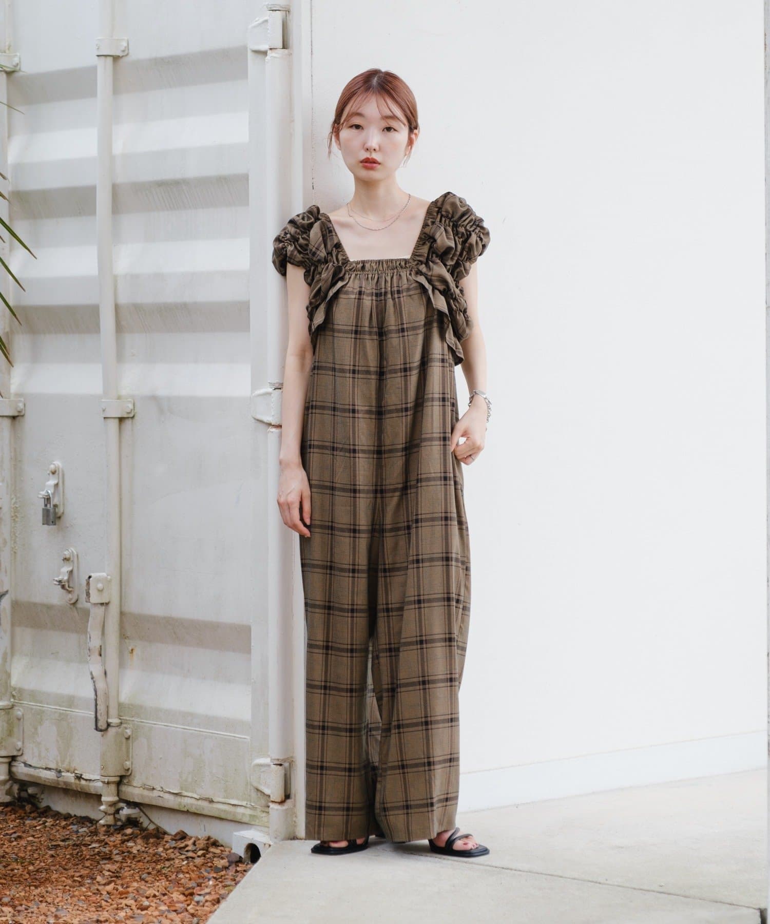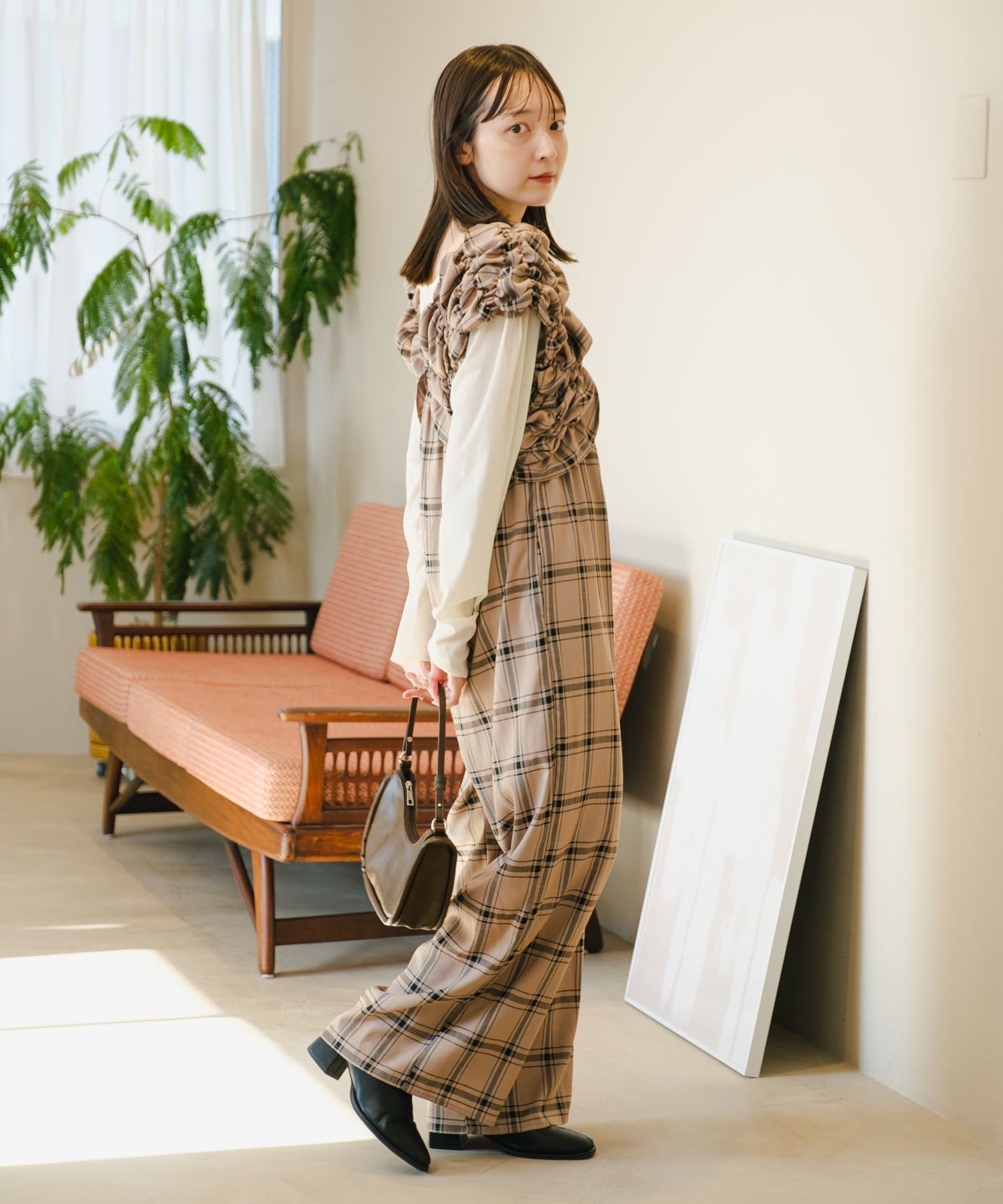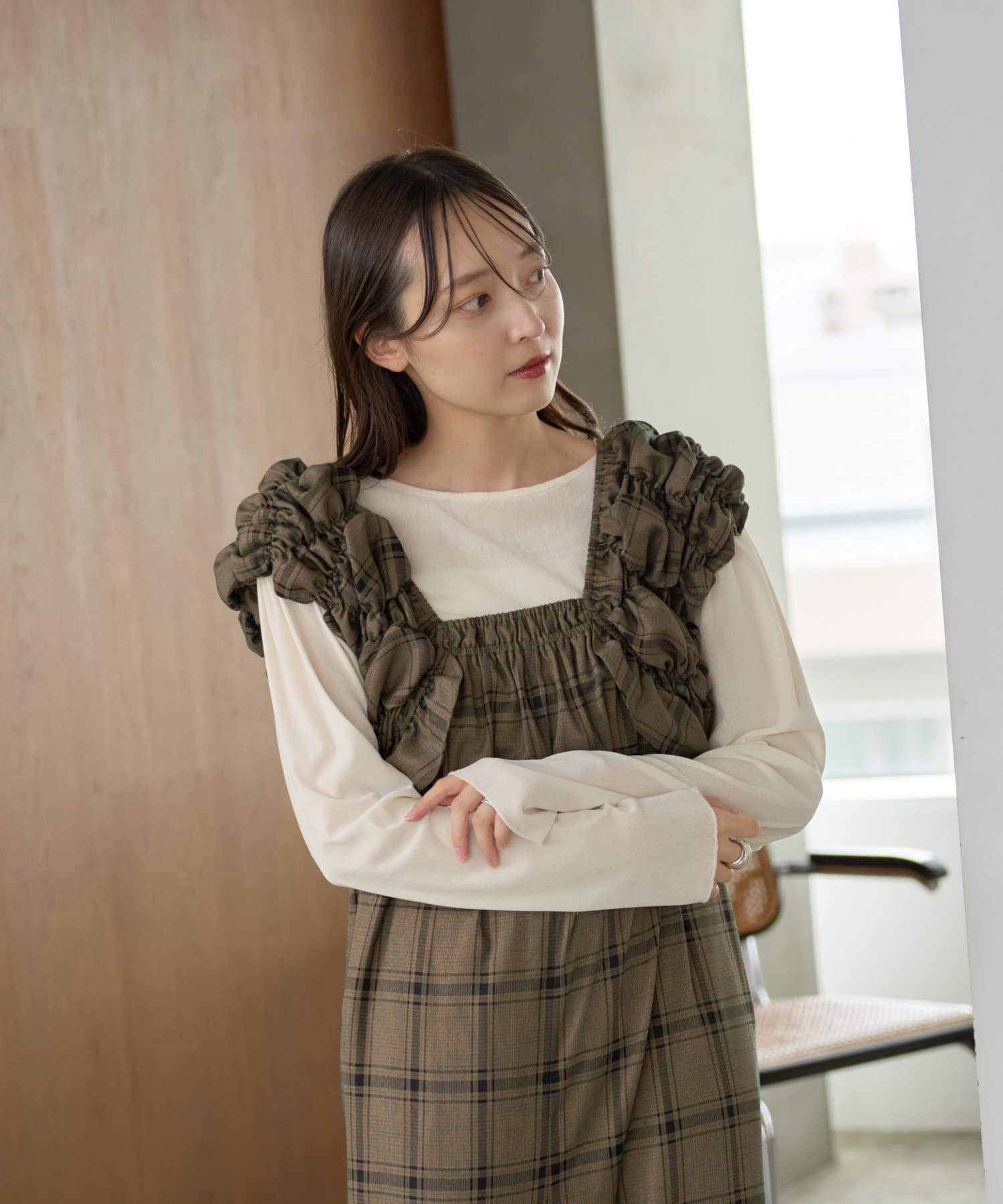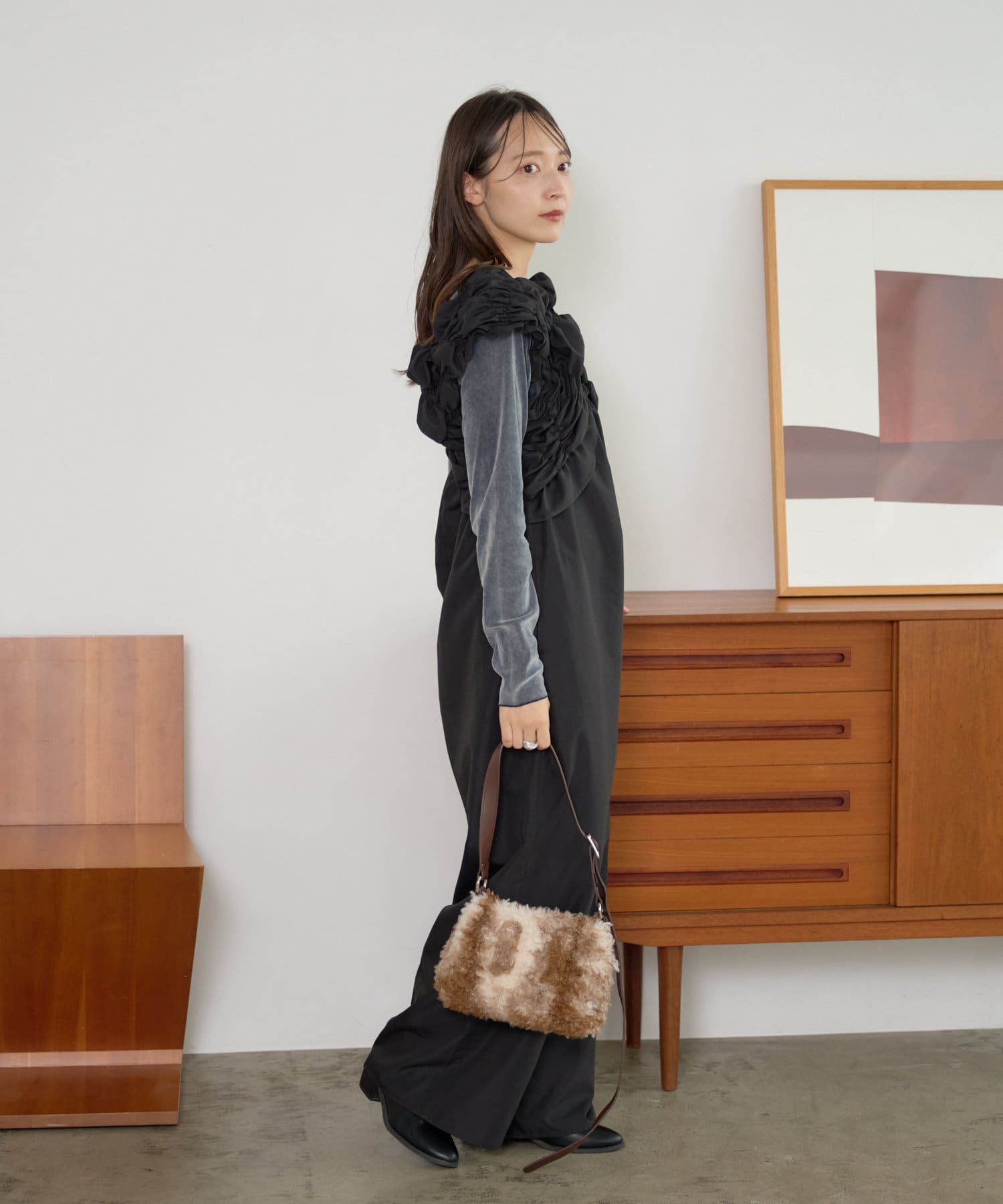 肩のボリューム感が目を惹くシャーリングギャザーサロペ。