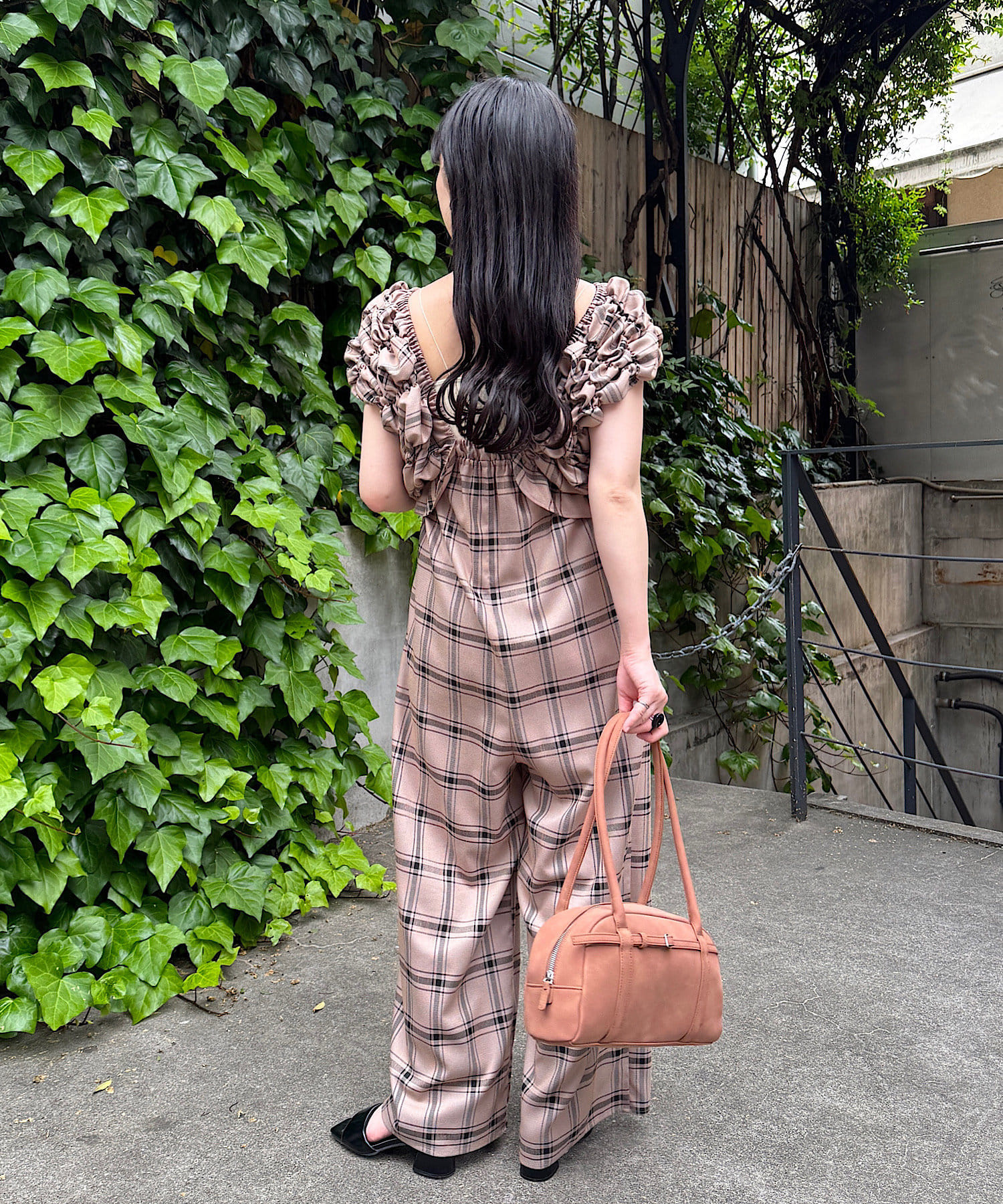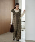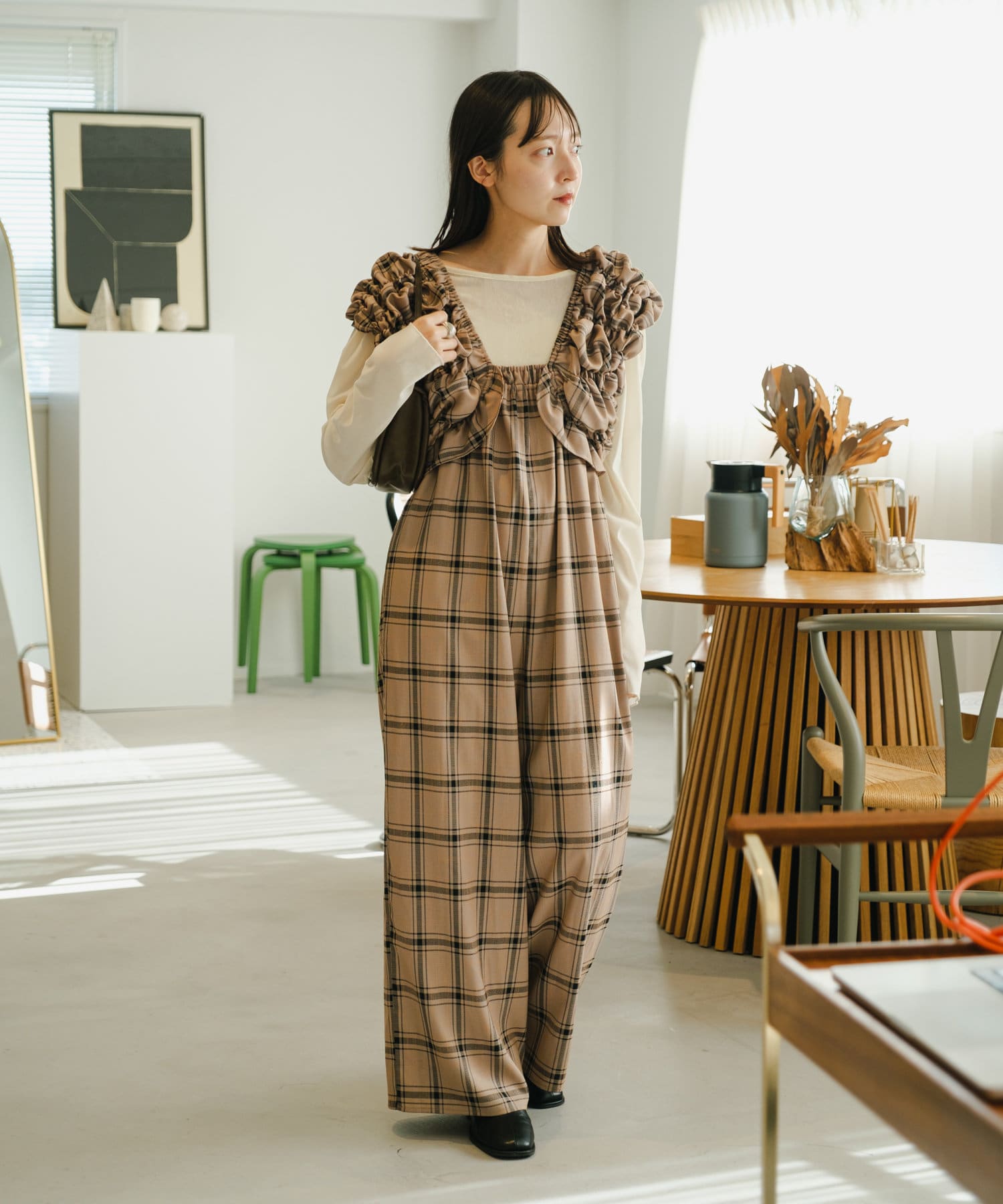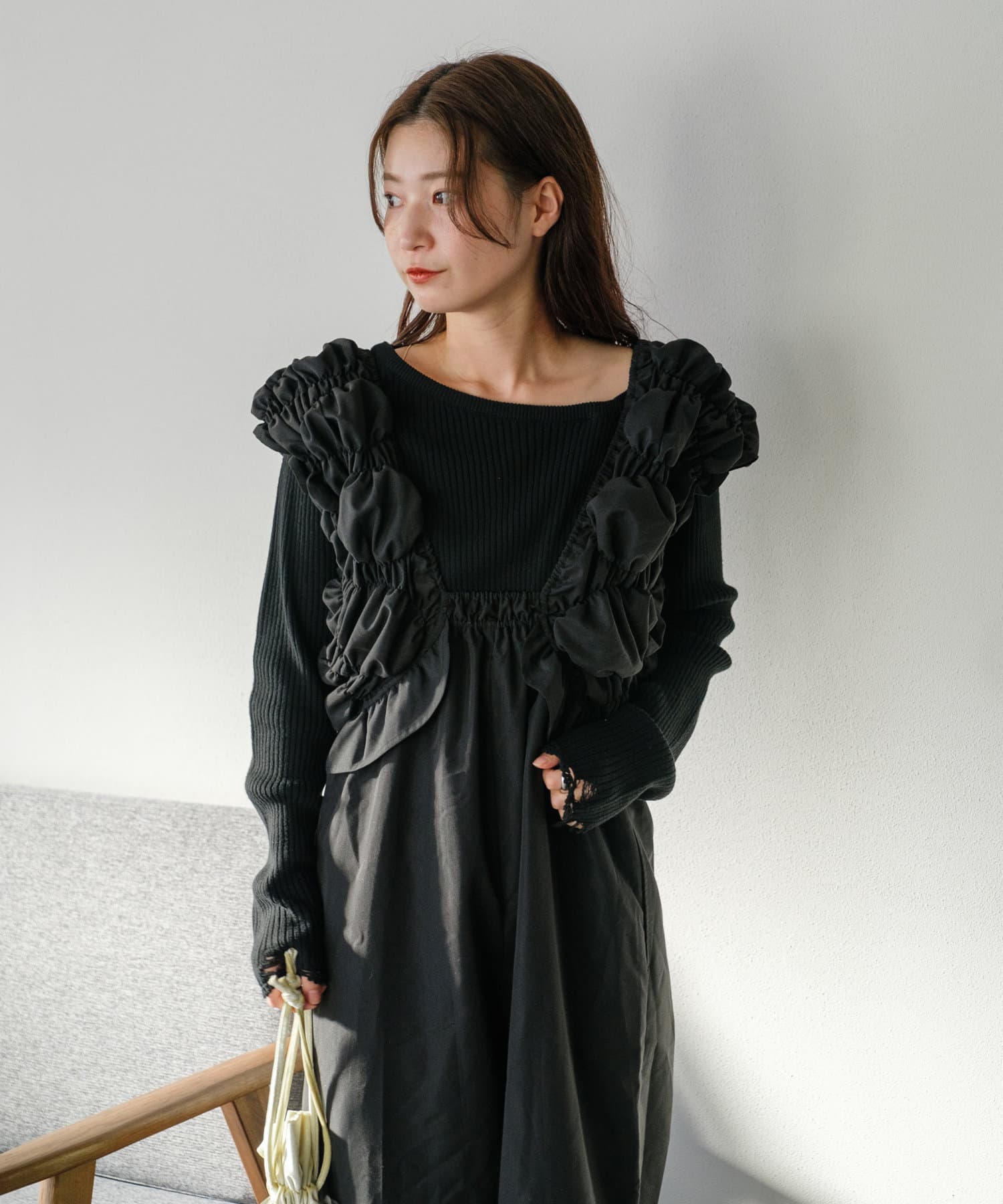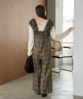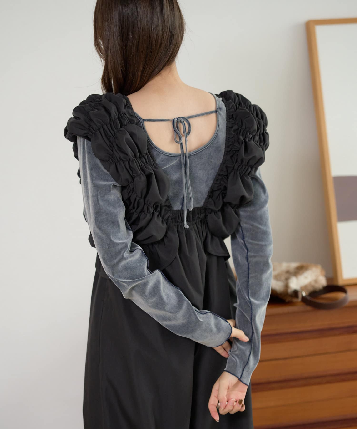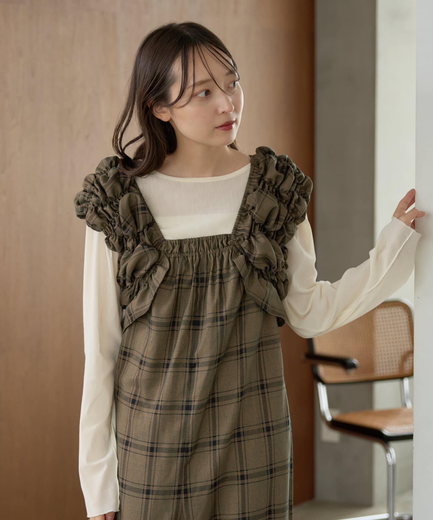 肩のボリューム感が目を惹くシャーリングギャザーサロペ。