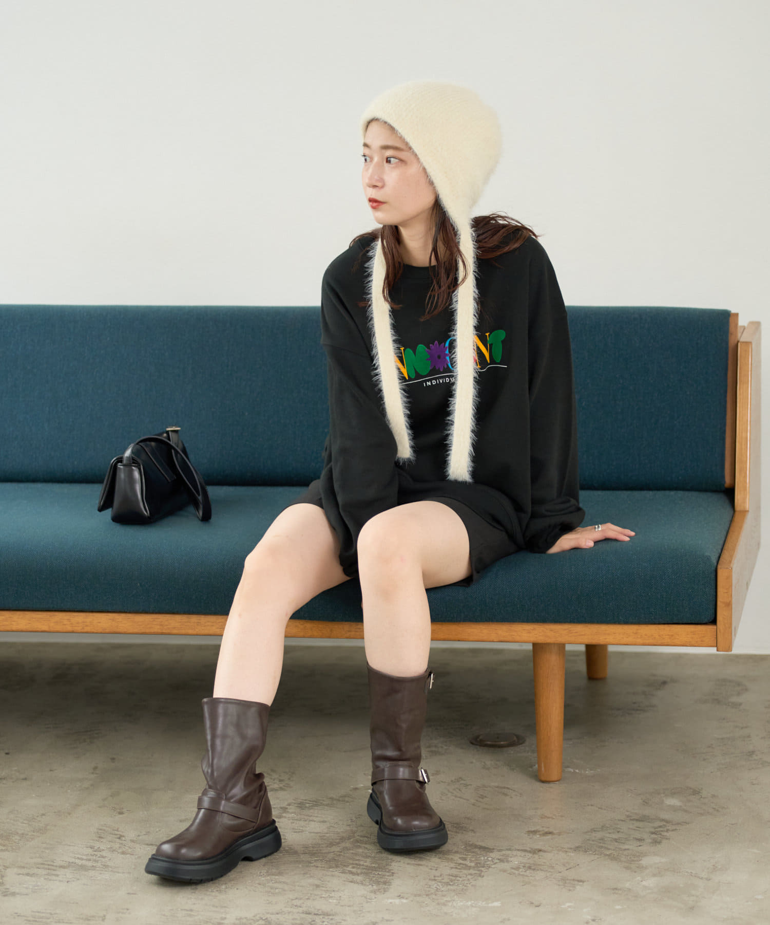 シンプルなキャップやビーニーを合わせるとよりカジュアルに◎