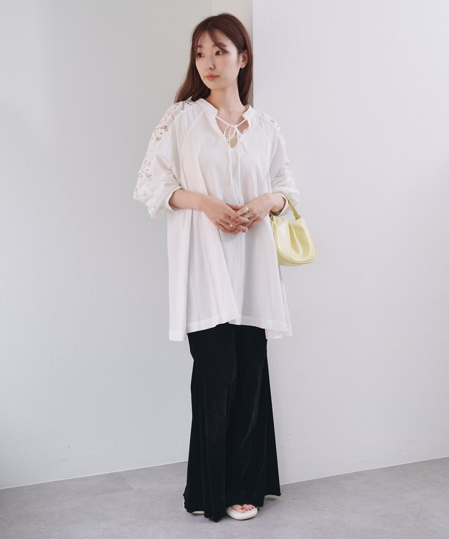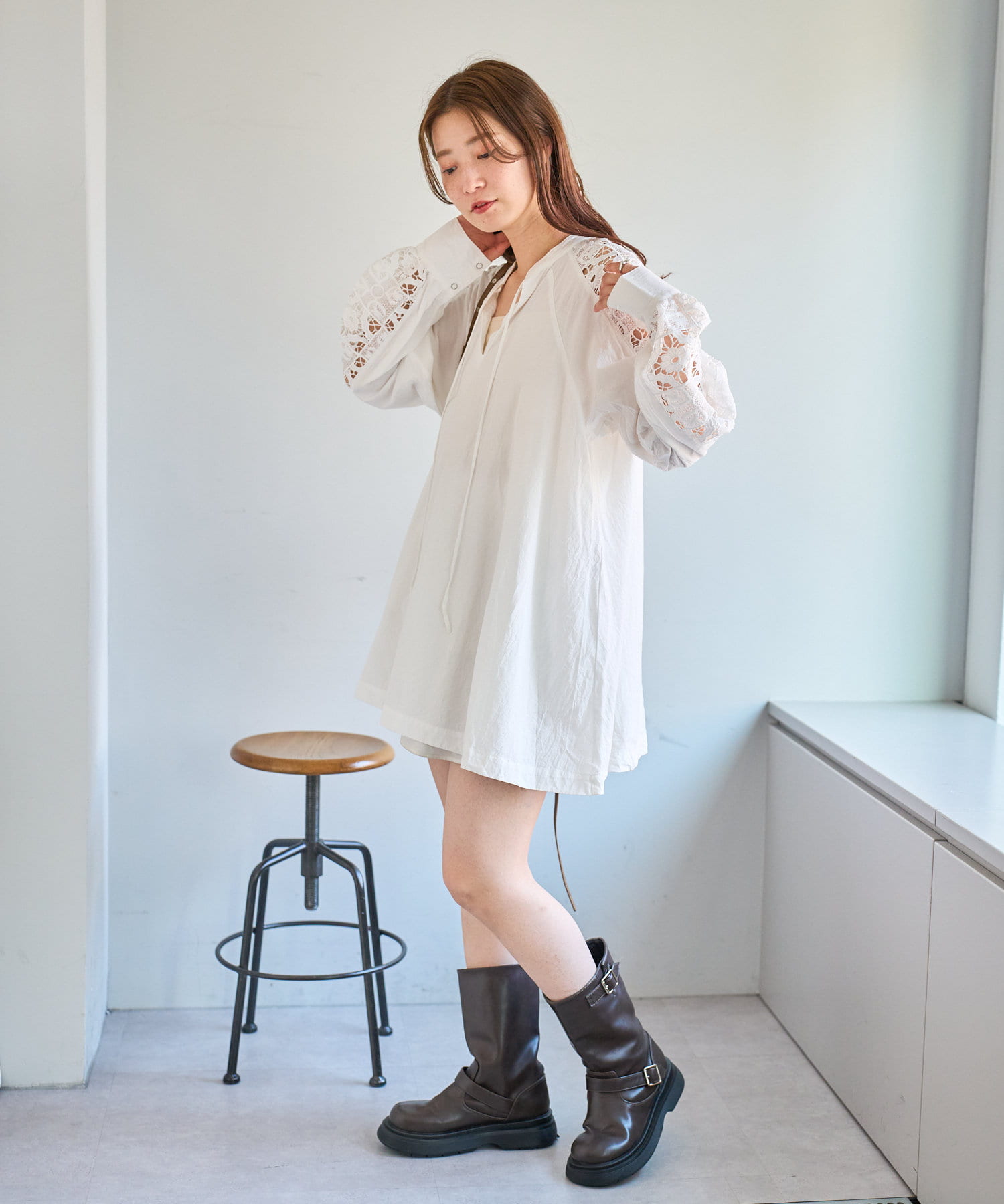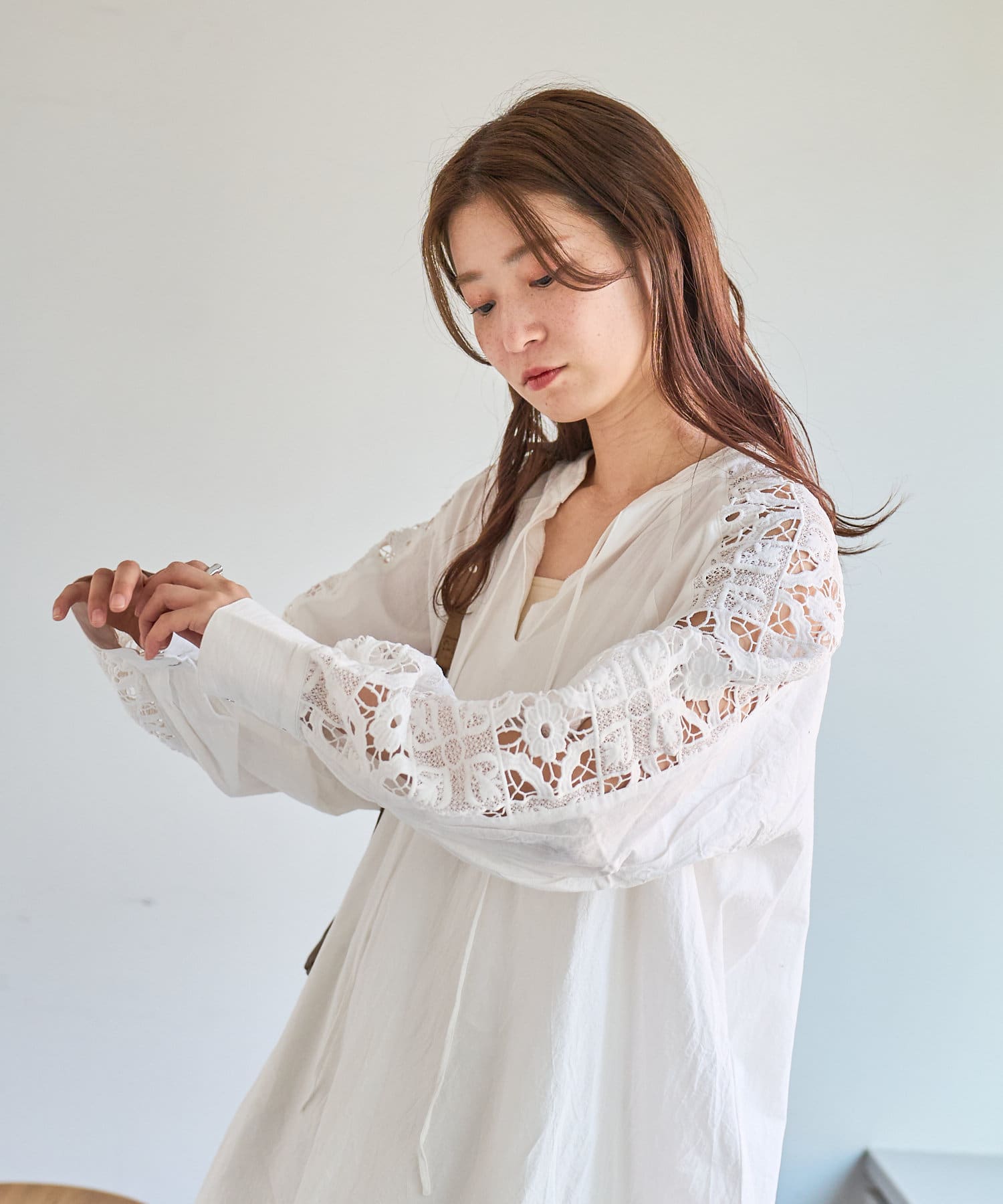 肩から袖にかけてのレースが印象的なチュニック。