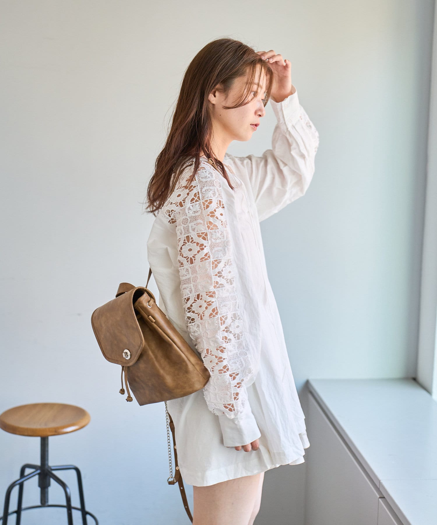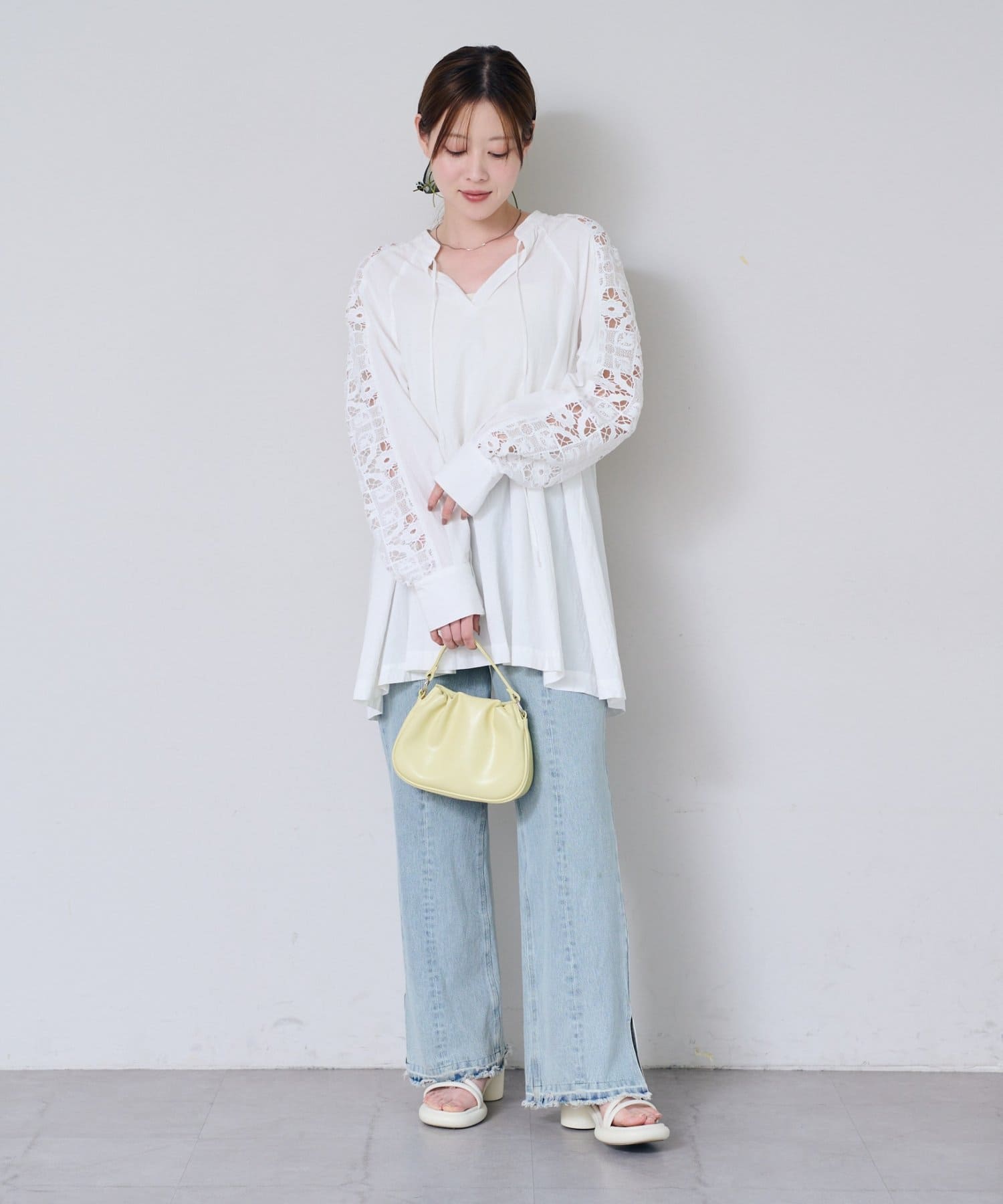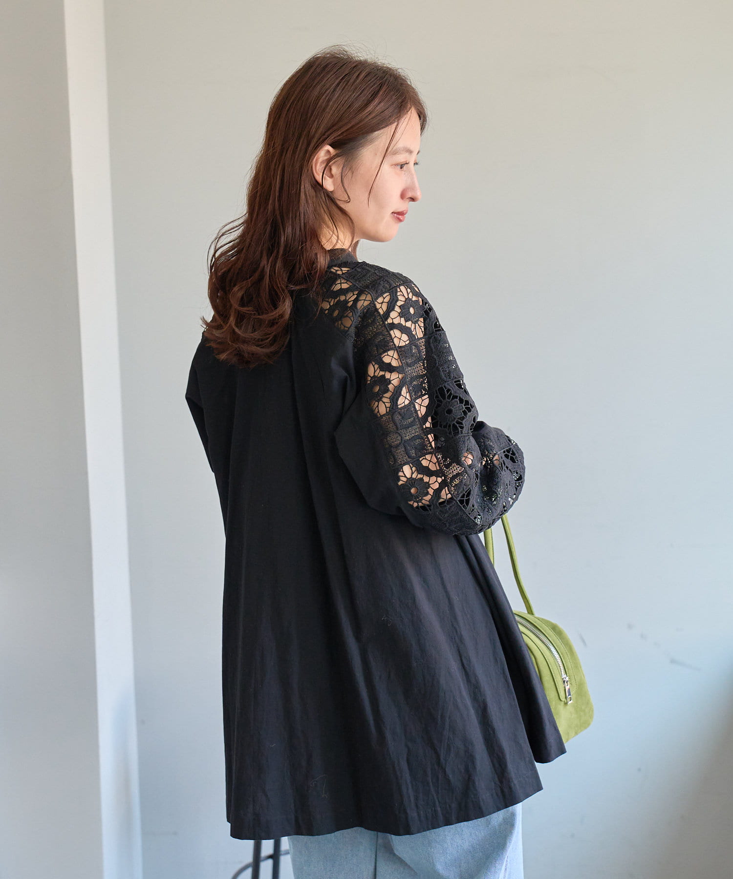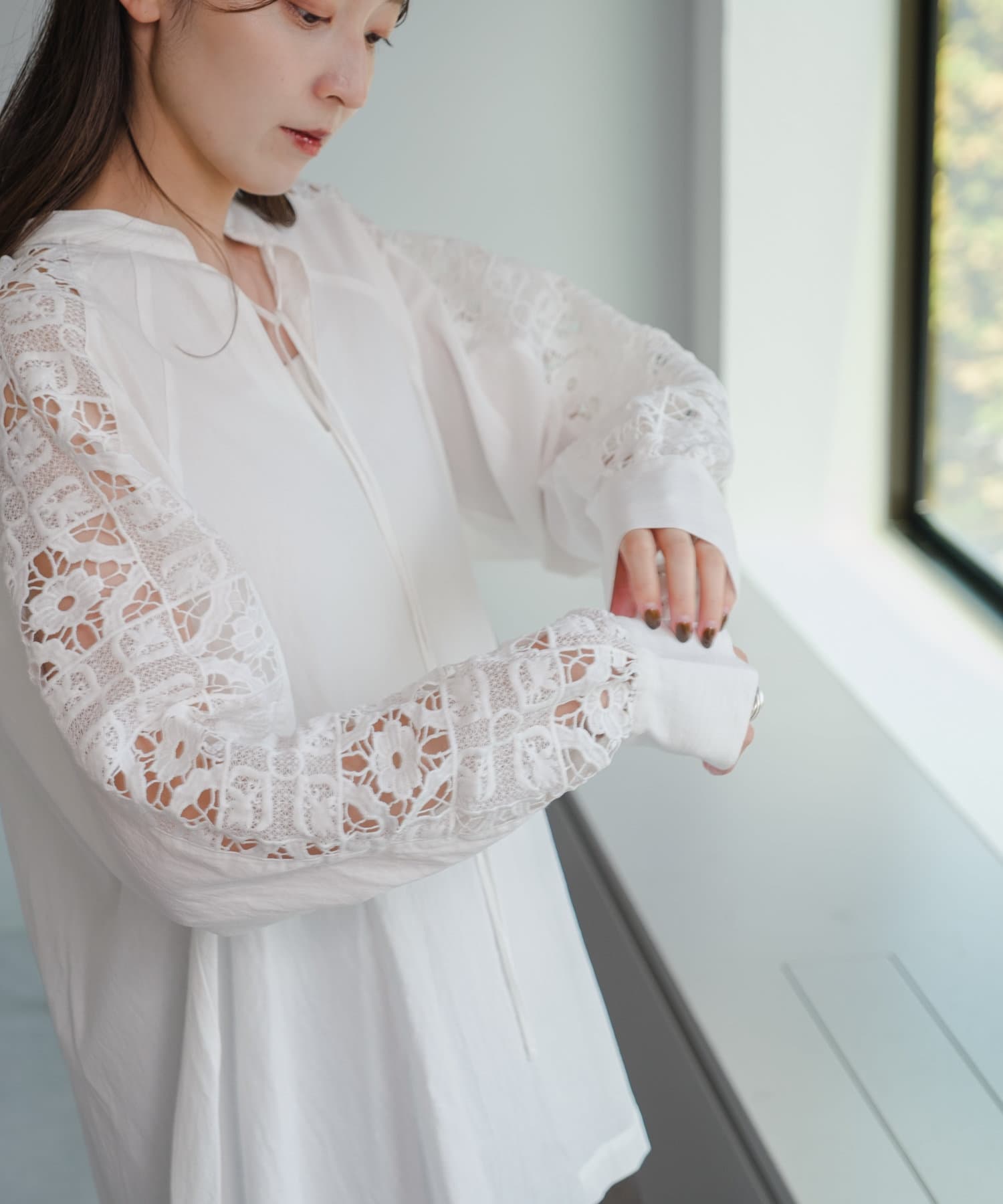 肩から袖にかけてのレースが印象的なチュニック。