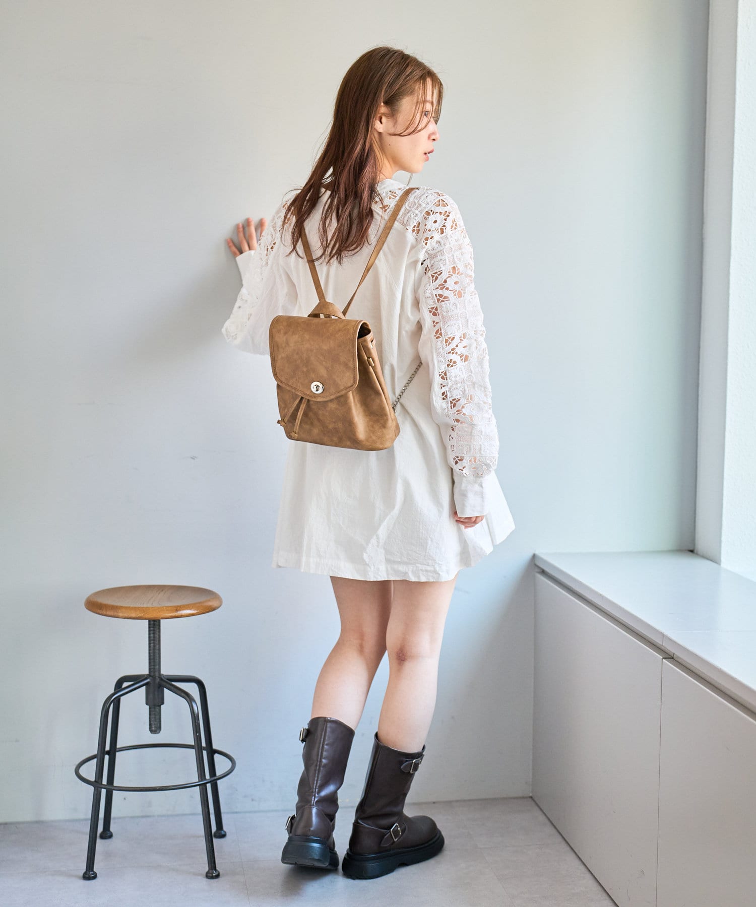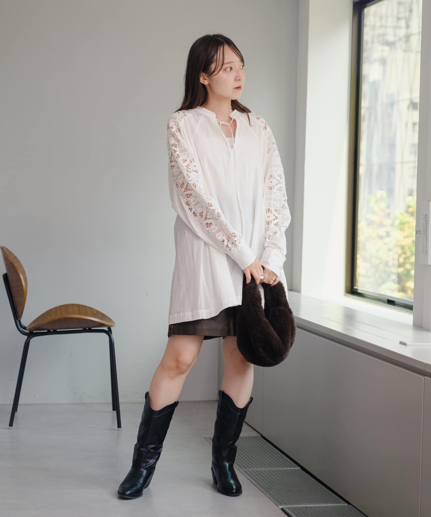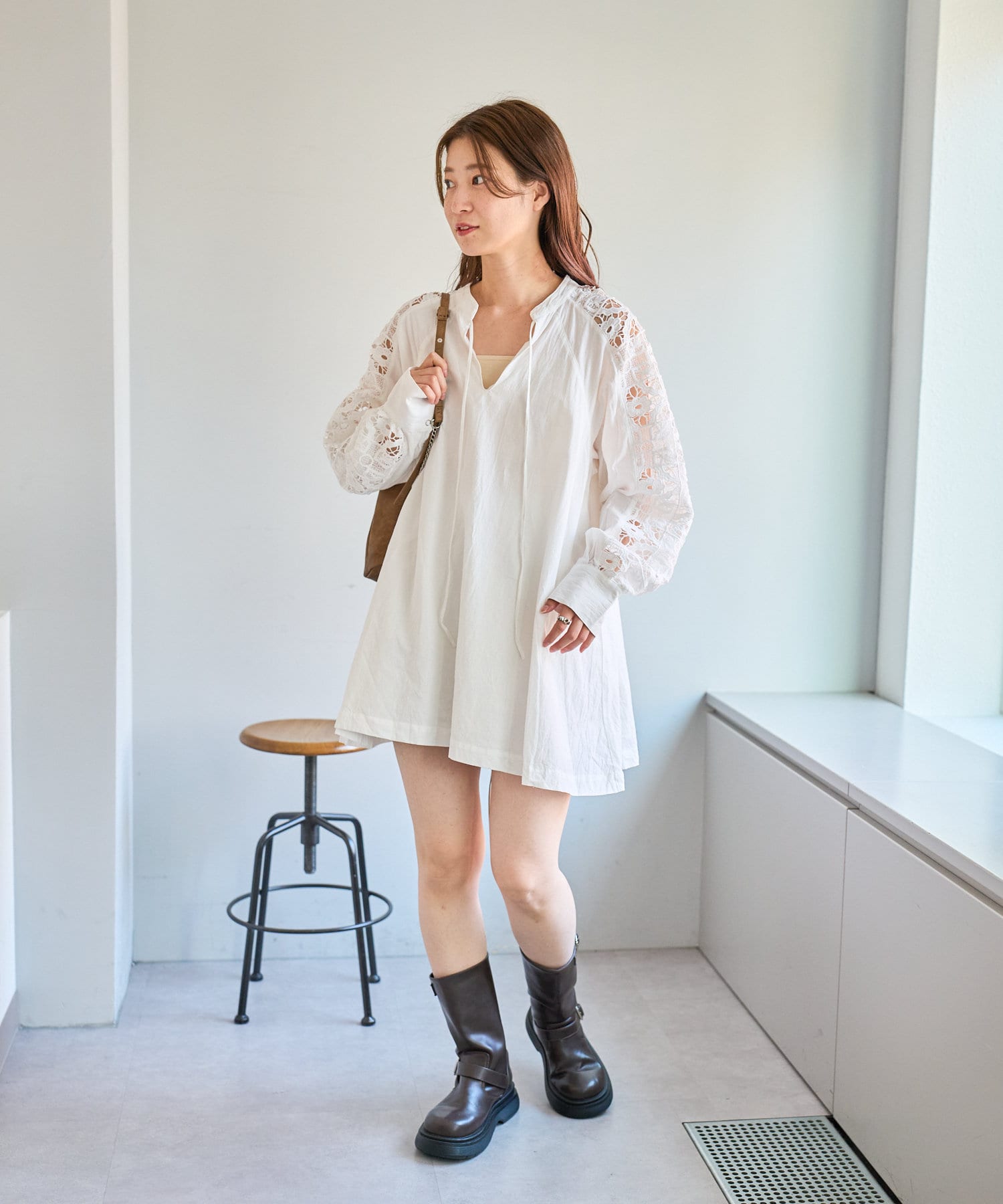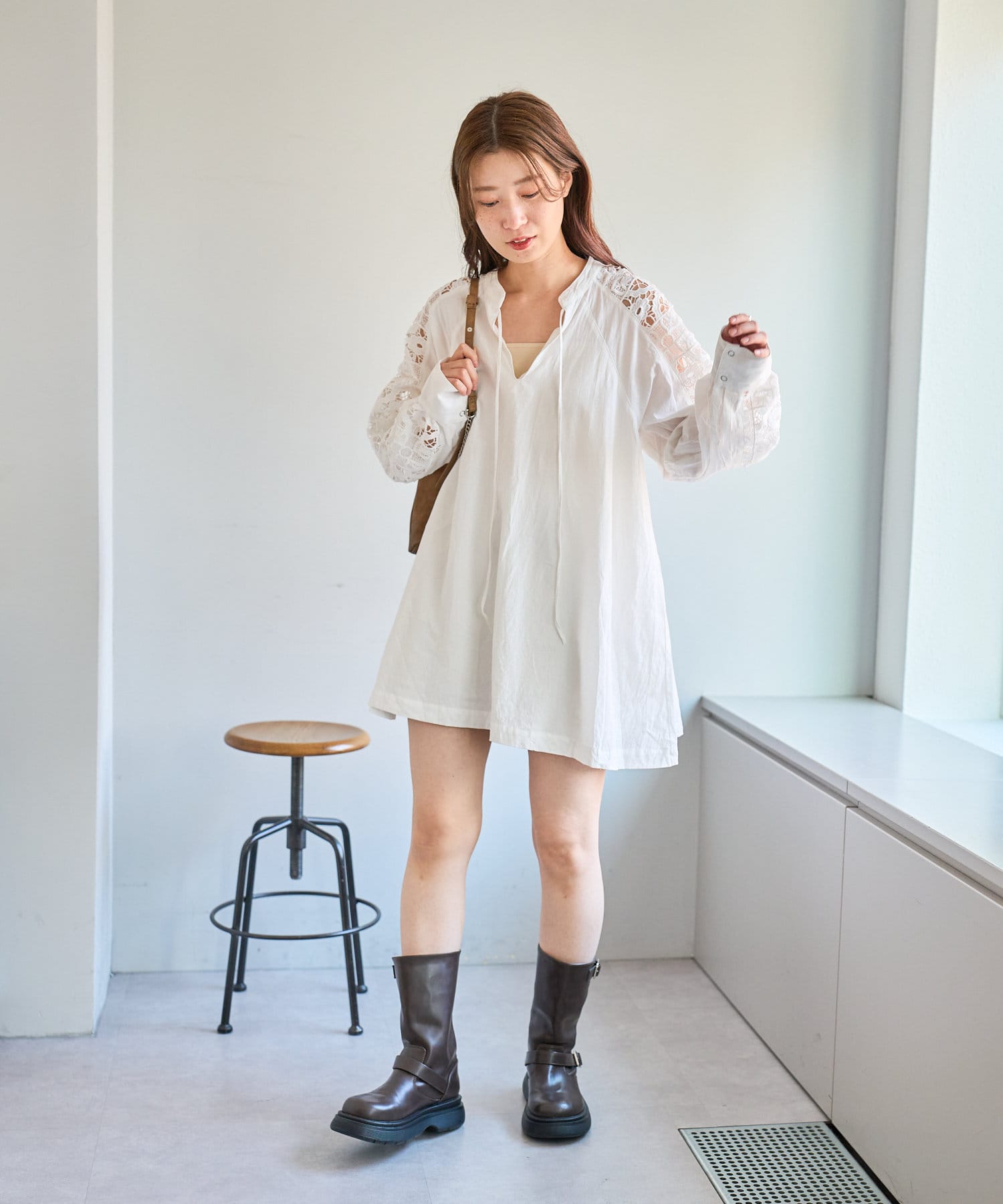 ミニボトムと合わせてミニワンピ風の着こなしもおすすめです。