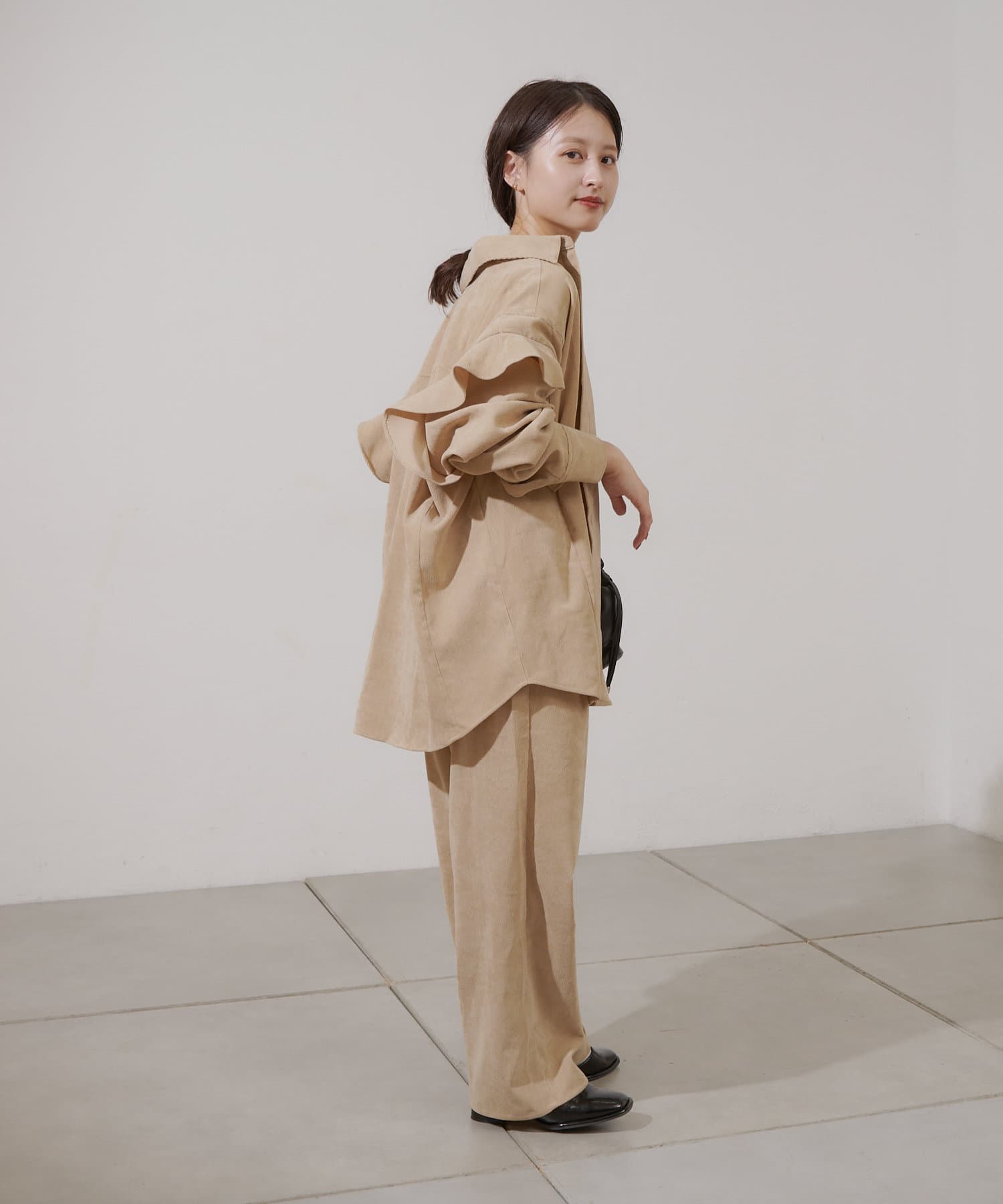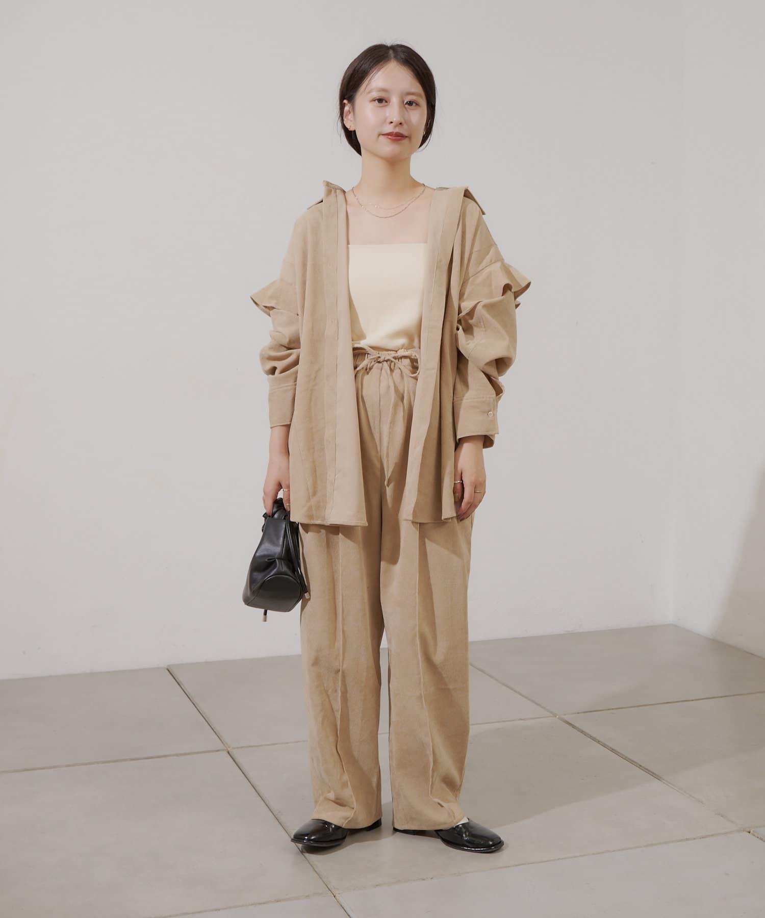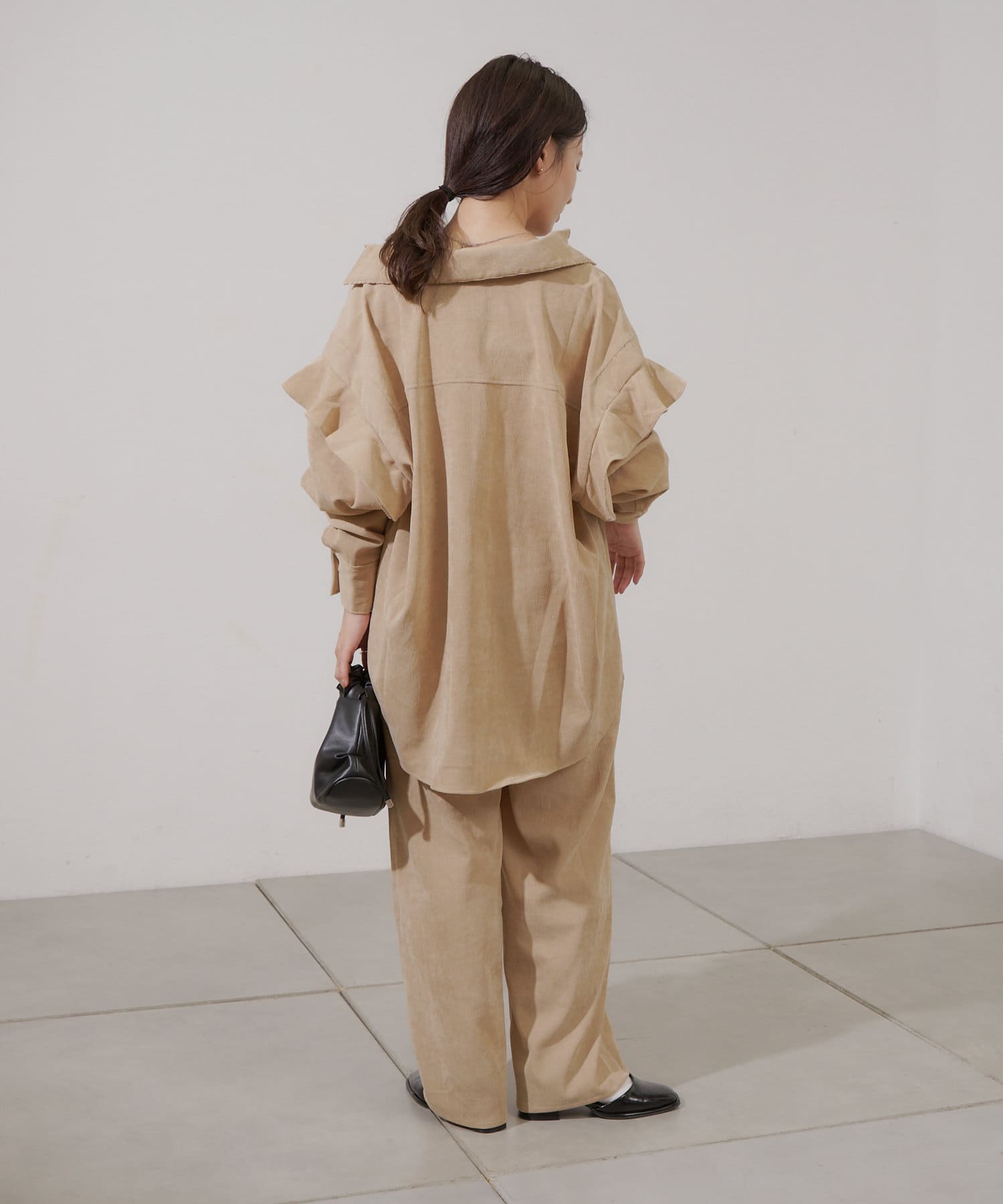 また、セットアップで出ているコーデュロイフリルビックシャツと合わせていただいても可愛いです。
