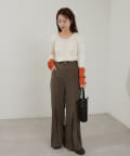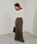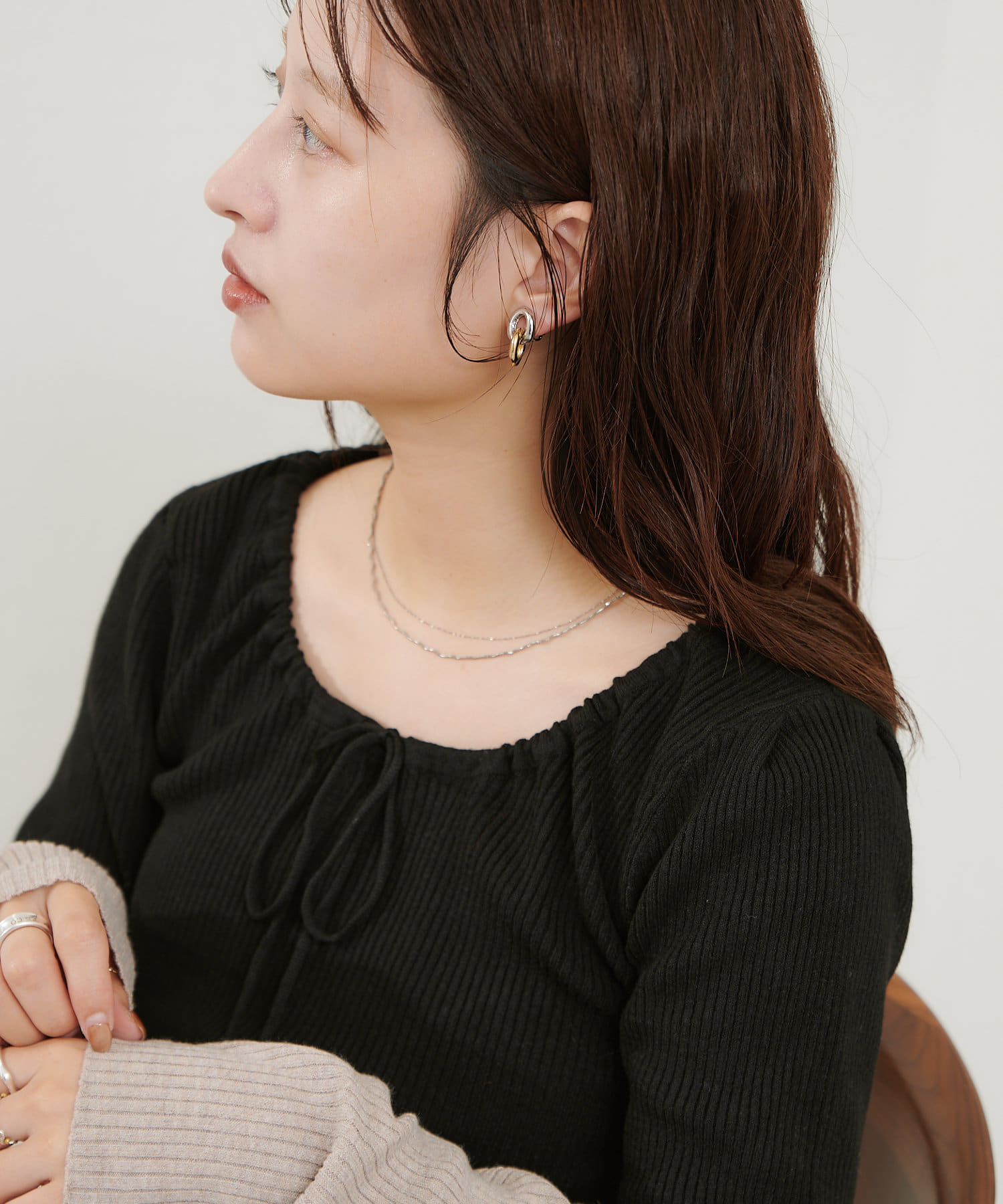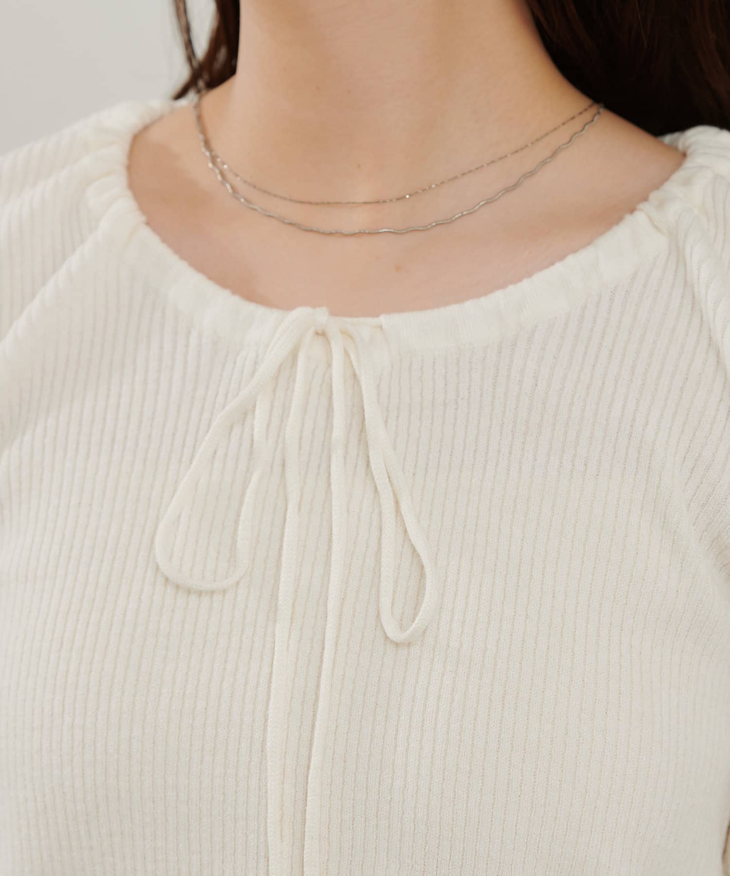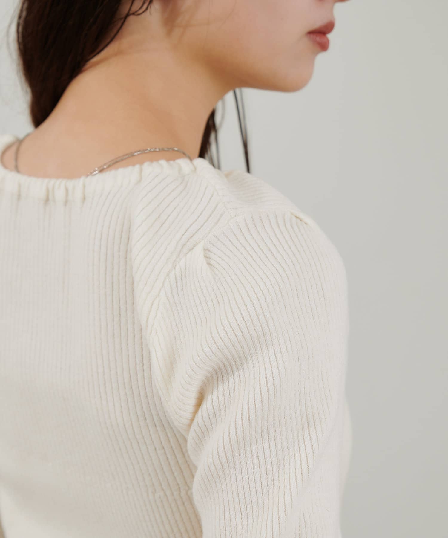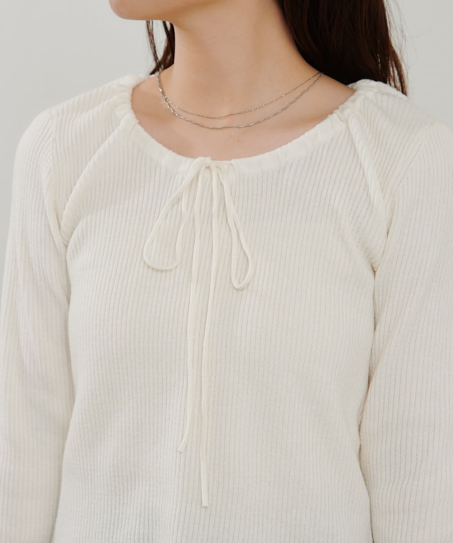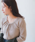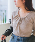 首元のギャザーが女性らしさを演出してくれるリブニットプルオーバー。