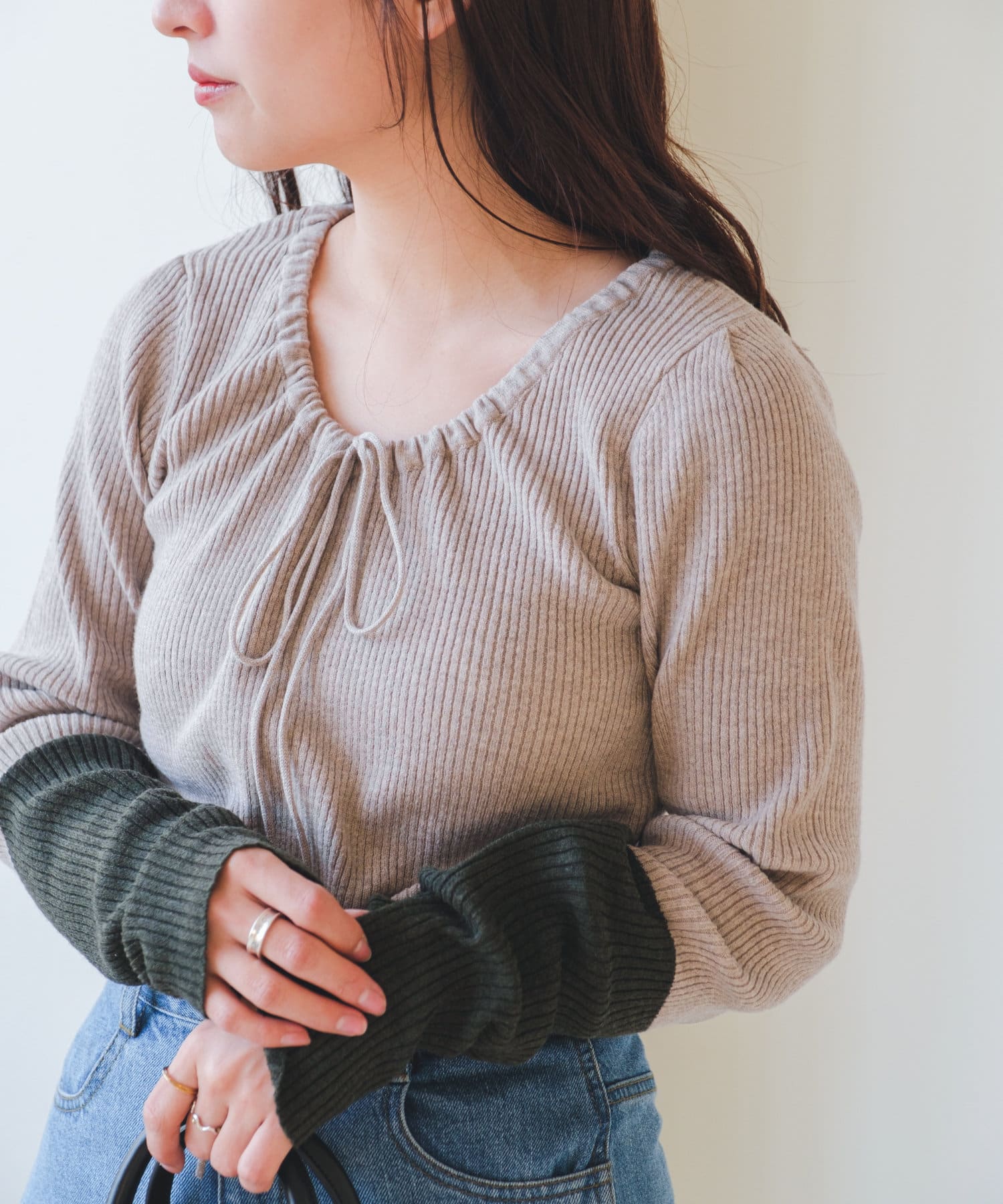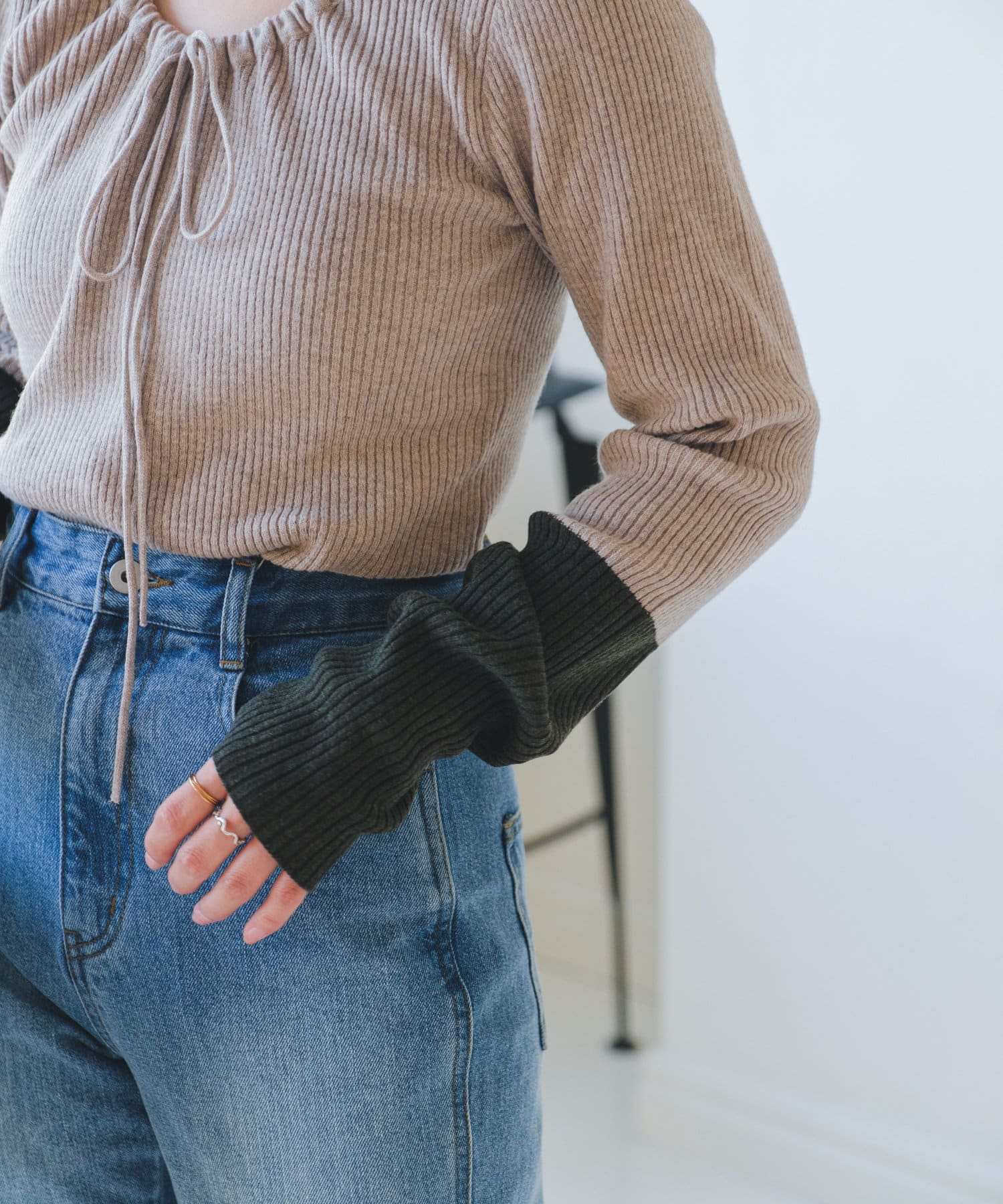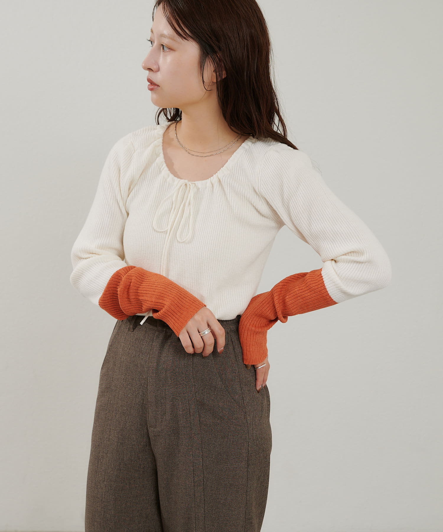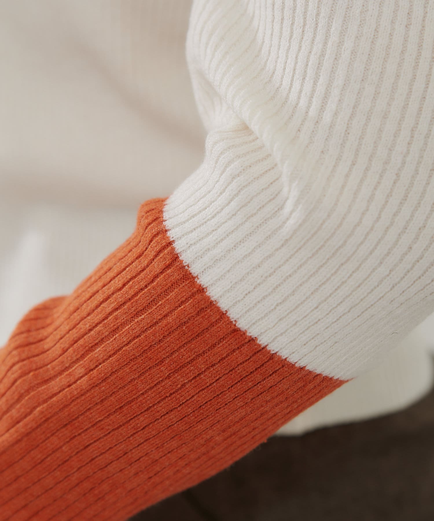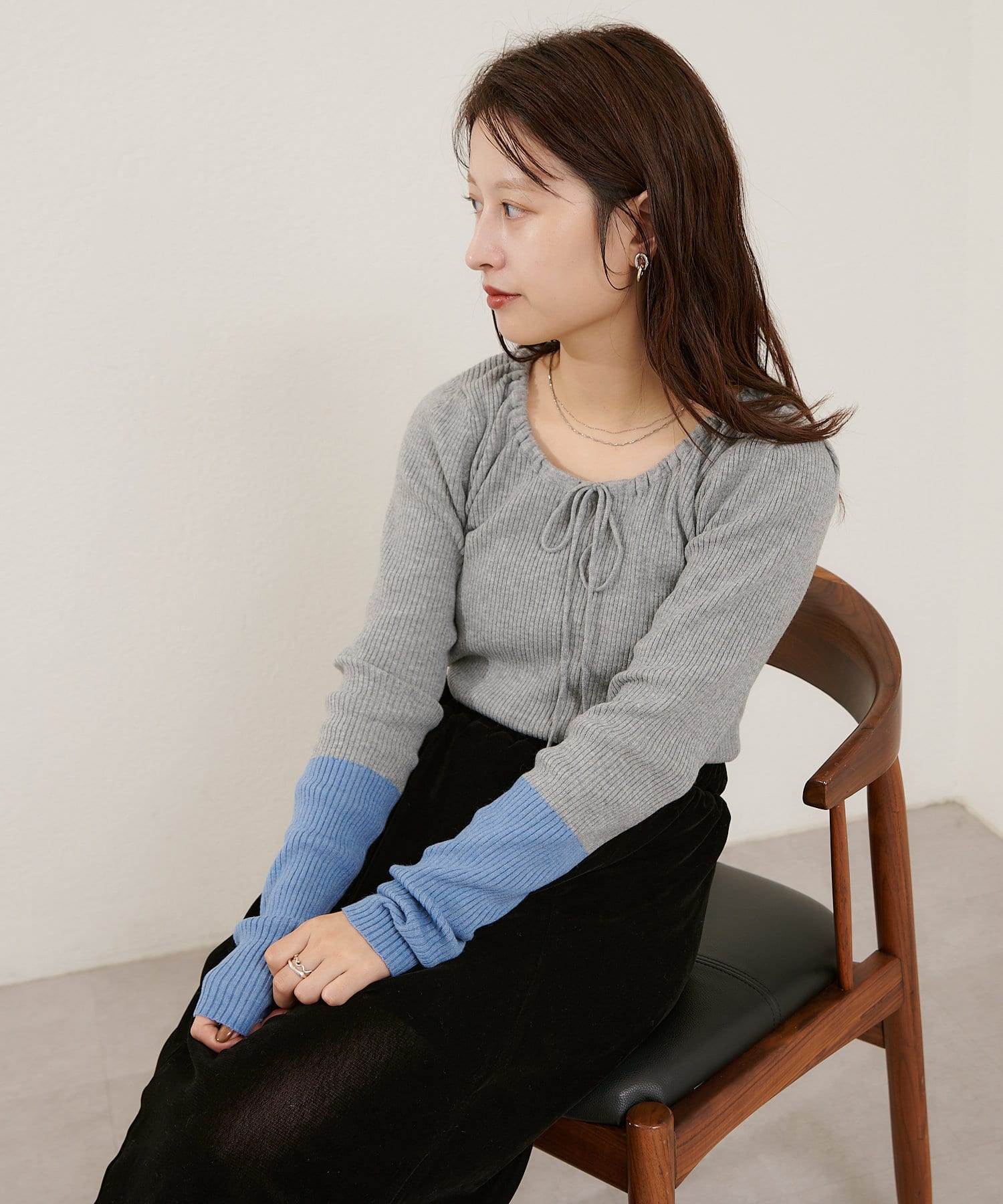 【新色追加/6色展開】B 袖配色ギャザーリブニットプルオーバー