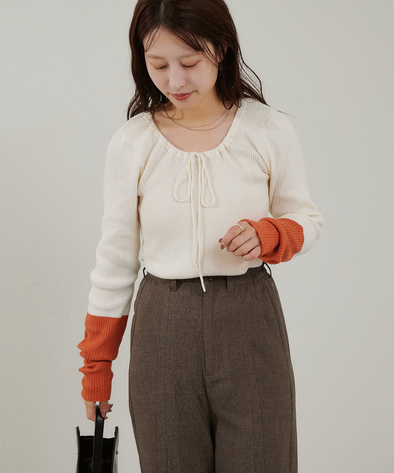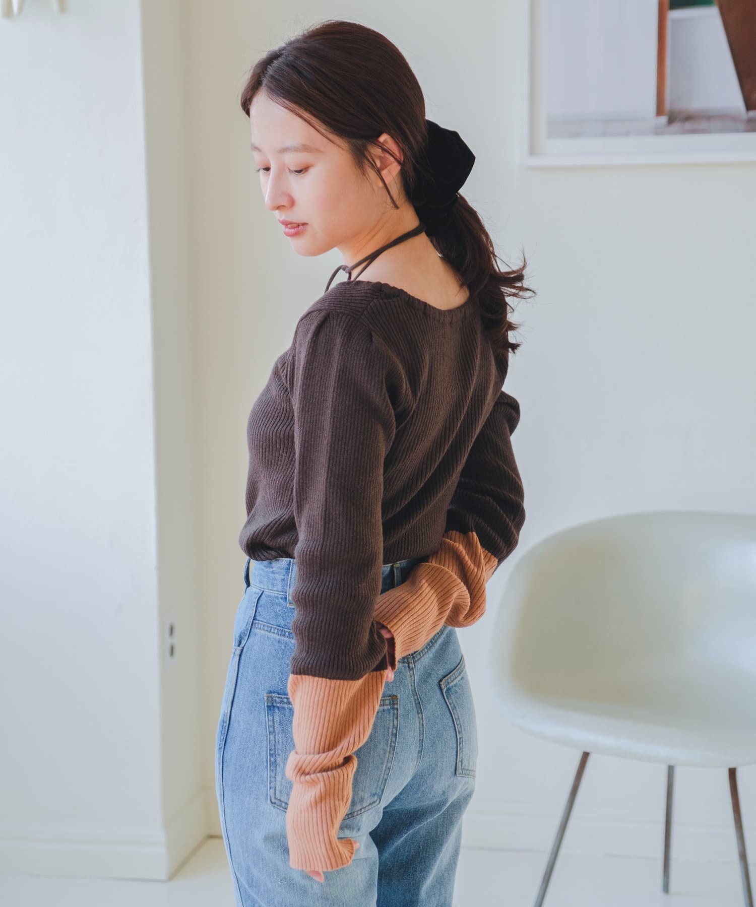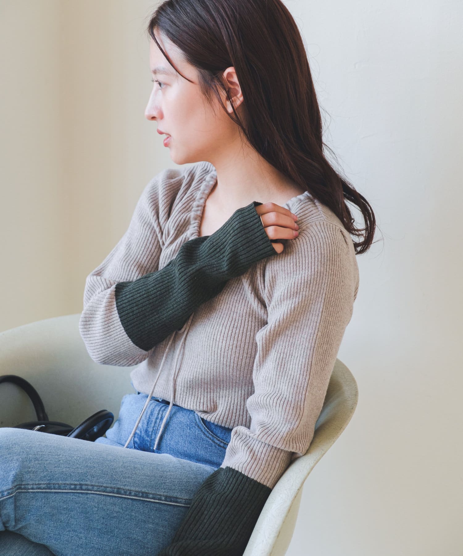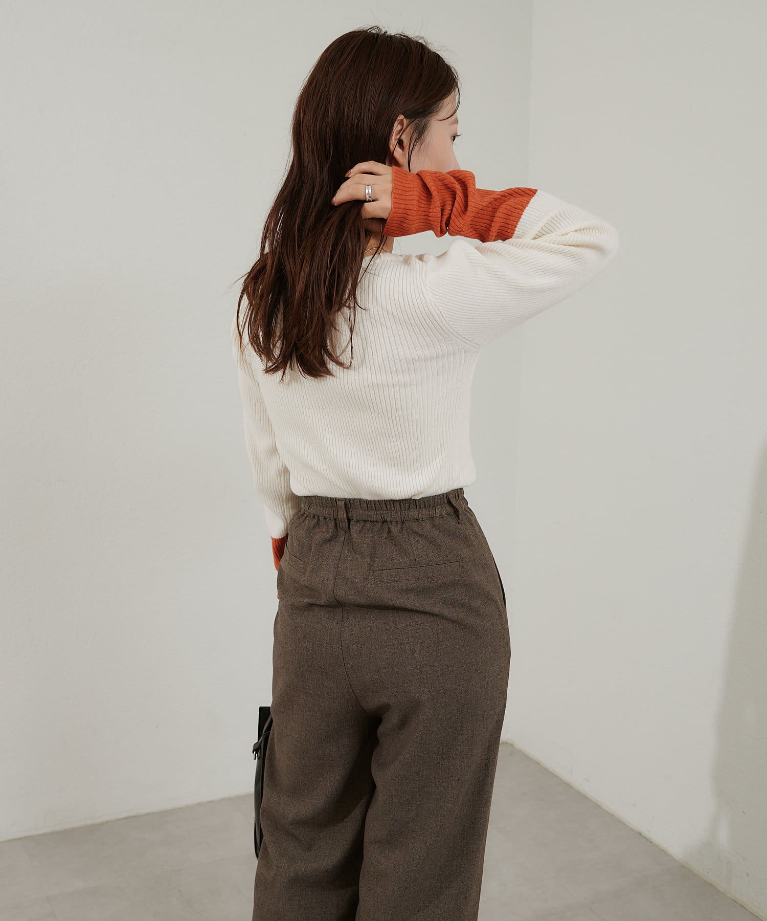 【新色追加/6色展開】B 袖配色ギャザーリブニットプルオーバー