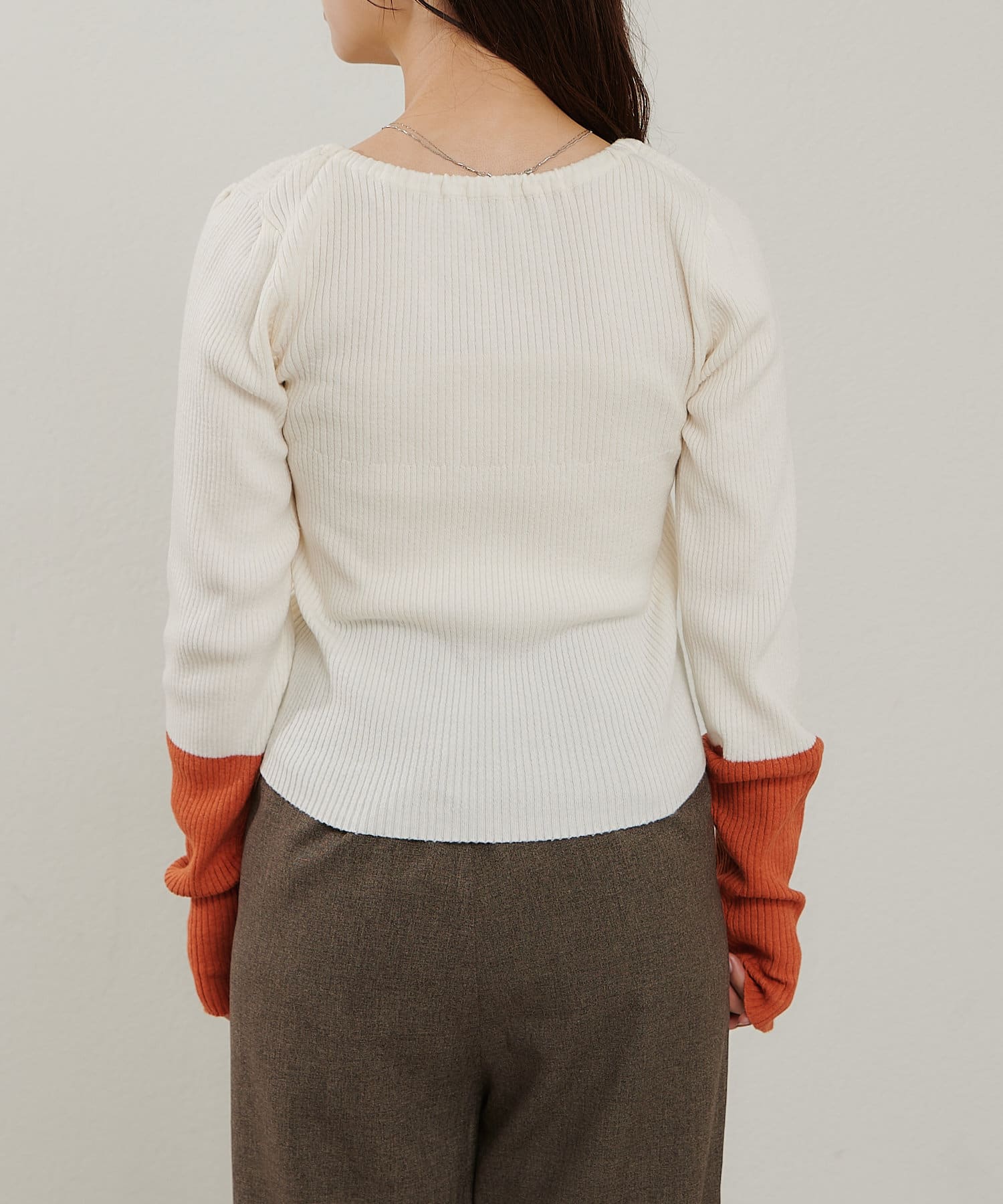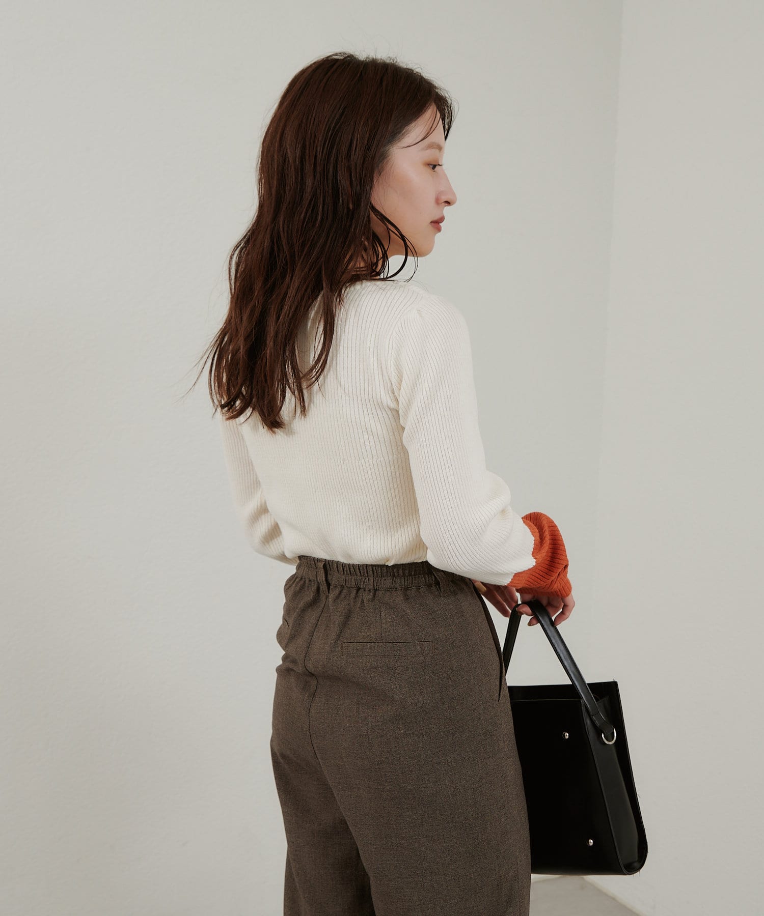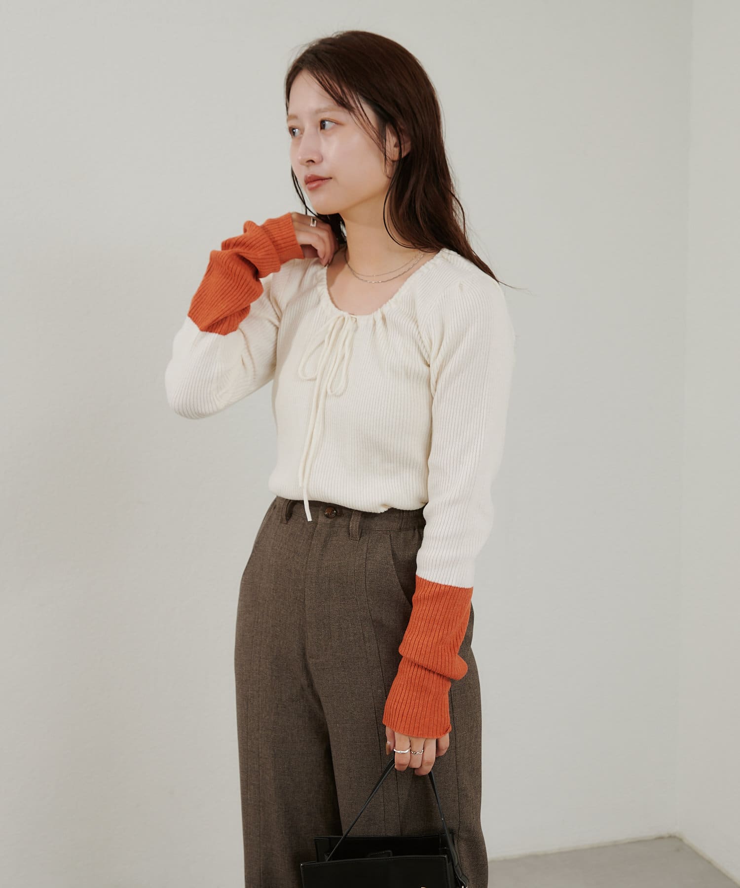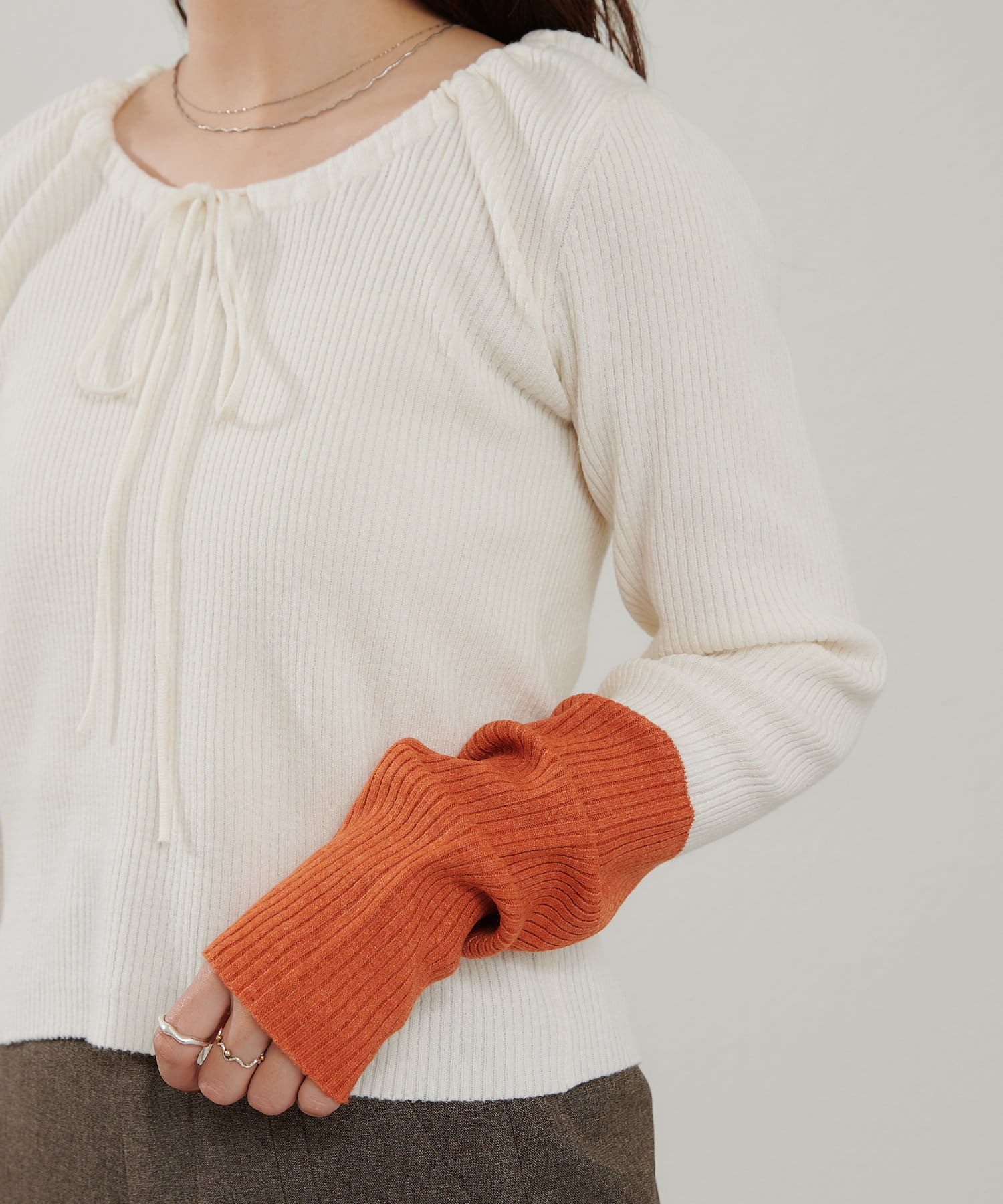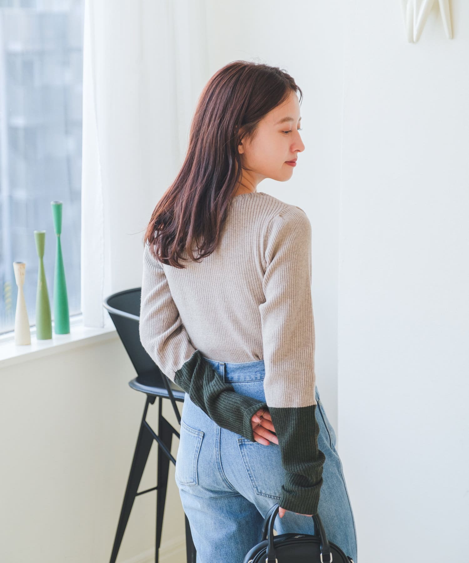 【新色追加/6色展開】B 袖配色ギャザーリブニットプルオーバー