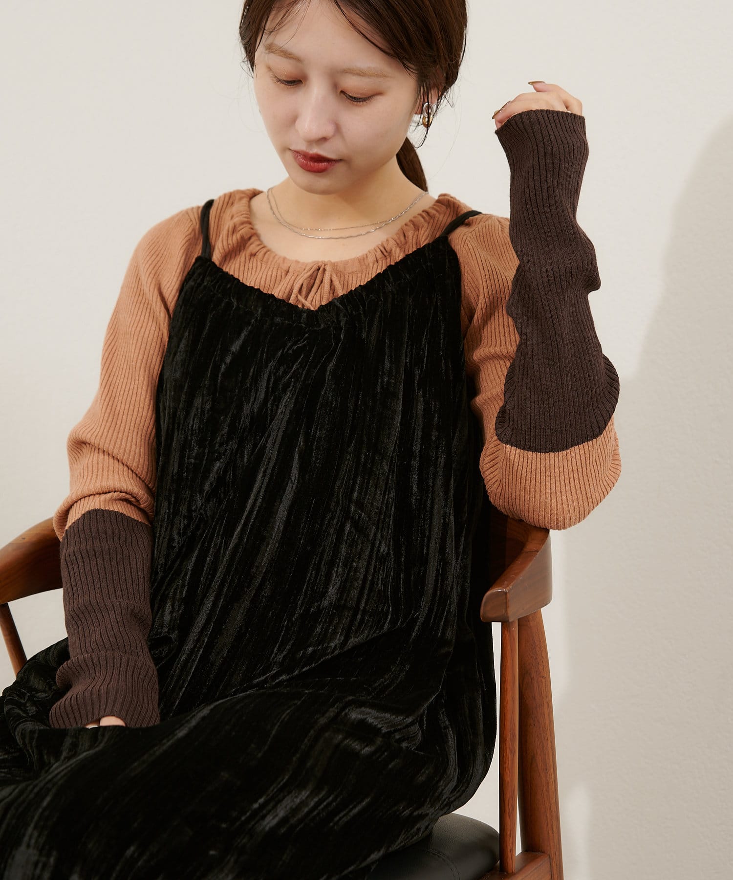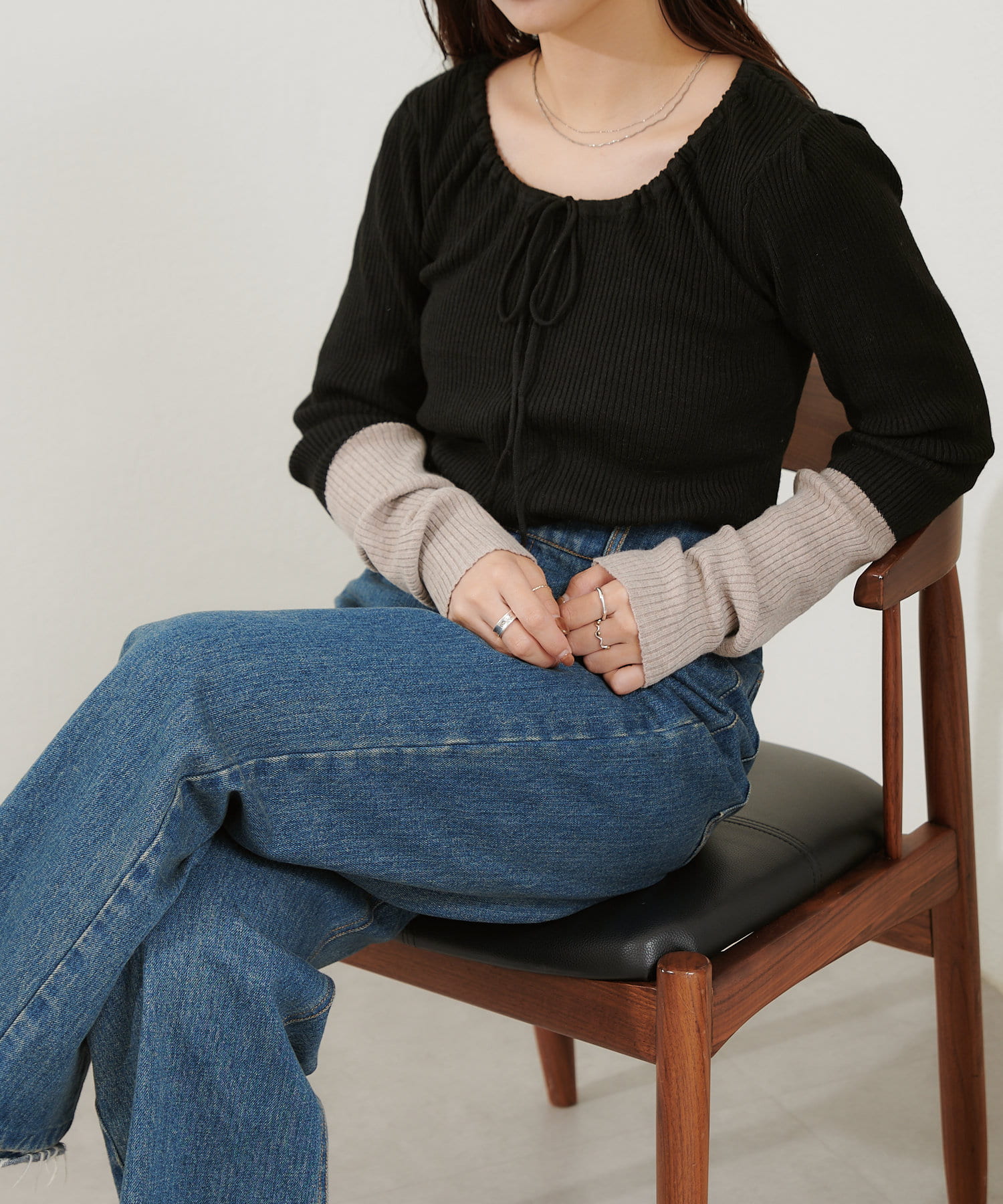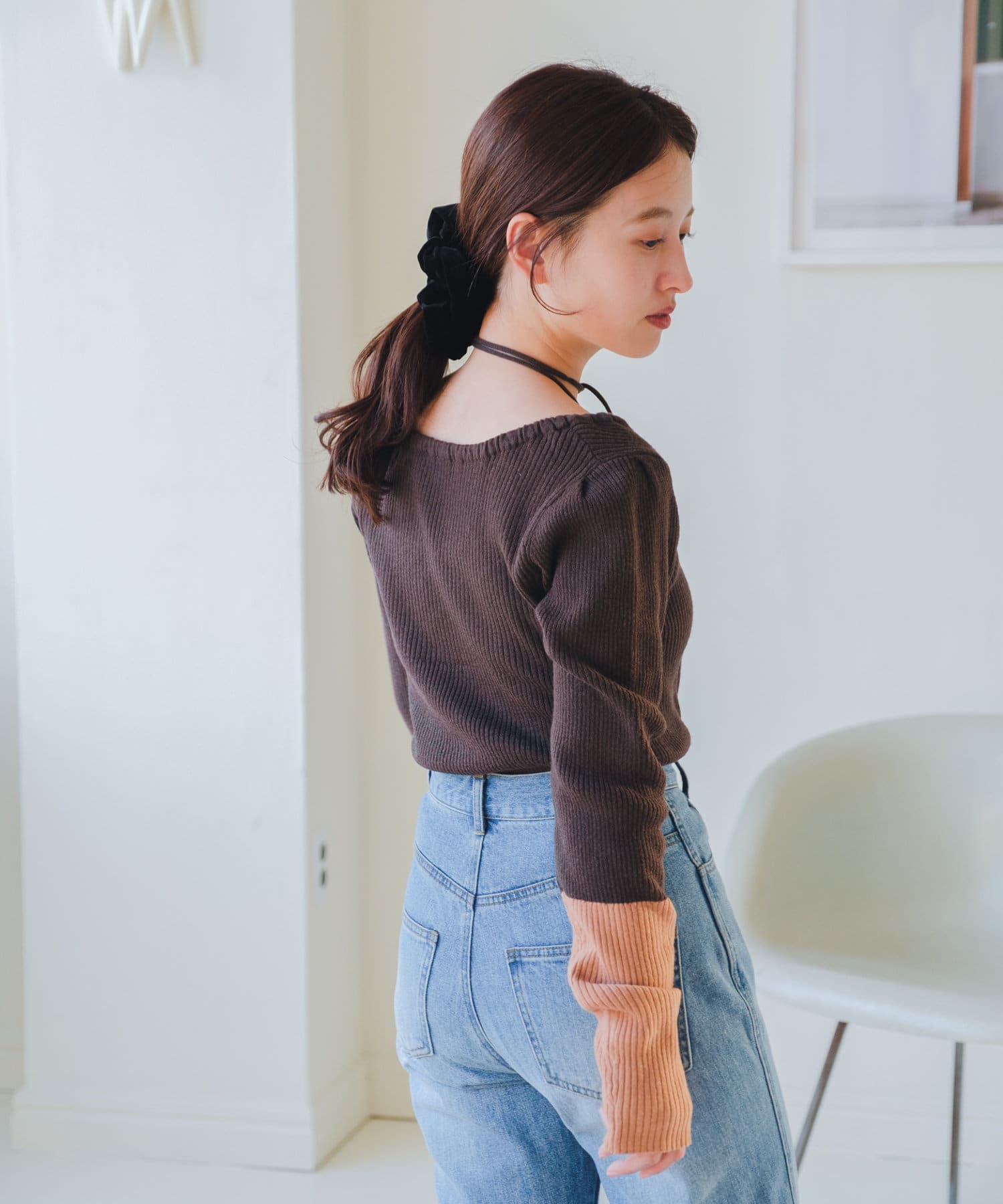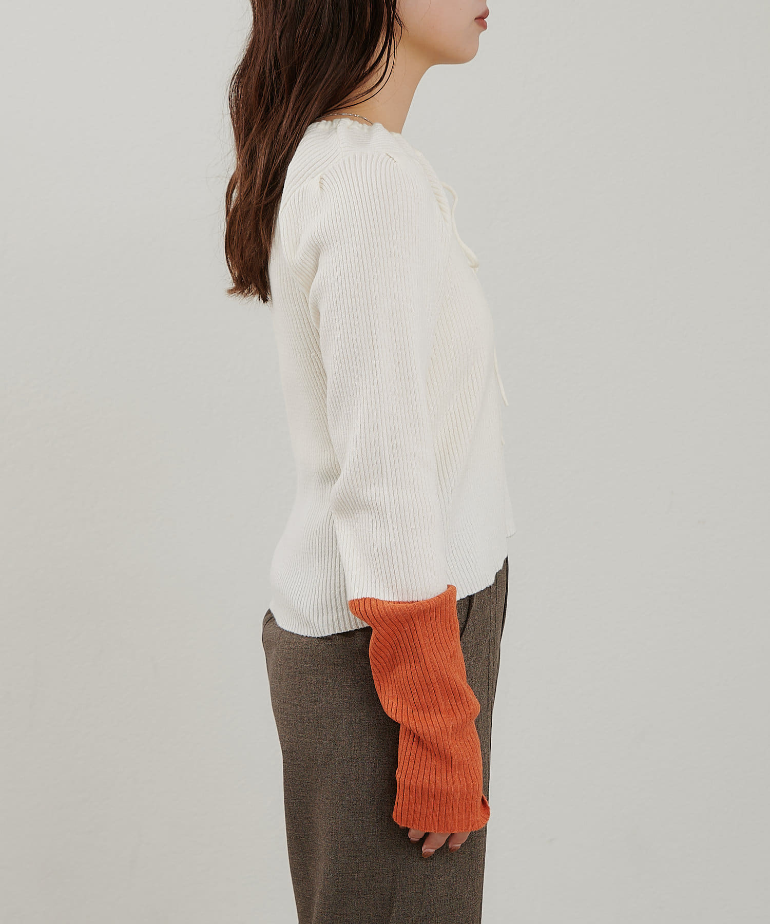 【新色追加/6色展開】B 袖配色ギャザーリブニットプルオーバー