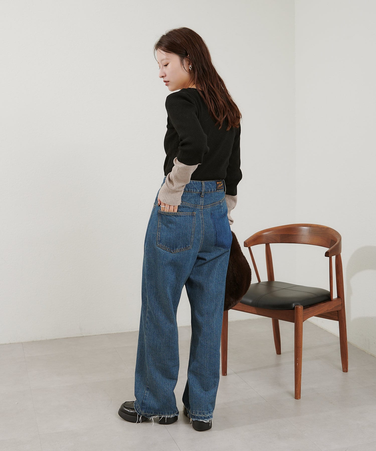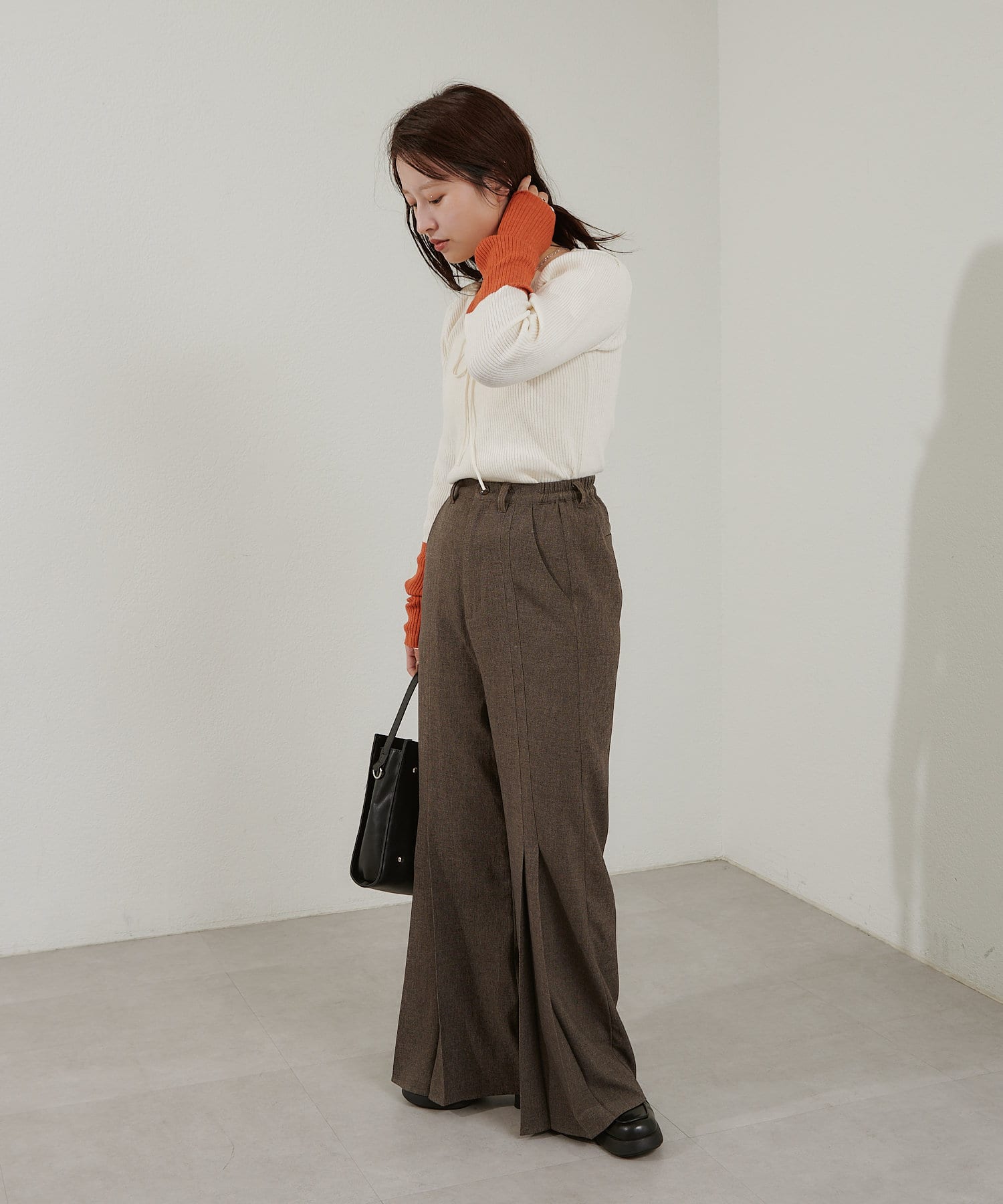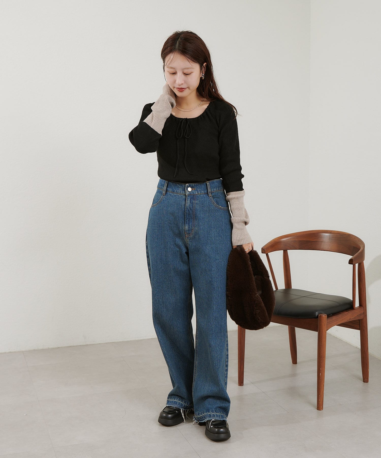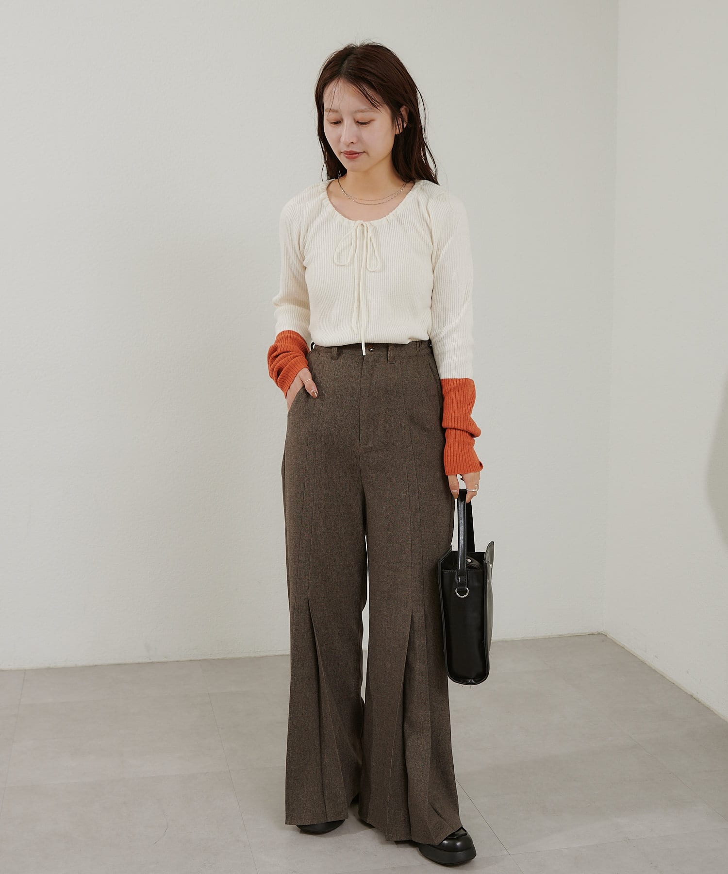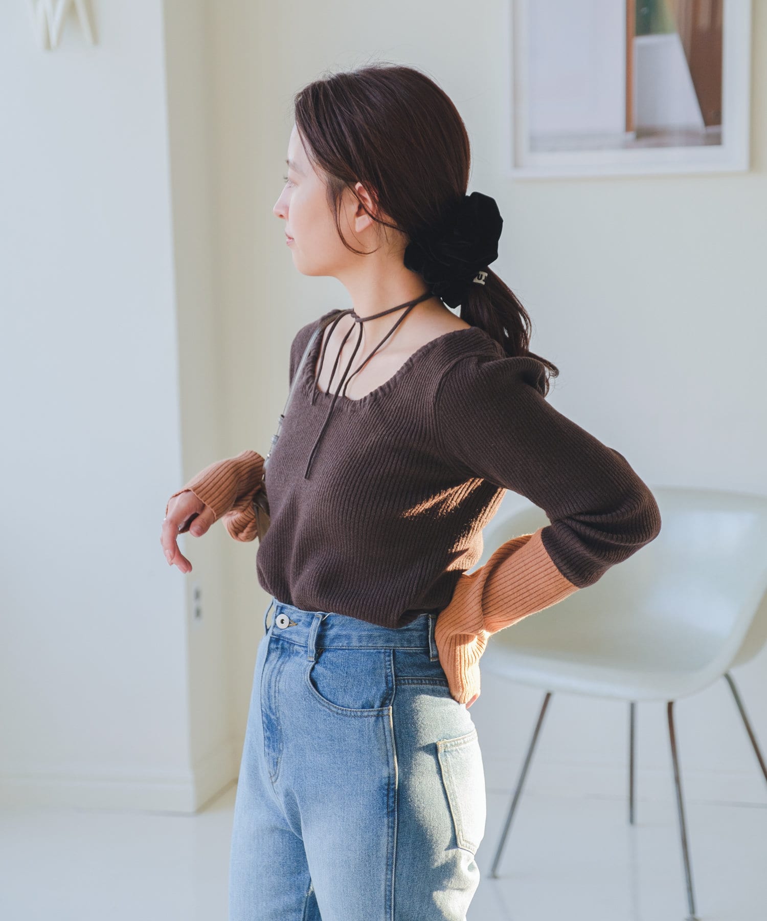 【新色追加/6色展開】B 袖配色ギャザーリブニットプルオーバー