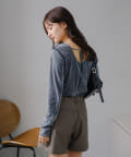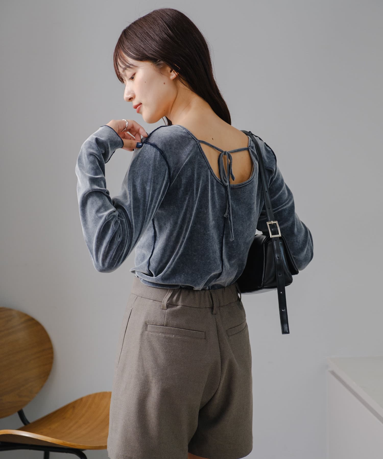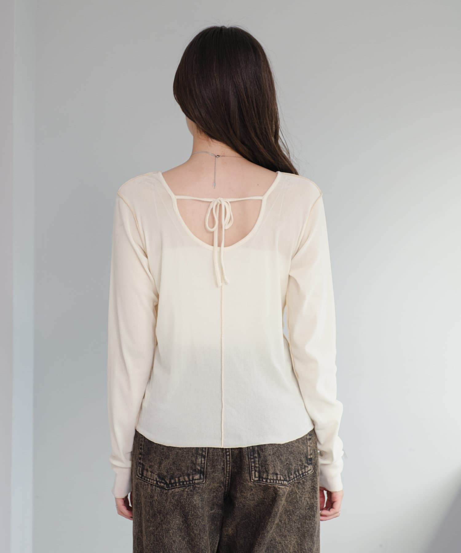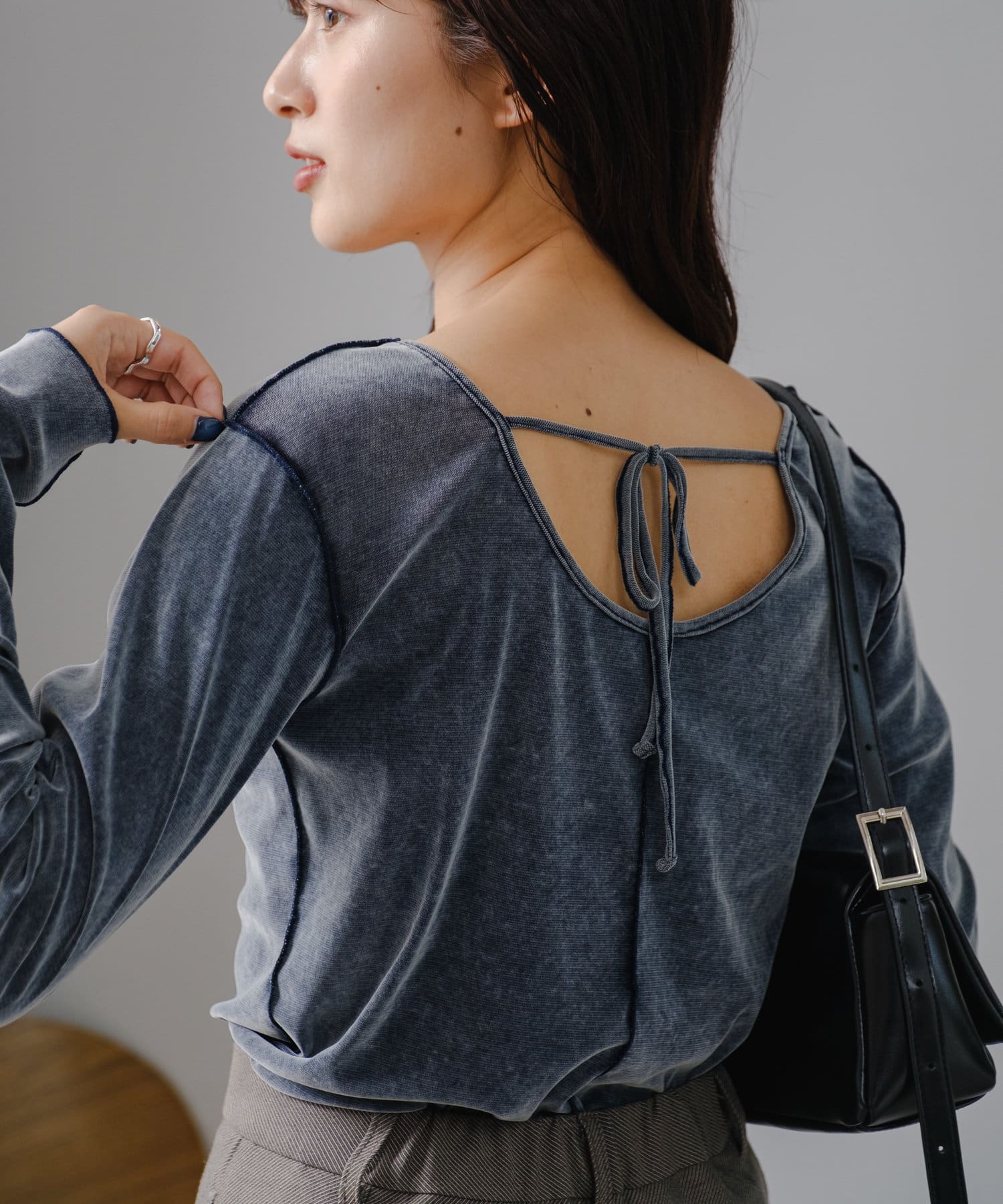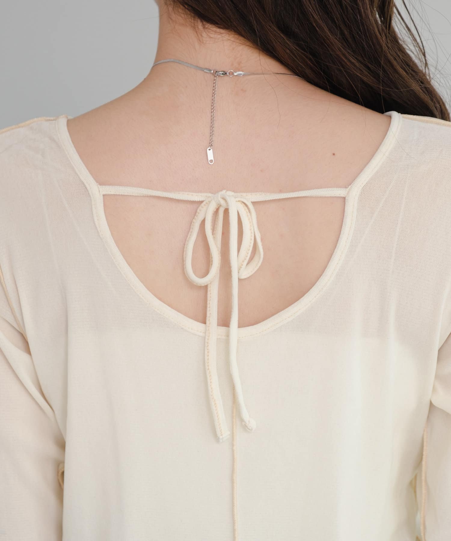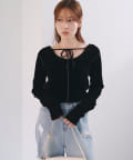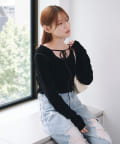 シンプルながらも、バック部分にリボンがついているので後ろ姿まで可愛いトップス。