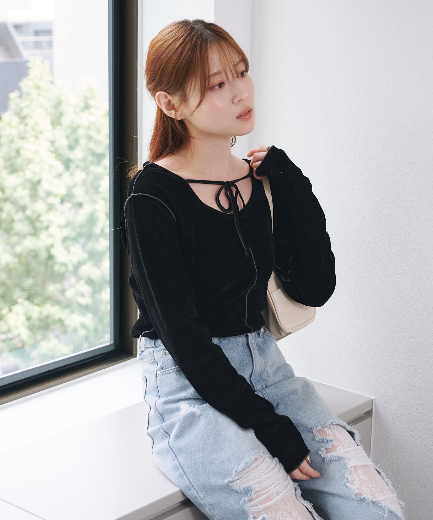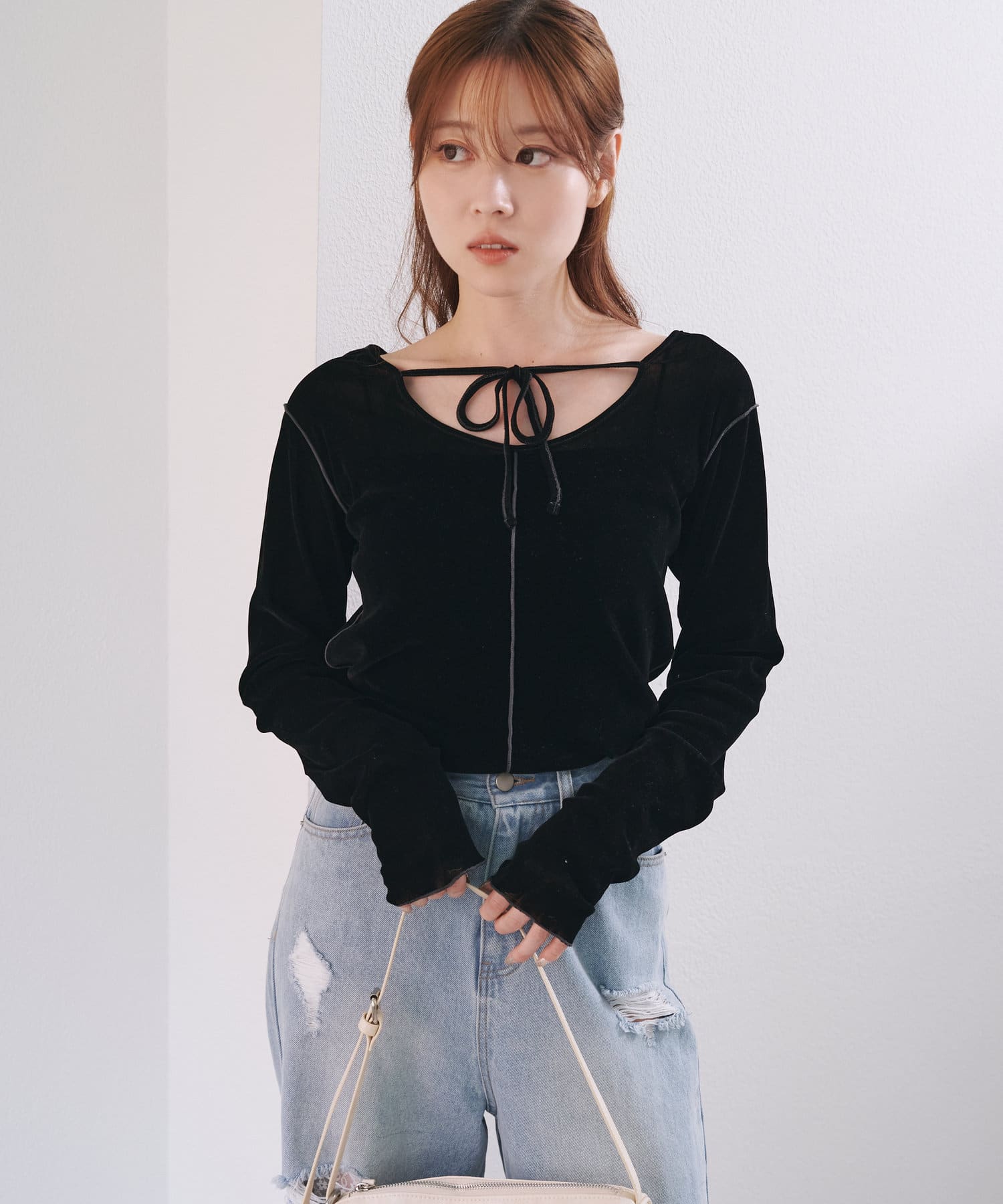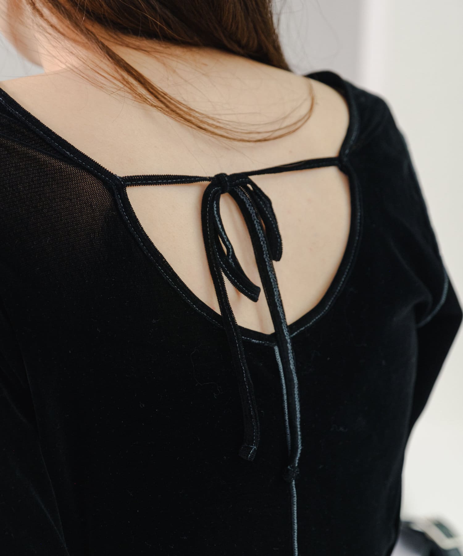 購入場所:パルクローゼットベロアの触り心地がよく、着ていて気持ちいいです。ベロアも色々ありますが、こちらのものはいい意味で、ベロア特有のテカテカ加減が丁度よく、ベロアを主張しすぎないところが良い。薄手なのでカーディガンのインナーとしても優秀。後ろリボンもさり気なくて可愛いです。
