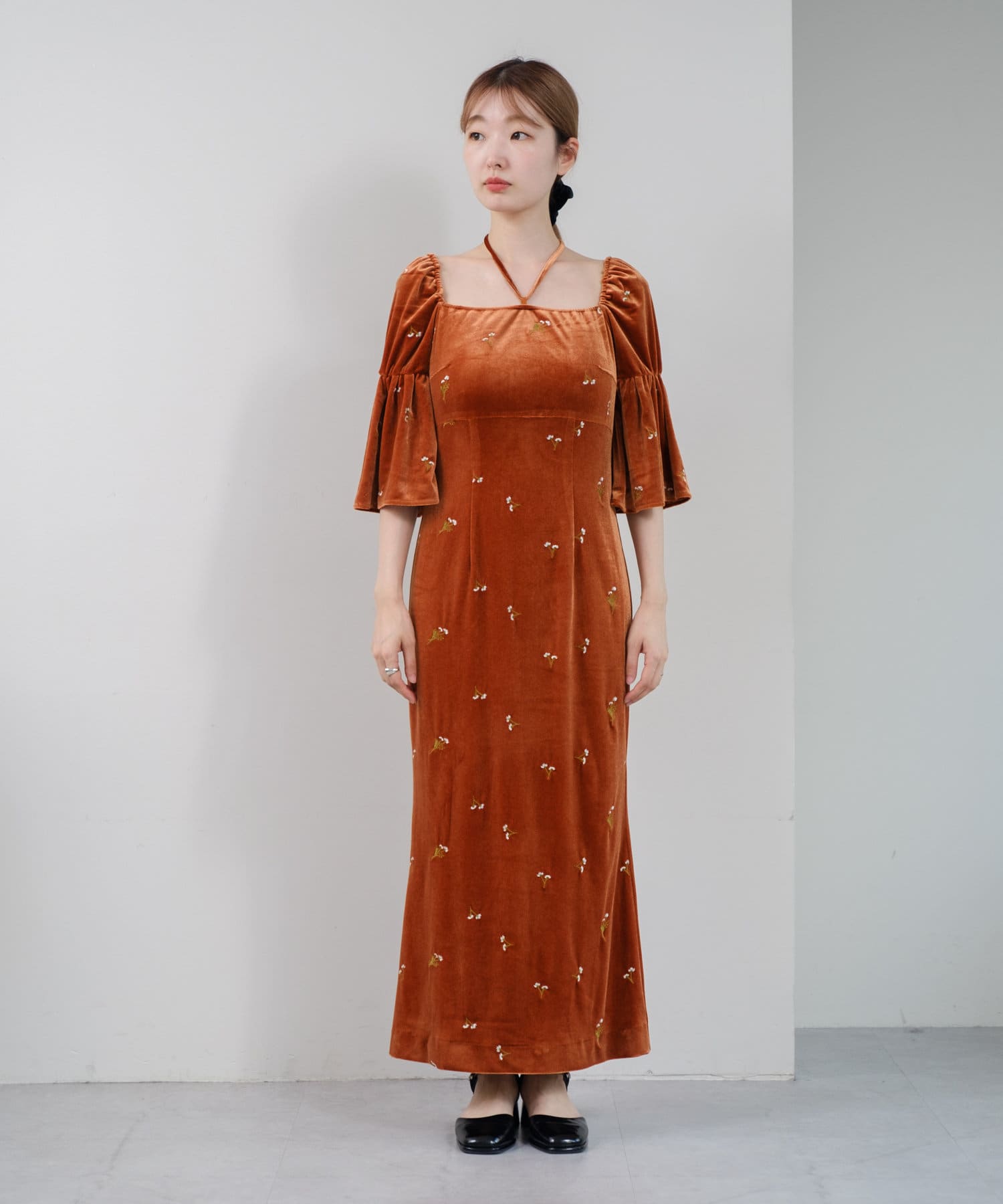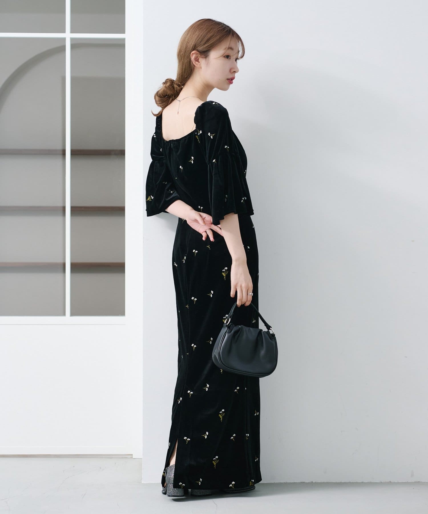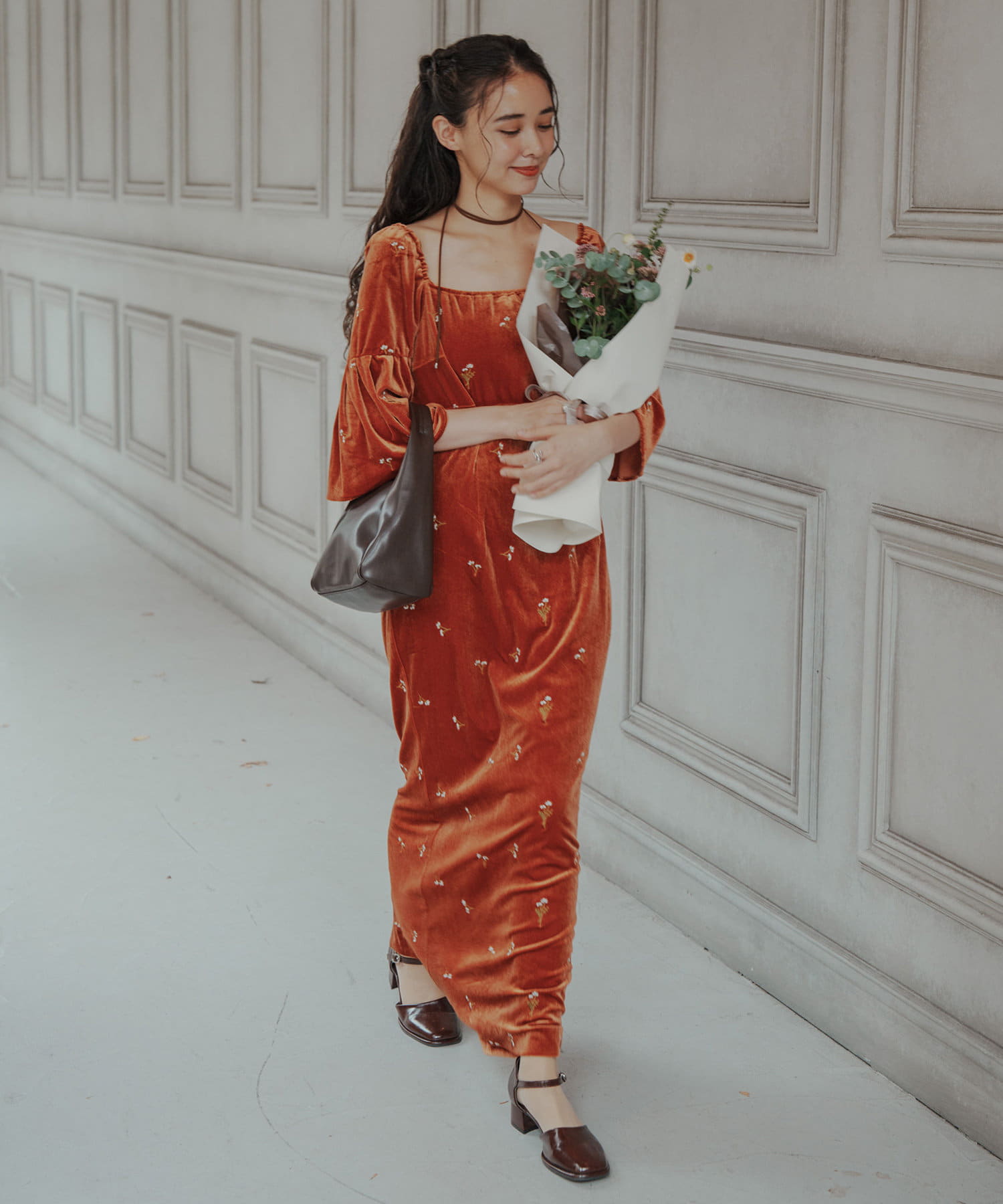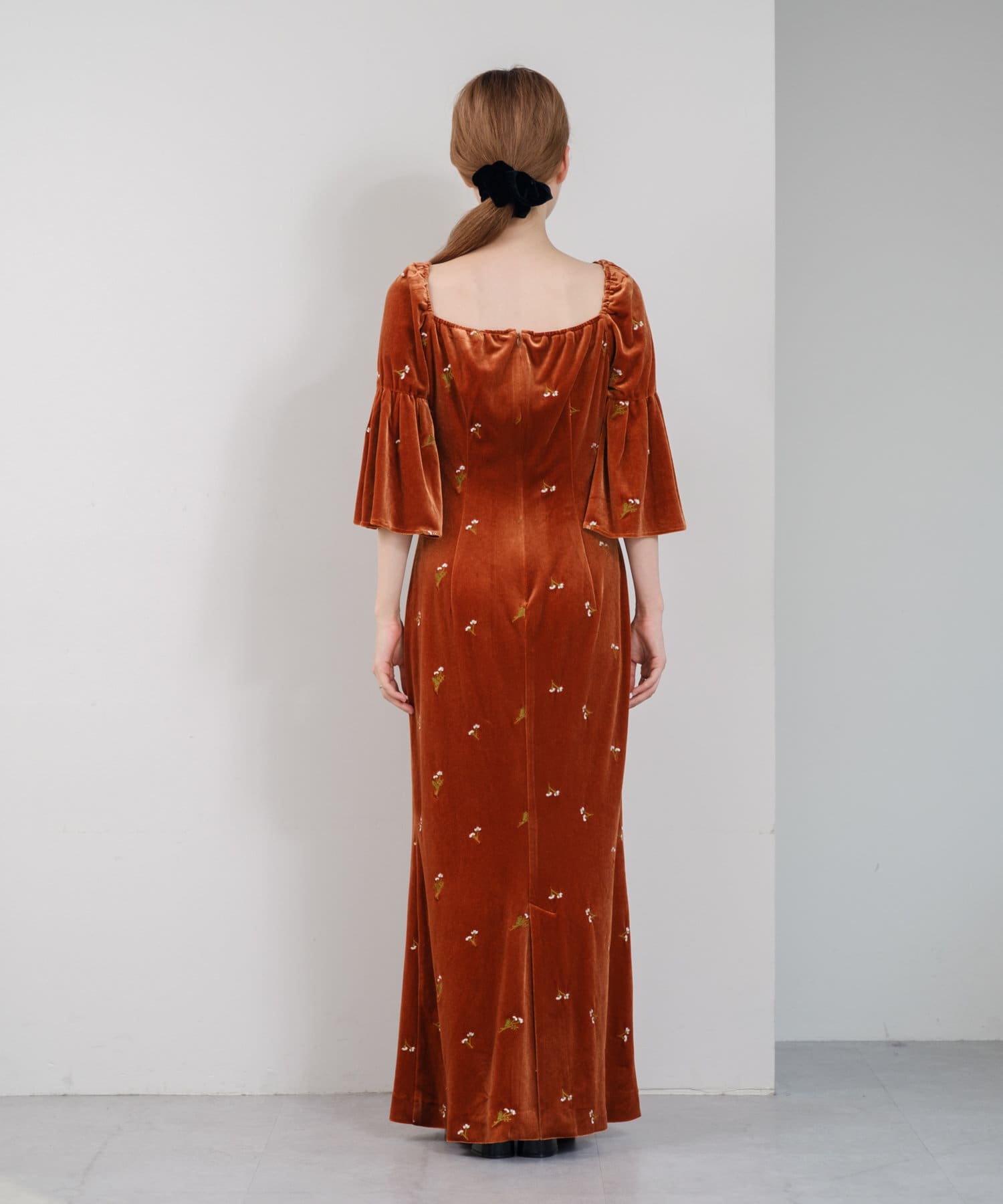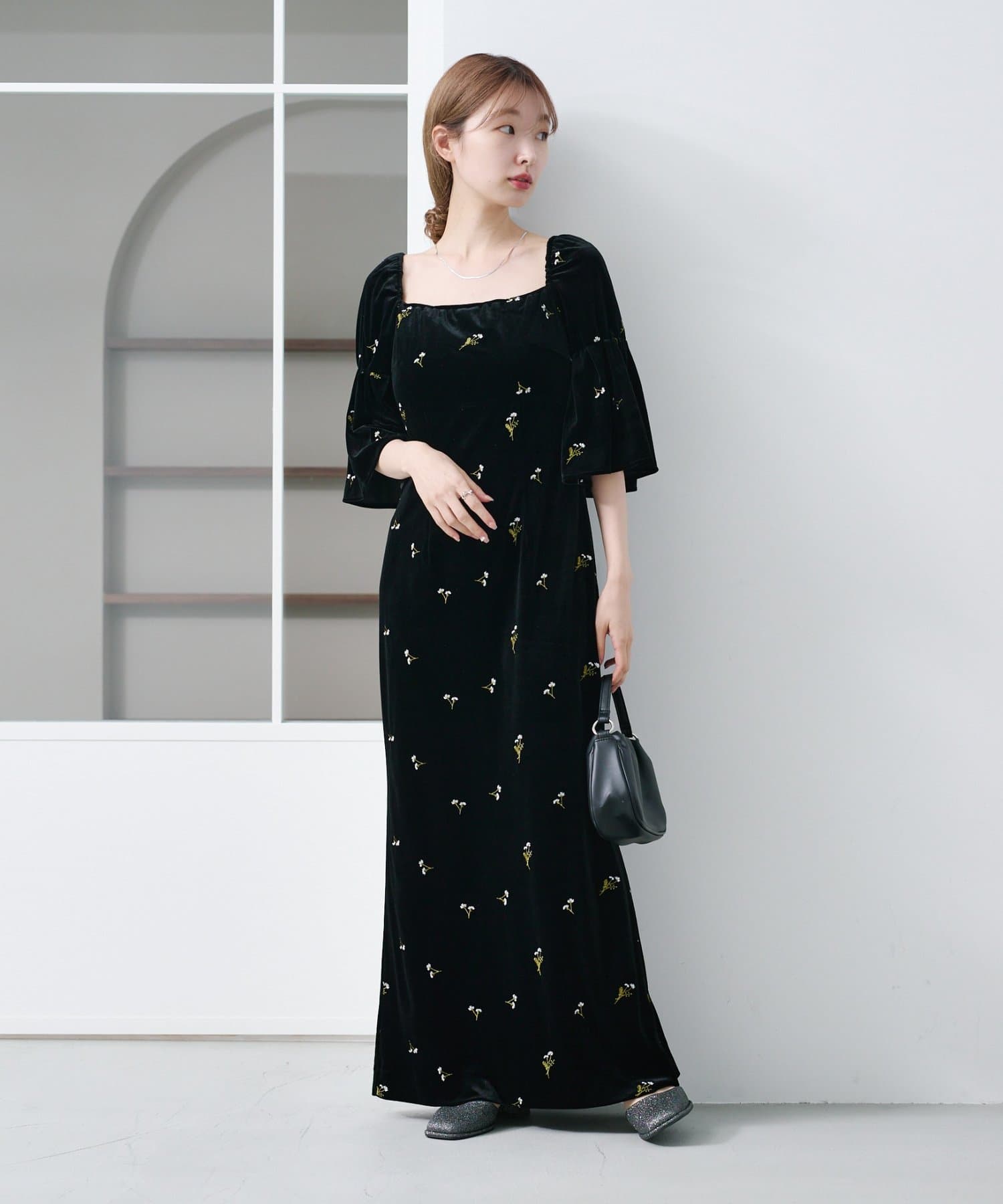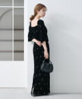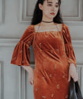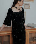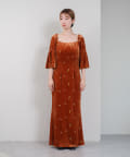 柔らかな光沢感と深みのあるベルベット生地に小花柄の刺繍が散りばめられた、上品なロングドレス。