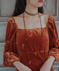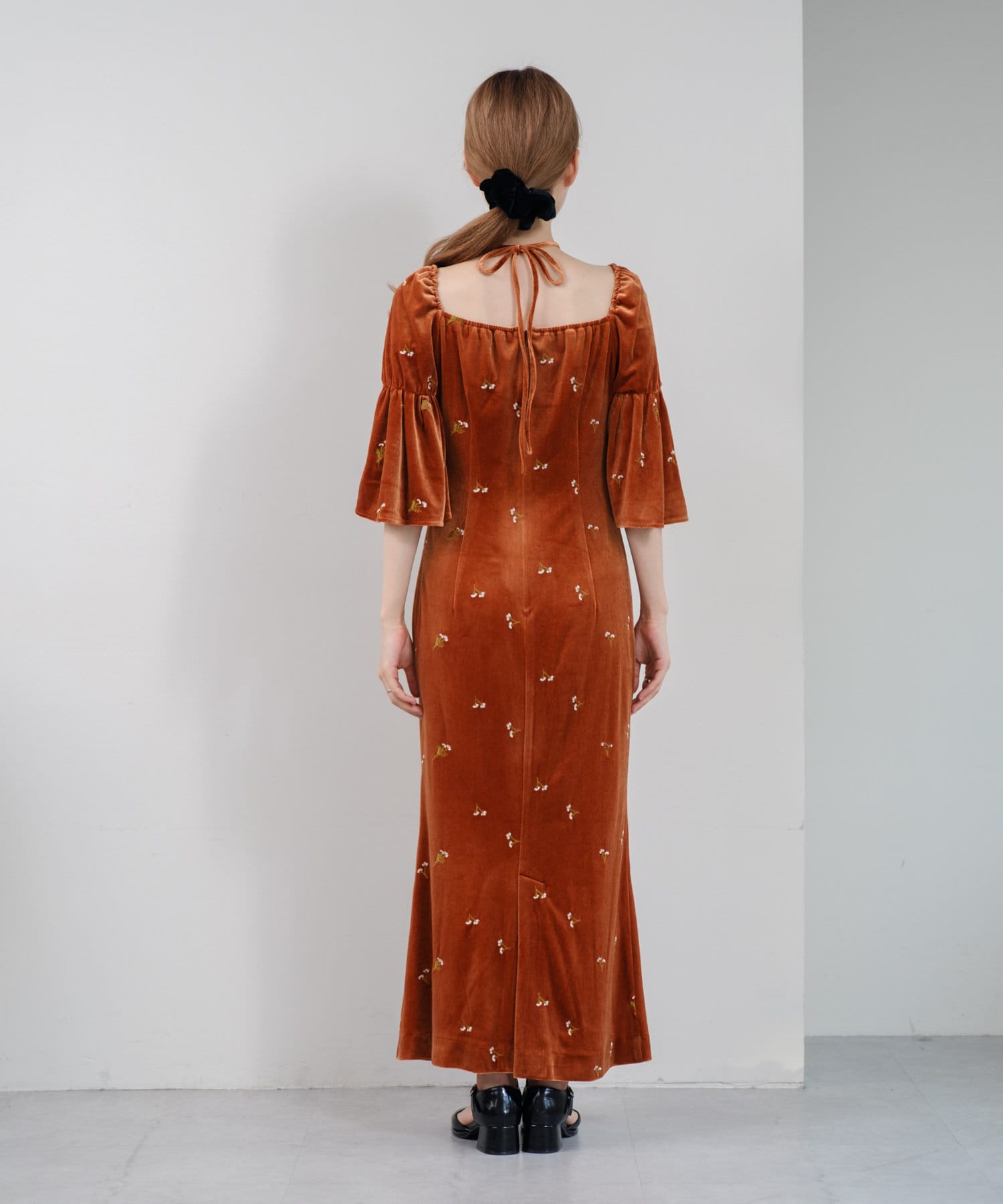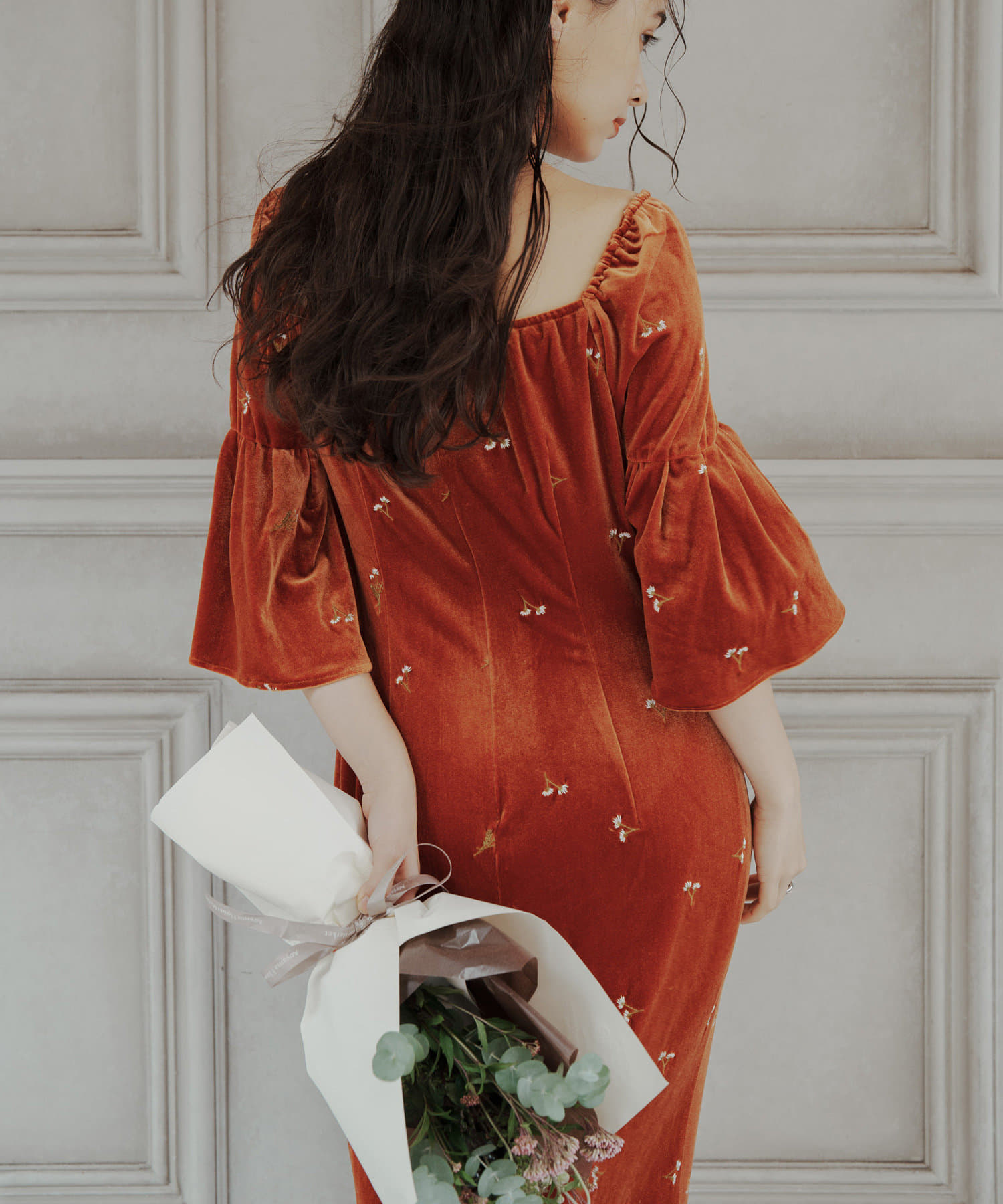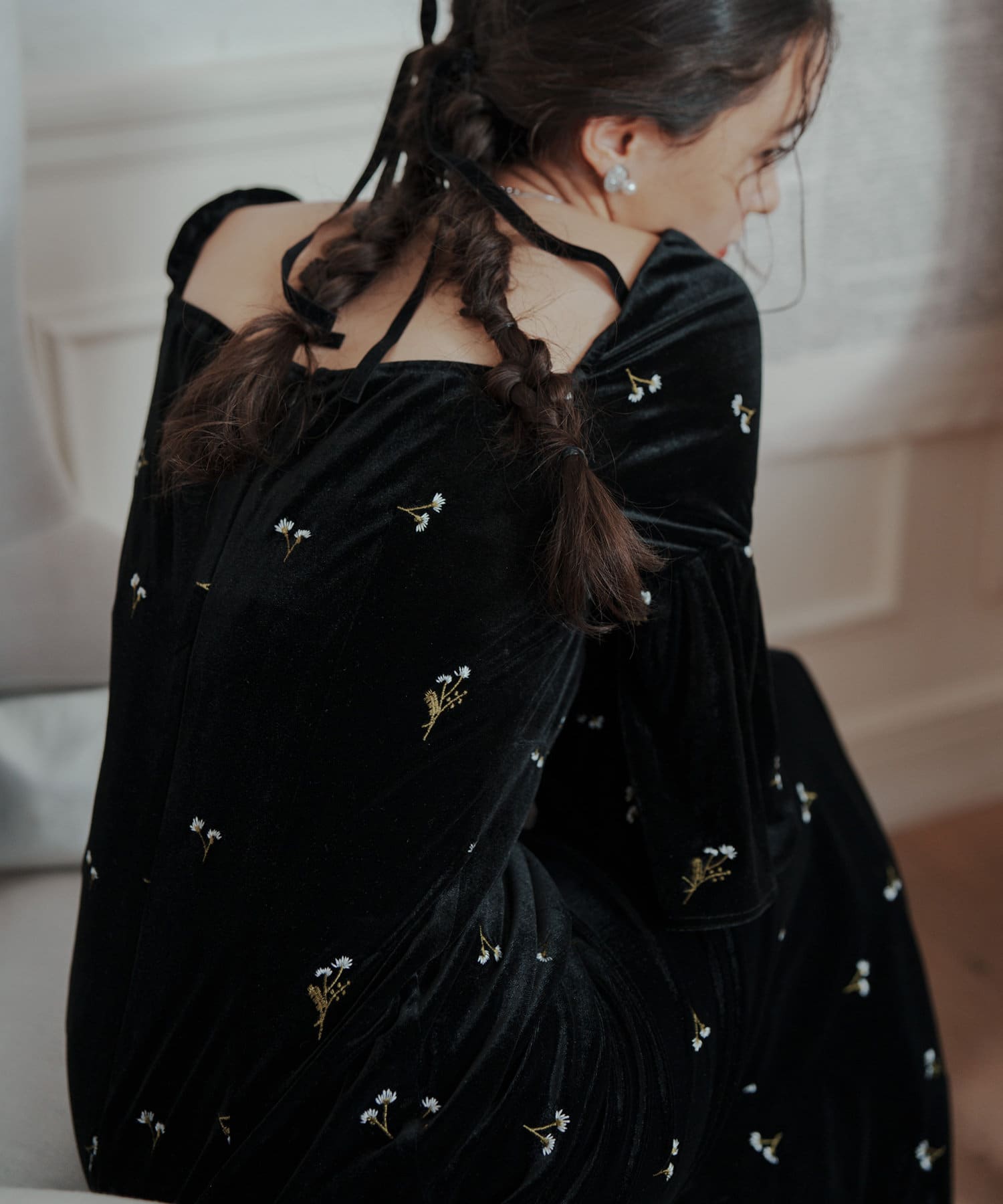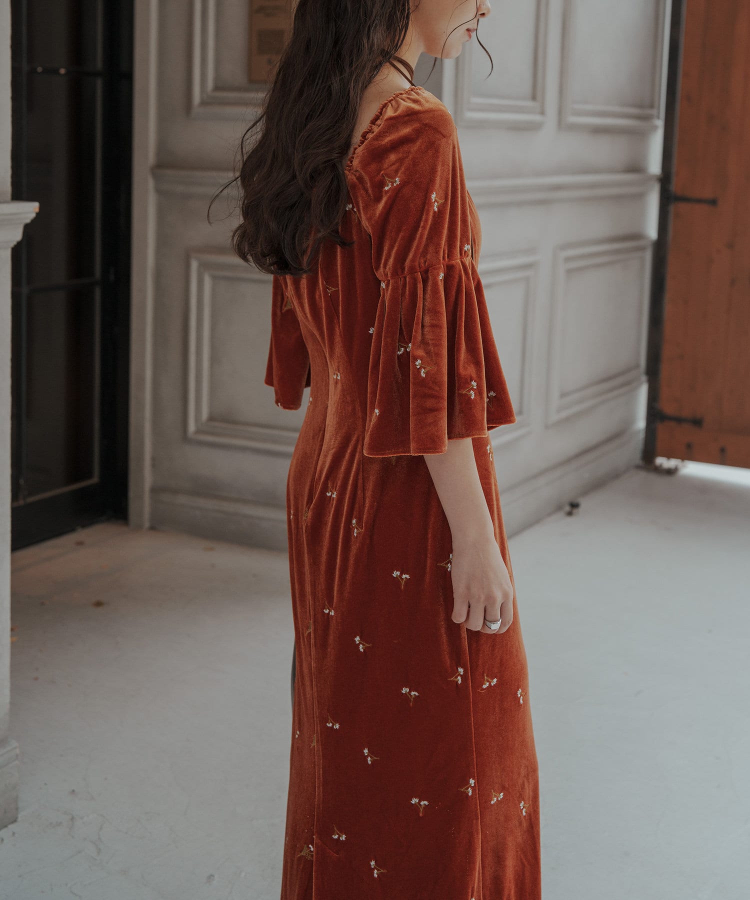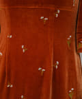 柔らかな光沢感と深みのあるベルベット生地に小花柄の刺繍が散りばめられた、上品なロングドレス。
