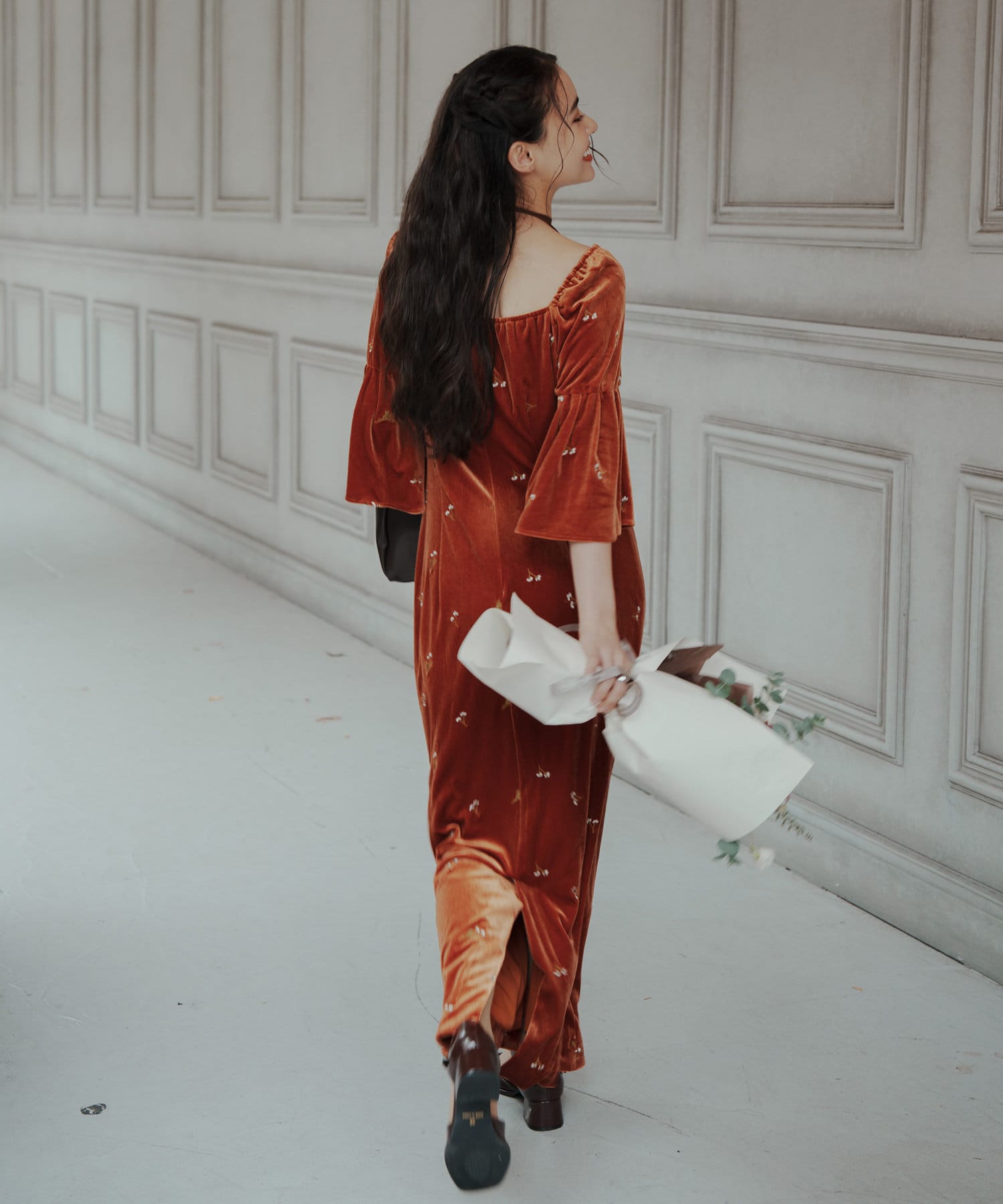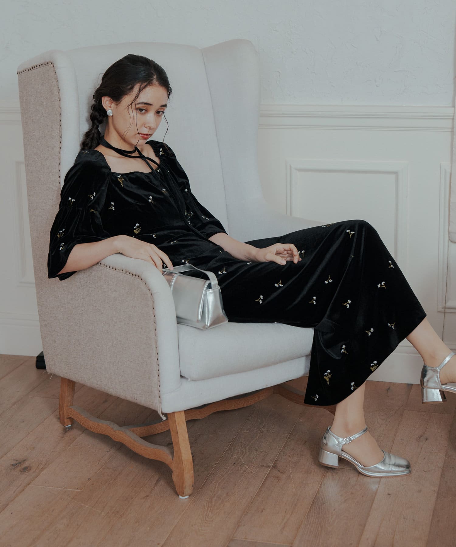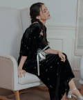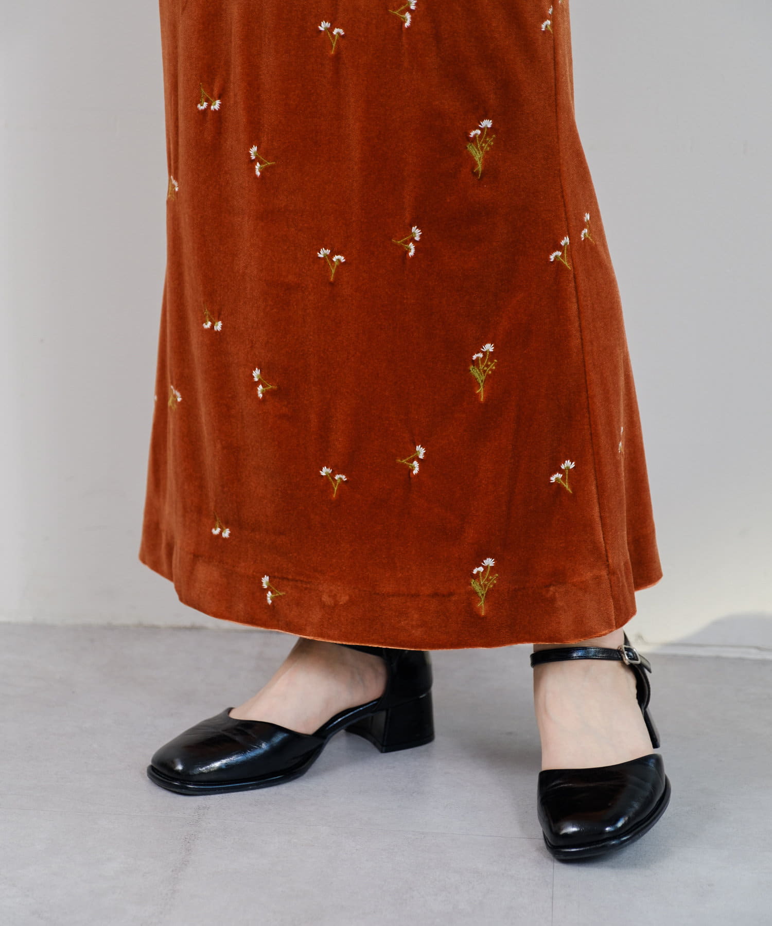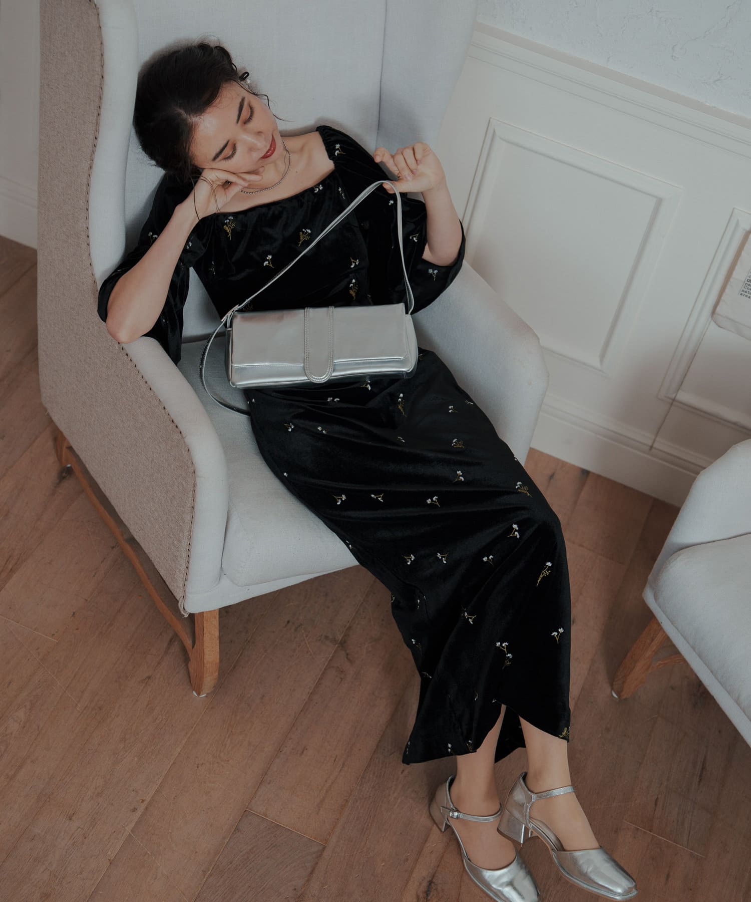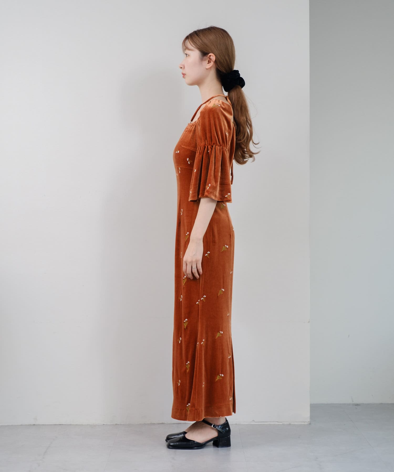 柔らかな光沢感と深みのあるベルベット生地に小花柄の刺繍が散りばめられた、上品なロングドレス。