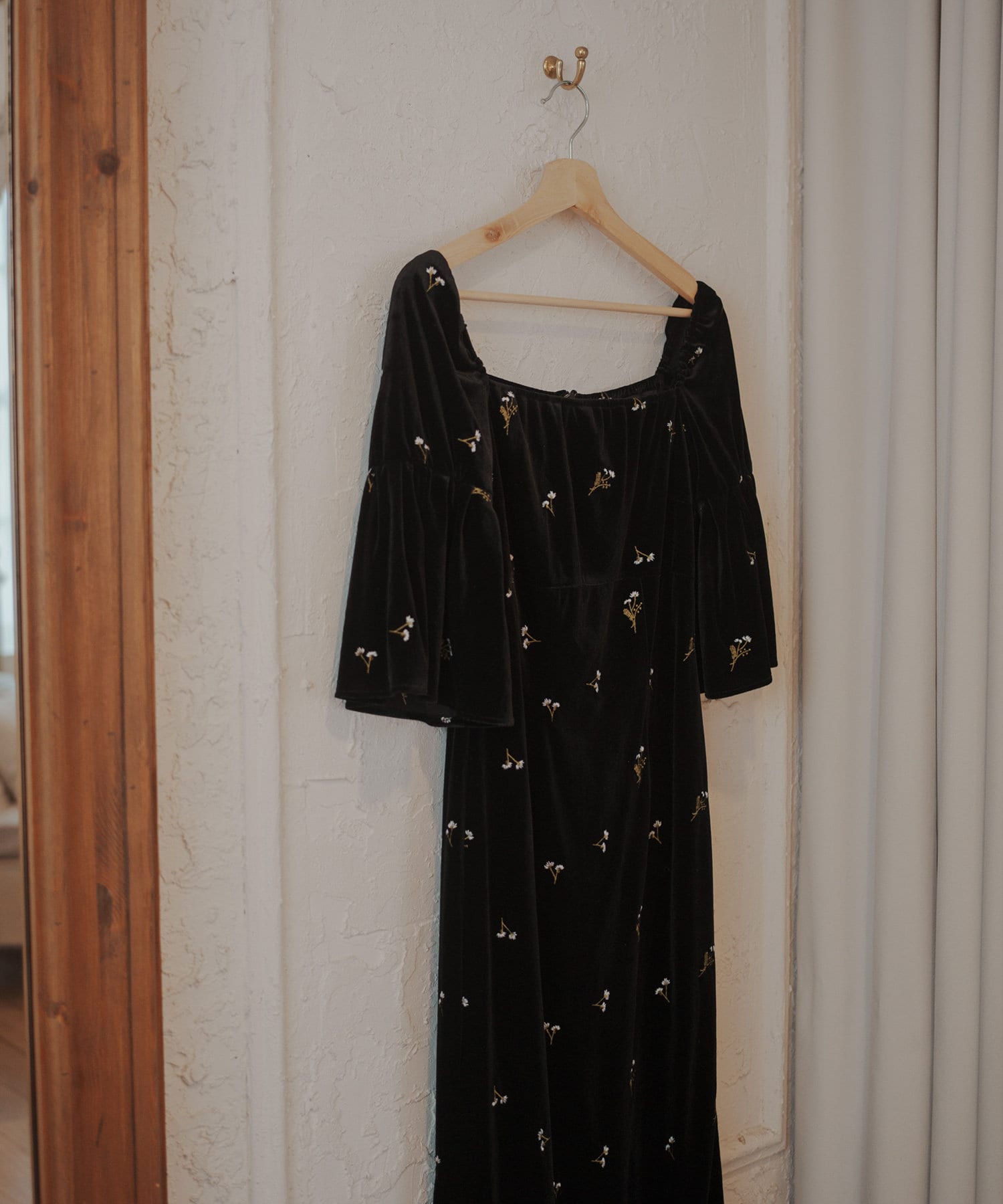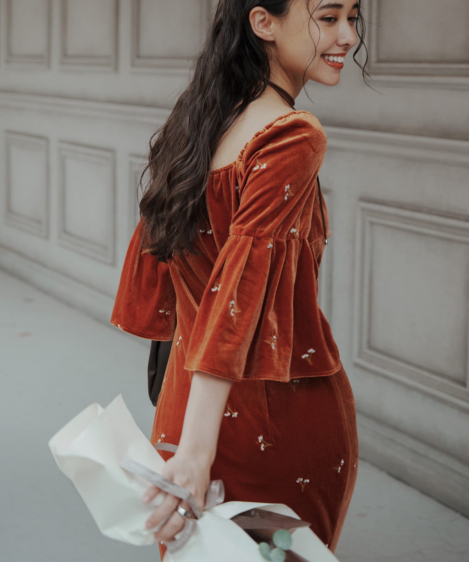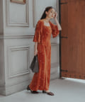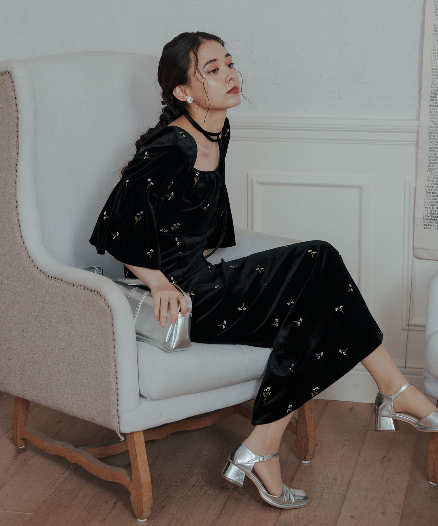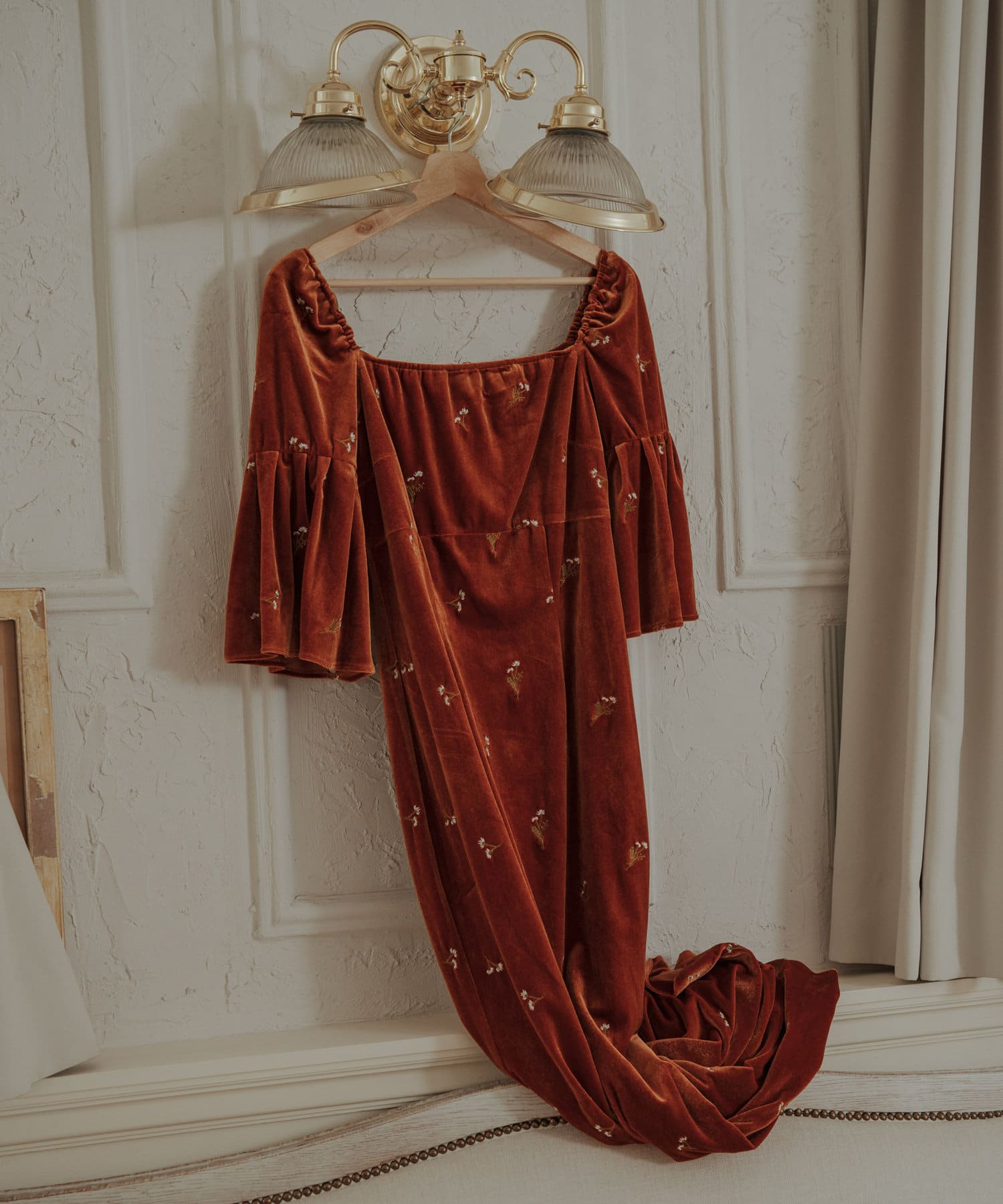 柔らかな光沢感と深みのあるベルベット生地に小花柄の刺繍が散りばめられた、上品なロングドレス。