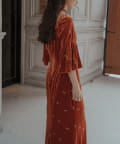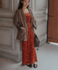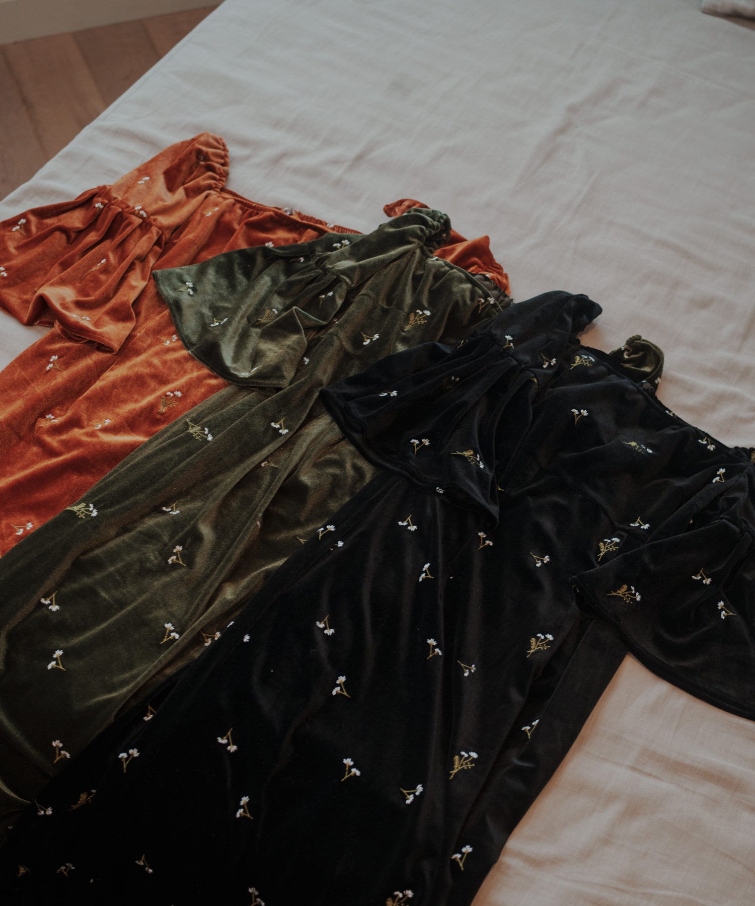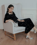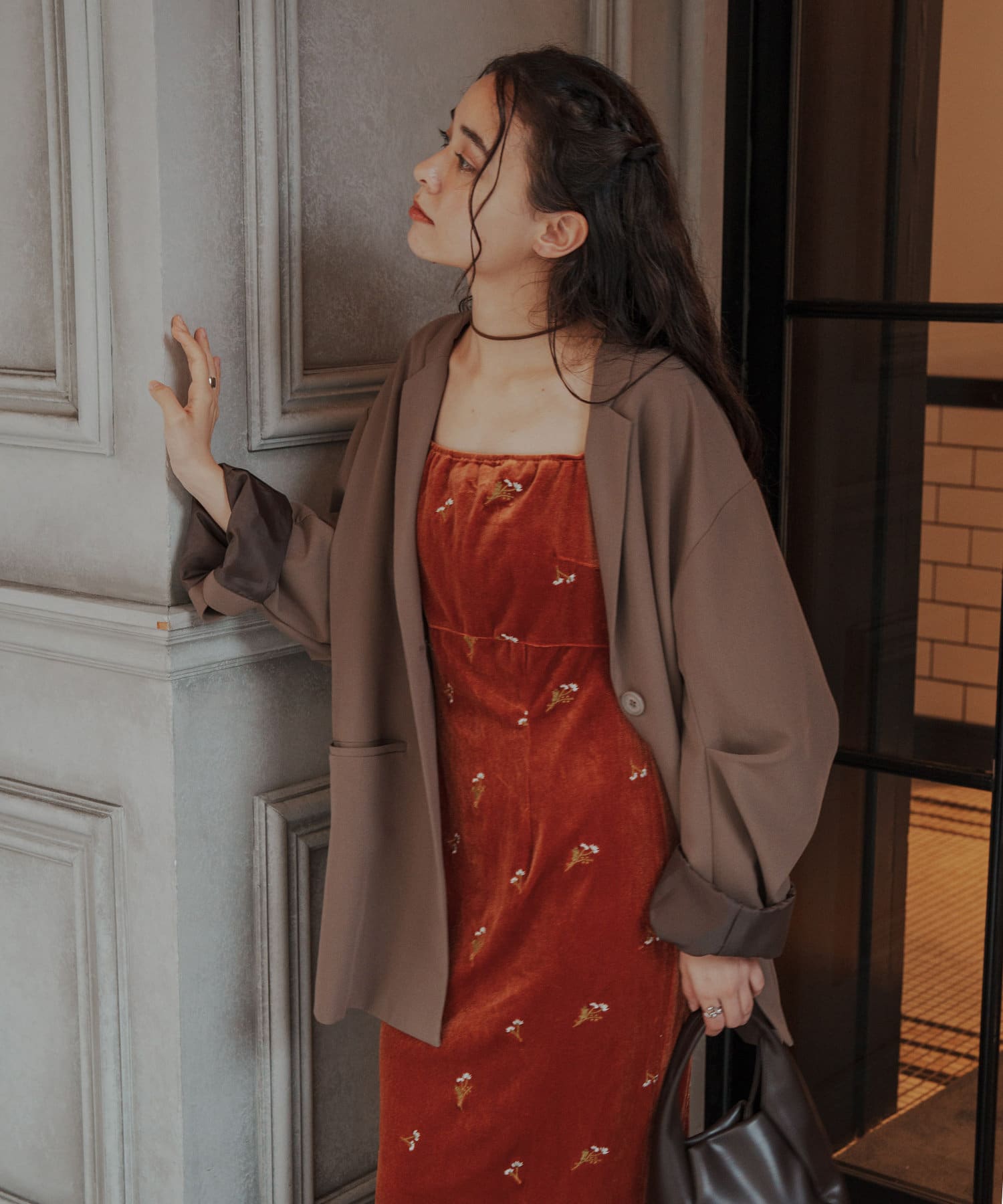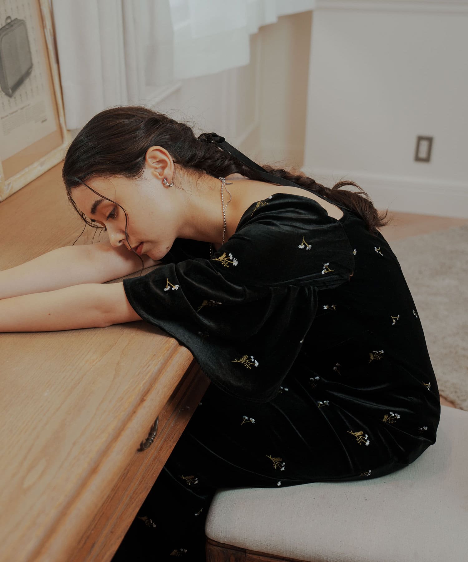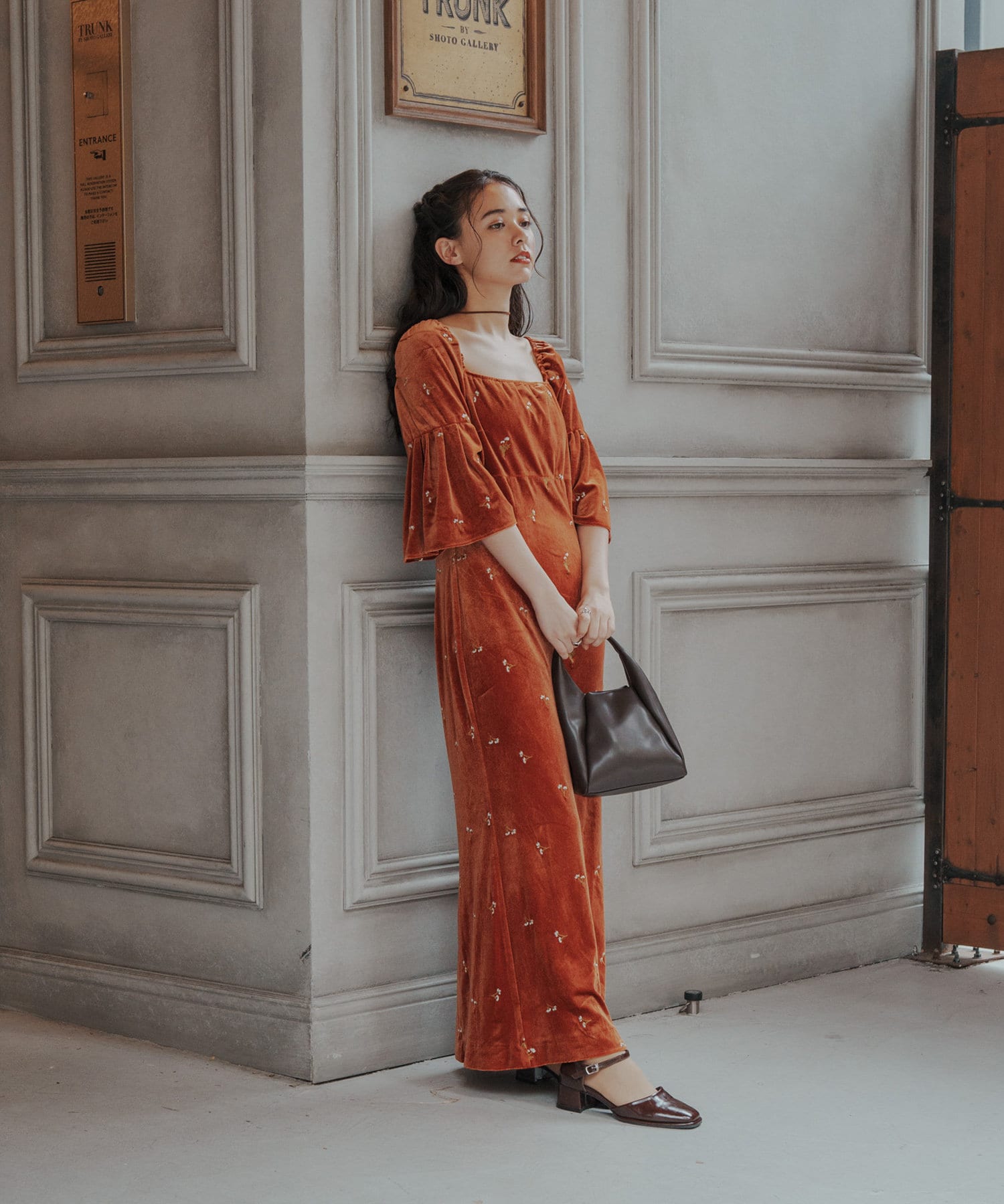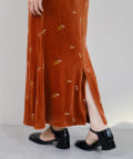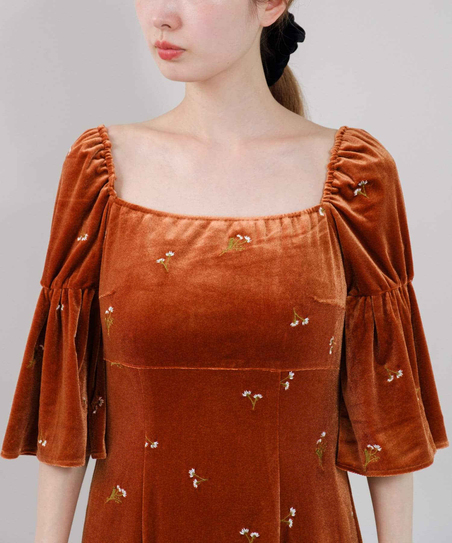柔らかな光沢感と深みのあるベルベット生地に小花柄の刺繍が散りばめられた、上品なロングドレス。