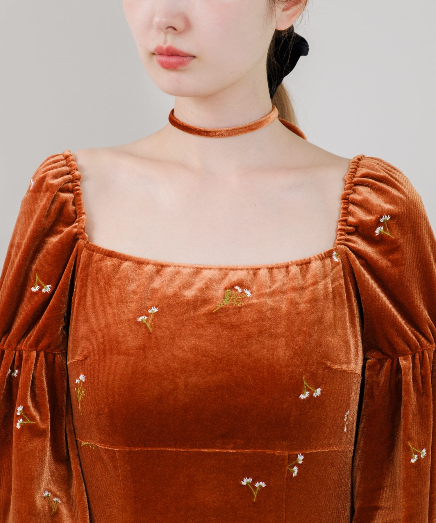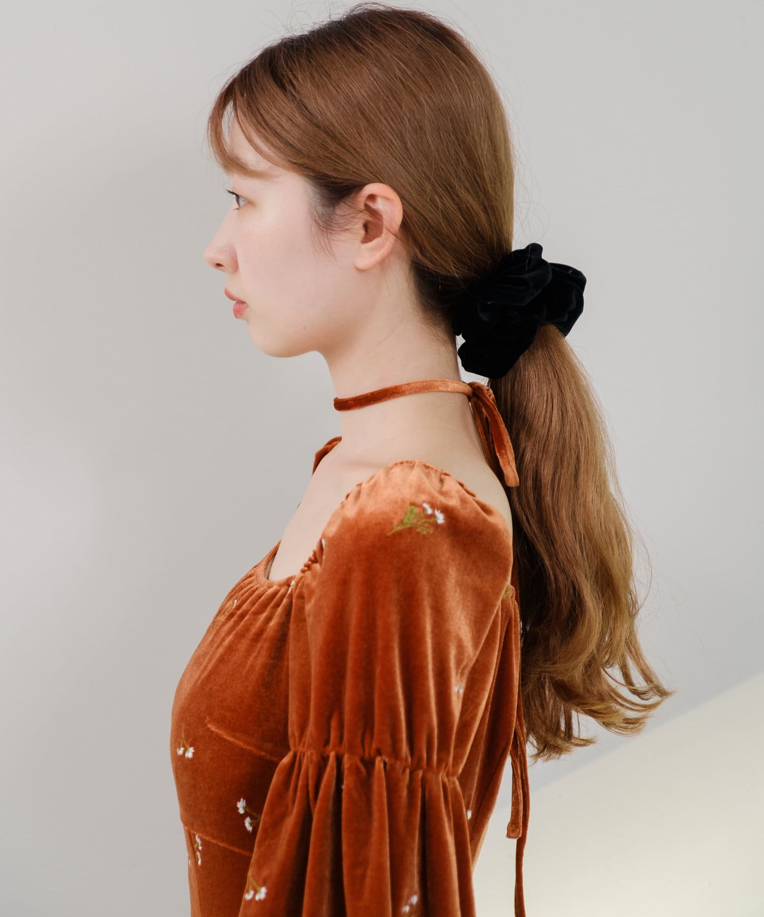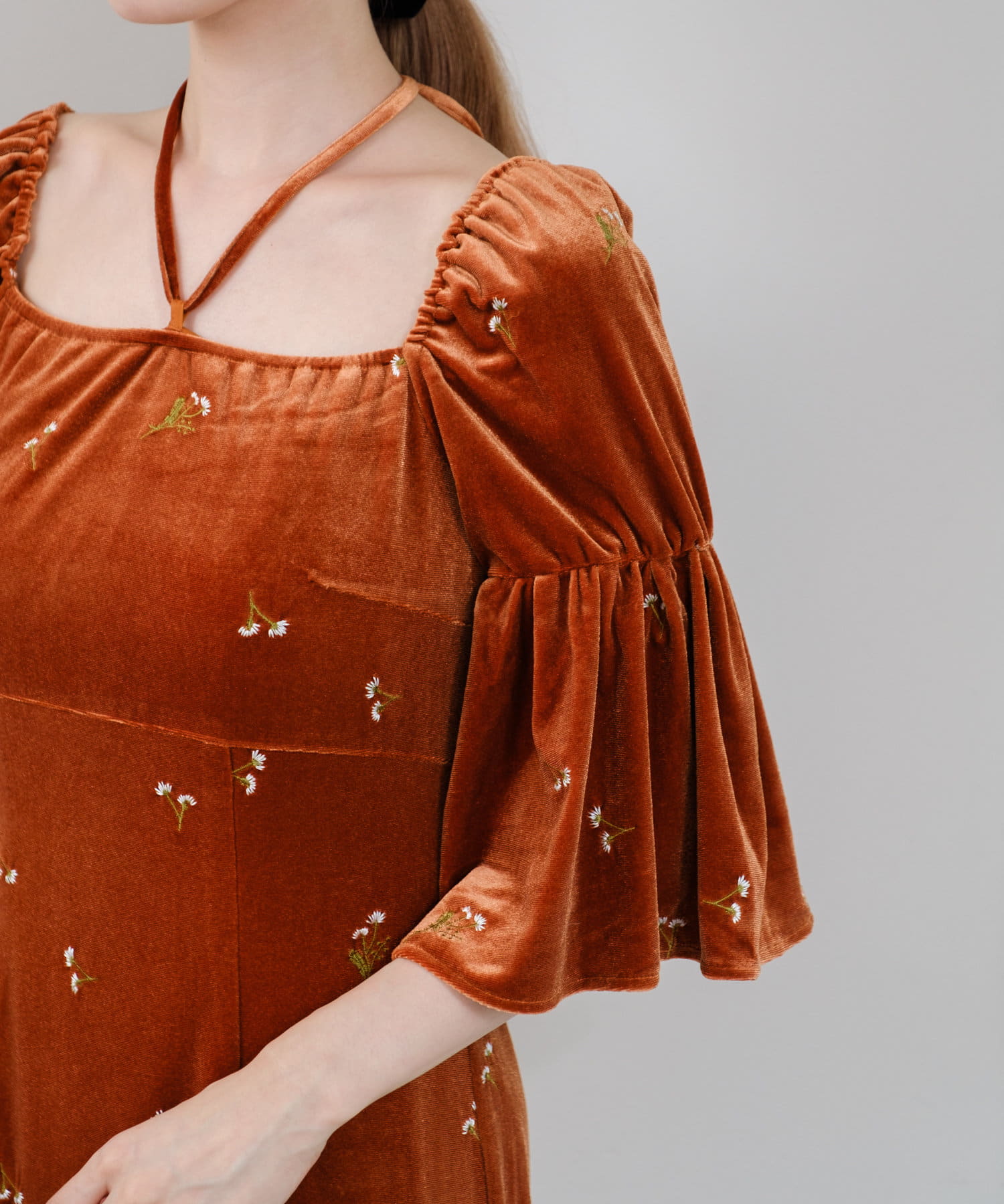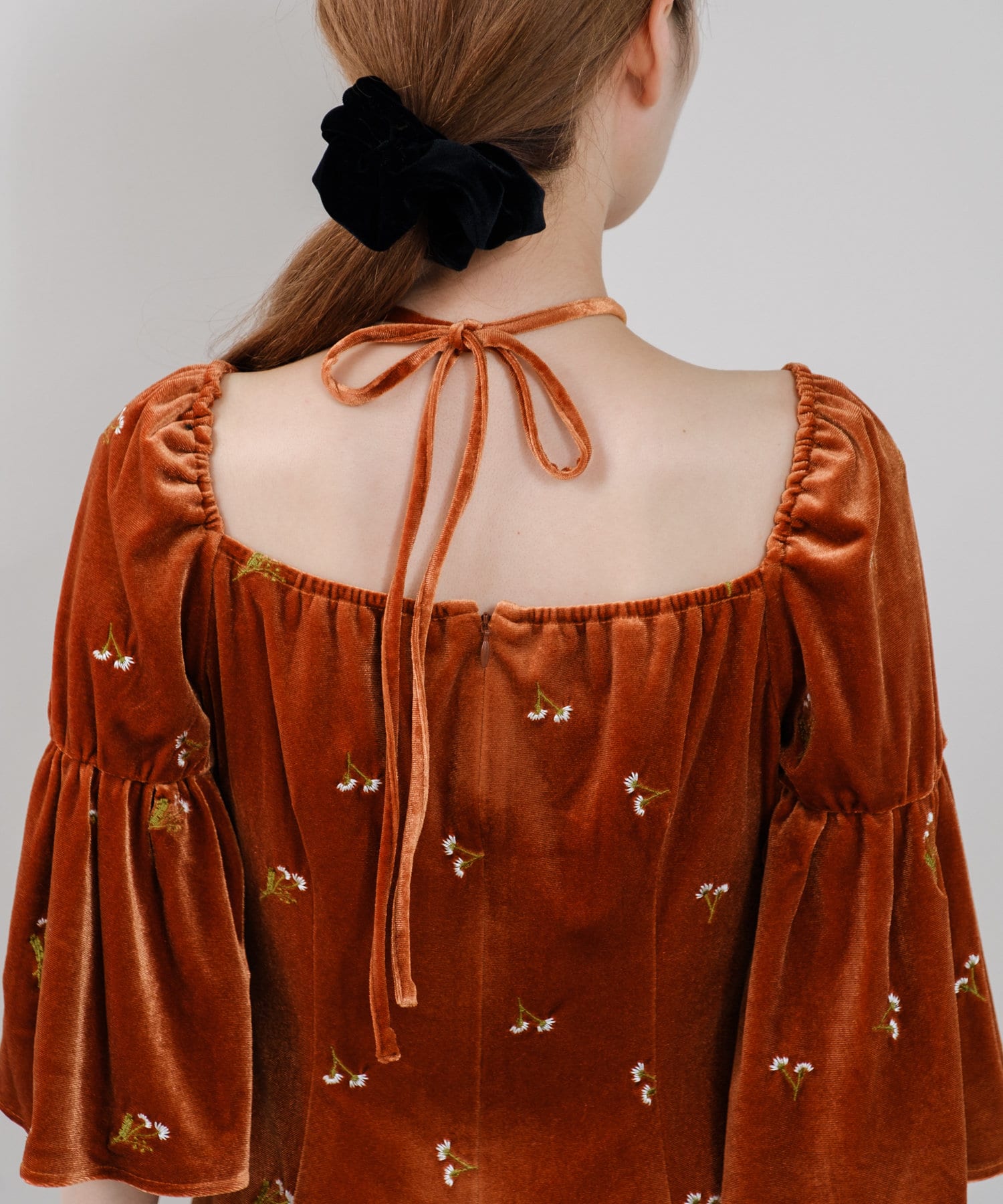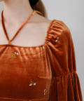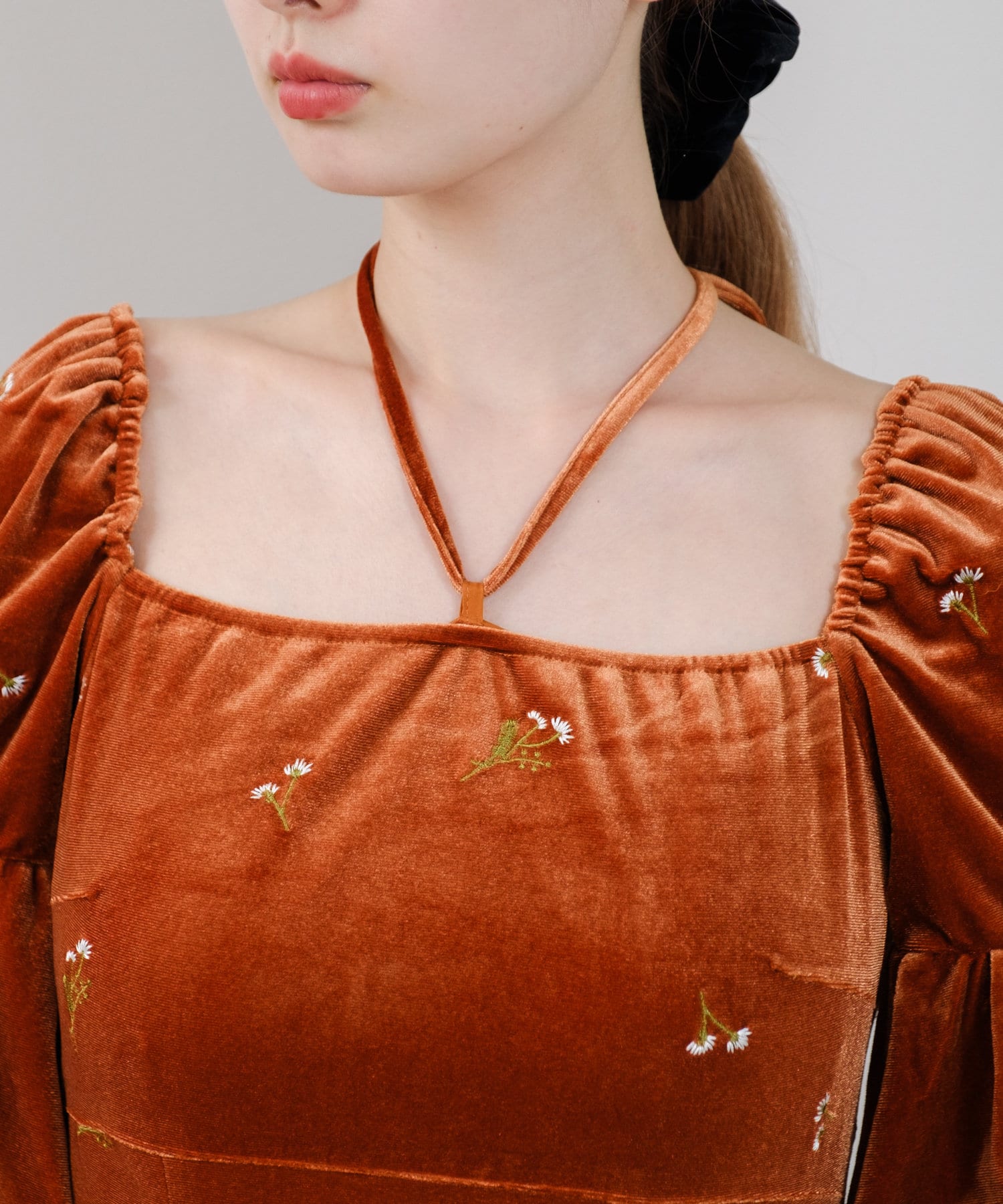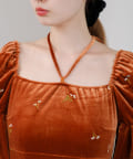 ベロアの紐がセットになっているので、胸元についているループに通してホルターネックのように着用したり、