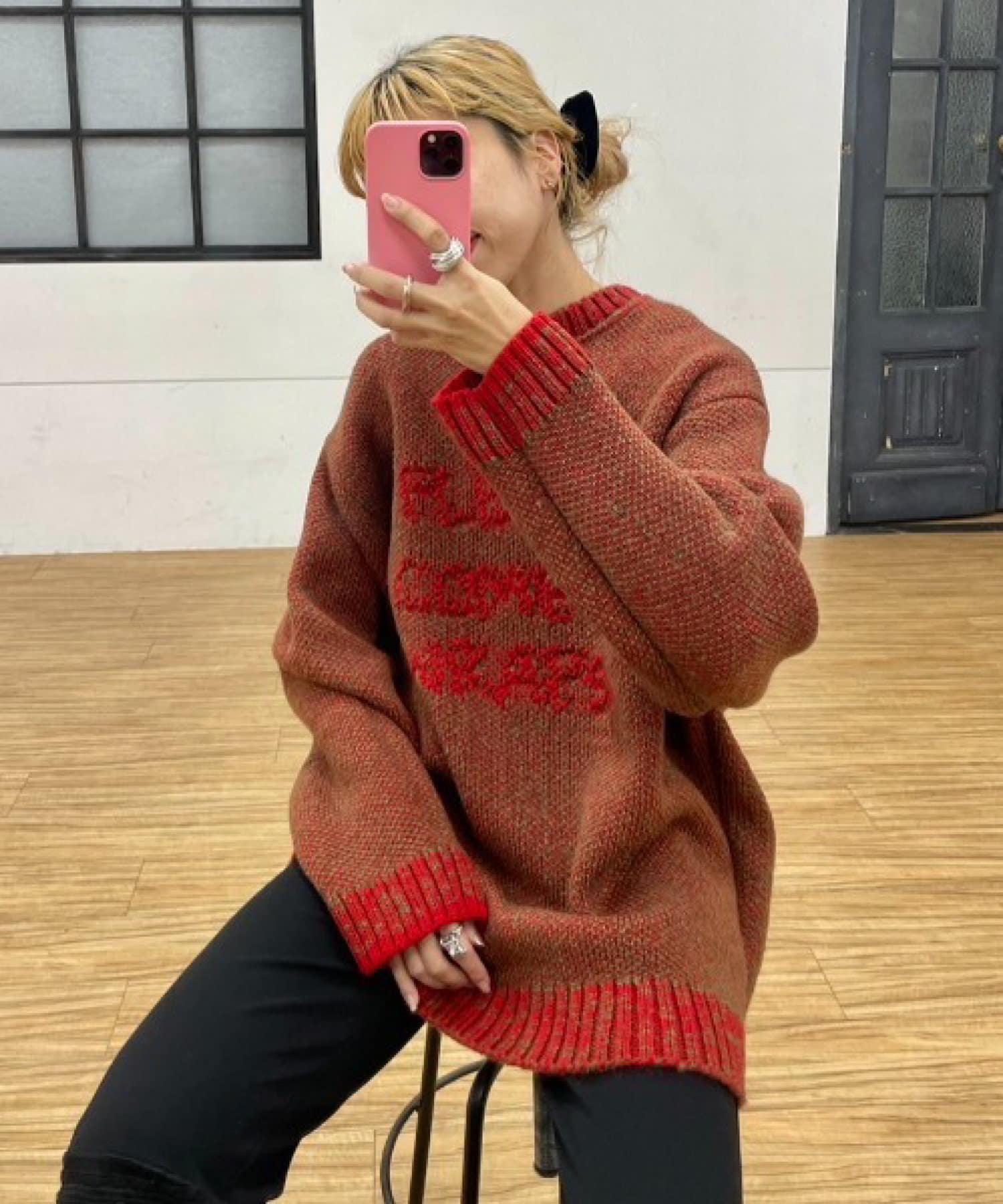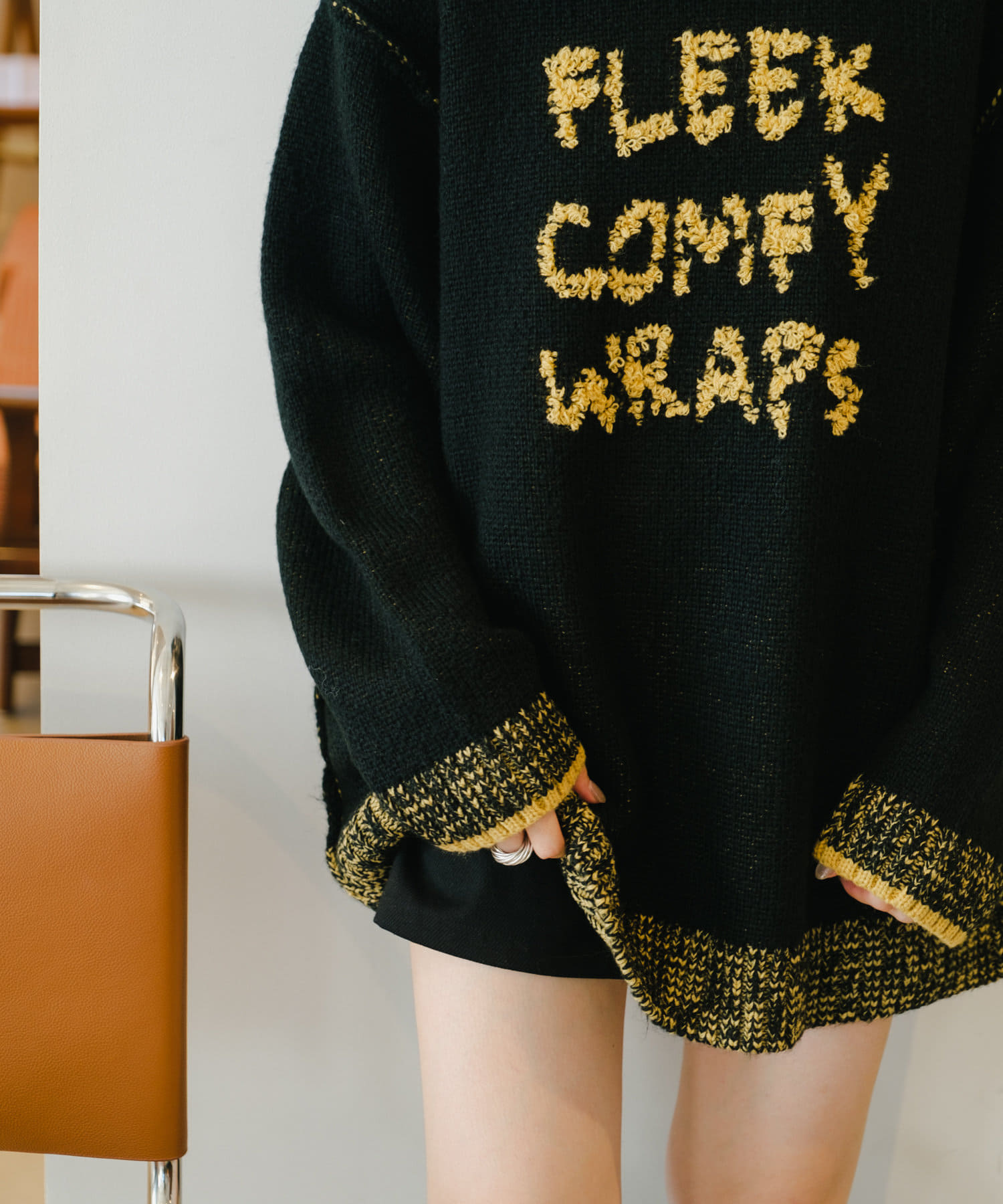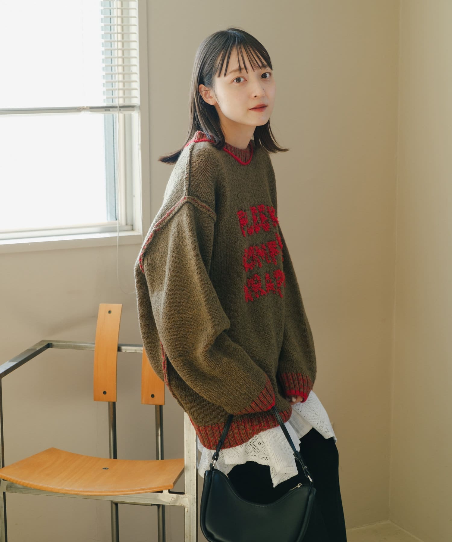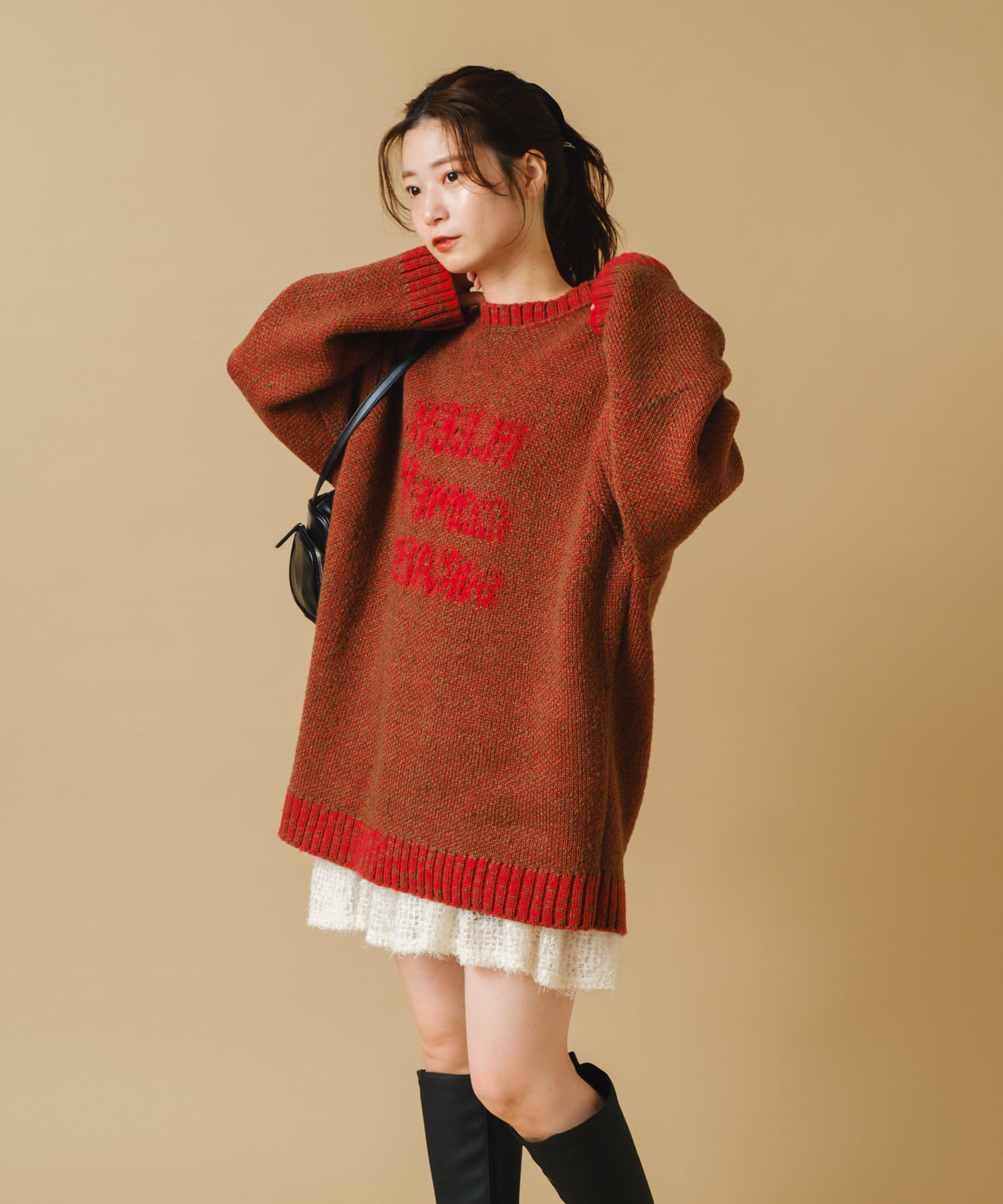 ふわふわとした質感の立体的なロゴが目を惹くニット。