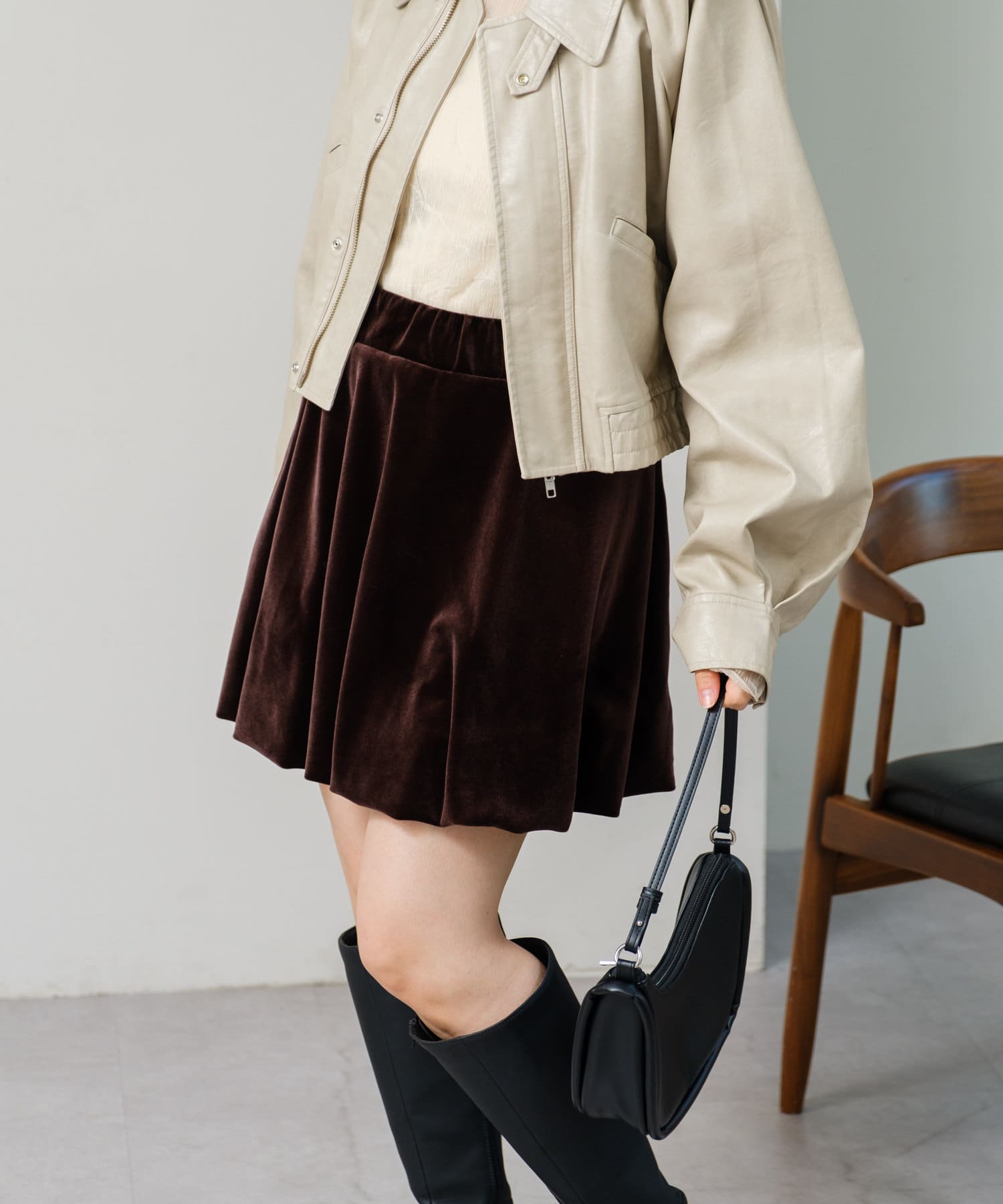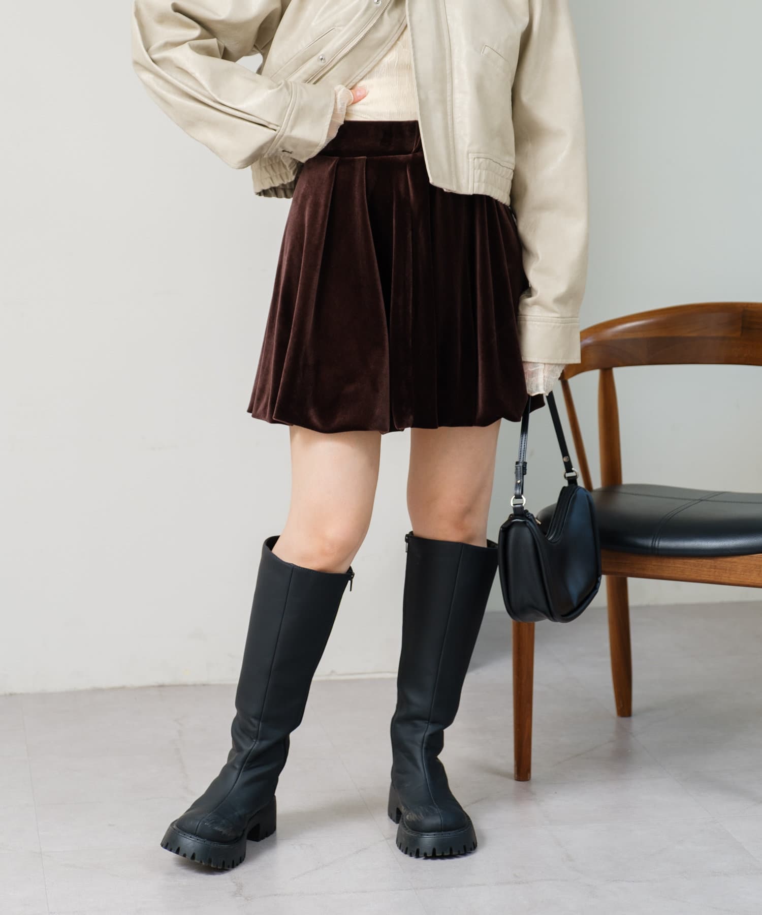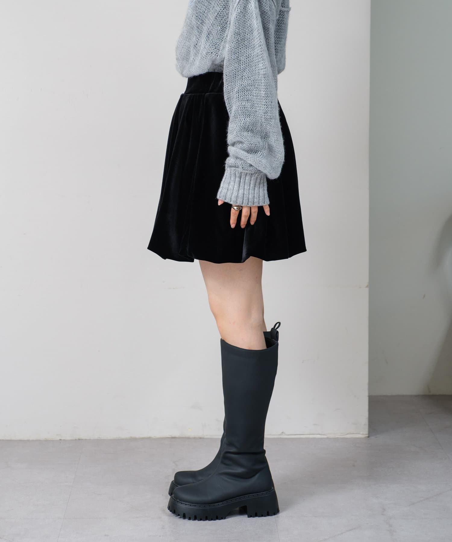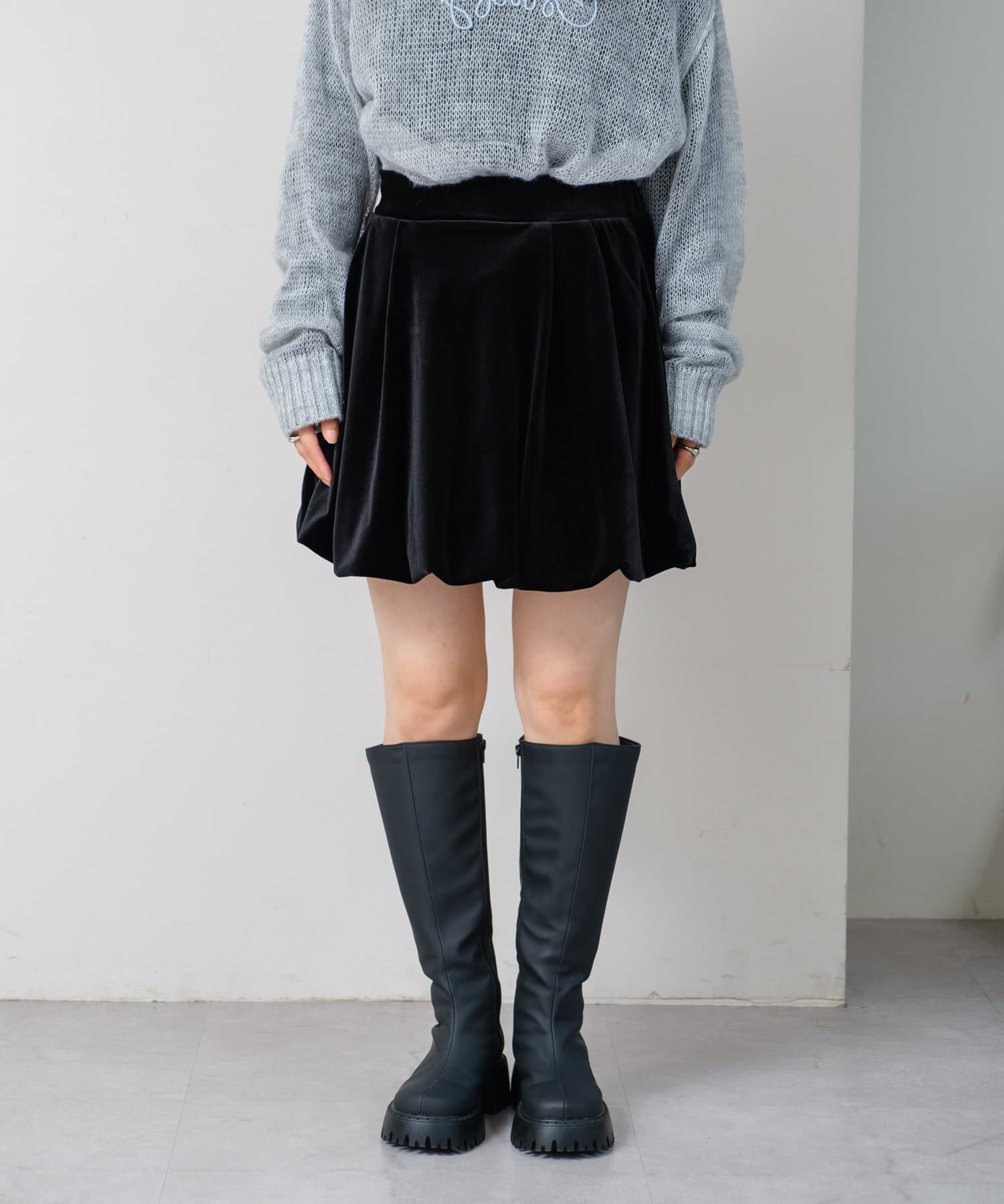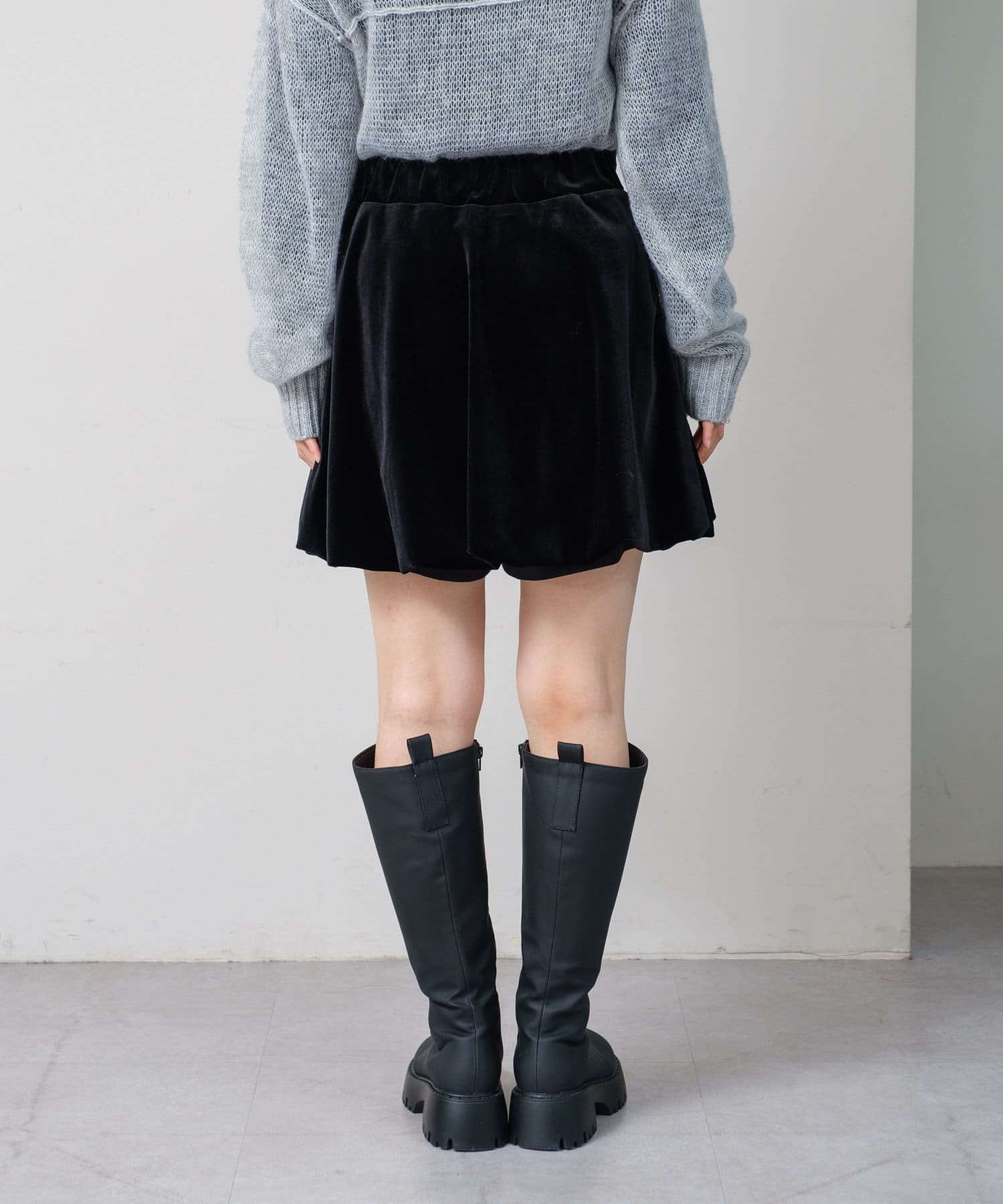 ベロア素材を使用したバルーンシルエットのミニスカート。