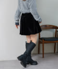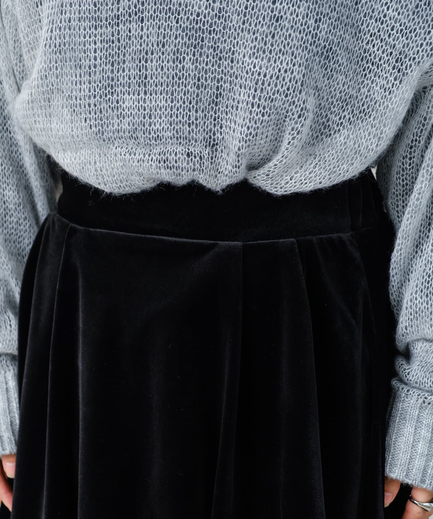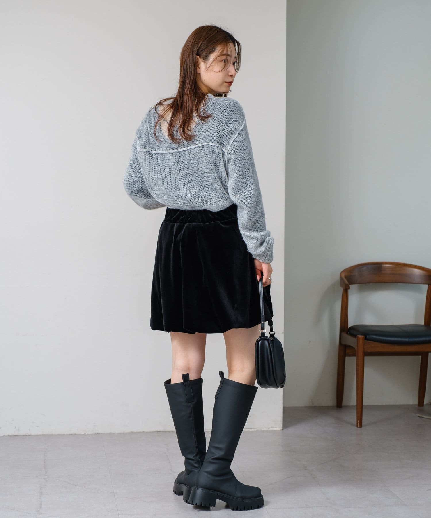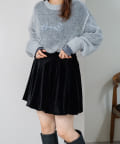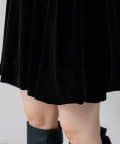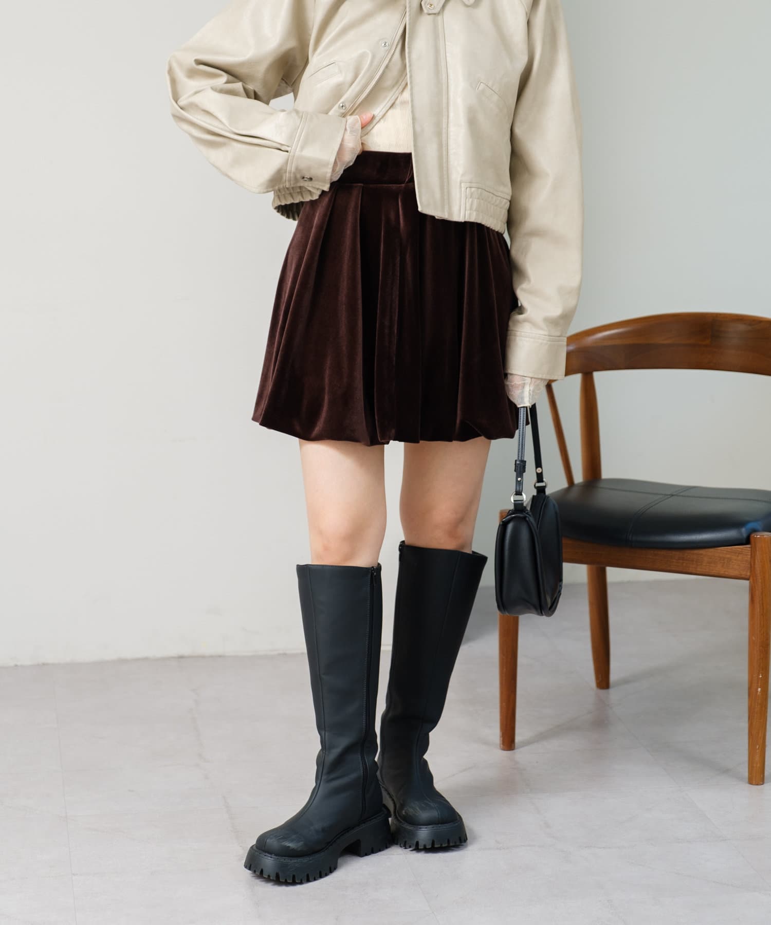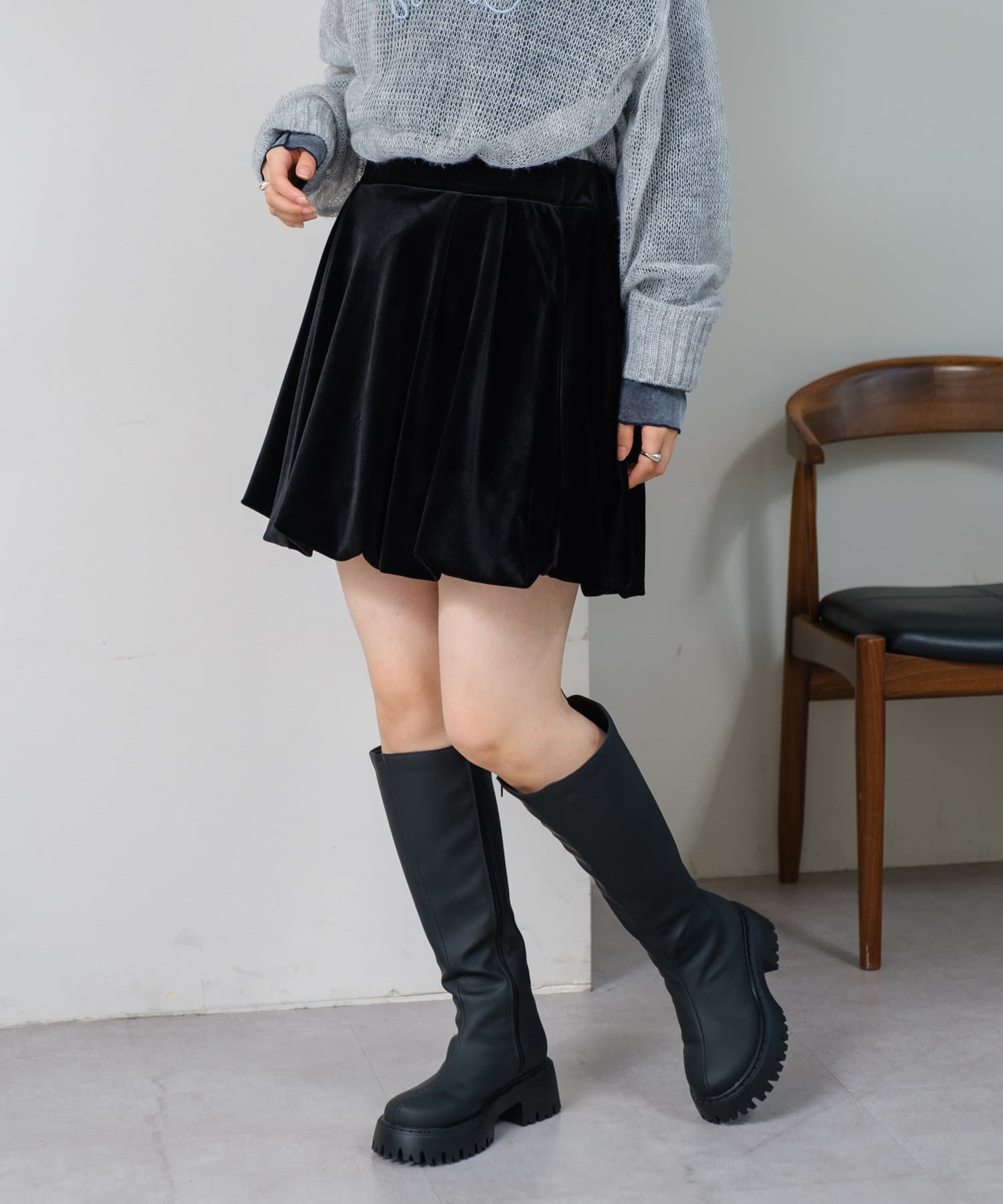 ベロア素材を使用したバルーンシルエットのミニスカート。