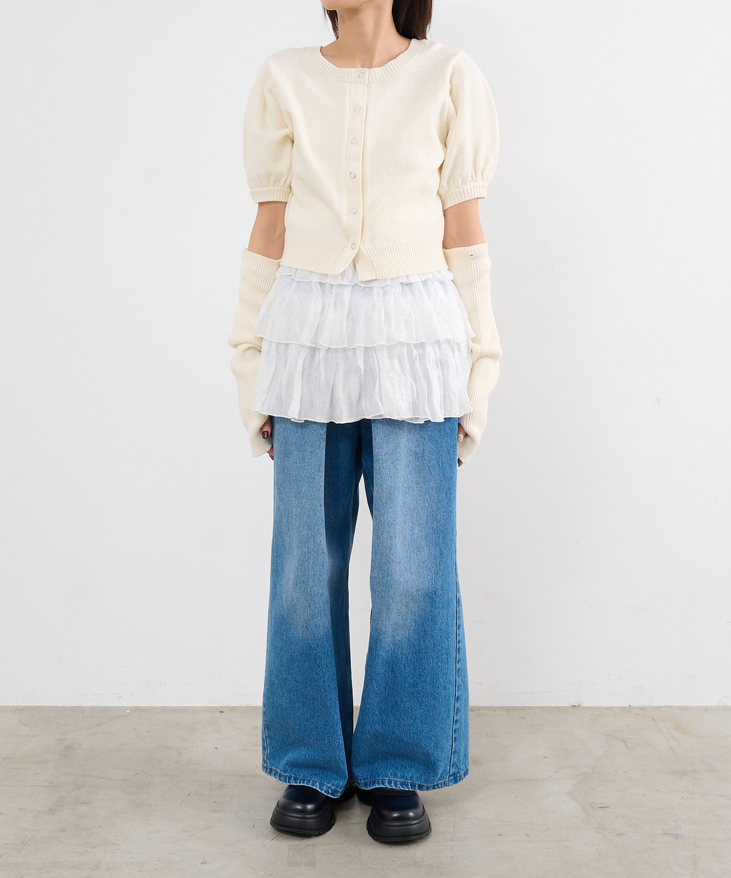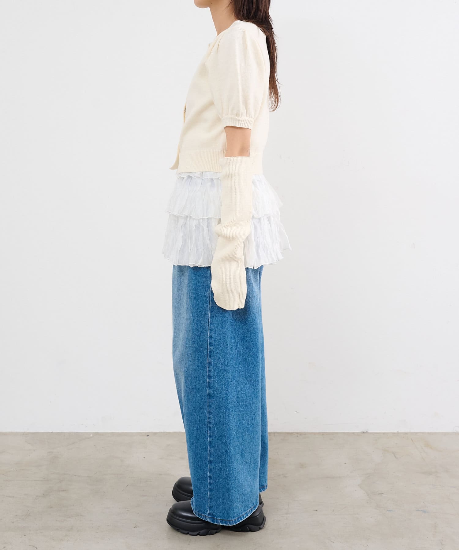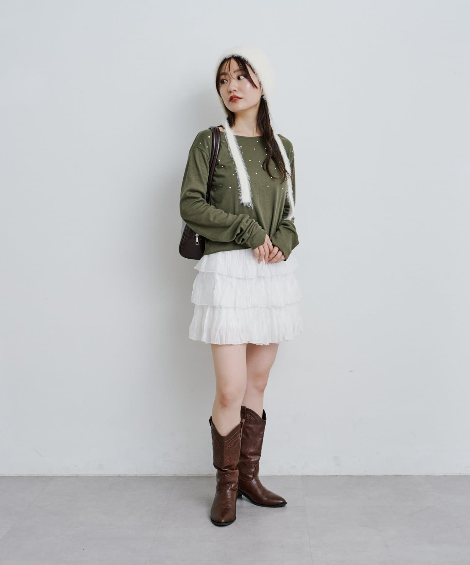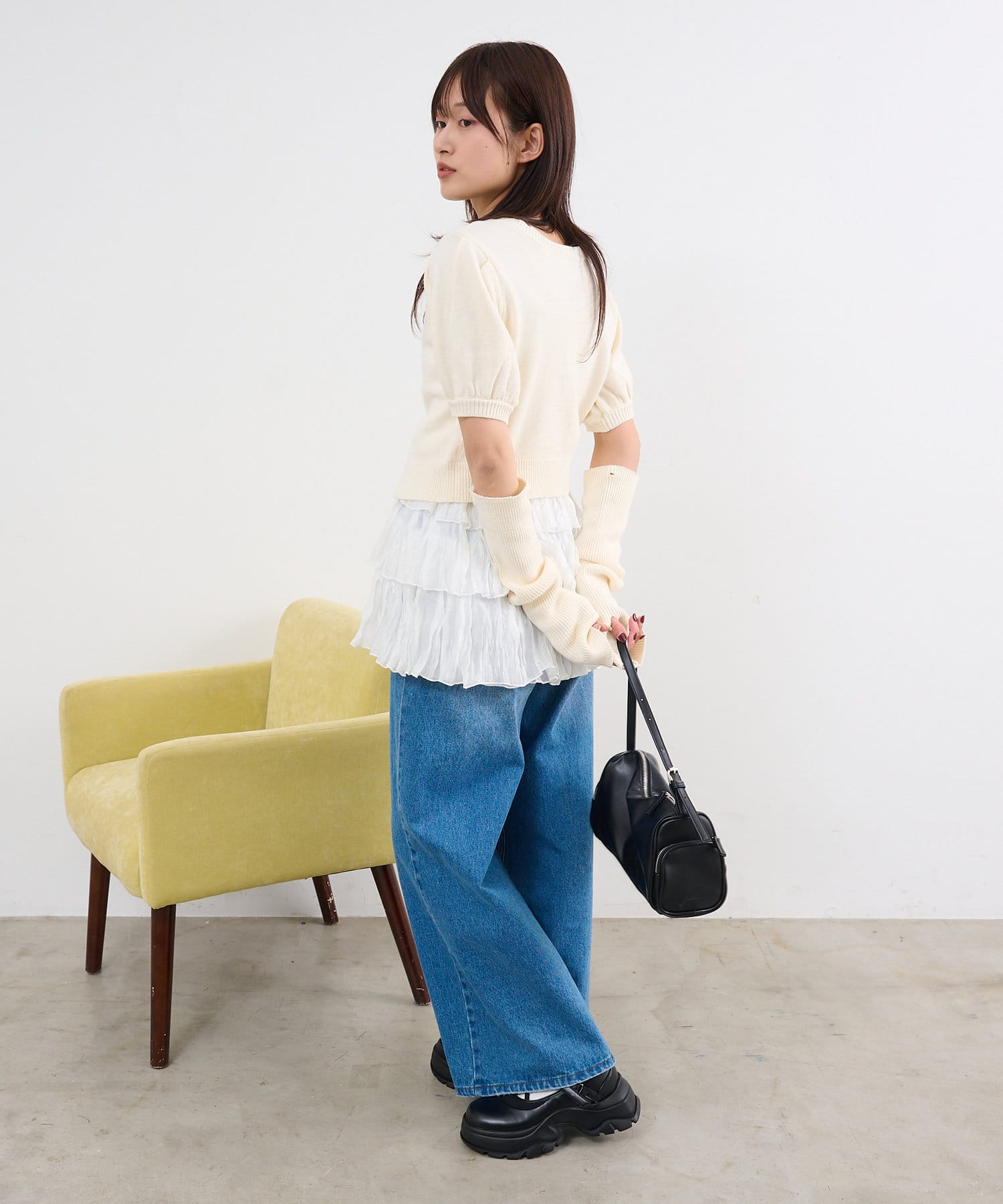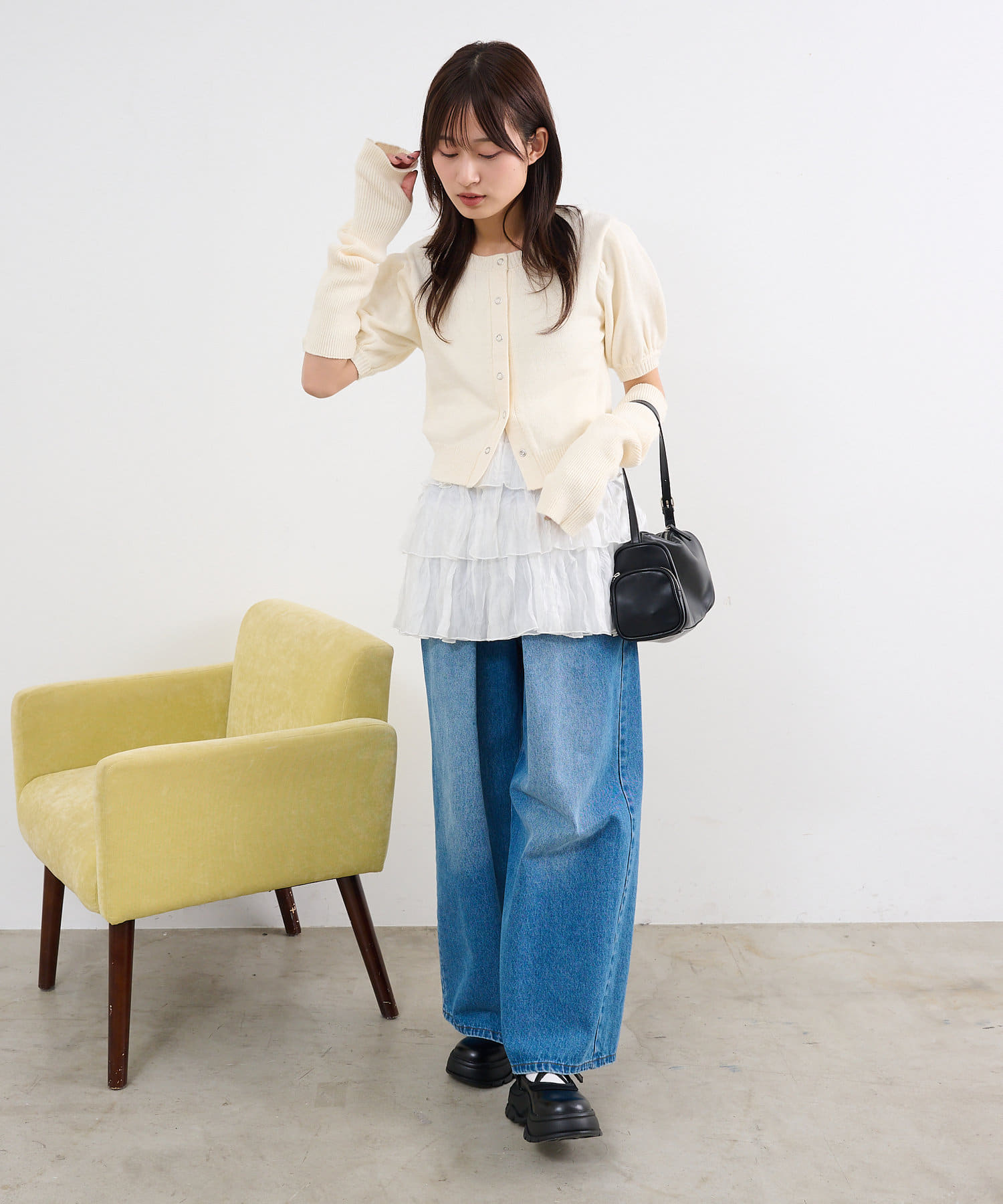 甘めのデザインを活かして、コンパクトなトップスやショート丈のカーディガンと合わせるとバランス良くまとまります。