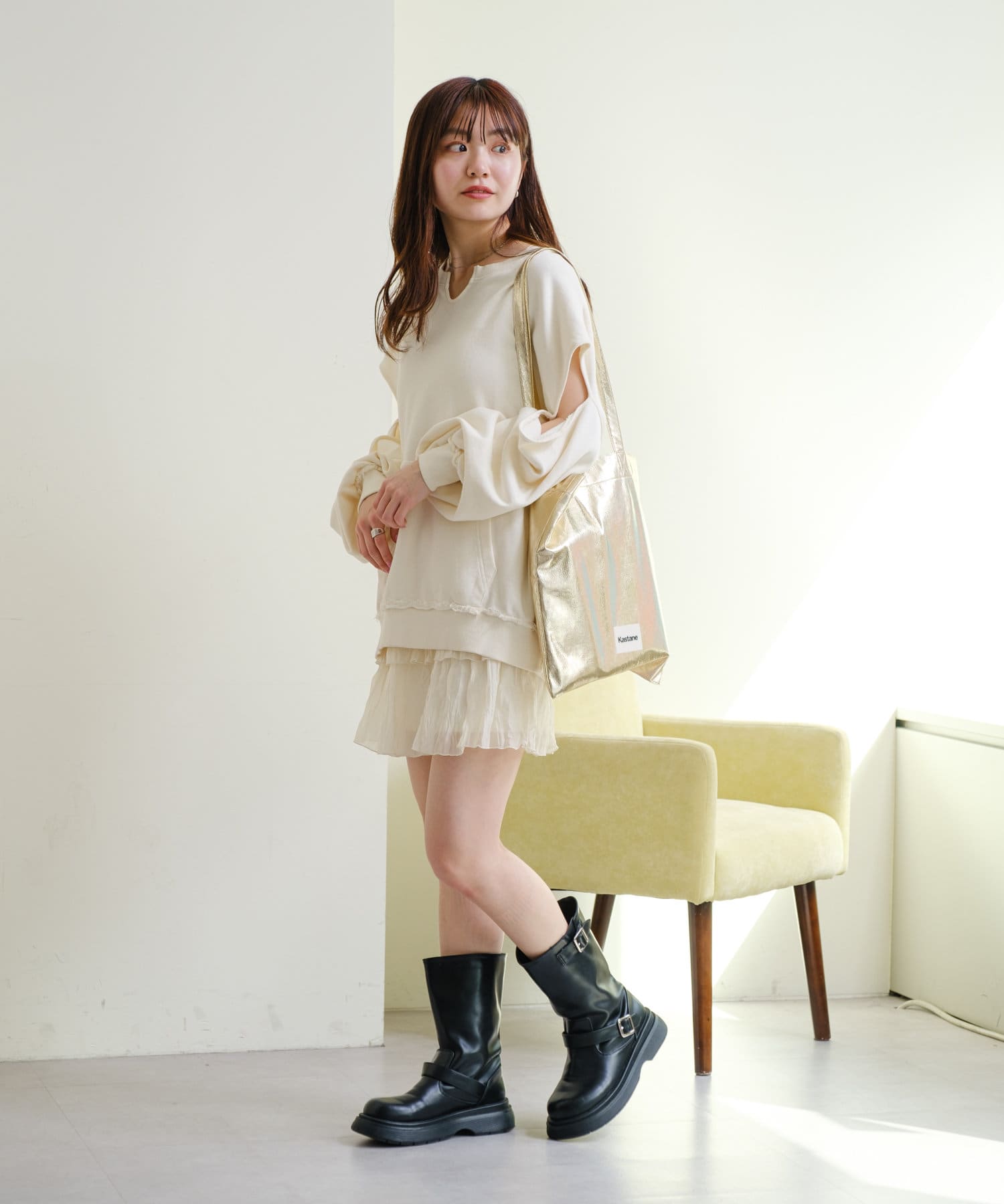 ボリュームのあるブーツをプラスして、甘辛ミックスコーデに仕上げるのもオススメです◎