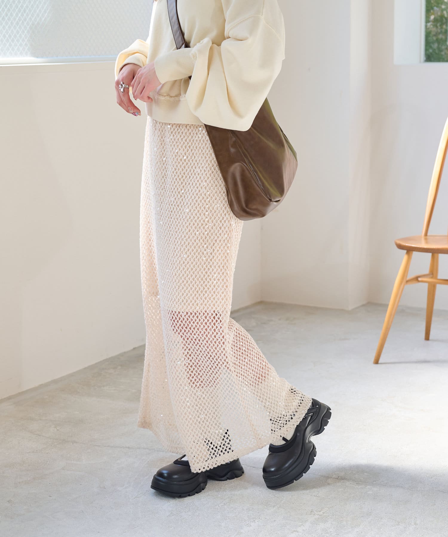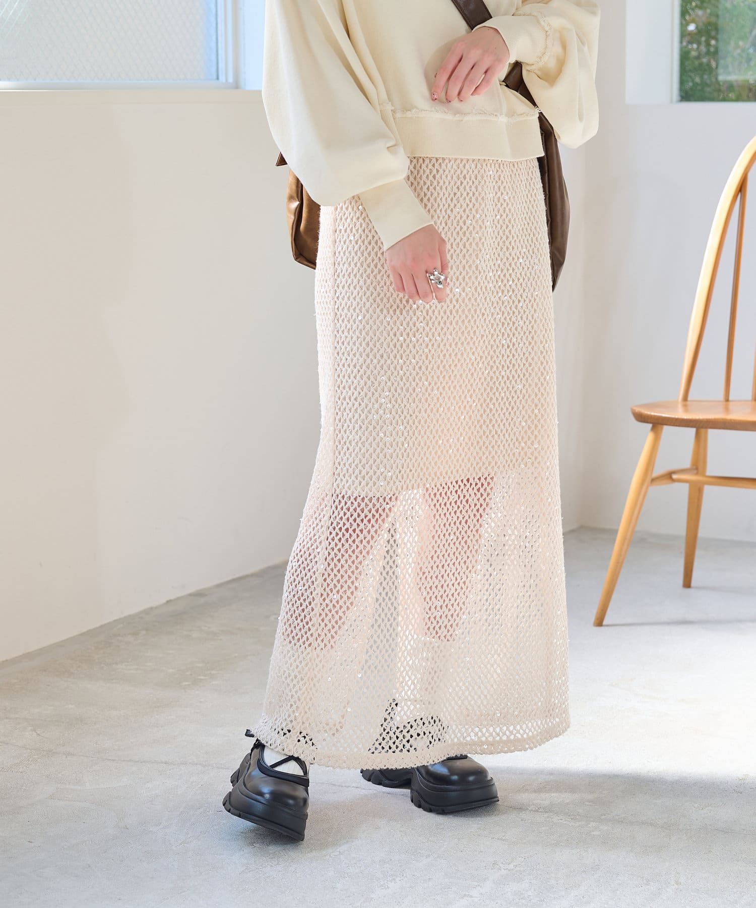 繊細なスパンコールが上品なきらめきを放つロングスカート。