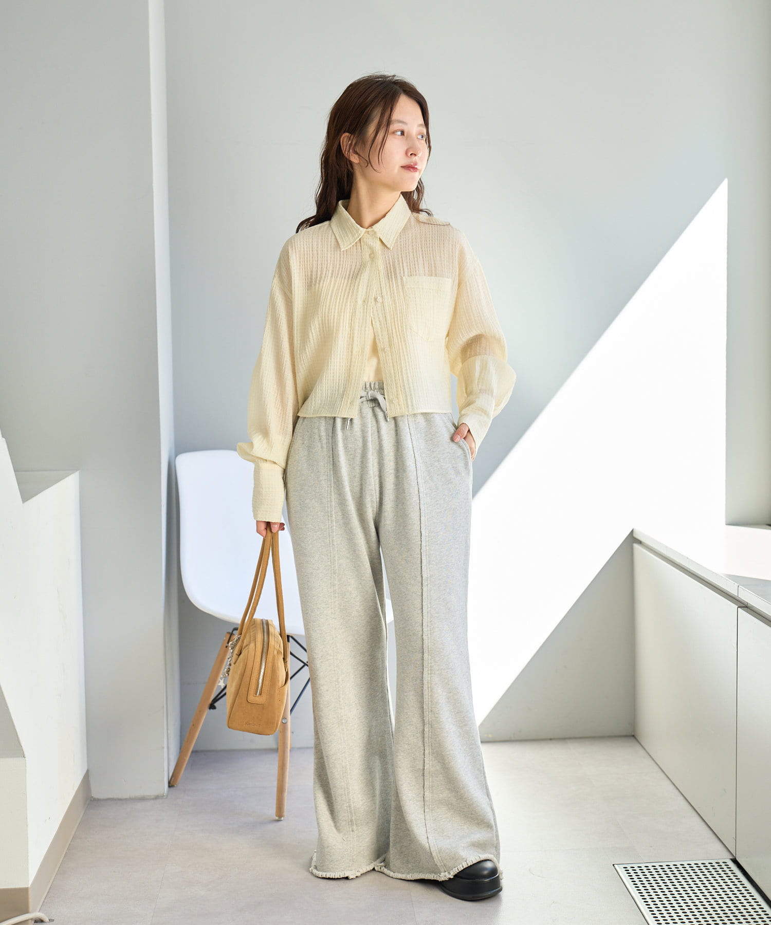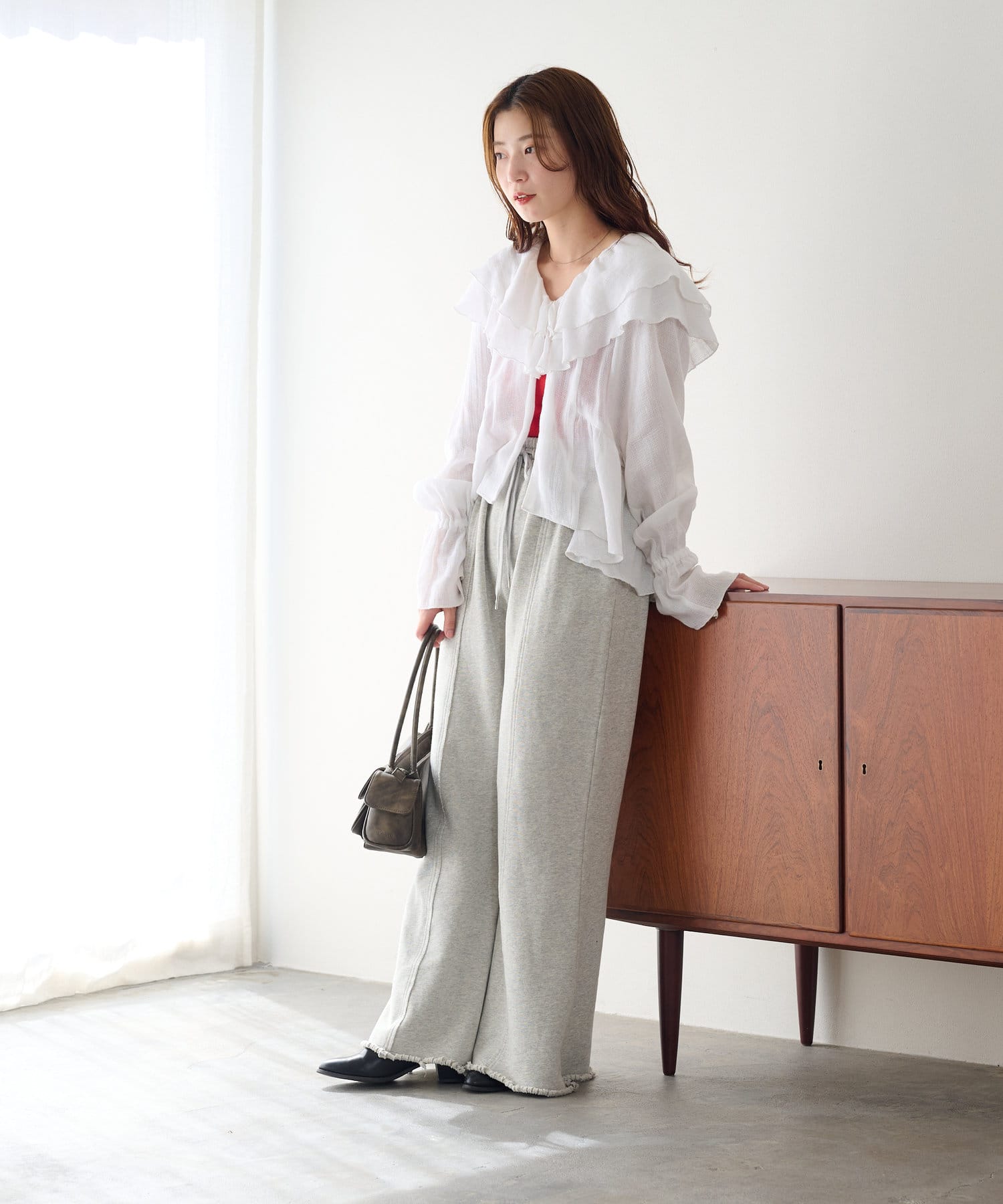 裾には切りっぱなしのフリンジディテールが施されており、こなれ感のあるカジュアルな雰囲気を演出。