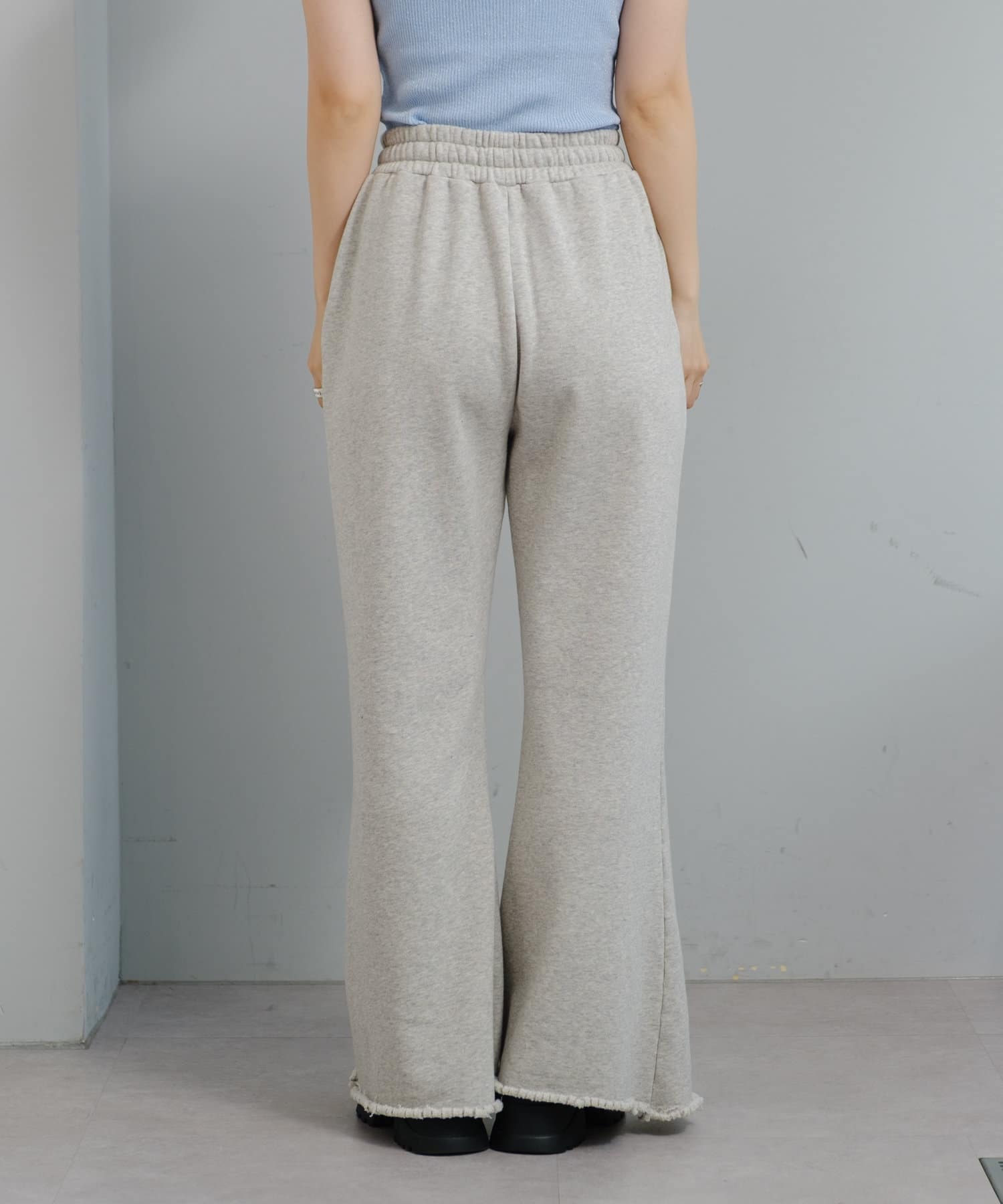 全体的にストレートに落ちるシルエットながら、裾に向かって広がるフレアデザインが特徴で脚長効果が期待できます。