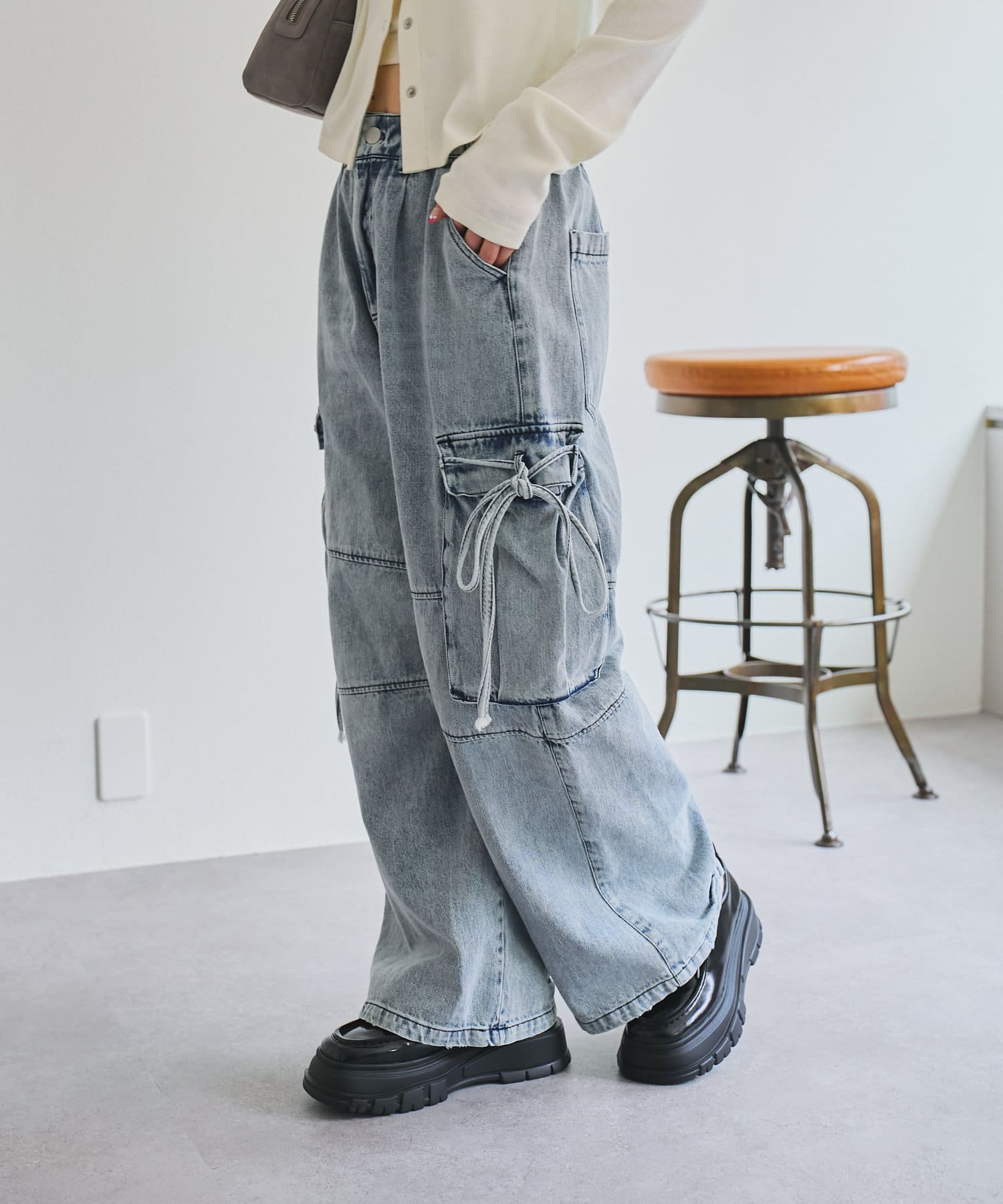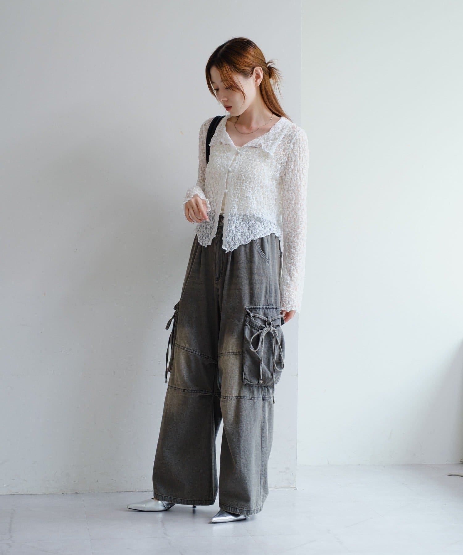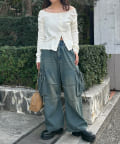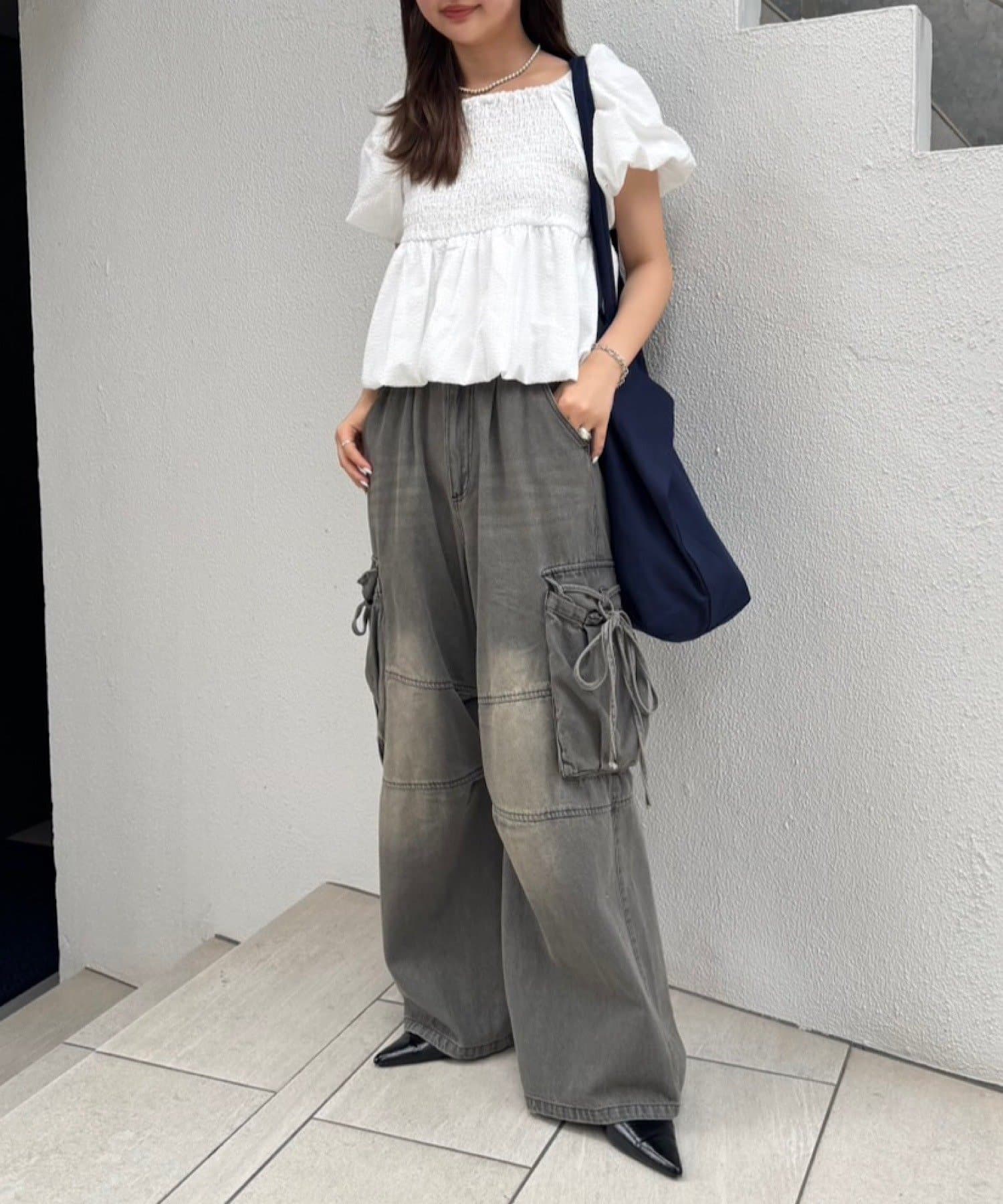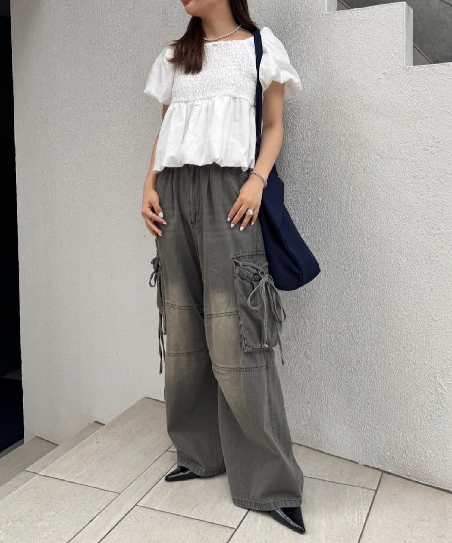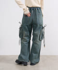 カーゴデザインでメンズライクなアイテムながら、ポケット部分にはリボン付きで可愛らしさも兼ね備えたデザインです。