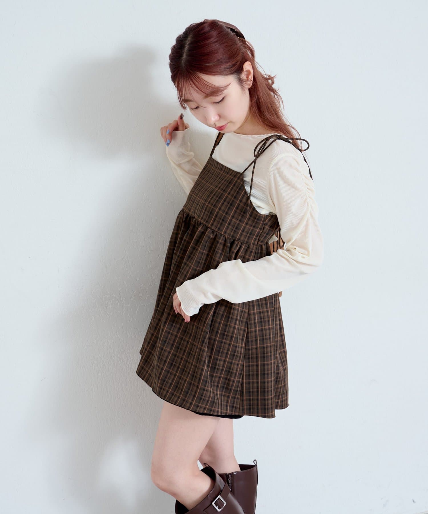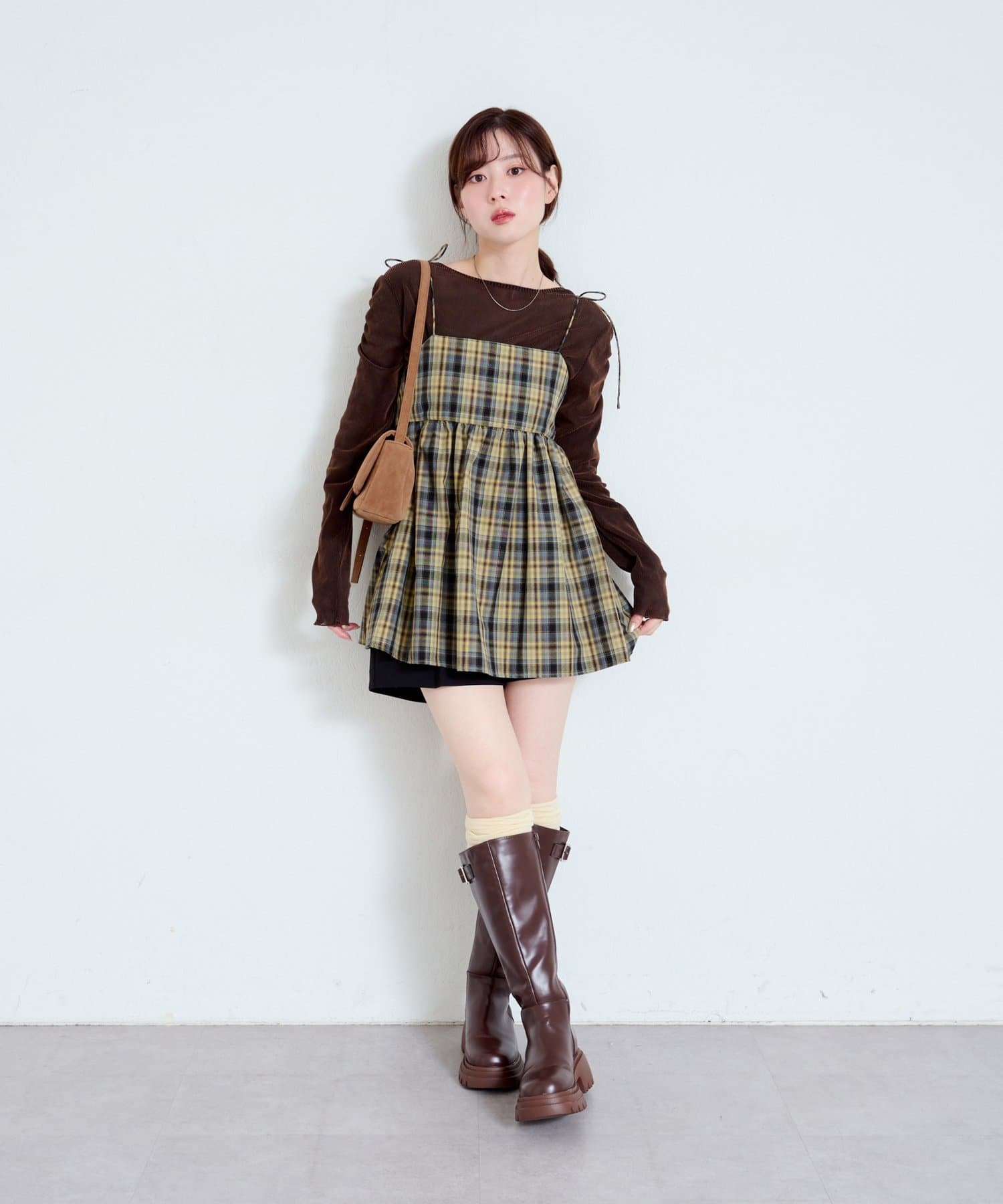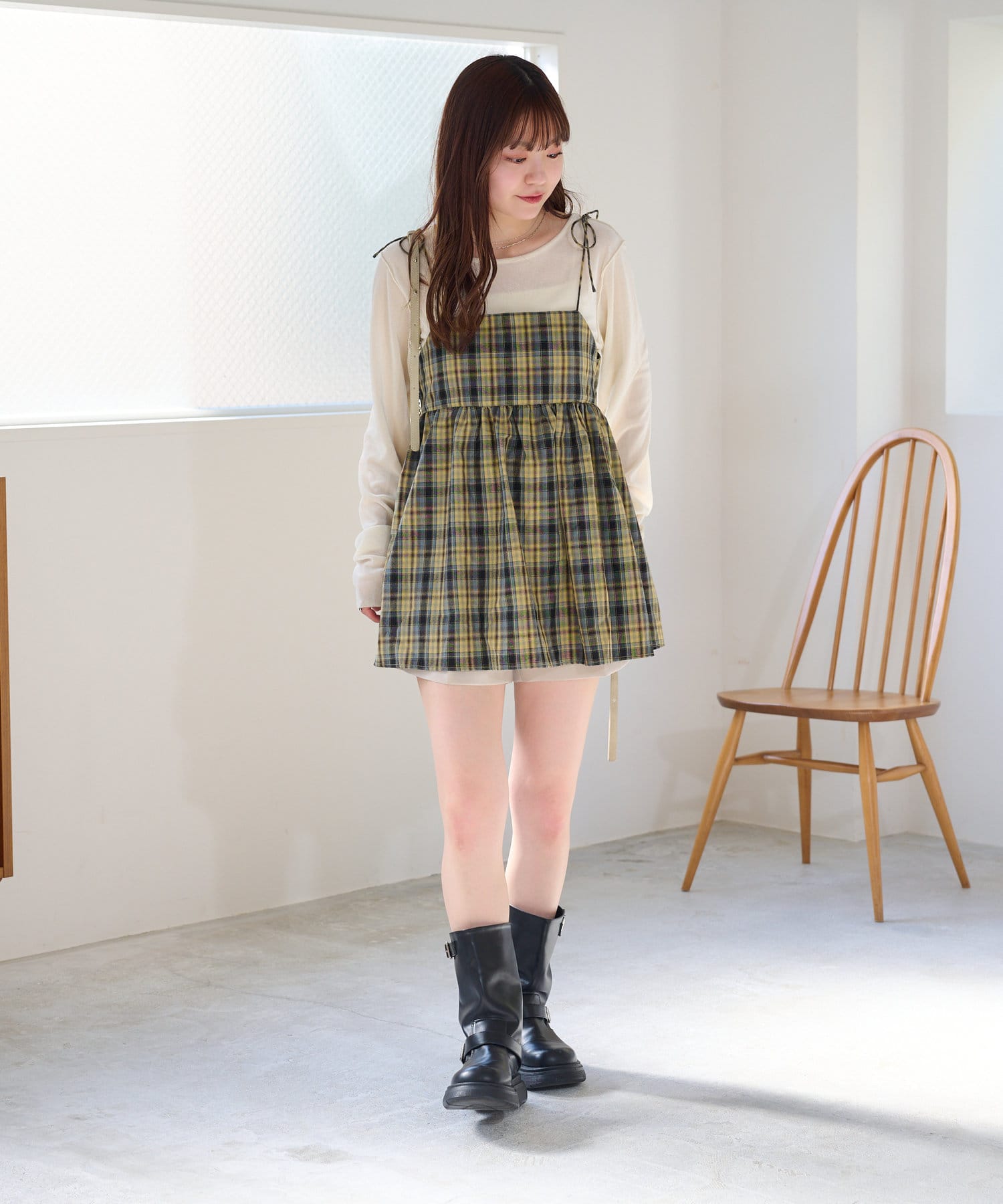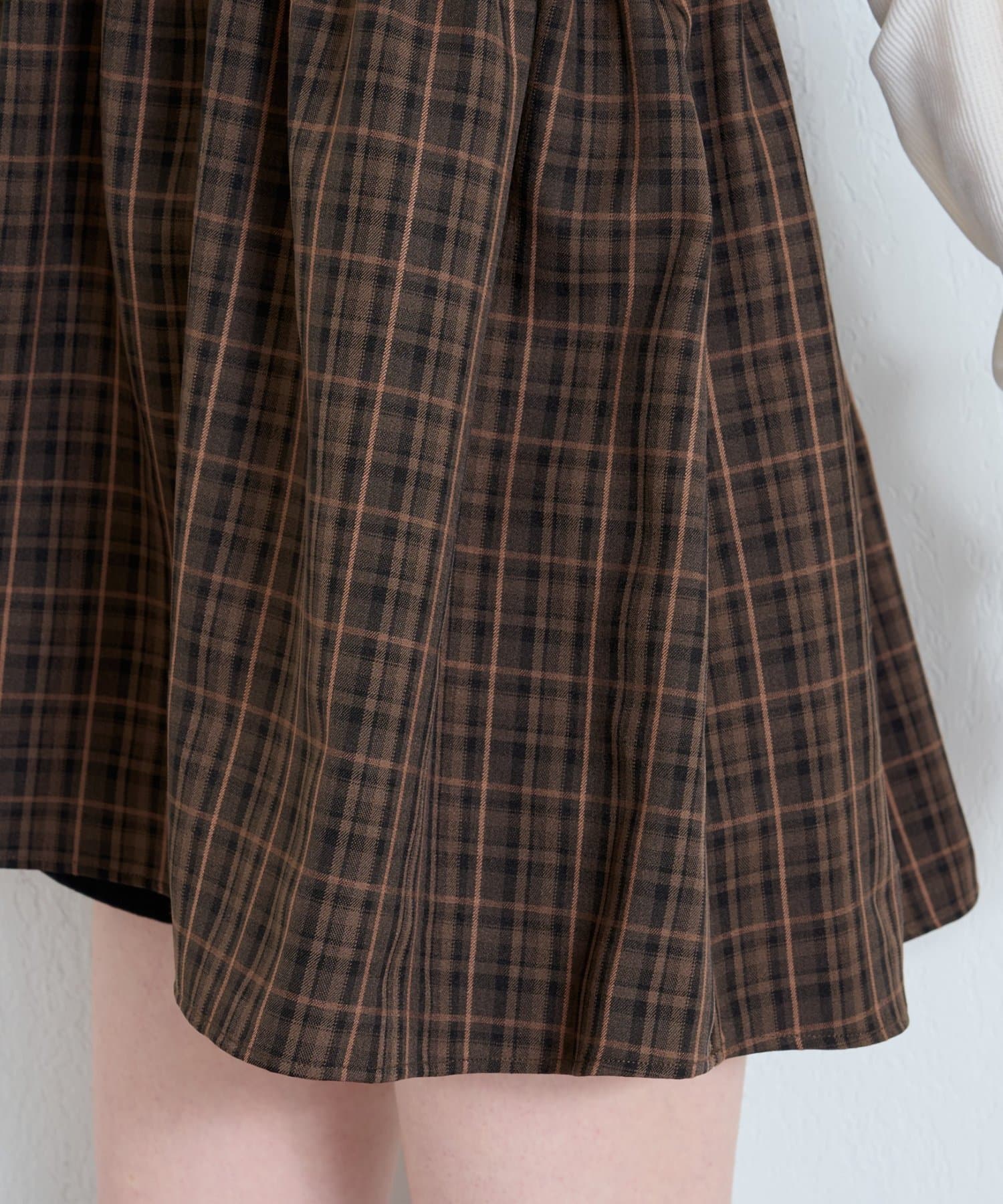 購入場所:店舗チェックが秋らしさをすごく強調してくれてかわいい。キャミビスチェだから何にでも合わせやすいです。