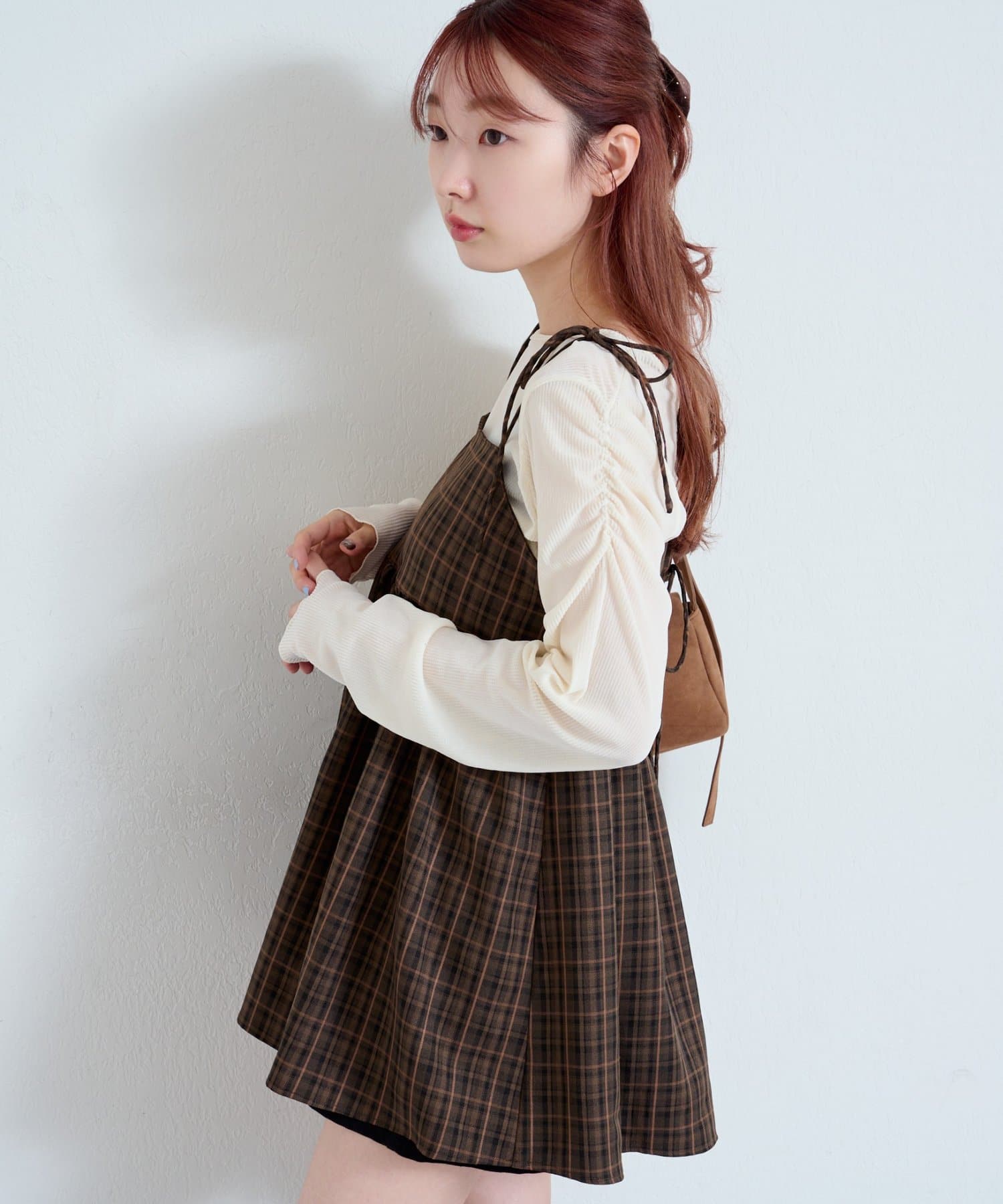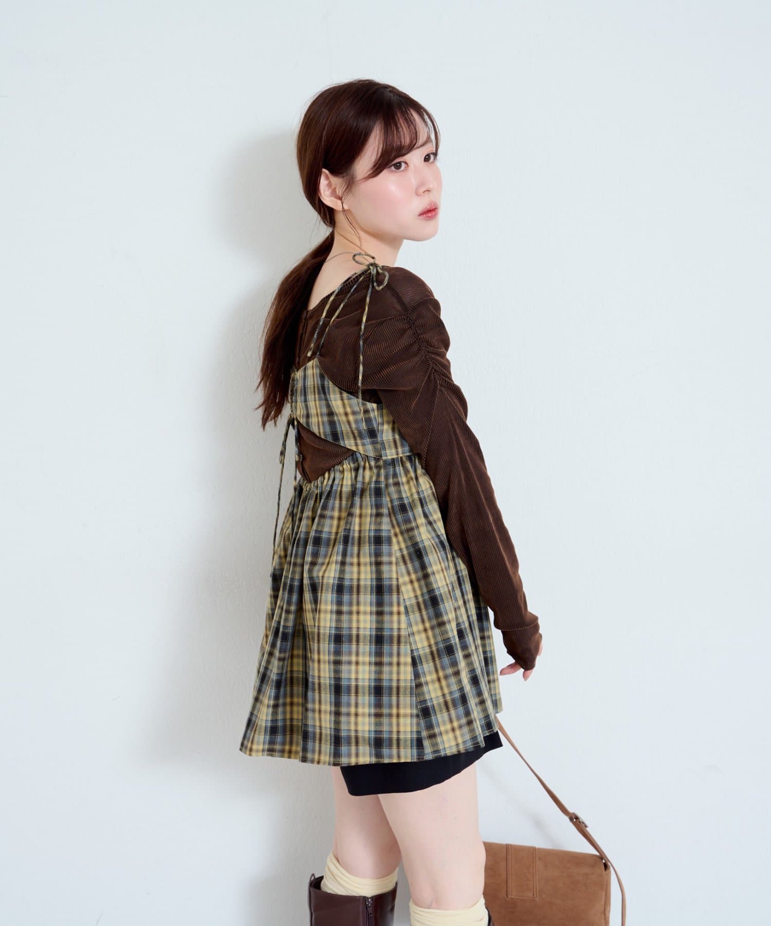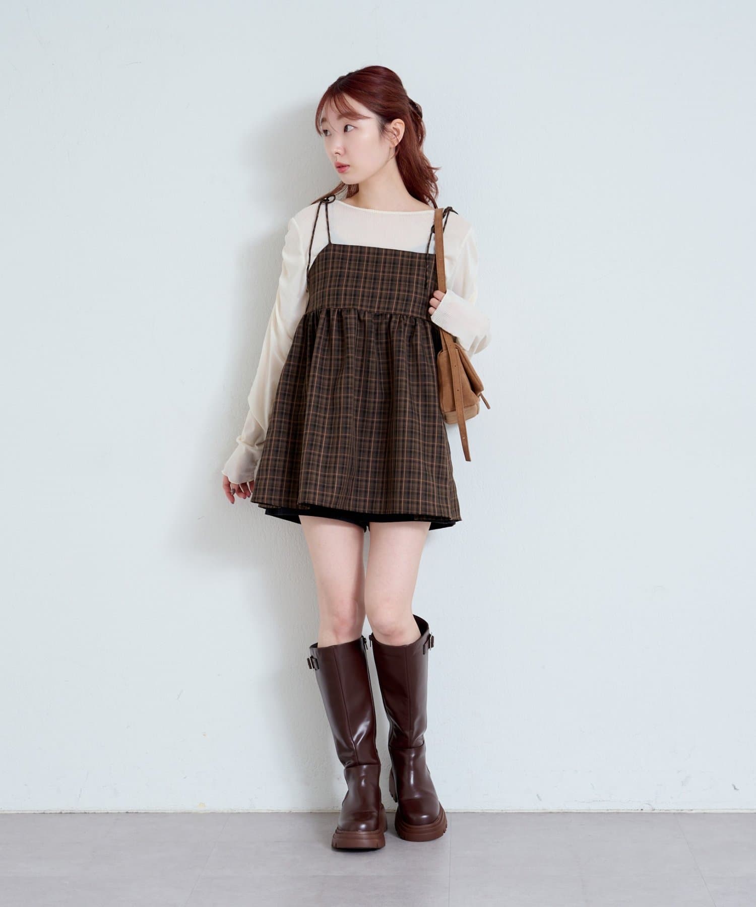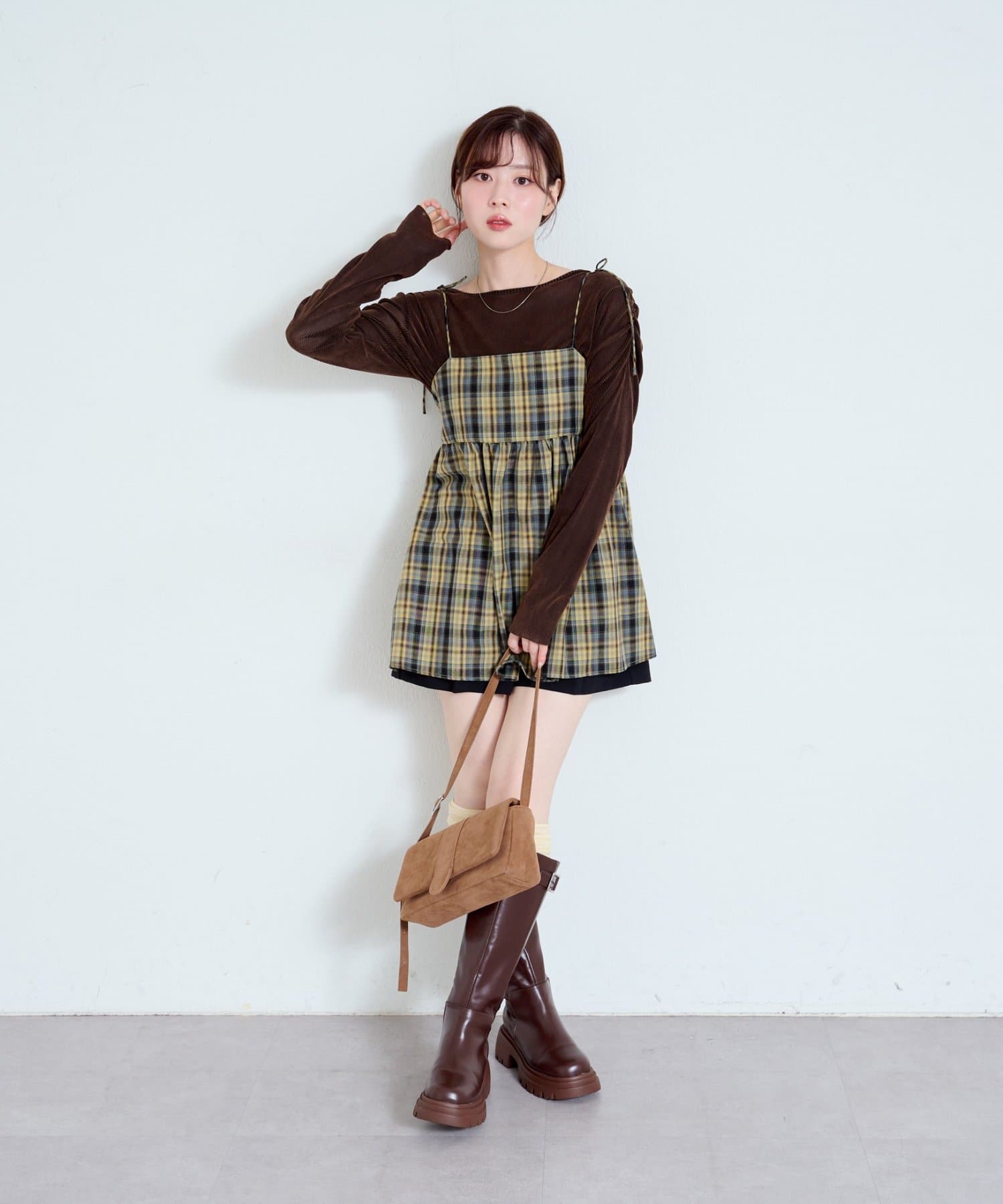 購入場所:店舗チェックが秋らしさをすごく強調してくれてかわいい。キャミビスチェだから何にでも合わせやすいです。