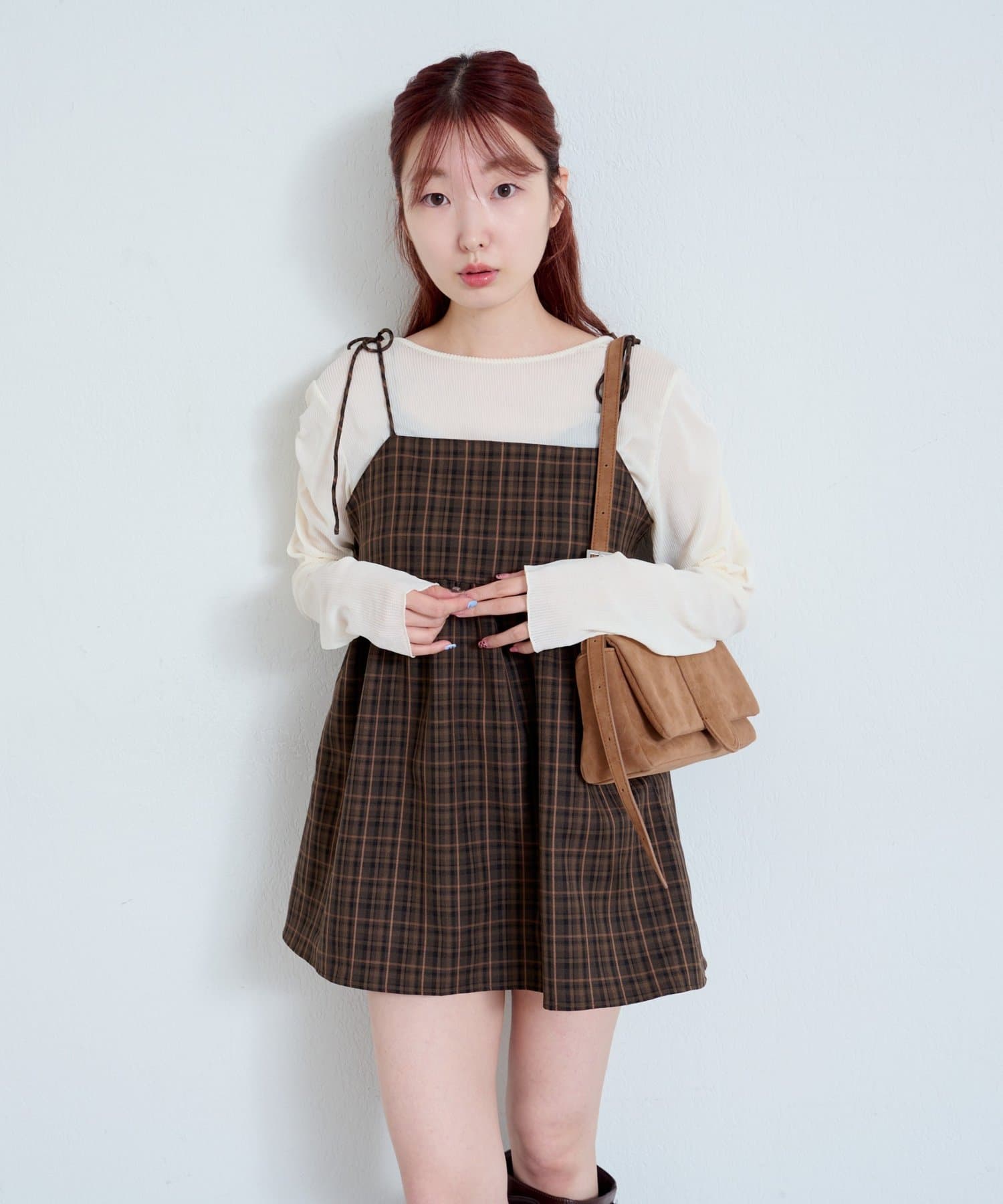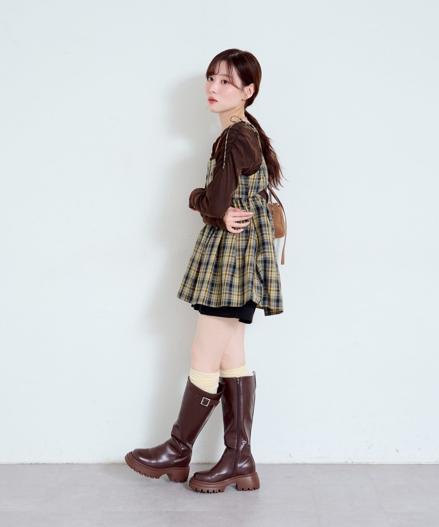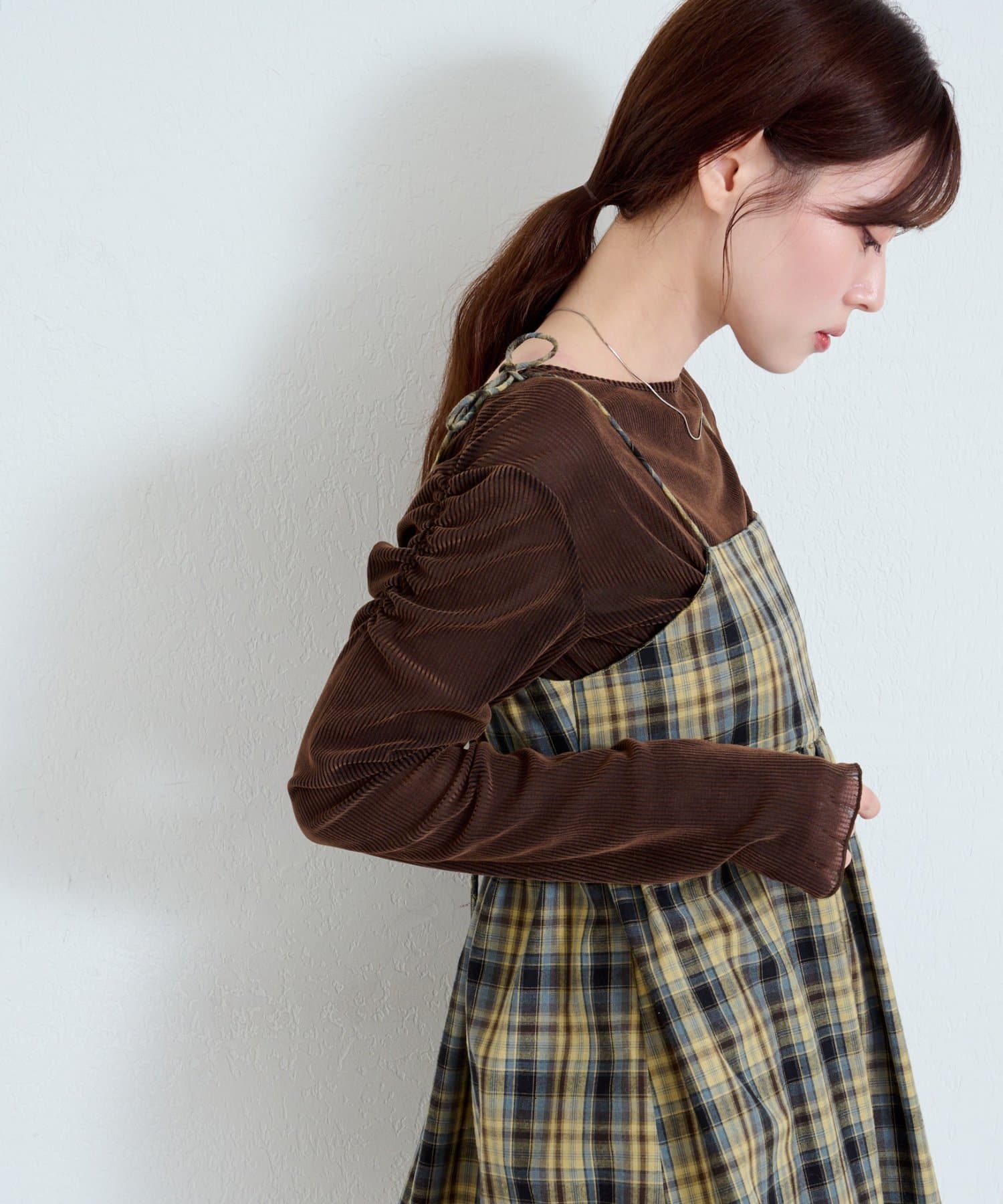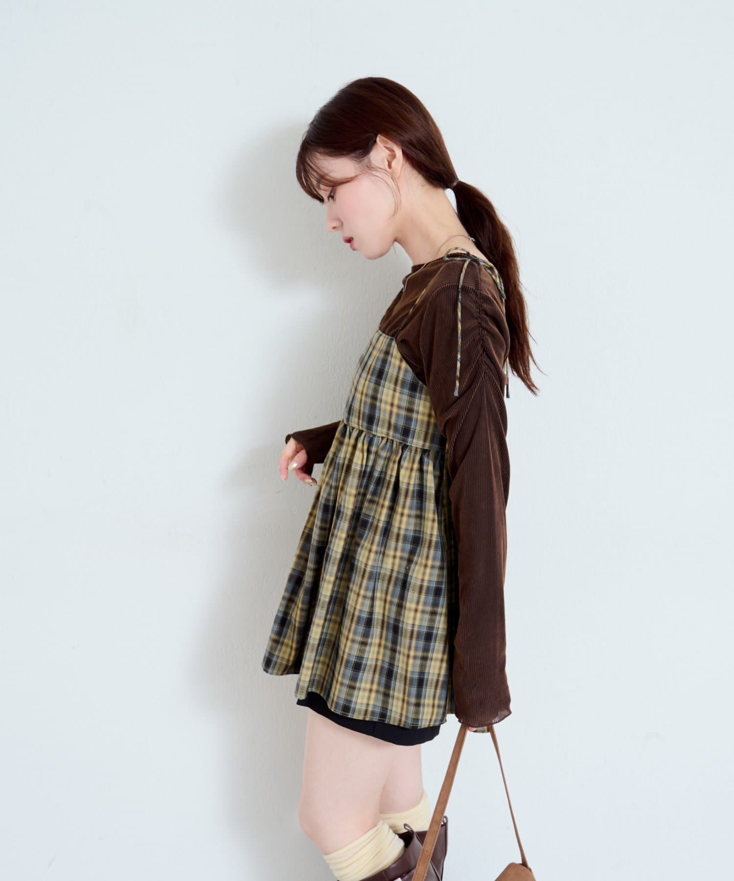 購入場所:店舗チェックが秋らしさをすごく強調してくれてかわいい。キャミビスチェだから何にでも合わせやすいです。
