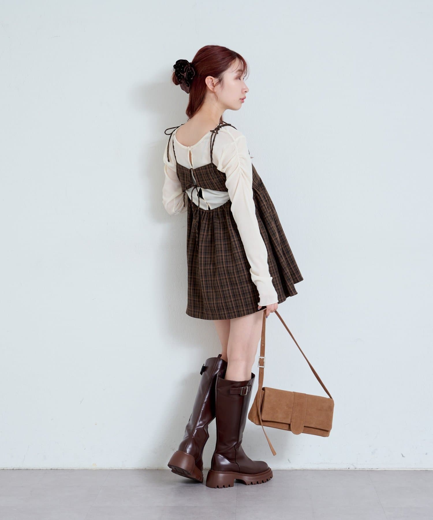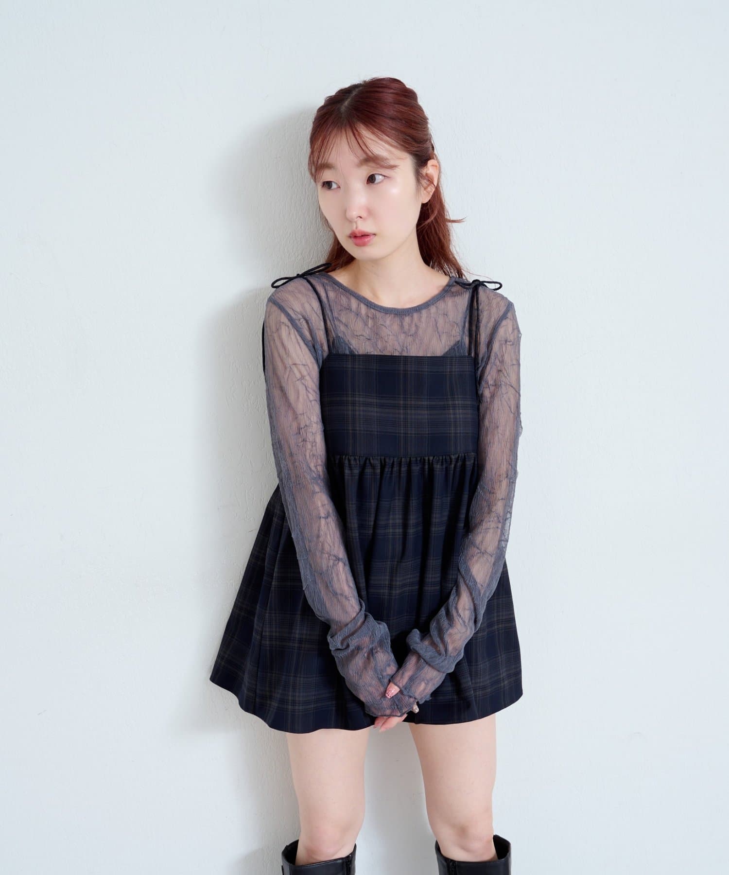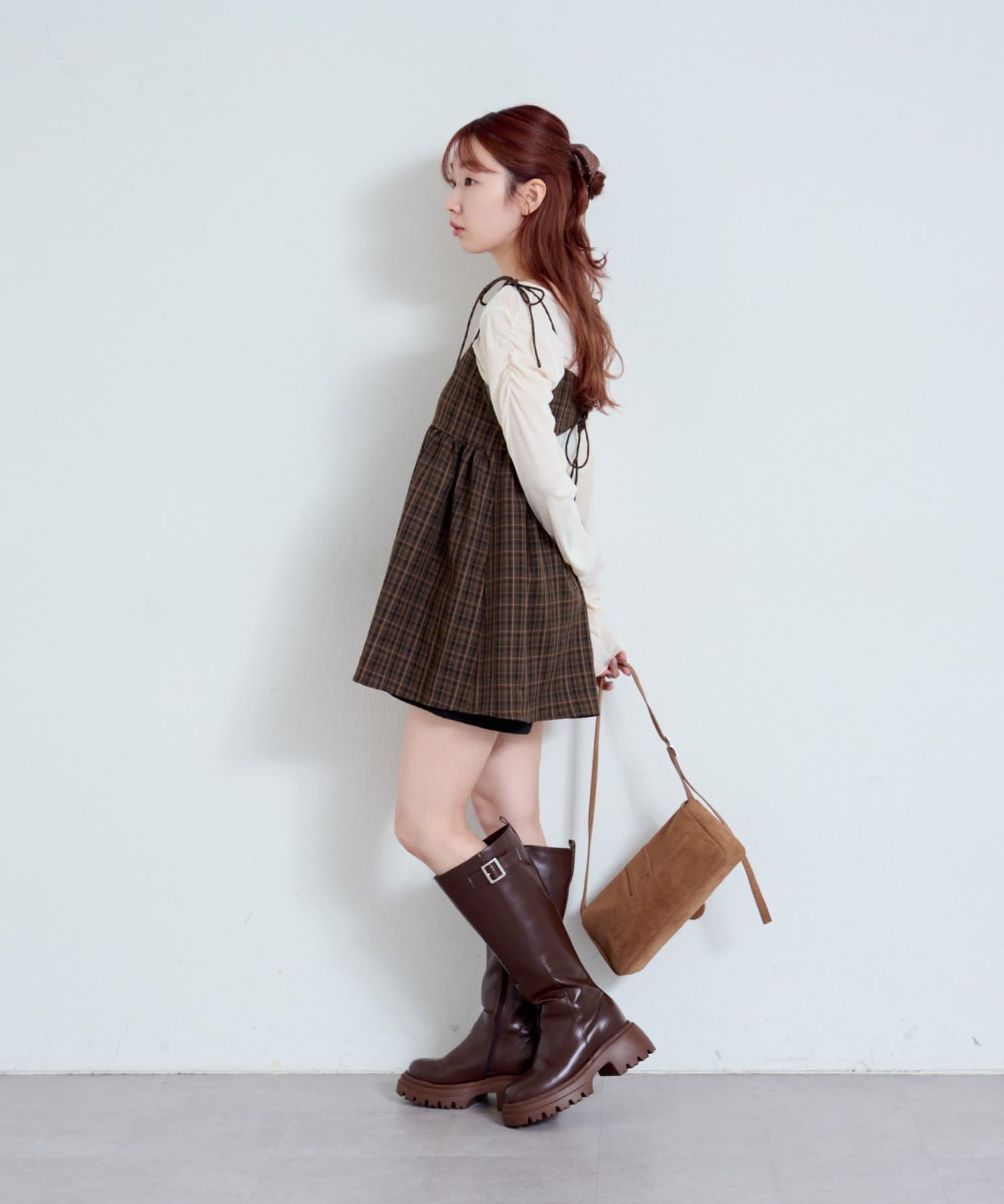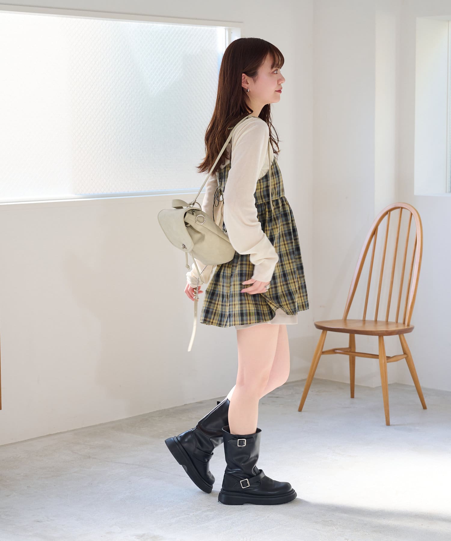 購入場所:店舗チェックが秋らしさをすごく強調してくれてかわいい。キャミビスチェだから何にでも合わせやすいです。
