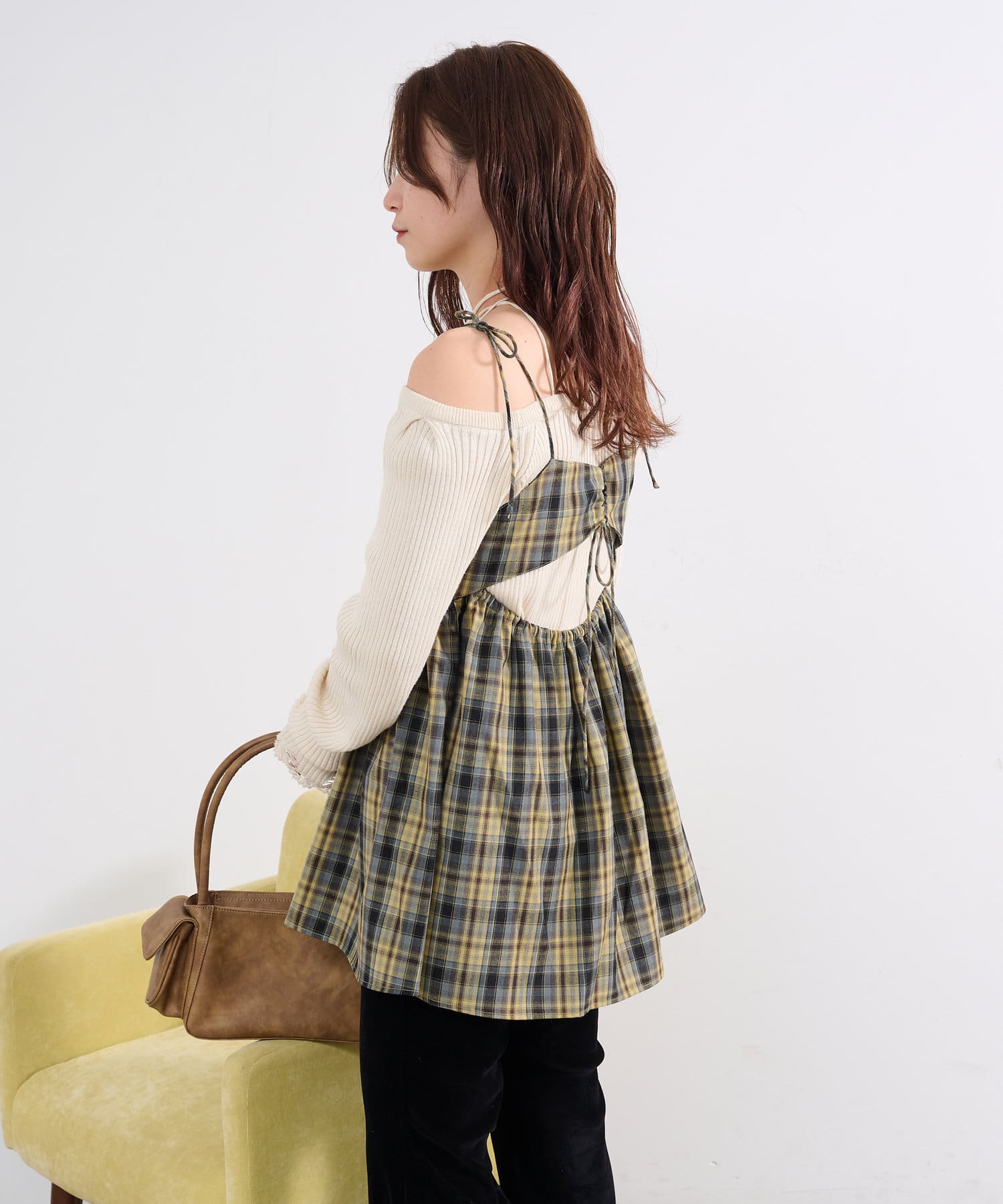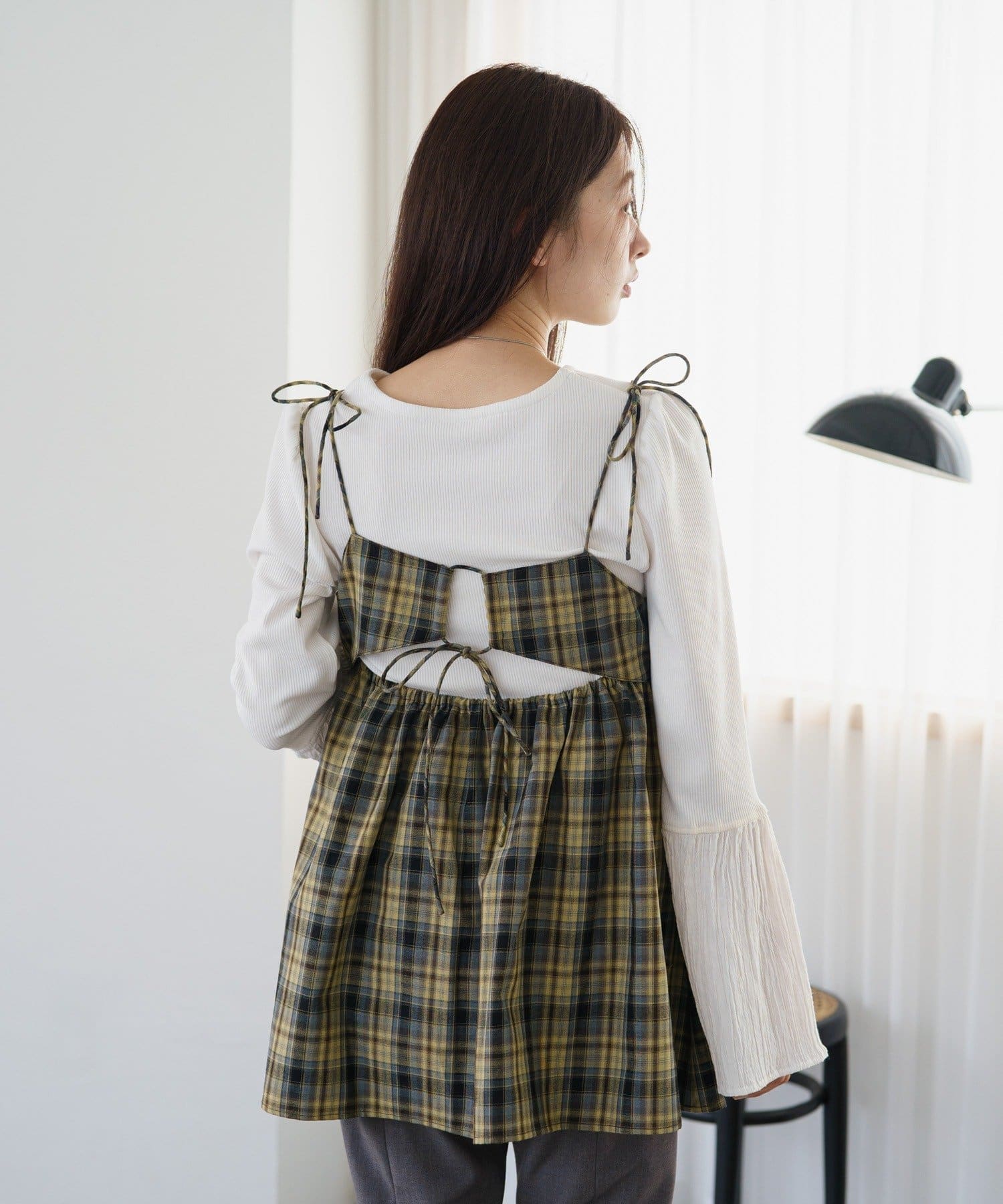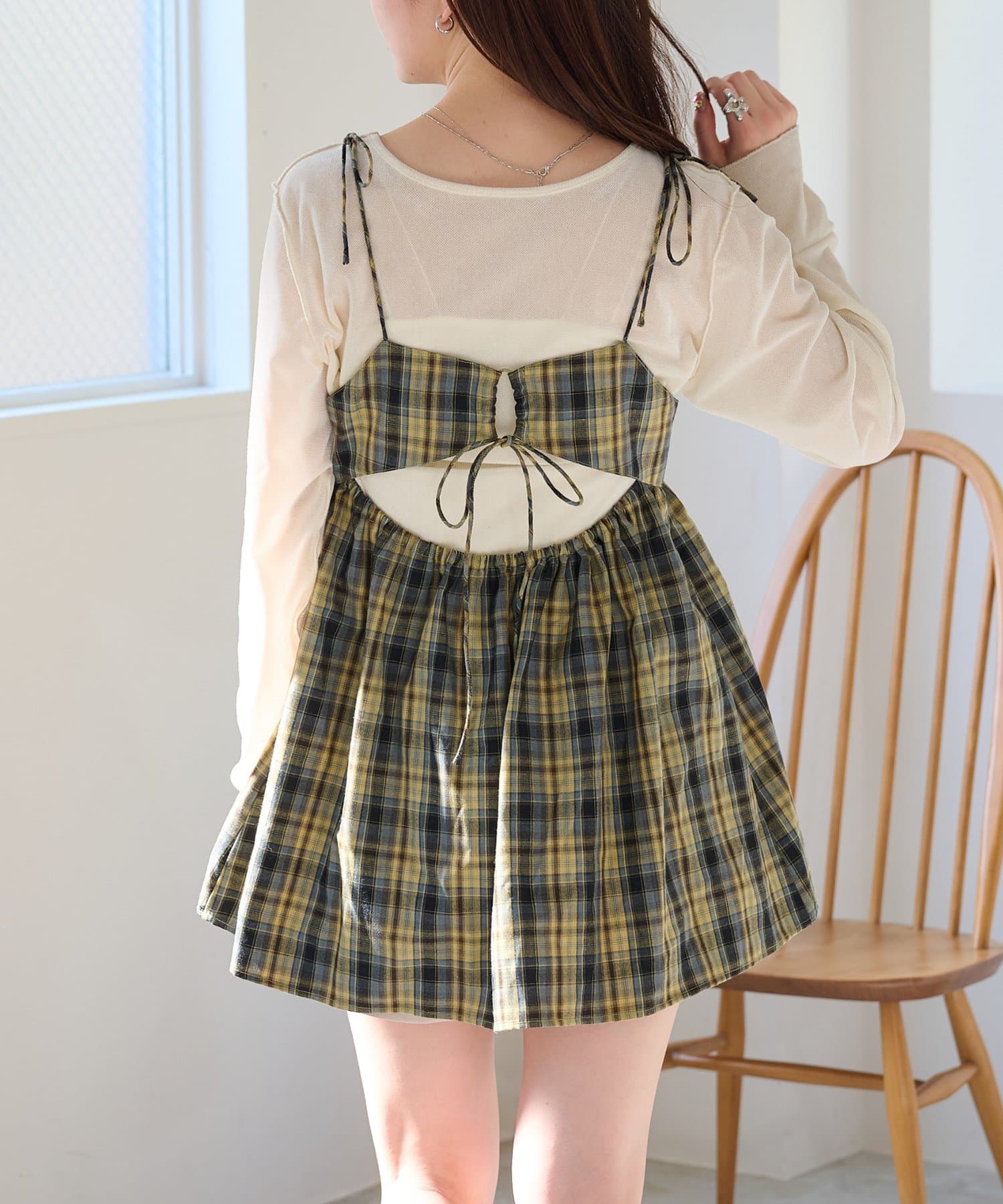 バックスタイルが魅力のチェックビスチェ。