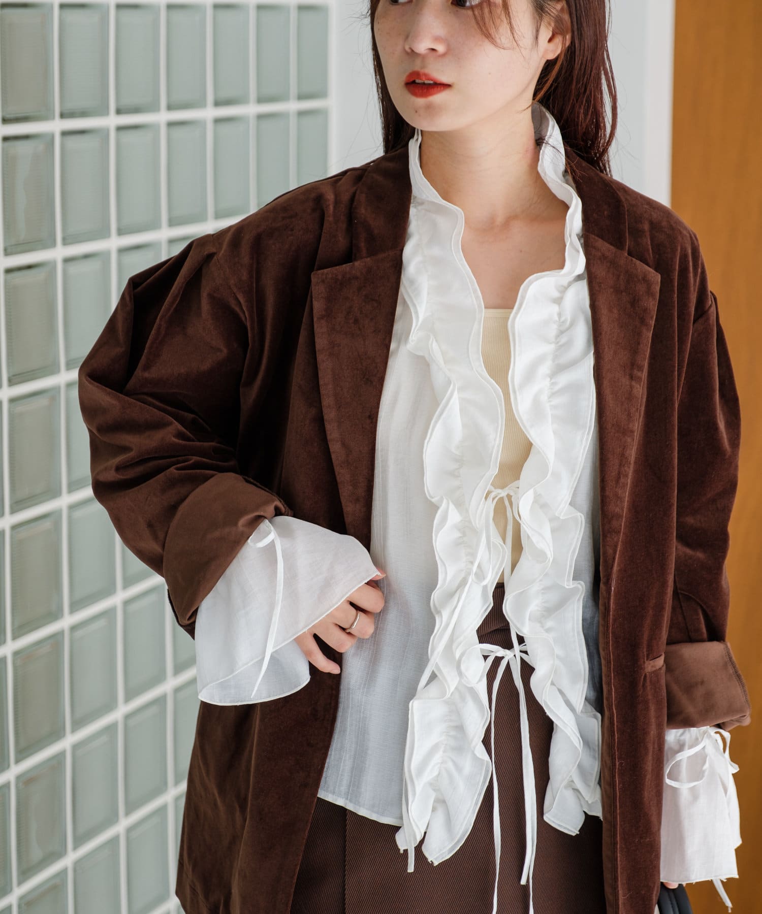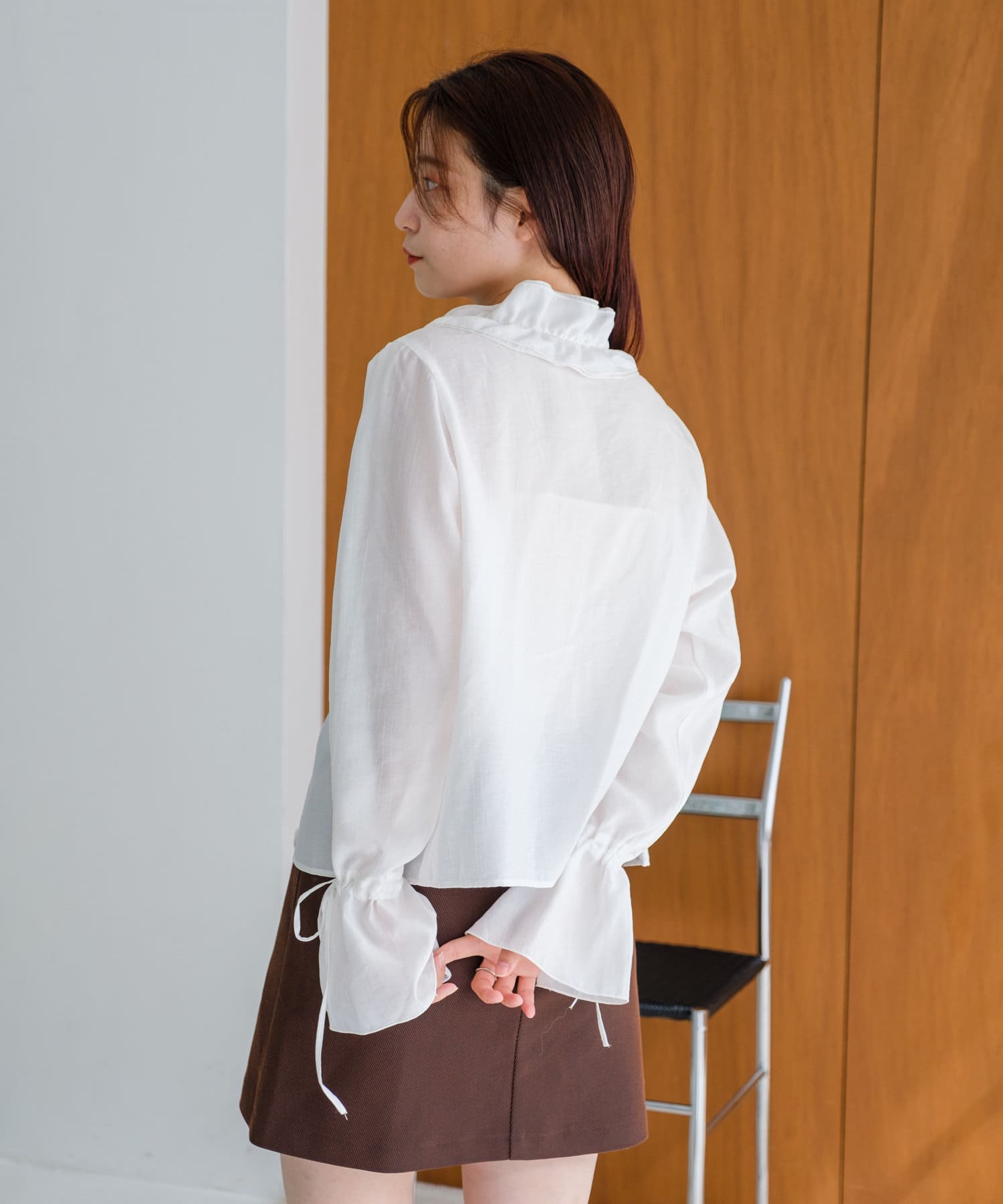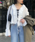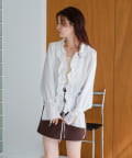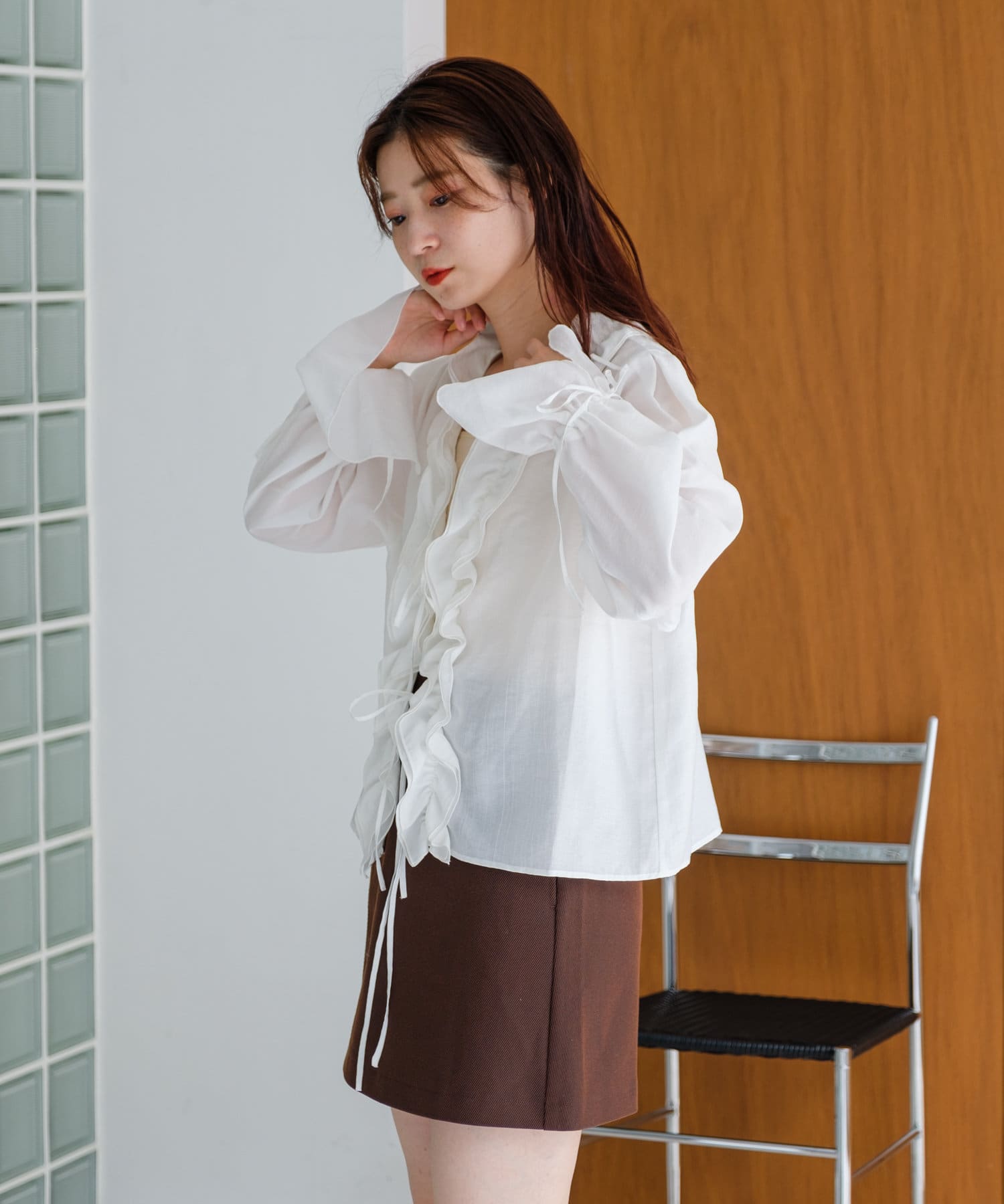 フリルの華やかさを活かしてタイトなミニスカートやミモレ丈のスカートと合わせるとエレガントな印象に。